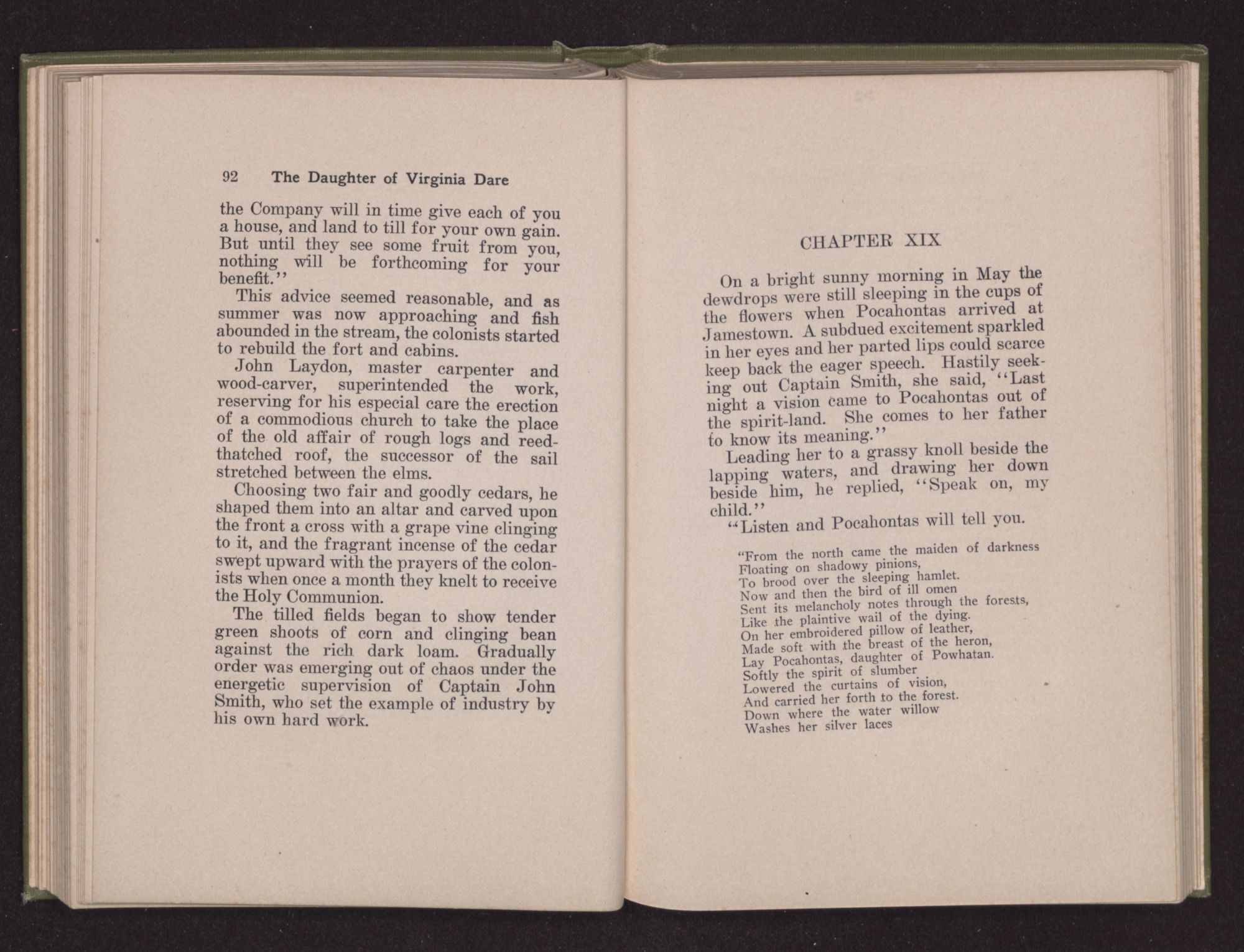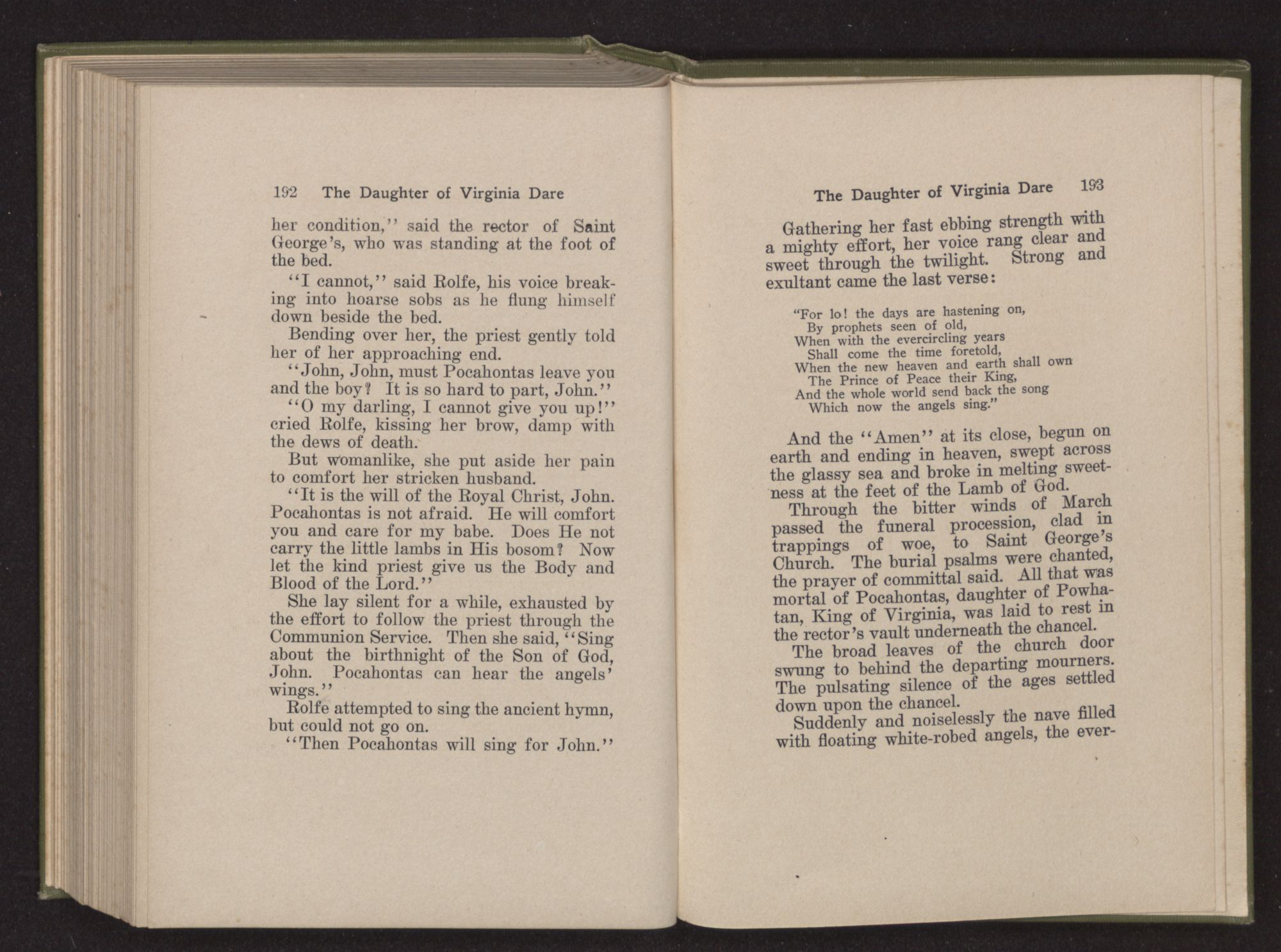 She lay silent for a while, exhausted by the effort to follow the priest through the Communion Service. Then she said, “Sing about the brithnight of the Son of God, John. Pocahontas can hear the angels’ wings.”