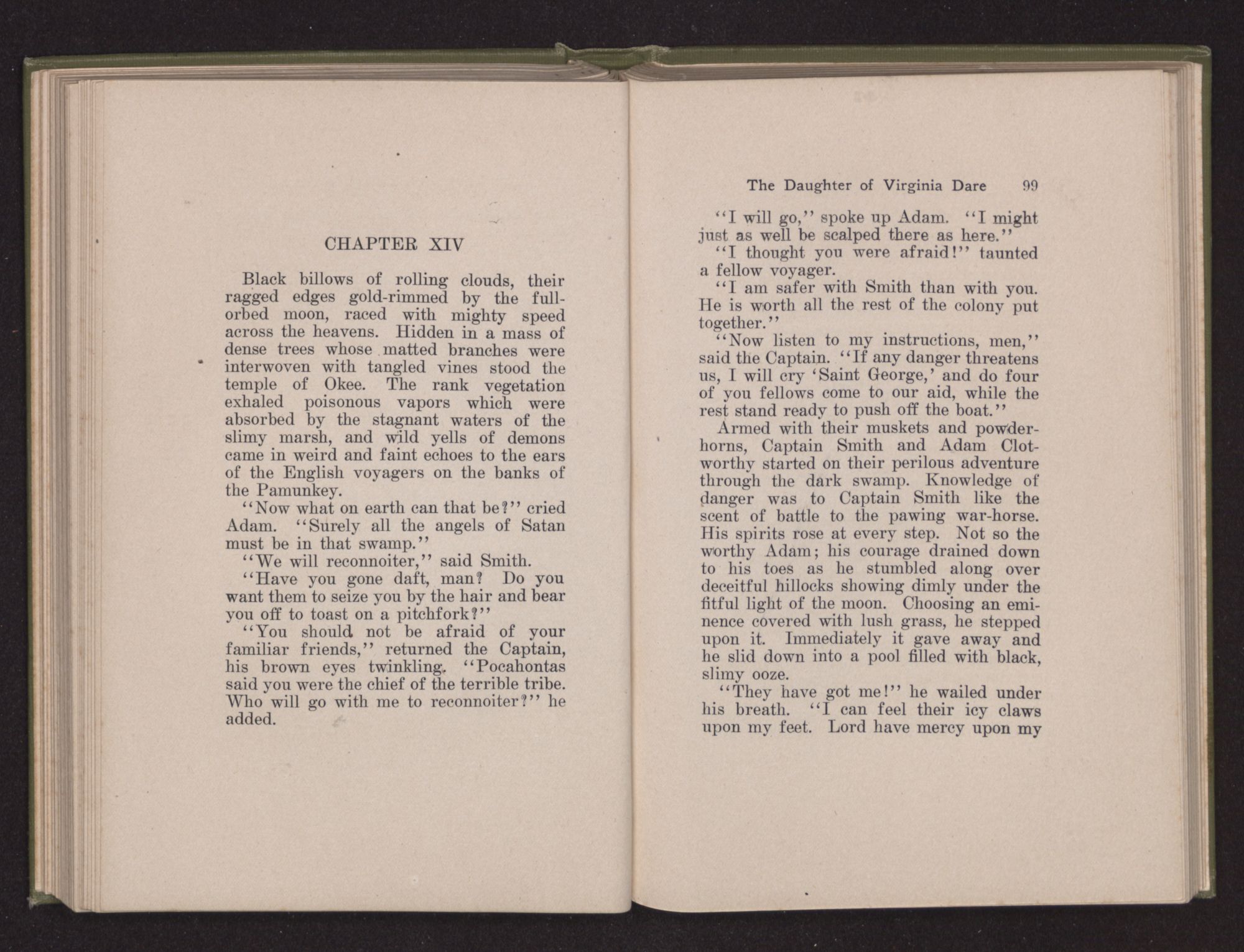 Rising from their knees they eagerly explored the land around them. A living landscape, vivid and beautiful, lay spread before their eyes. Great yellow pines like the masts of ships towered above them. Cedars, the rivals of Lebanon, mingled their branches with the live oak, tulip, and walnut trees, while closer to mother earth clung the sassafras and witch hazel. Scuppernong grapes flung their vines, loaded with ripening fruit, from limb to limb of the copper beeches and bathed their trailing branches in the briny waters of the Occam.