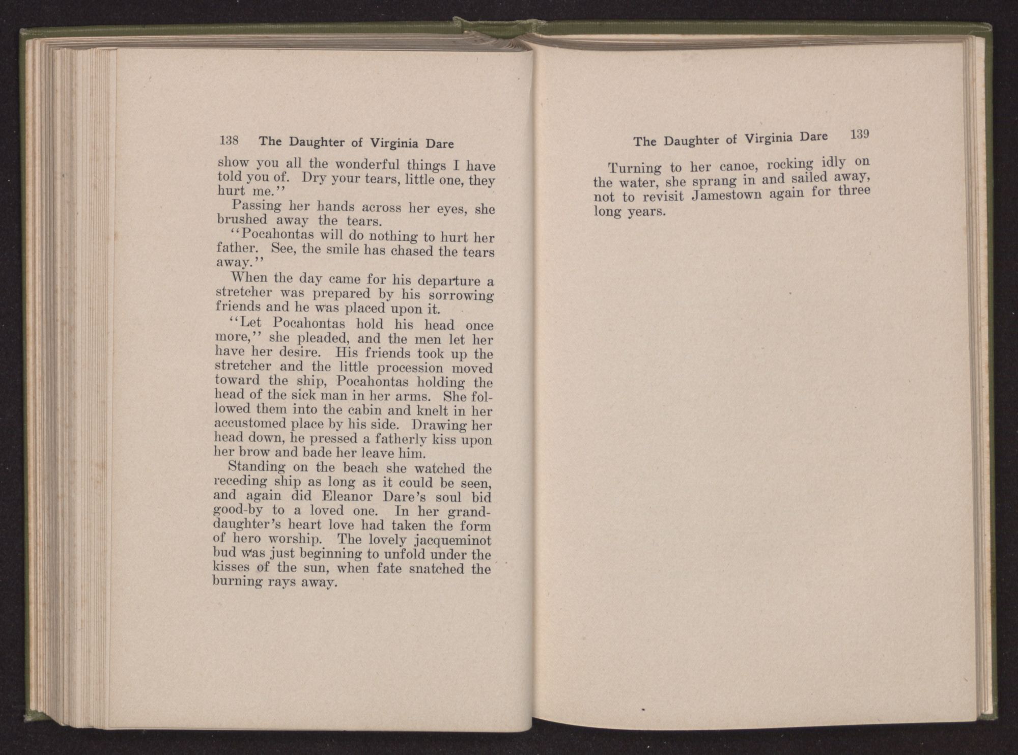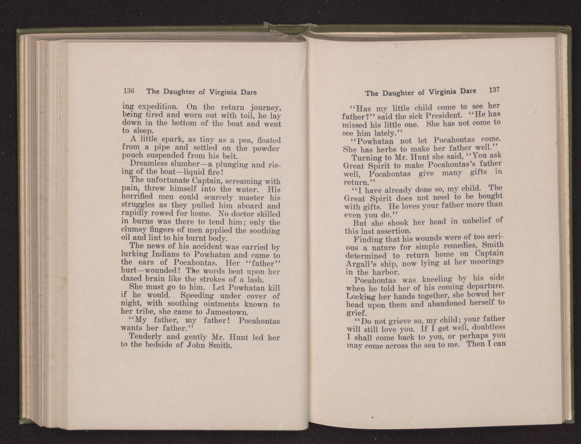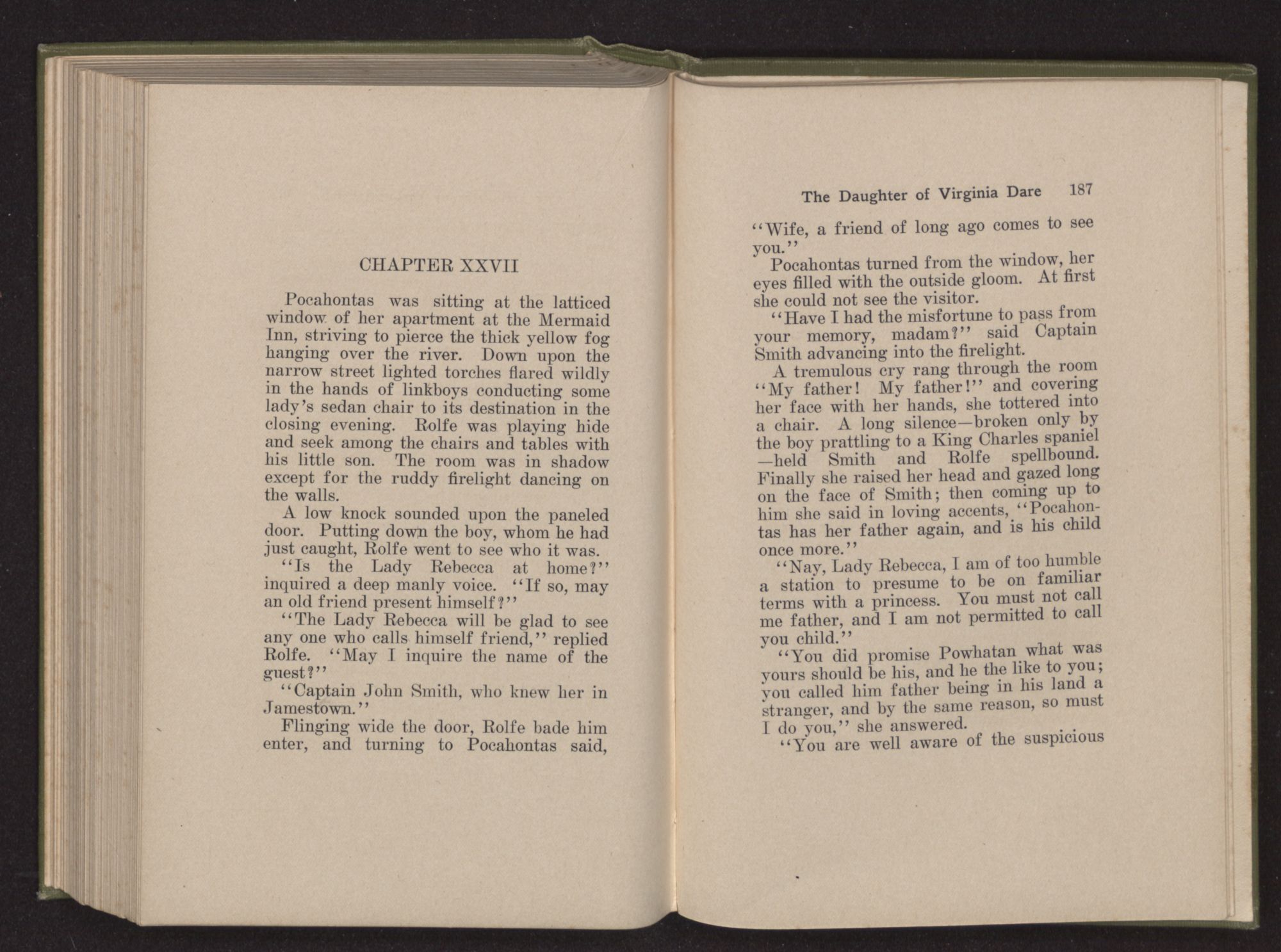 A tremulous cry rang through the room “My father! My father!” and covering her face with her hands, she tottered into a chair. A long silence—broken only by the boy prattling to a King Charles spaniel—held Smith and Rolfe spellbound. Finally she raised her head and gazed long on the face of Smith; then coming up to him she said in loving accents, “Pocahontas has her father again, and is his child once more.”