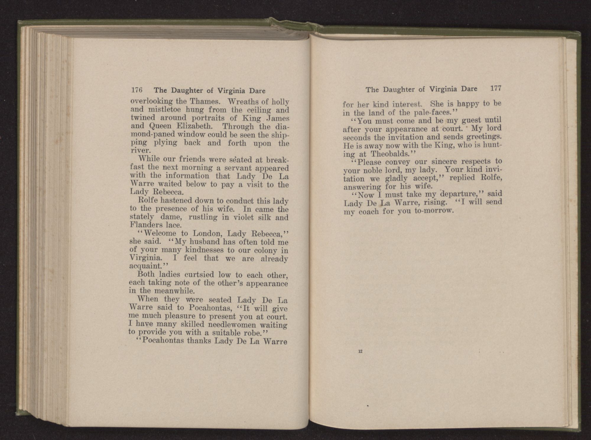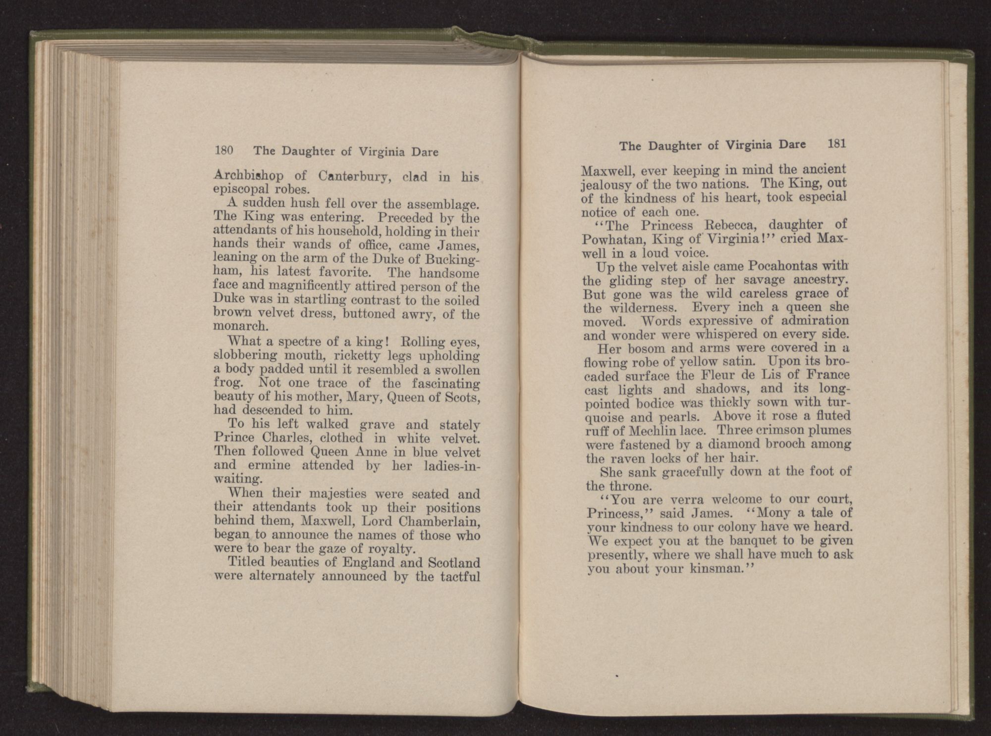 “You are verra welcome to our court, Princess,” said James. “Mony a tale of your kindness to our colony have we heard. We expect you at the banquet to be given presently, where we shall have much to ask you about your kinsman.”