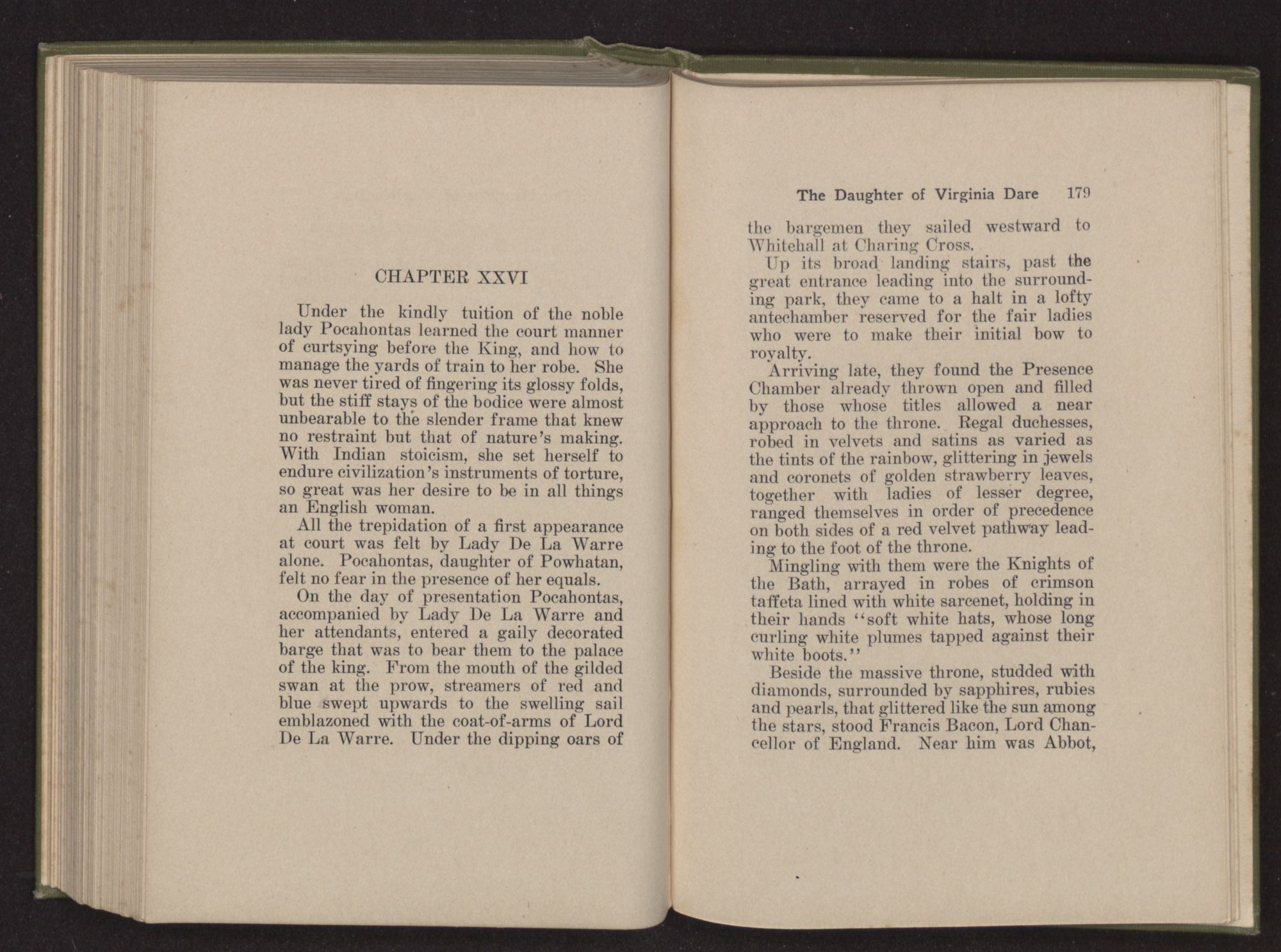 All the trepidation of a first appearance at court was felt by Lady De La Warre alone. Pocahontas, daughter of Powhatan, felt no fear in the presence of her equals.