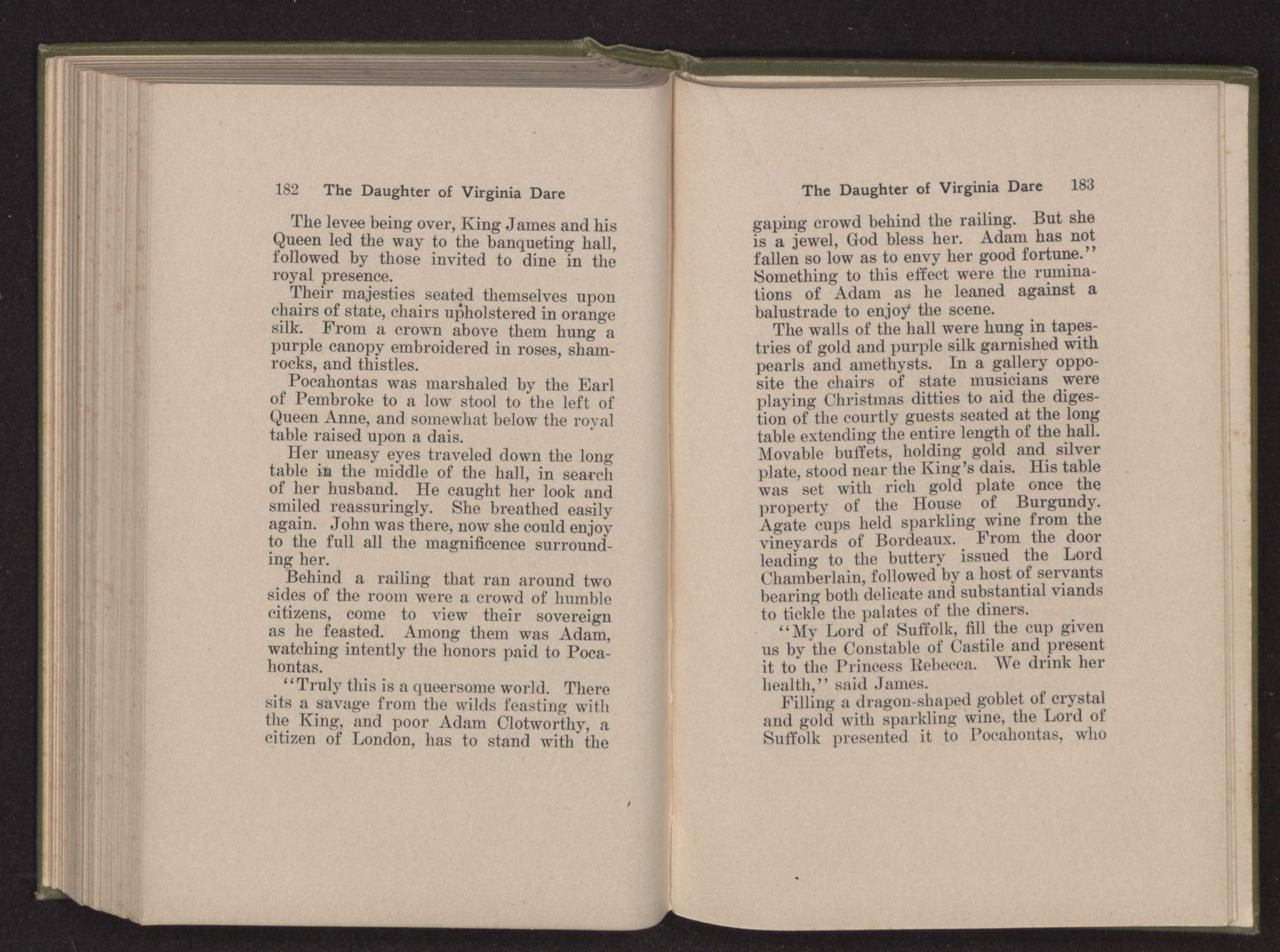 Behind a railing that ran around two sides of the room were a crowd of humble citizens, come to view their sovereign as he feasted. Among them was Adam, watching intently the honors paid to Pocahontas.