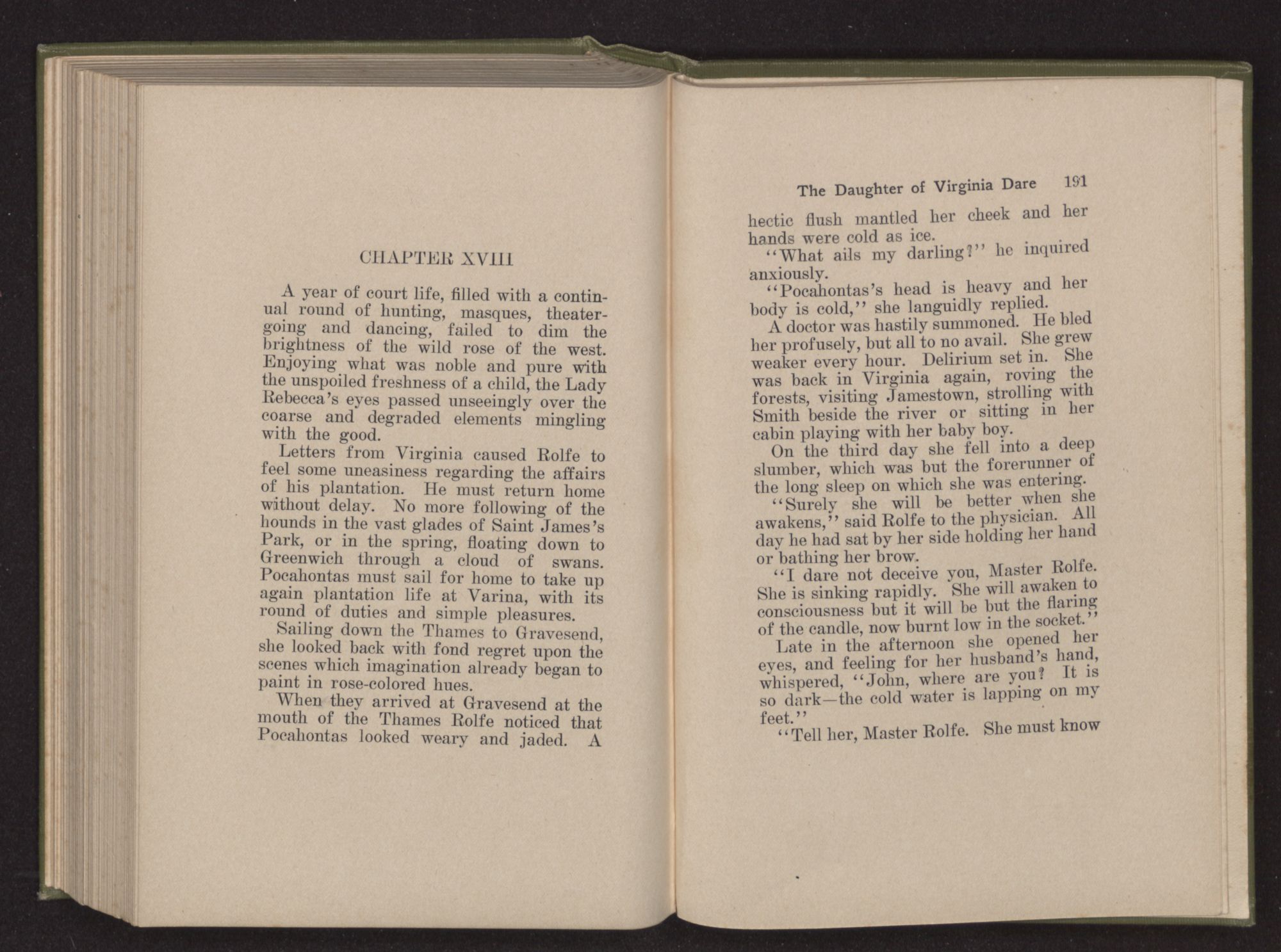 A doctor was hastily summoned. He bled her profusely, but all to no avail. She grew weaker every hour. Delirium set in. She was back in Virginia again, roving the forests, visiting Jamestown, strolling with Smith beside the river or sitting in her cabin playing with her baby boy.