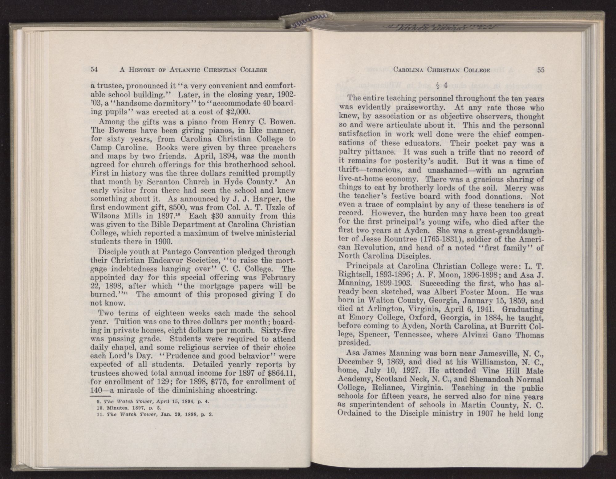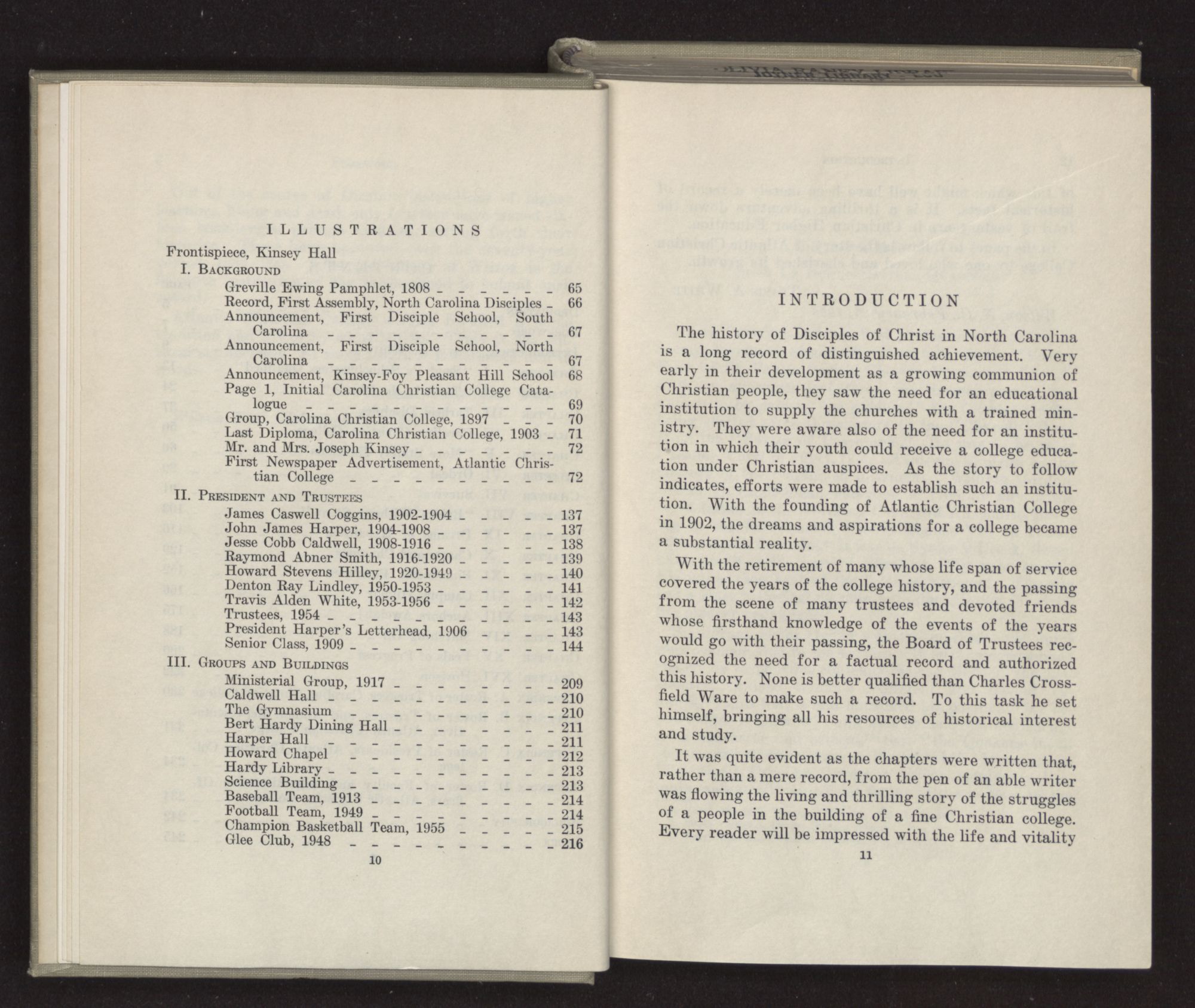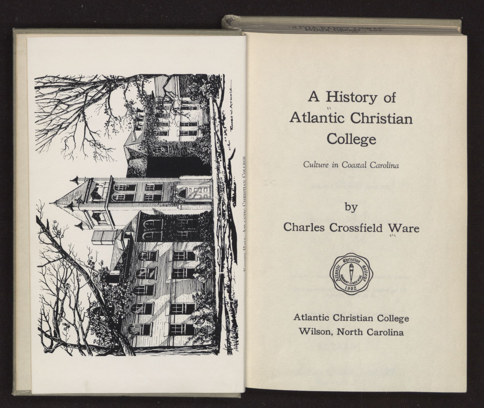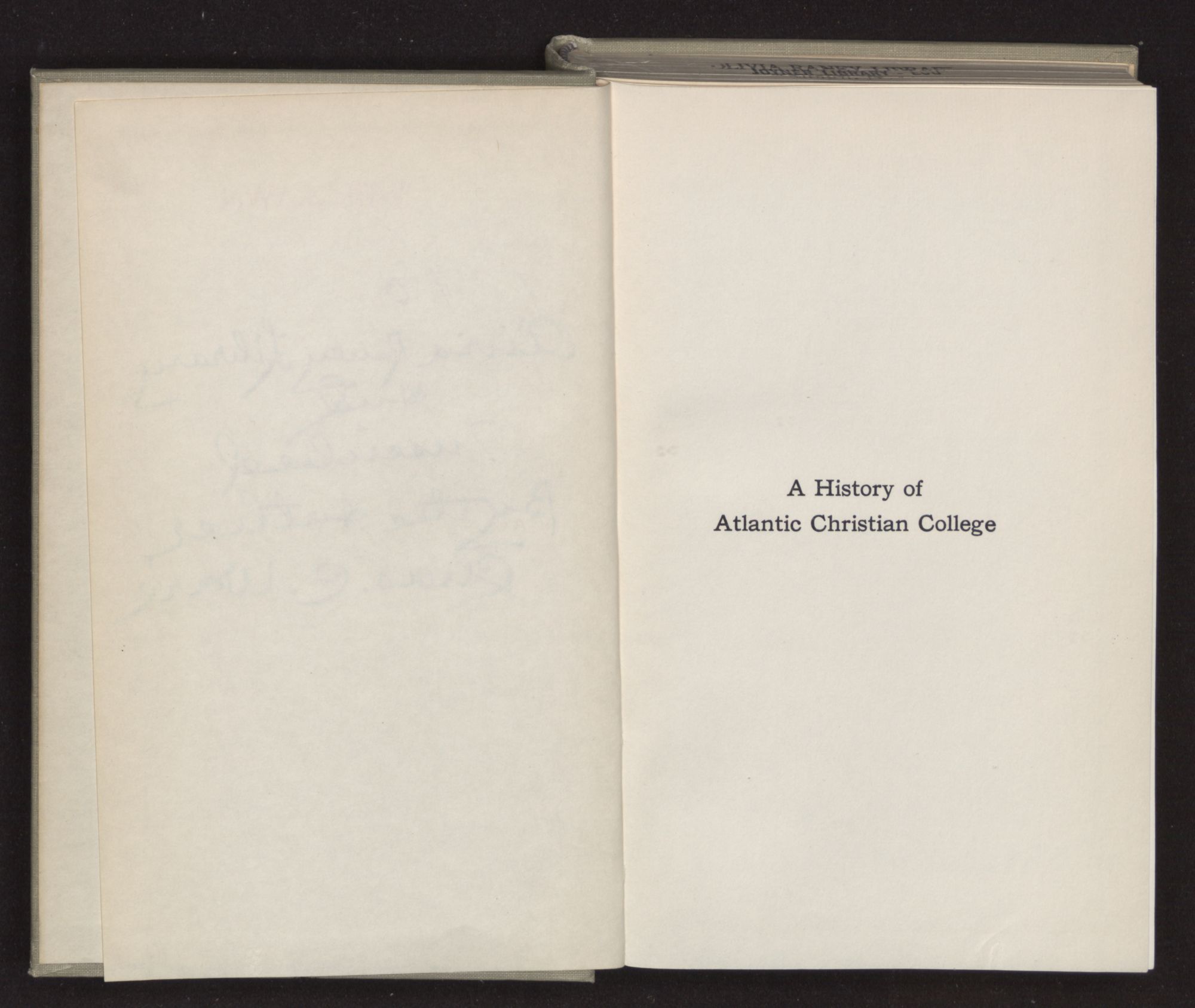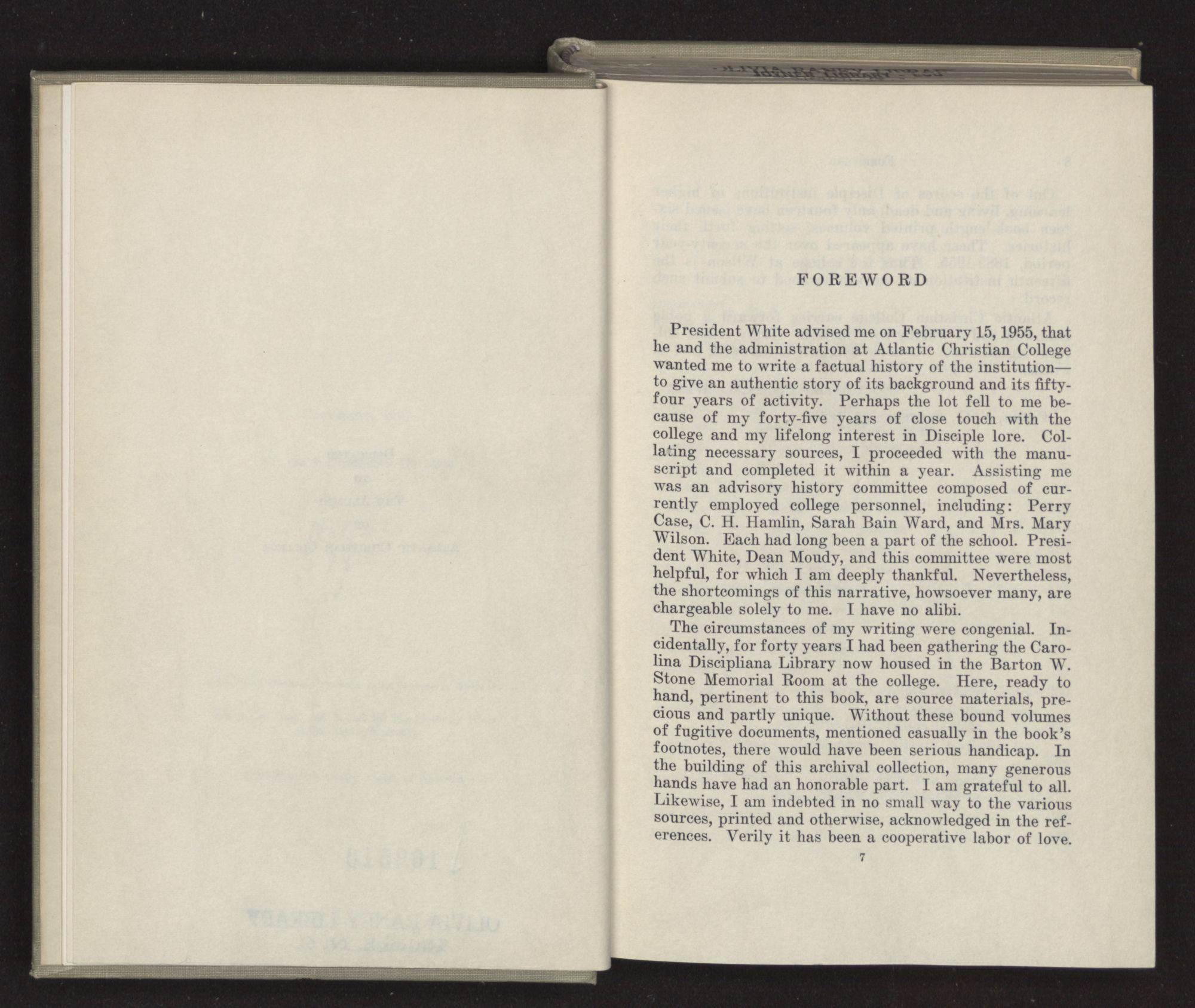President White advised me on February 15, 1955, that he and the administration at Atlantic Christian College wanted me to write a factual history of the institution—to give an authentic story of its background and its fifty-four years of activity. Perhaps the lot fell to me because of my forty-five years of close touch with the college and my lifelong interest in Disciple lore. Collating necessary sources, I proceeded with the manuscript and completed it within a year. Assisting me was an advisory history committee composed of currently employed college personnel, including: Perry Case, C. H. Hamlin, Sarah Bain Ward, and Mrs. Mary Wilson. Each had long been a part of the school. President White, Dean Moudy, and this committee were most helpful, for which I am deeply thankful. Nevertheless, the shortcomings of this narrative, howsoever many, are chargeable solely to me. I have no alibi.