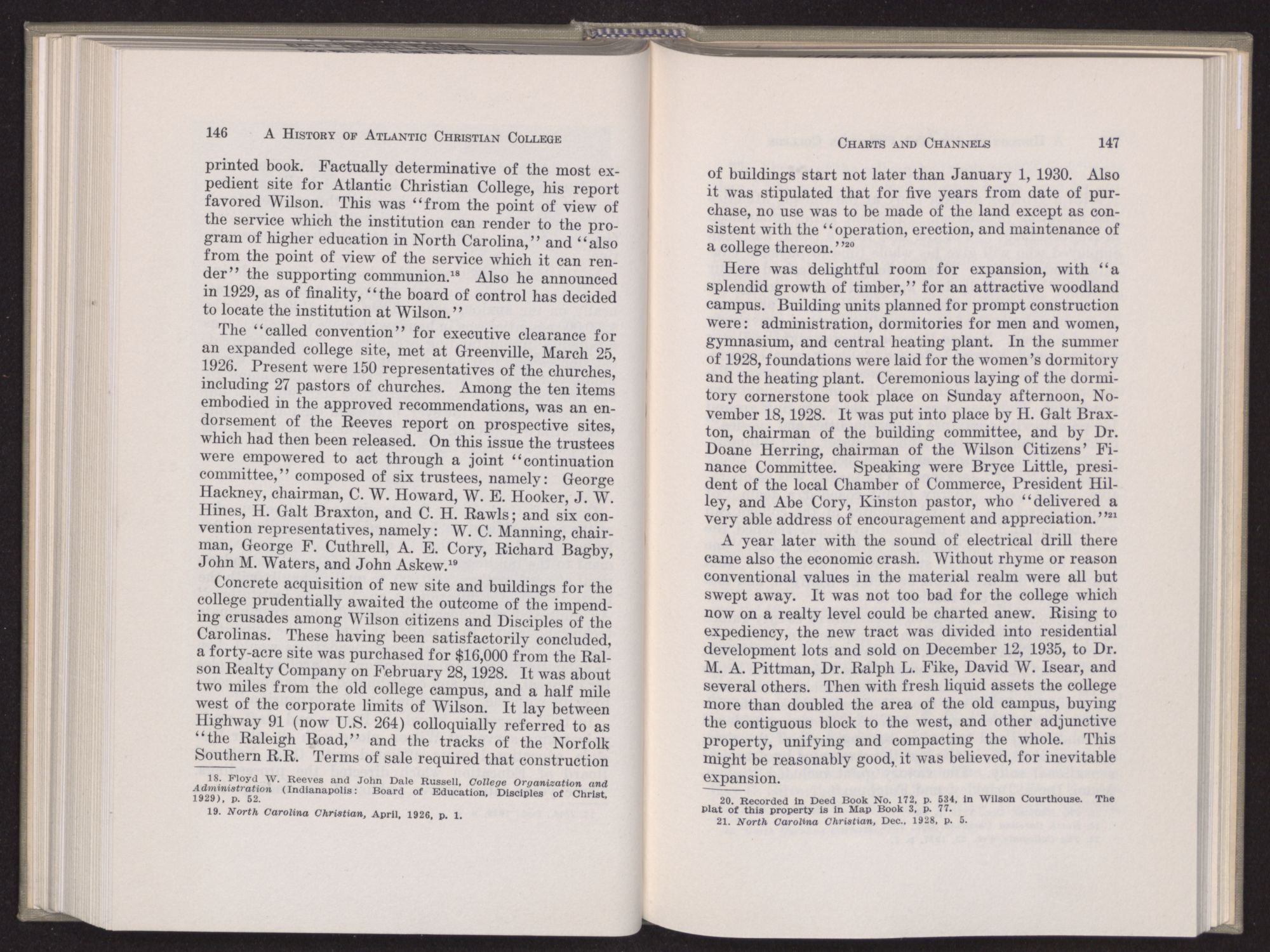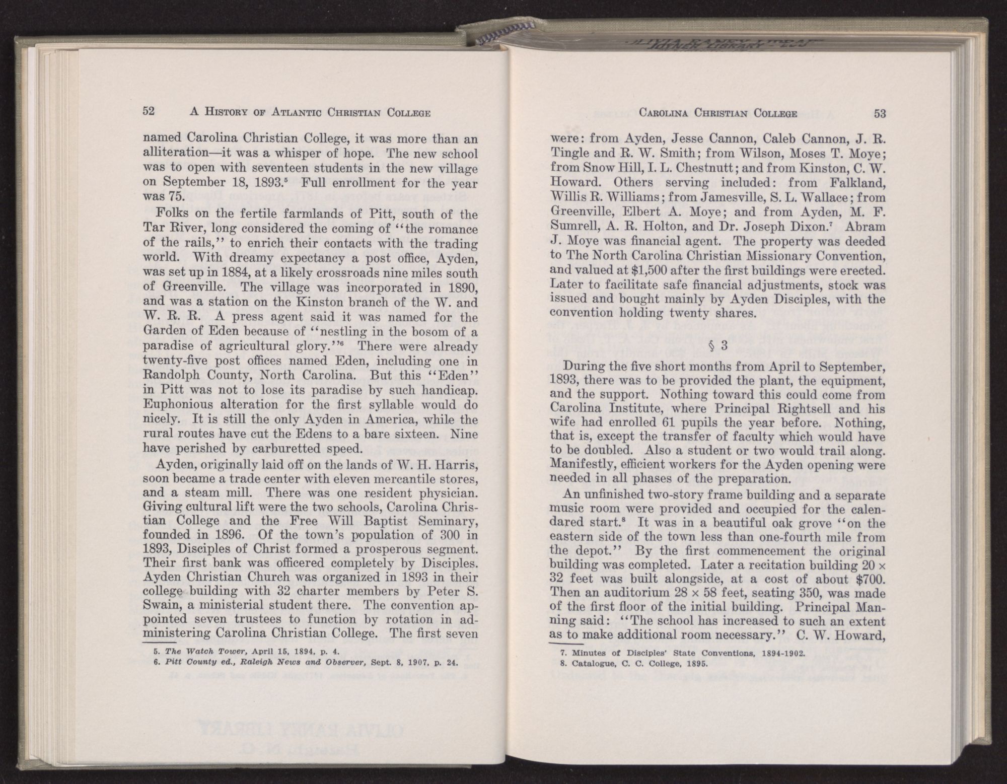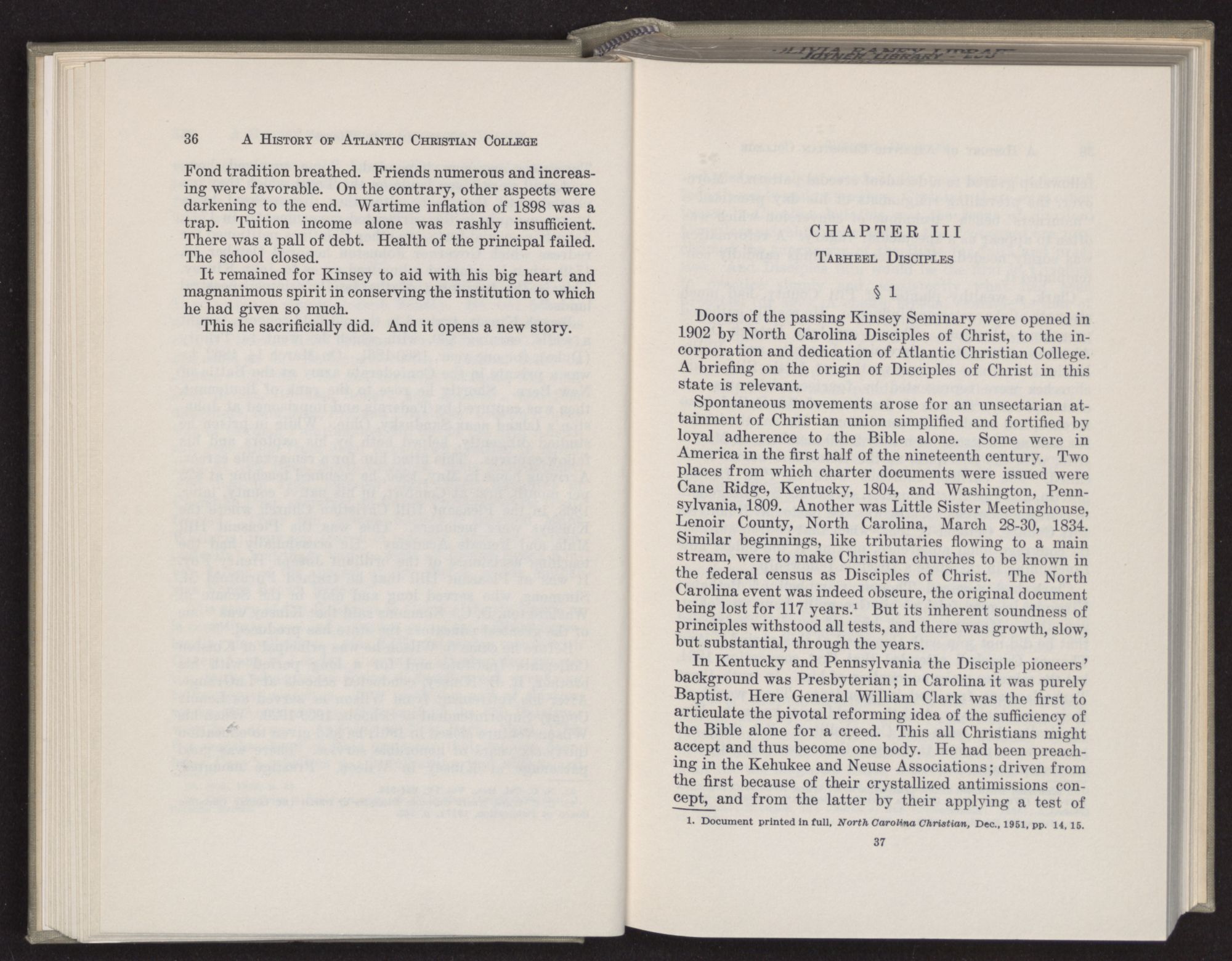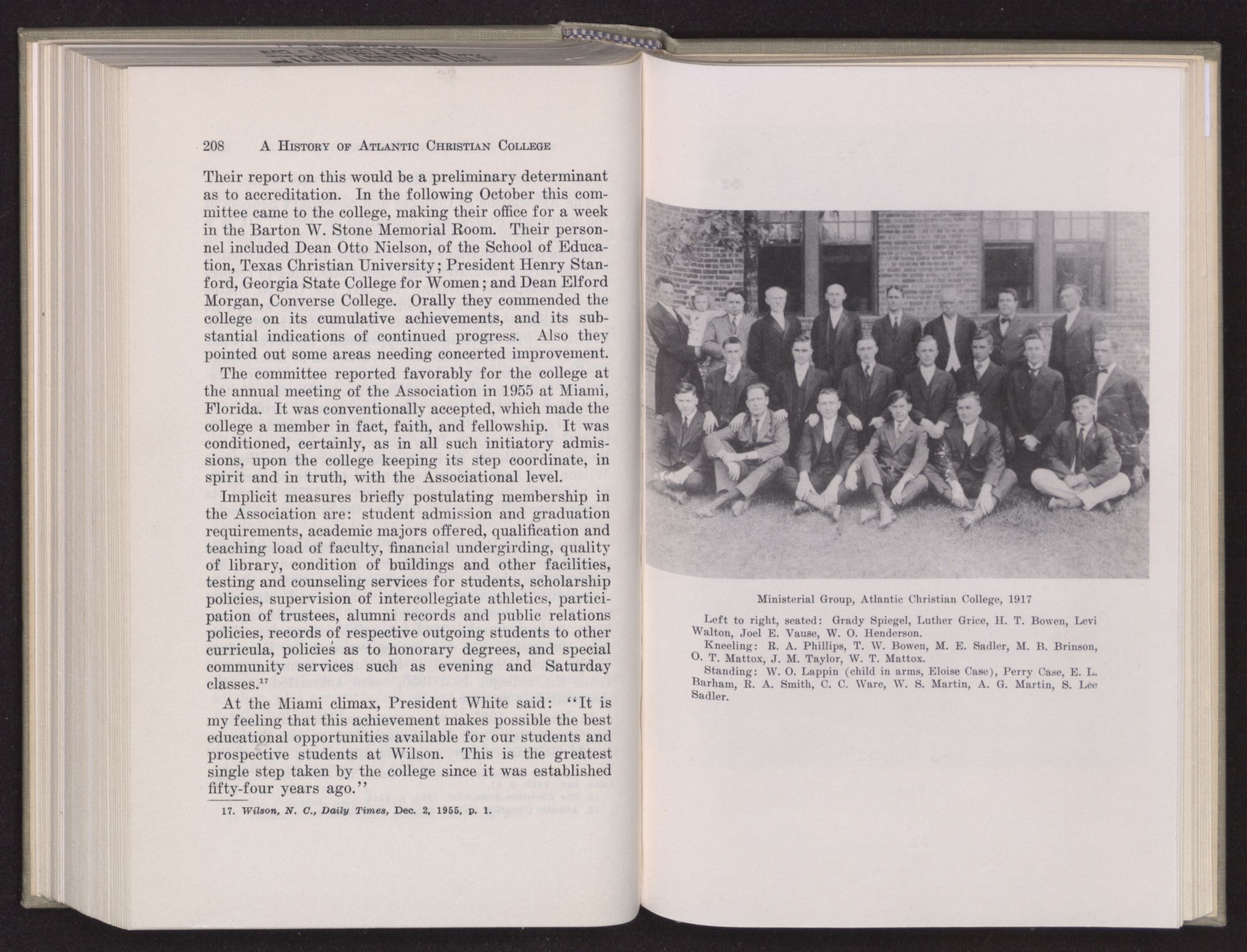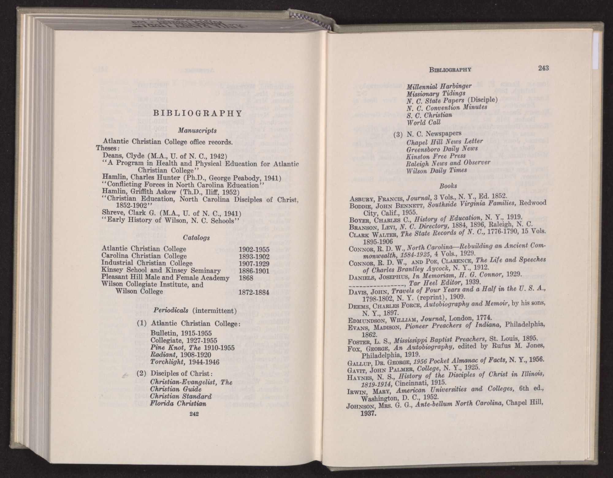 President White advised me on February 15, 1955, that he and the administration at Atlantic Christian College wanted me to write a factual history of the institution—to give an authentic story of its background and its fifty-four years of activity. Perhaps the lot fell to me because of my forty-five years of close touch with the college and my lifelong interest in Disciple lore. Collating necessary sources, I proceeded with the manuscript and completed it within a year. Assisting me was an advisory history committee composed of currently employed college personnel, including: Perry Case, C. H. Hamlin, Sarah Bain Ward, and Mrs. Mary Wilson. Each had long been a part of the school. President White, Dean Moudy, and this committee were most helpful, for which I am deeply thankful. Nevertheless, the shortcomings of this narrative, howsoever many, are chargeable solely to me. I have no alibi.