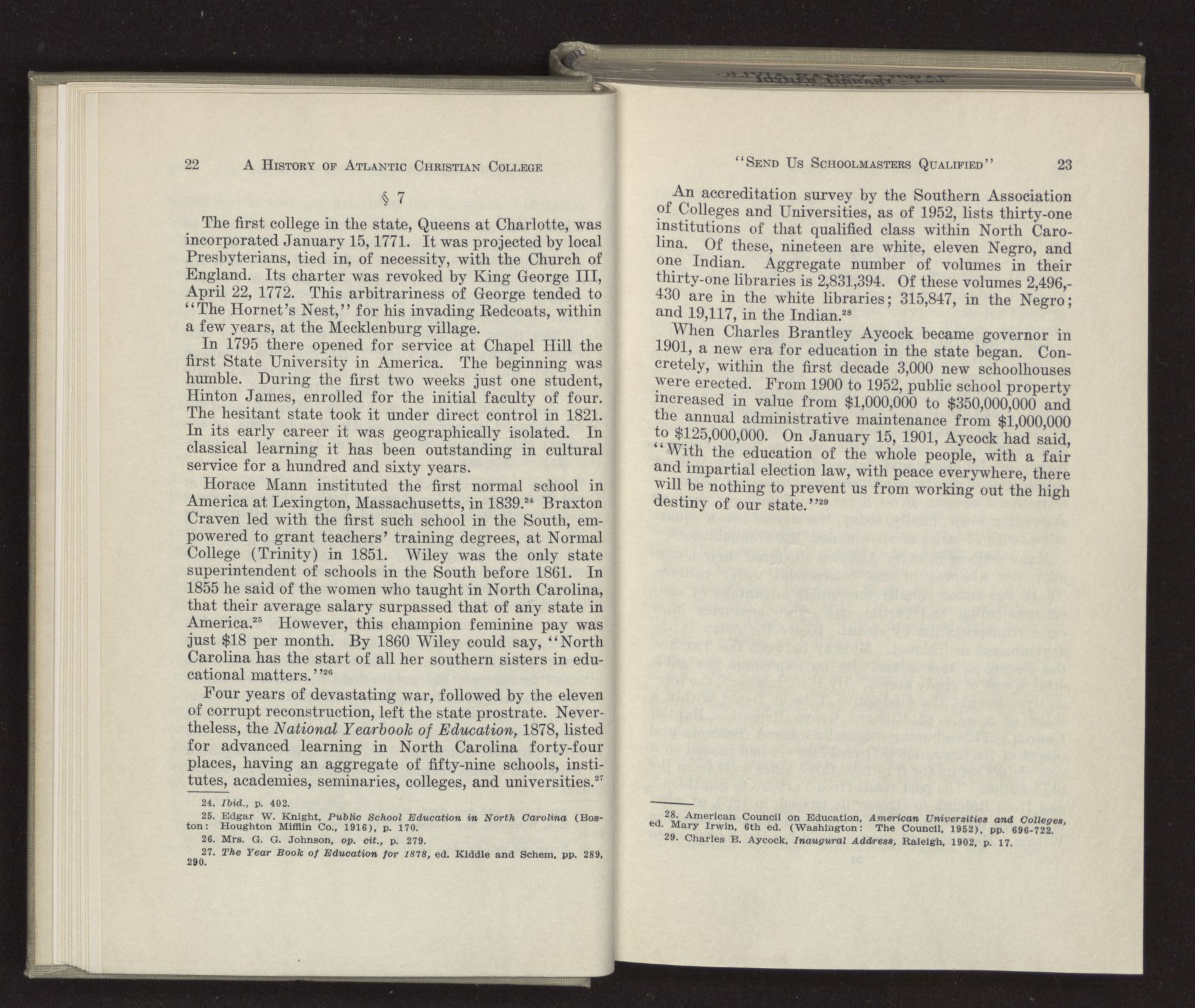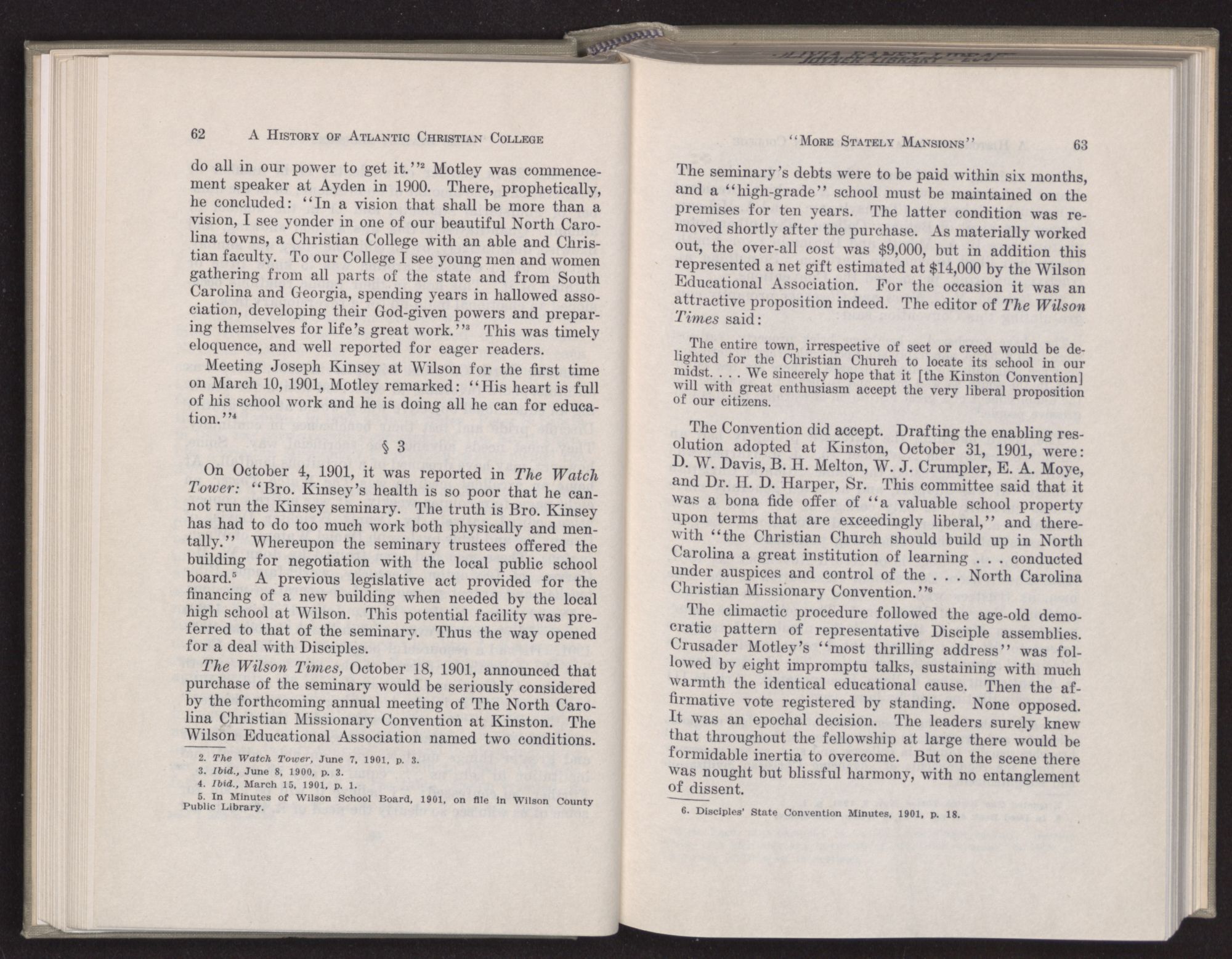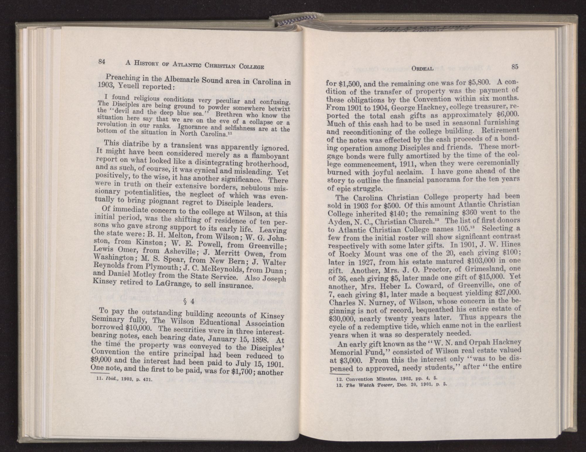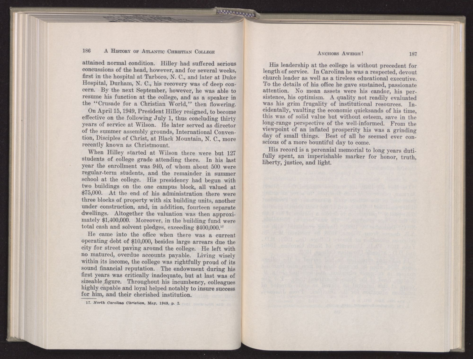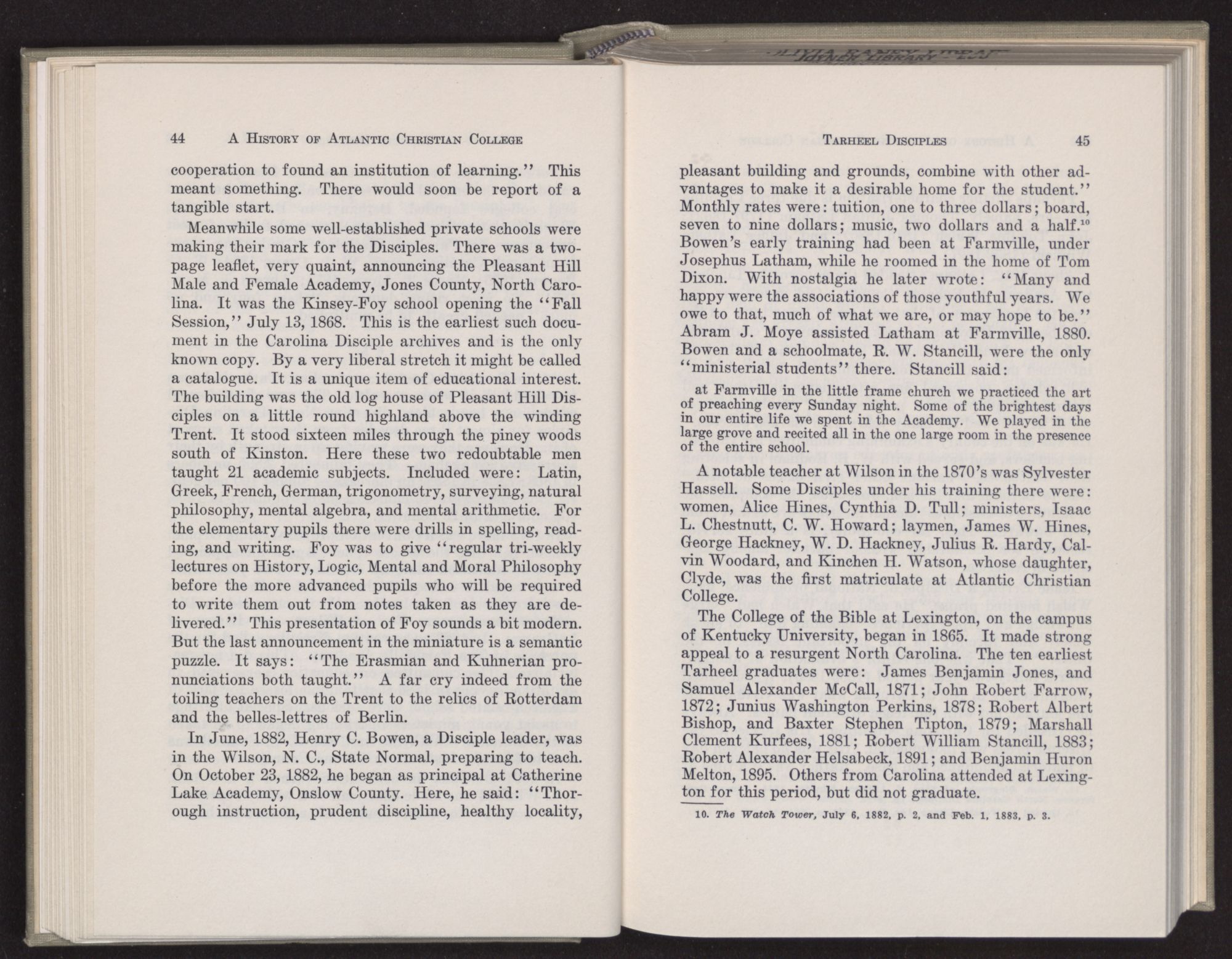President White advised me on February 15, 1955, that he and the administration at Atlantic Christian College wanted me to write a factual history of the institution—to give an authentic story of its background and its fifty-four years of activity. Perhaps the lot fell to me because of my forty-five years of close touch with the college and my lifelong interest in Disciple lore. Collating necessary sources, I proceeded with the manuscript and completed it within a year. Assisting me was an advisory history committee composed of currently employed college personnel, including: Perry Case, C. H. Hamlin, Sarah Bain Ward, and Mrs. Mary Wilson. Each had long been a part of the school. President White, Dean Moudy, and this committee were most helpful, for which I am deeply thankful. Nevertheless, the shortcomings of this narrative, howsoever many, are chargeable solely to me. I have no alibi.