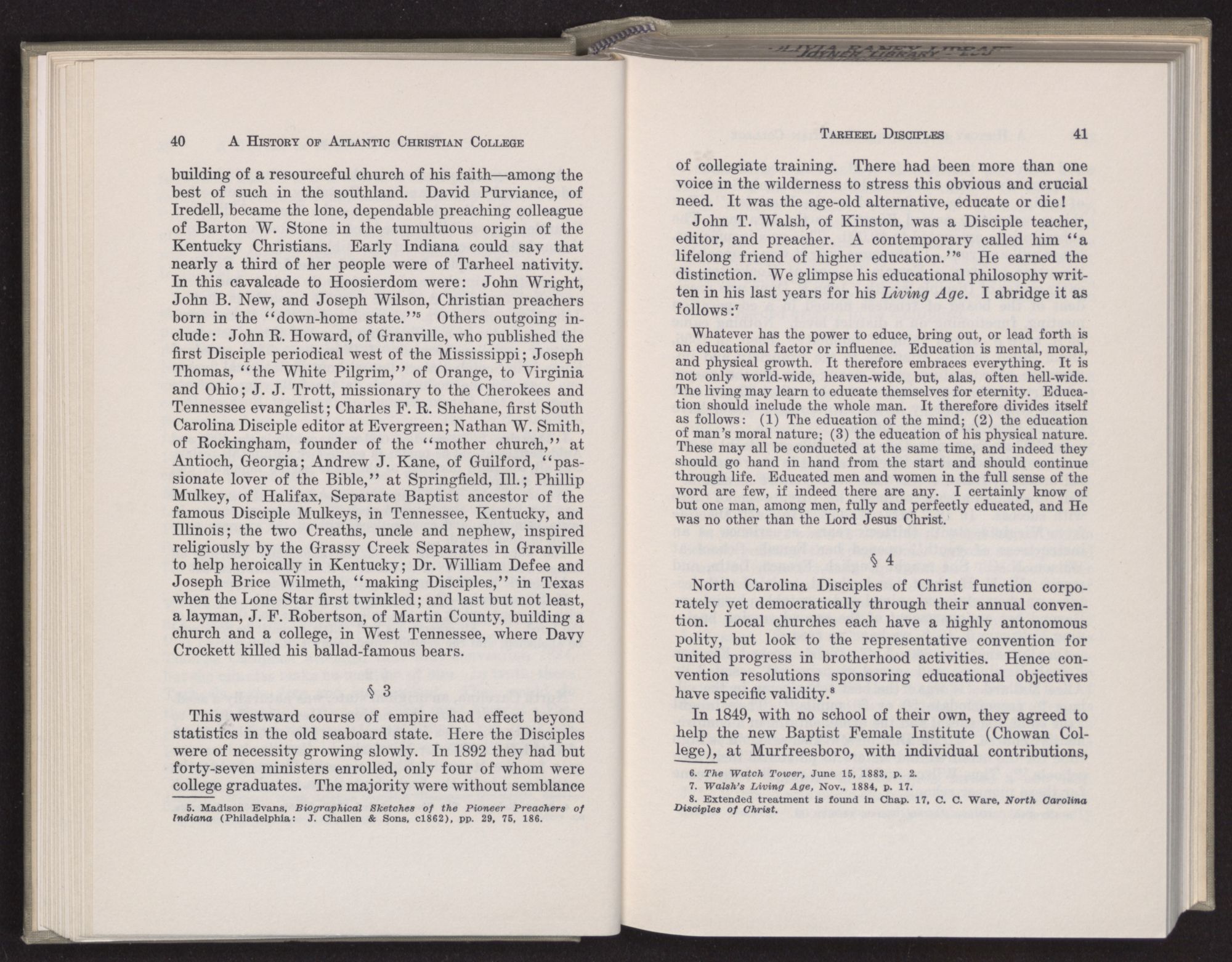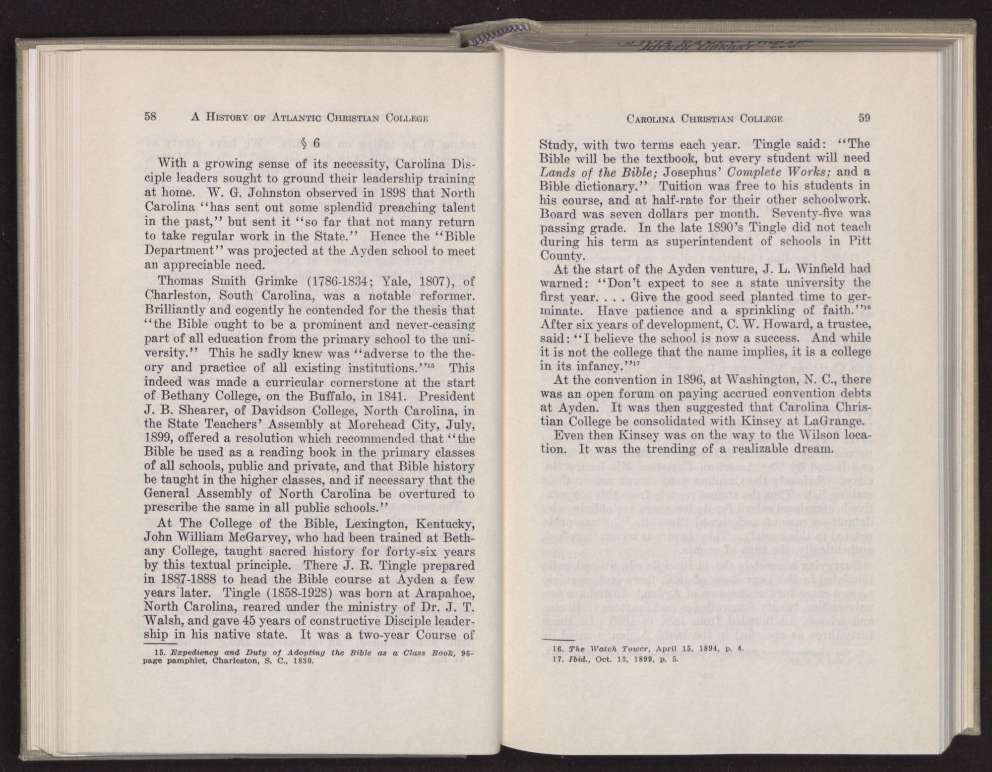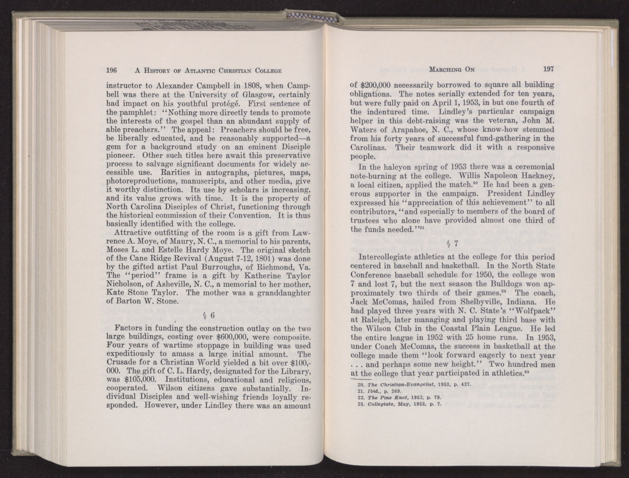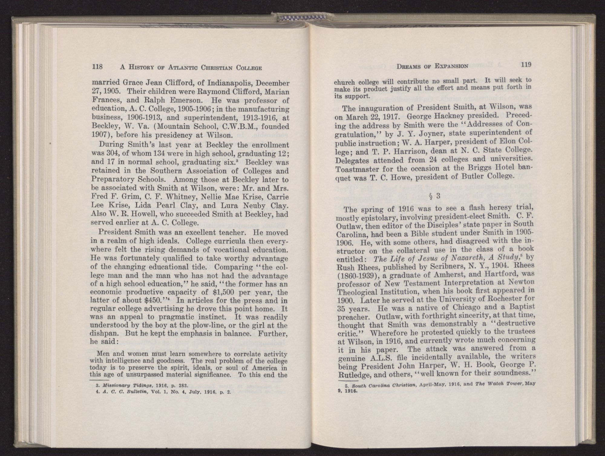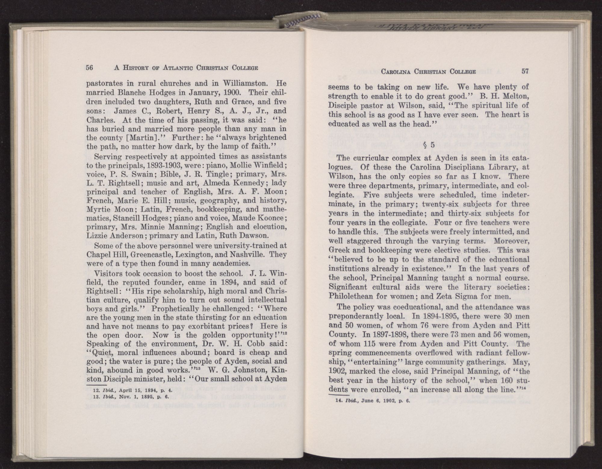 President White advised me on February 15, 1955, that he and the administration at Atlantic Christian College wanted me to write a factual history of the institution—to give an authentic story of its background and its fifty-four years of activity. Perhaps the lot fell to me because of my forty-five years of close touch with the college and my lifelong interest in Disciple lore. Collating necessary sources, I proceeded with the manuscript and completed it within a year. Assisting me was an advisory history committee composed of currently employed college personnel, including: Perry Case, C. H. Hamlin, Sarah Bain Ward, and Mrs. Mary Wilson. Each had long been a part of the school. President White, Dean Moudy, and this committee were most helpful, for which I am deeply thankful. Nevertheless, the shortcomings of this narrative, howsoever many, are chargeable solely to me. I have no alibi.