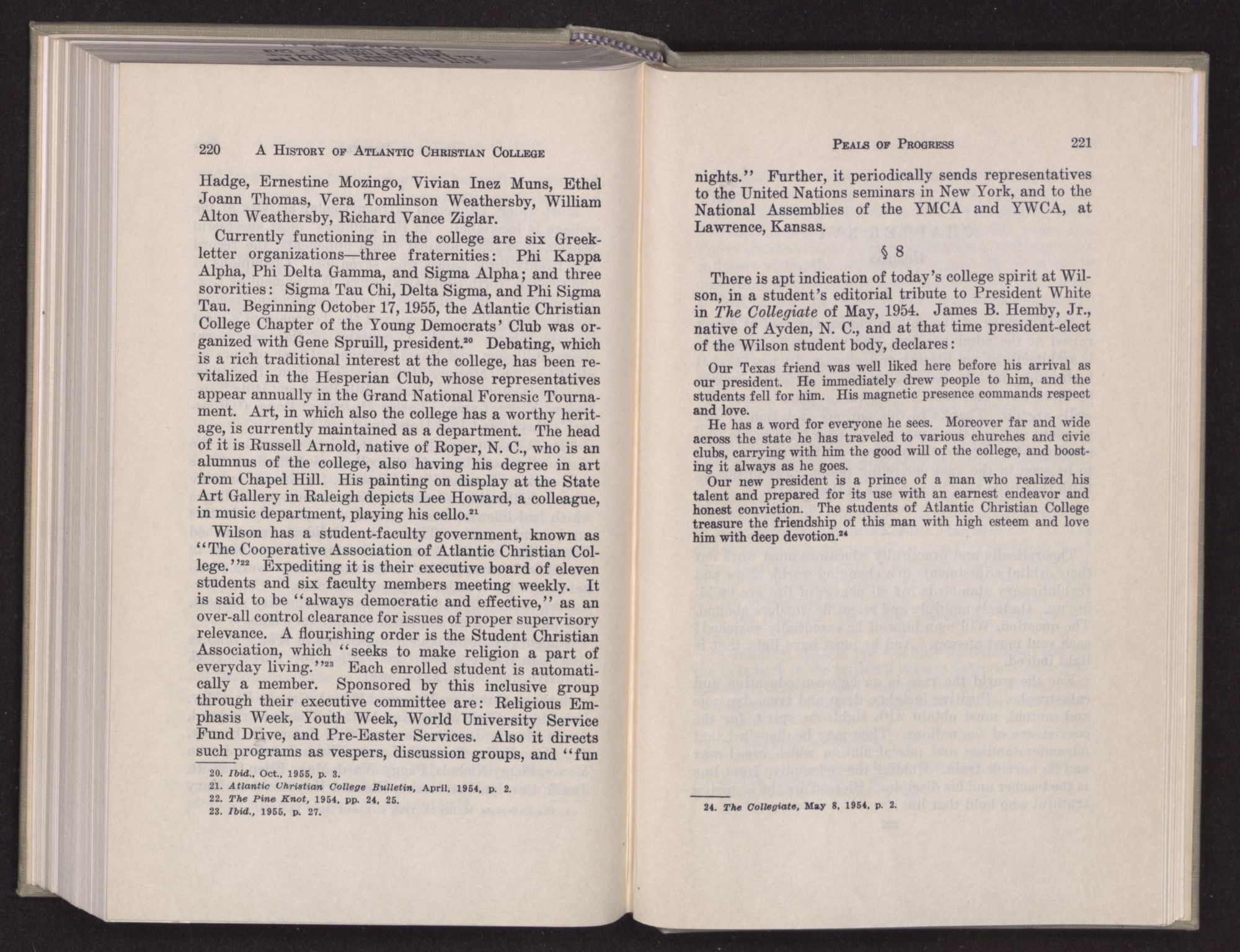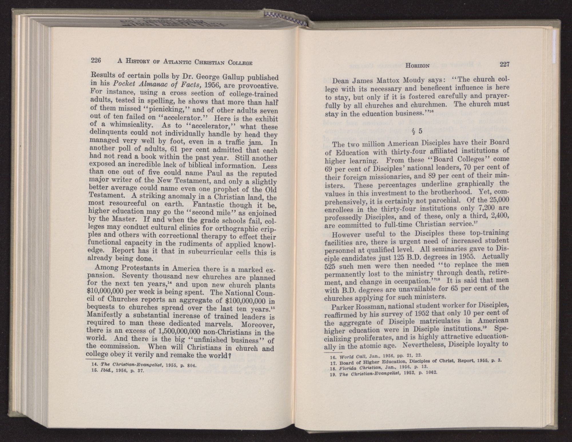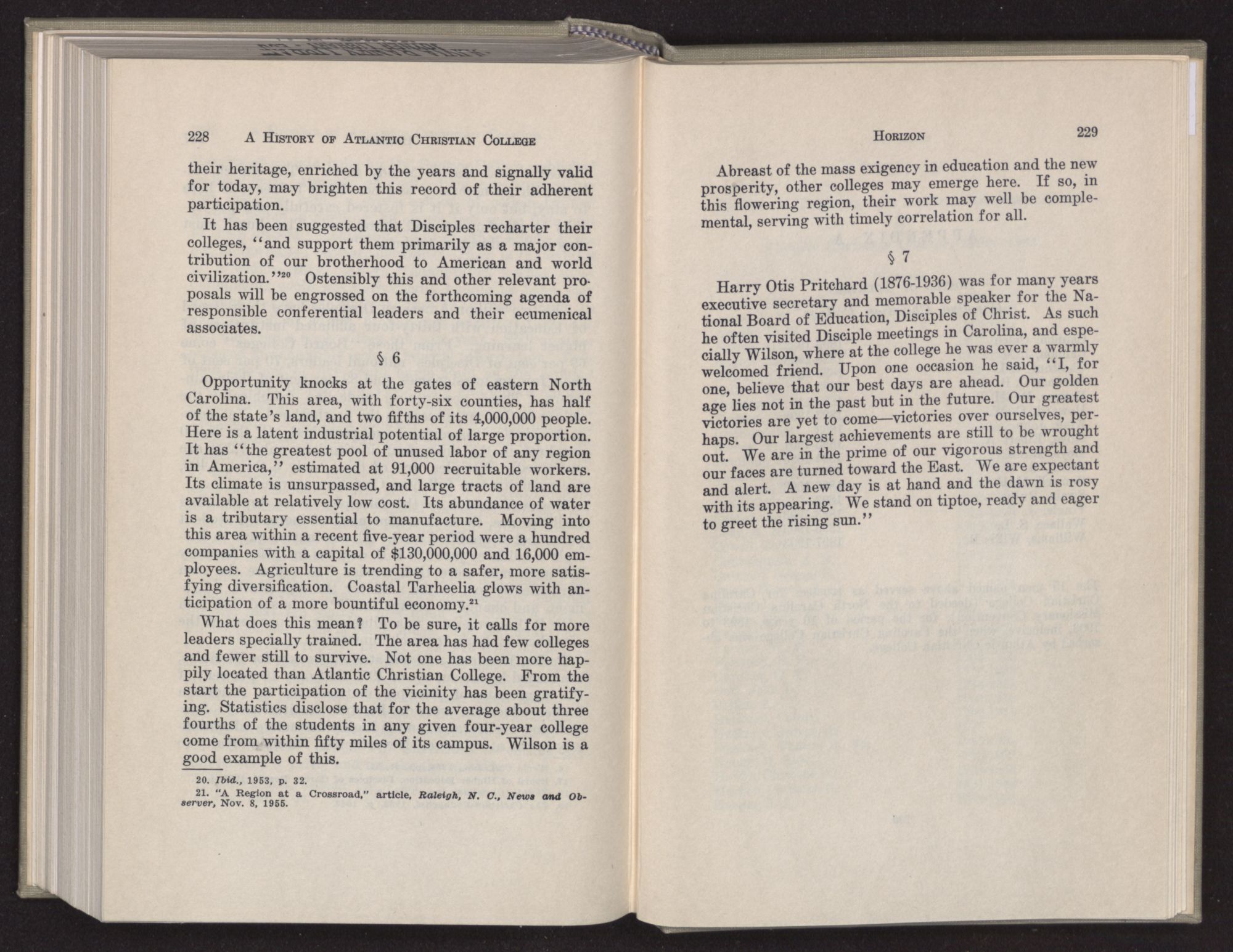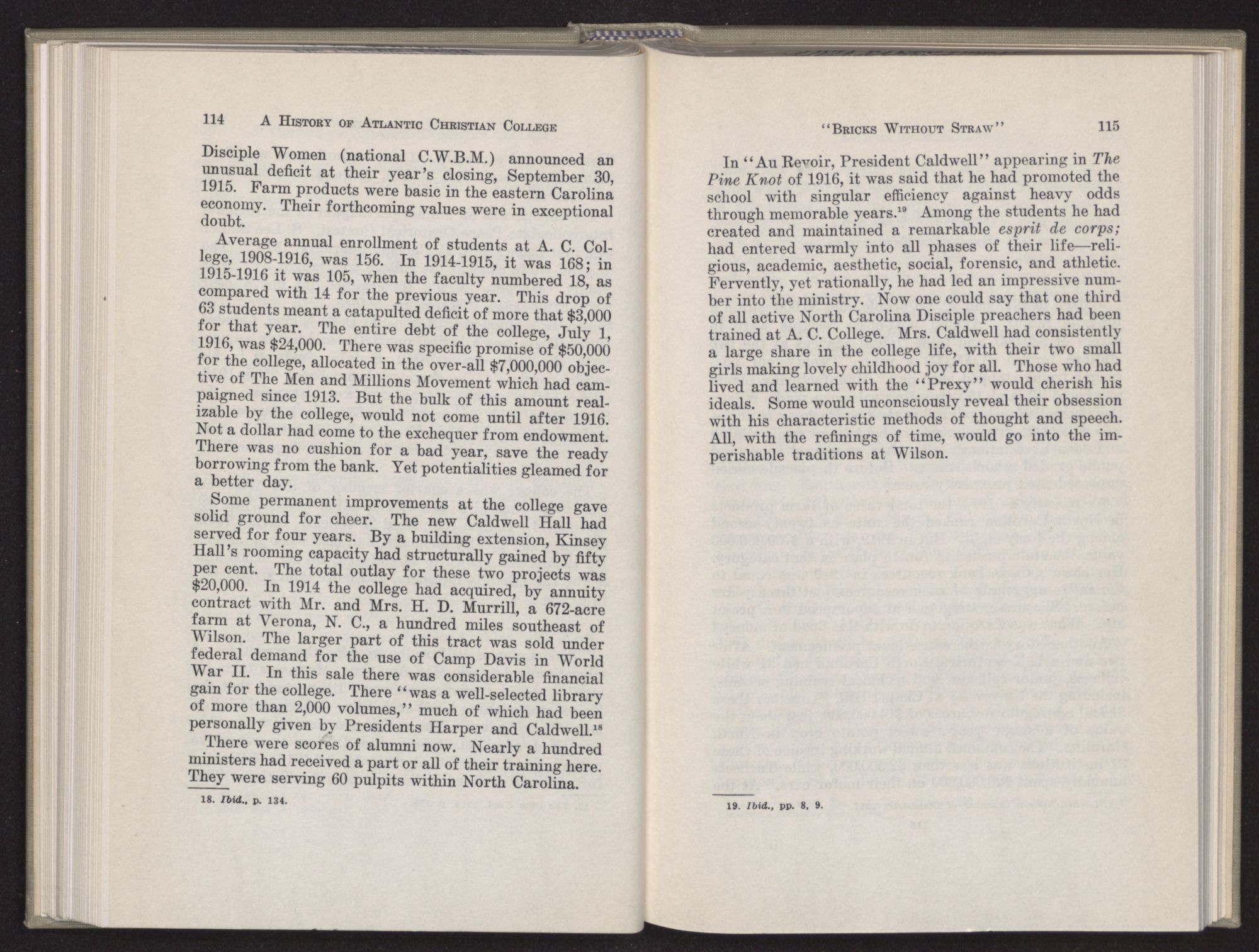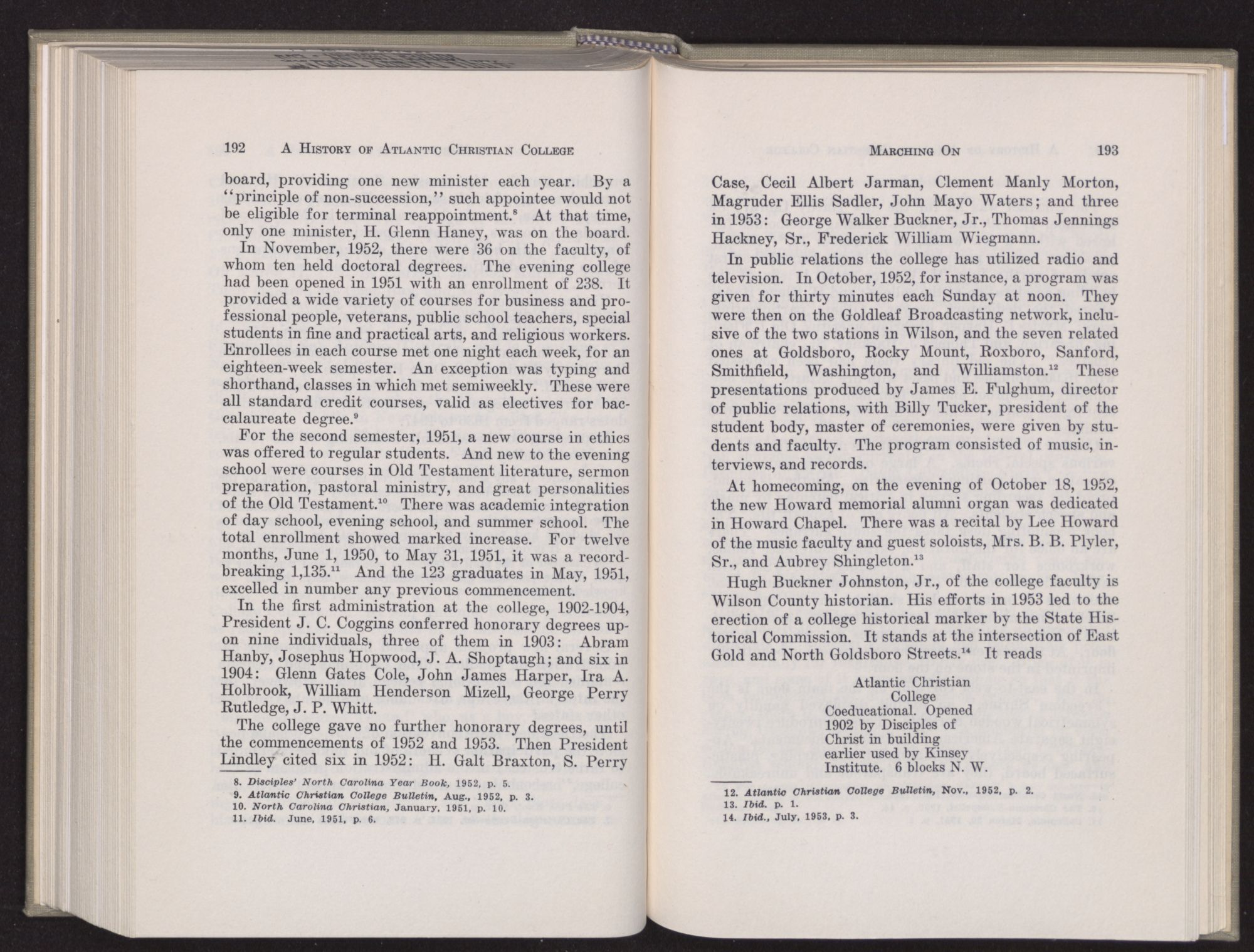 President White advised me on February 15, 1955, that he and the administration at Atlantic Christian College wanted me to write a factual history of the institution—to give an authentic story of its background and its fifty-four years of activity. Perhaps the lot fell to me because of my forty-five years of close touch with the college and my lifelong interest in Disciple lore. Collating necessary sources, I proceeded with the manuscript and completed it within a year. Assisting me was an advisory history committee composed of currently employed college personnel, including: Perry Case, C. H. Hamlin, Sarah Bain Ward, and Mrs. Mary Wilson. Each had long been a part of the school. President White, Dean Moudy, and this committee were most helpful, for which I am deeply thankful. Nevertheless, the shortcomings of this narrative, howsoever many, are chargeable solely to me. I have no alibi.