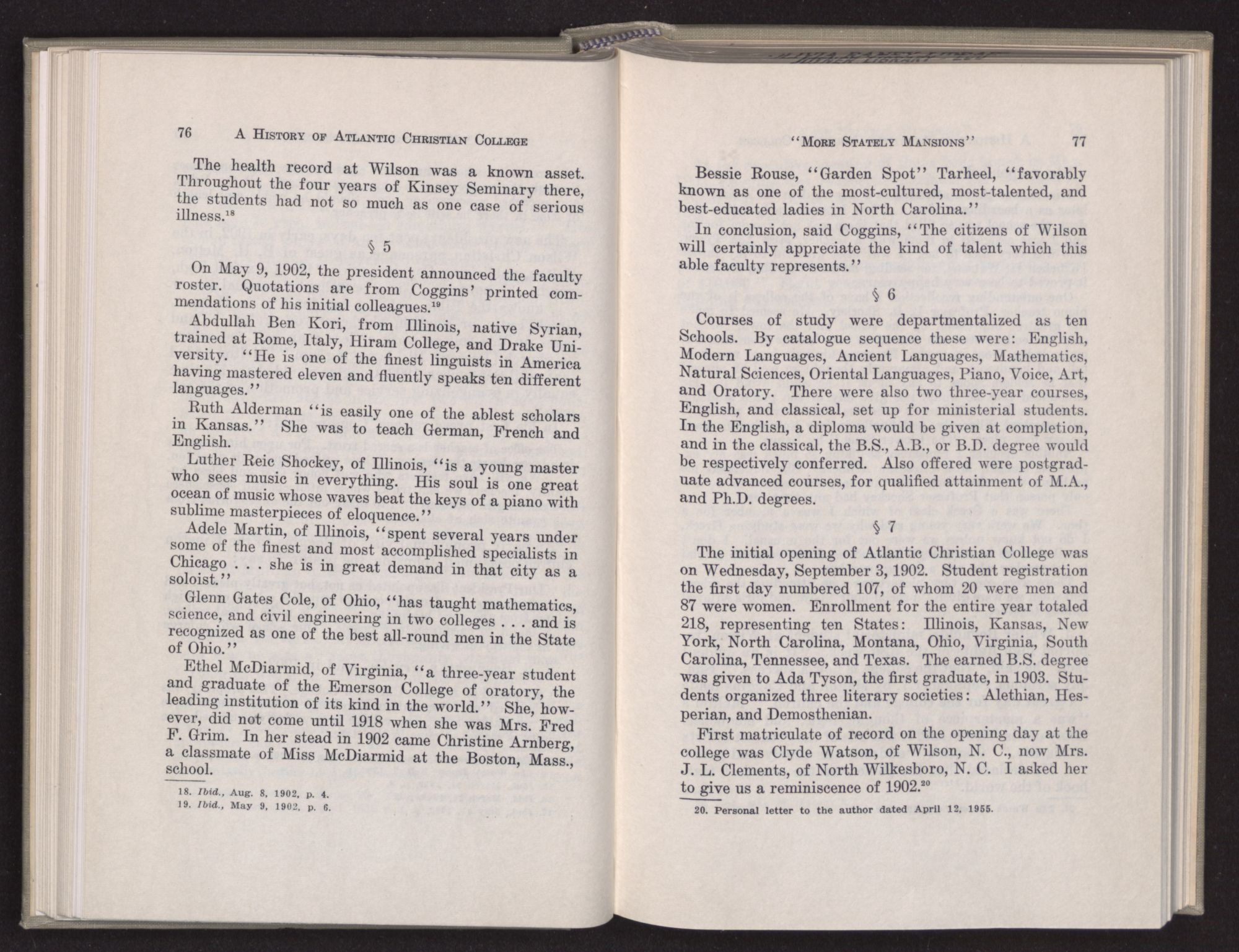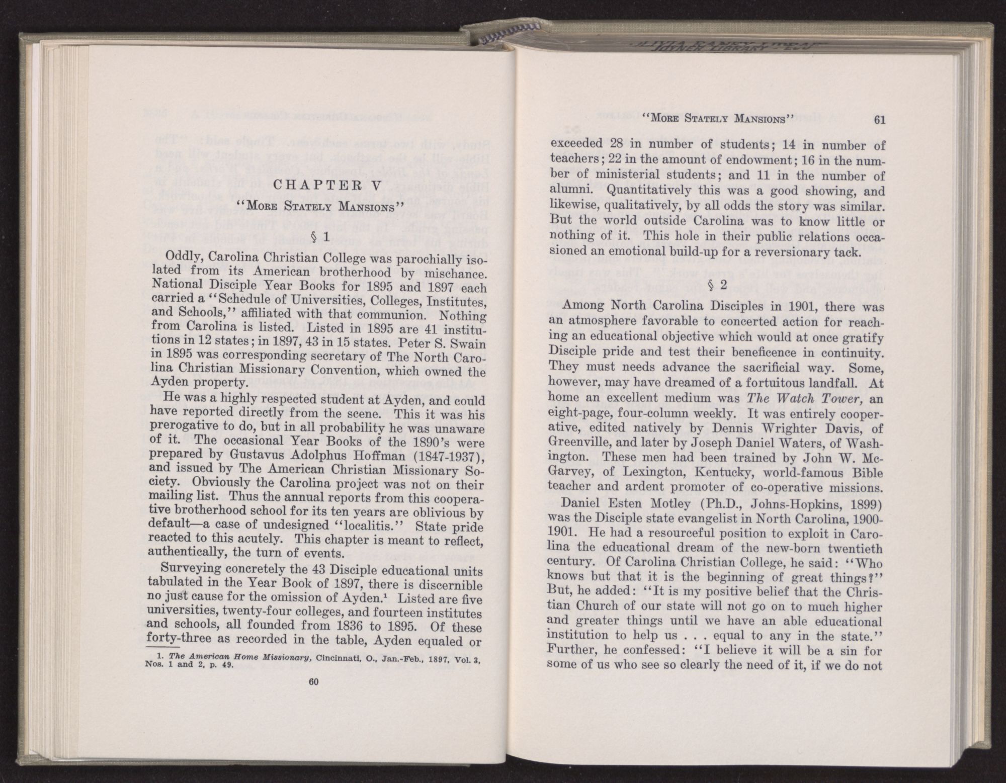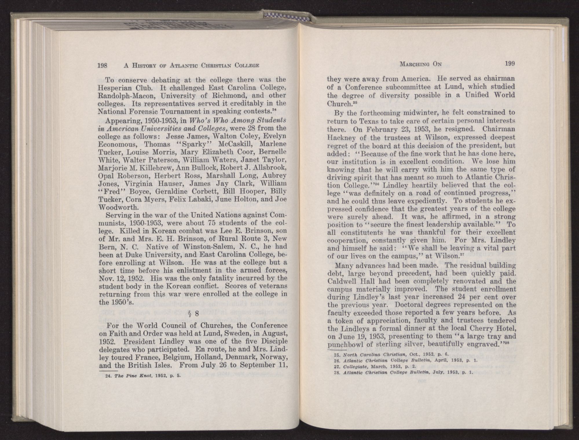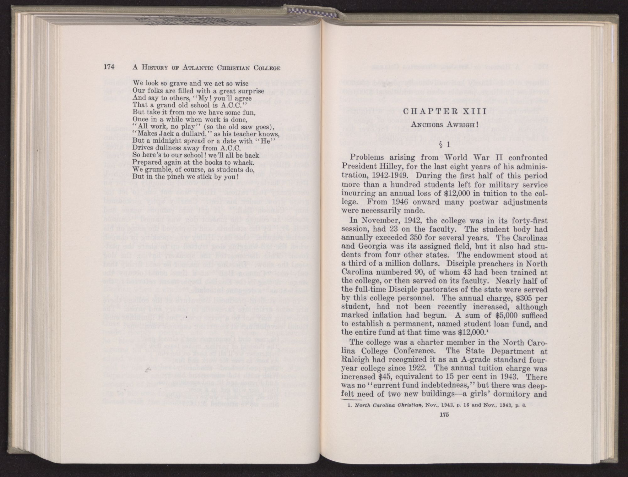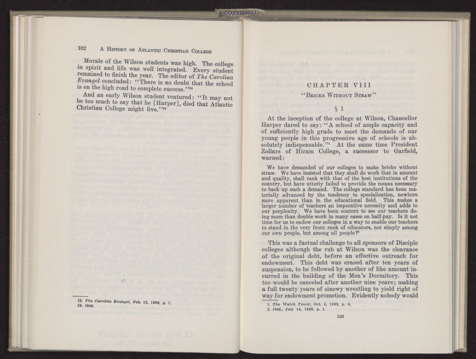President White advised me on February 15, 1955, that he and the administration at Atlantic Christian College wanted me to write a factual history of the institution—to give an authentic story of its background and its fifty-four years of activity. Perhaps the lot fell to me because of my forty-five years of close touch with the college and my lifelong interest in Disciple lore. Collating necessary sources, I proceeded with the manuscript and completed it within a year. Assisting me was an advisory history committee composed of currently employed college personnel, including: Perry Case, C. H. Hamlin, Sarah Bain Ward, and Mrs. Mary Wilson. Each had long been a part of the school. President White, Dean Moudy, and this committee were most helpful, for which I am deeply thankful. Nevertheless, the shortcomings of this narrative, howsoever many, are chargeable solely to me. I have no alibi.