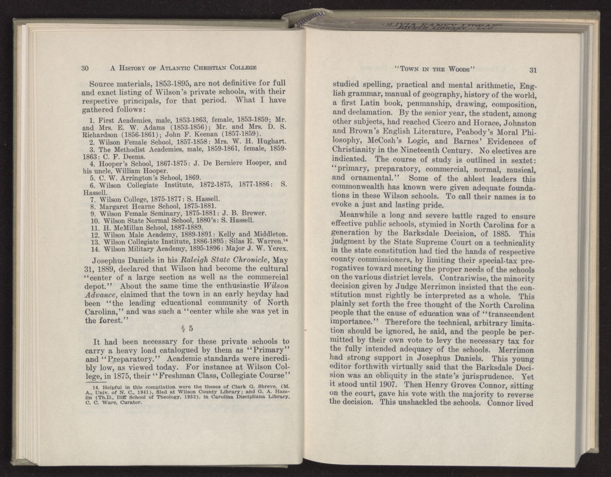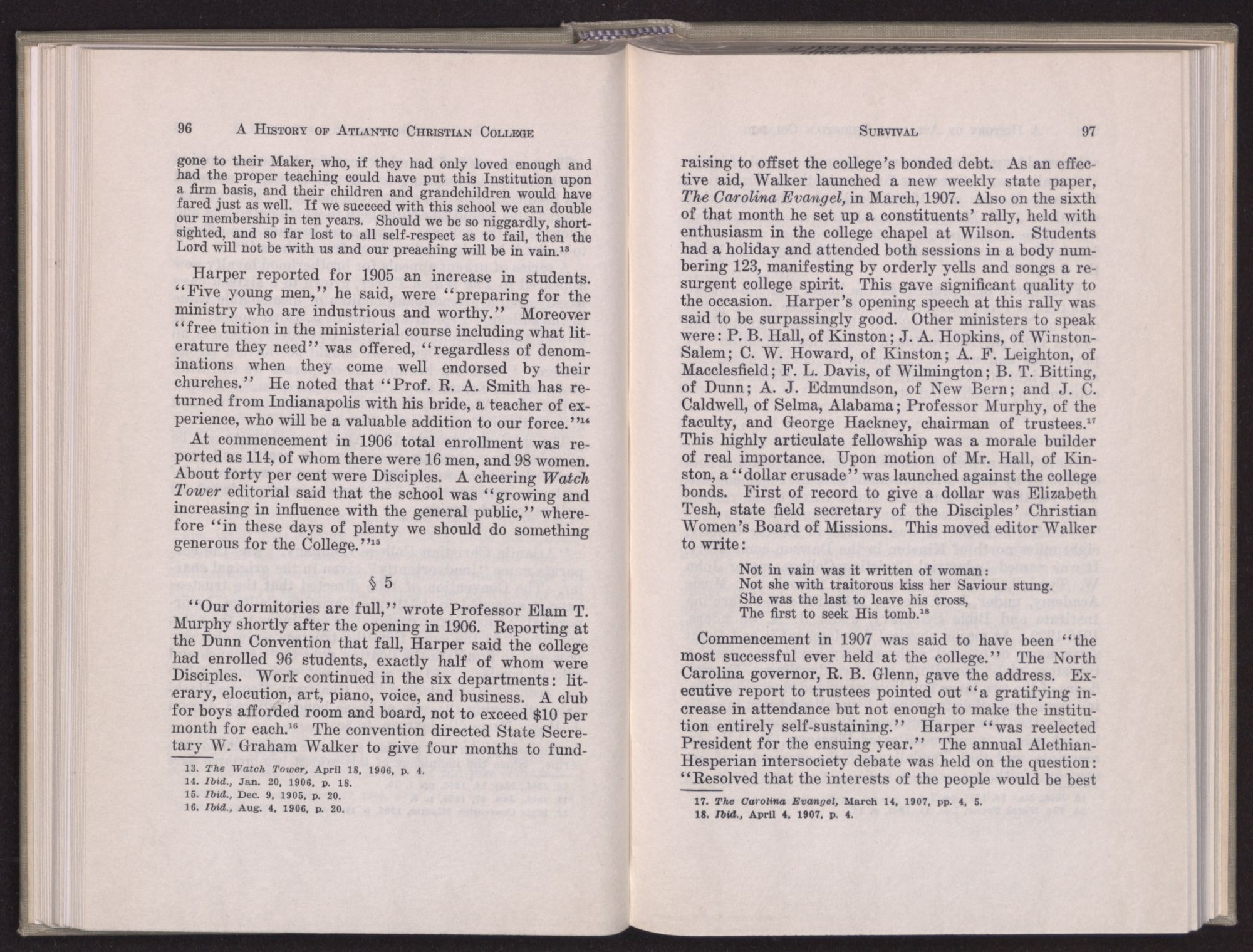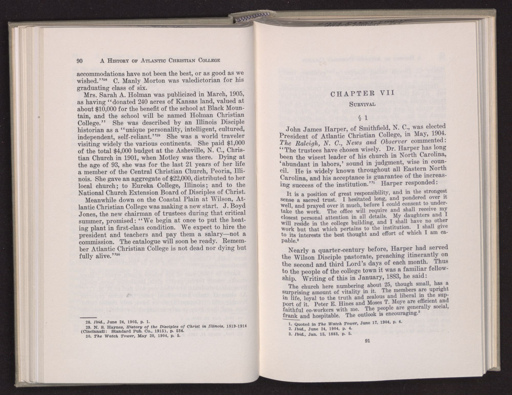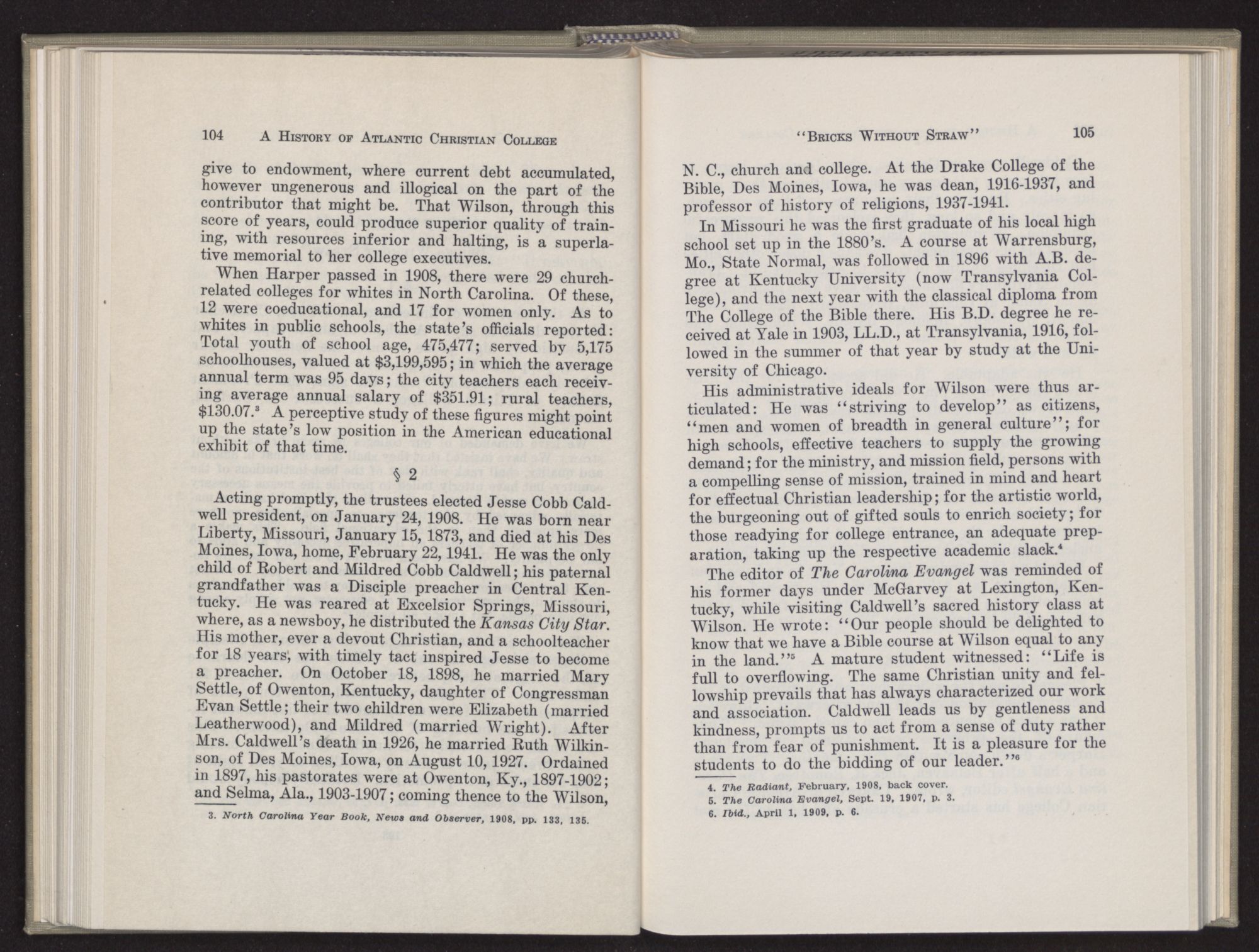 President White advised me on February 15, 1955, that he and the administration at Atlantic Christian College wanted me to write a factual history of the institution—to give an authentic story of its background and its fifty-four years of activity. Perhaps the lot fell to me because of my forty-five years of close touch with the college and my lifelong interest in Disciple lore. Collating necessary sources, I proceeded with the manuscript and completed it within a year. Assisting me was an advisory history committee composed of currently employed college personnel, including: Perry Case, C. H. Hamlin, Sarah Bain Ward, and Mrs. Mary Wilson. Each had long been a part of the school. President White, Dean Moudy, and this committee were most helpful, for which I am deeply thankful. Nevertheless, the shortcomings of this narrative, howsoever many, are chargeable solely to me. I have no alibi.