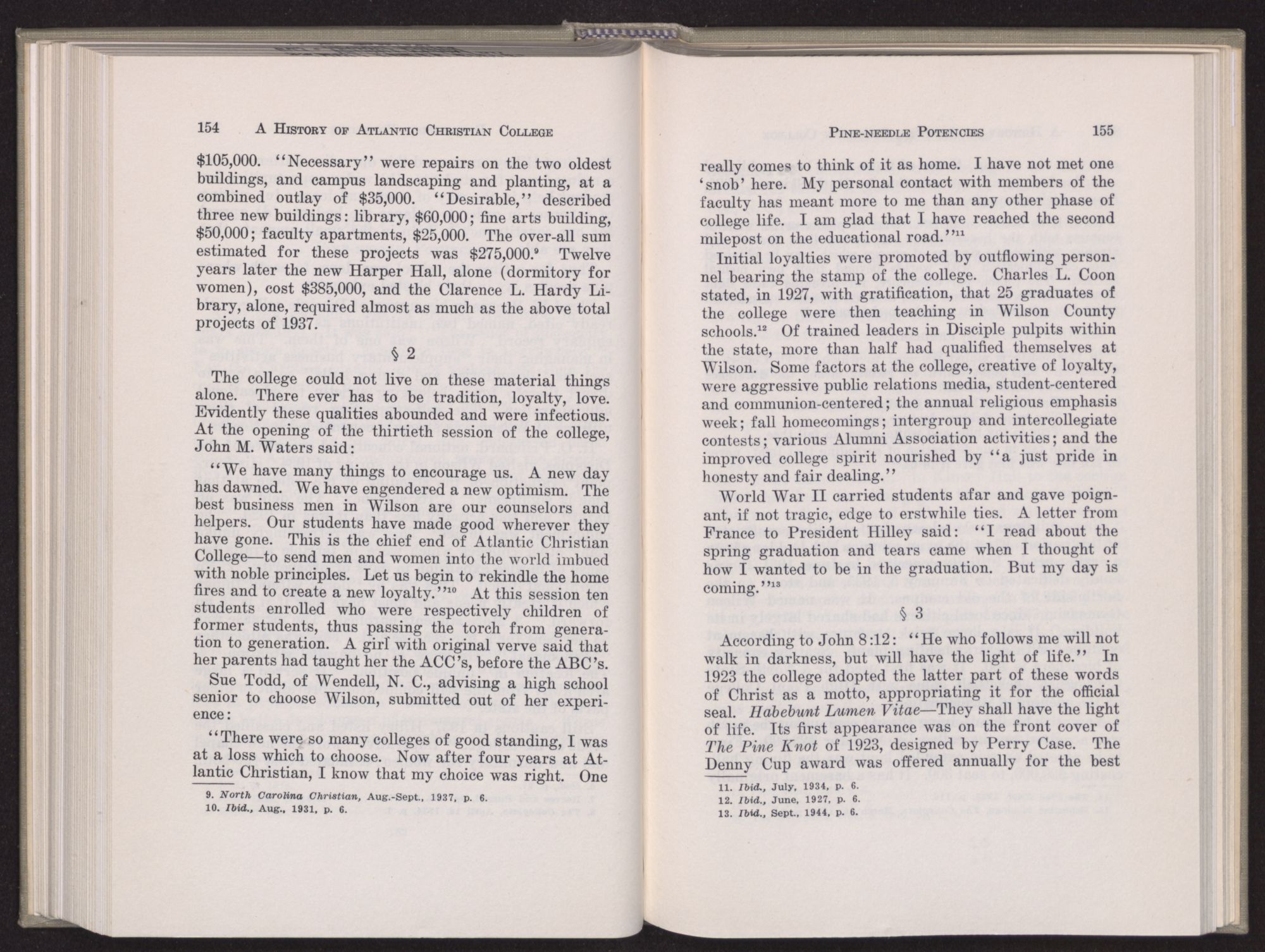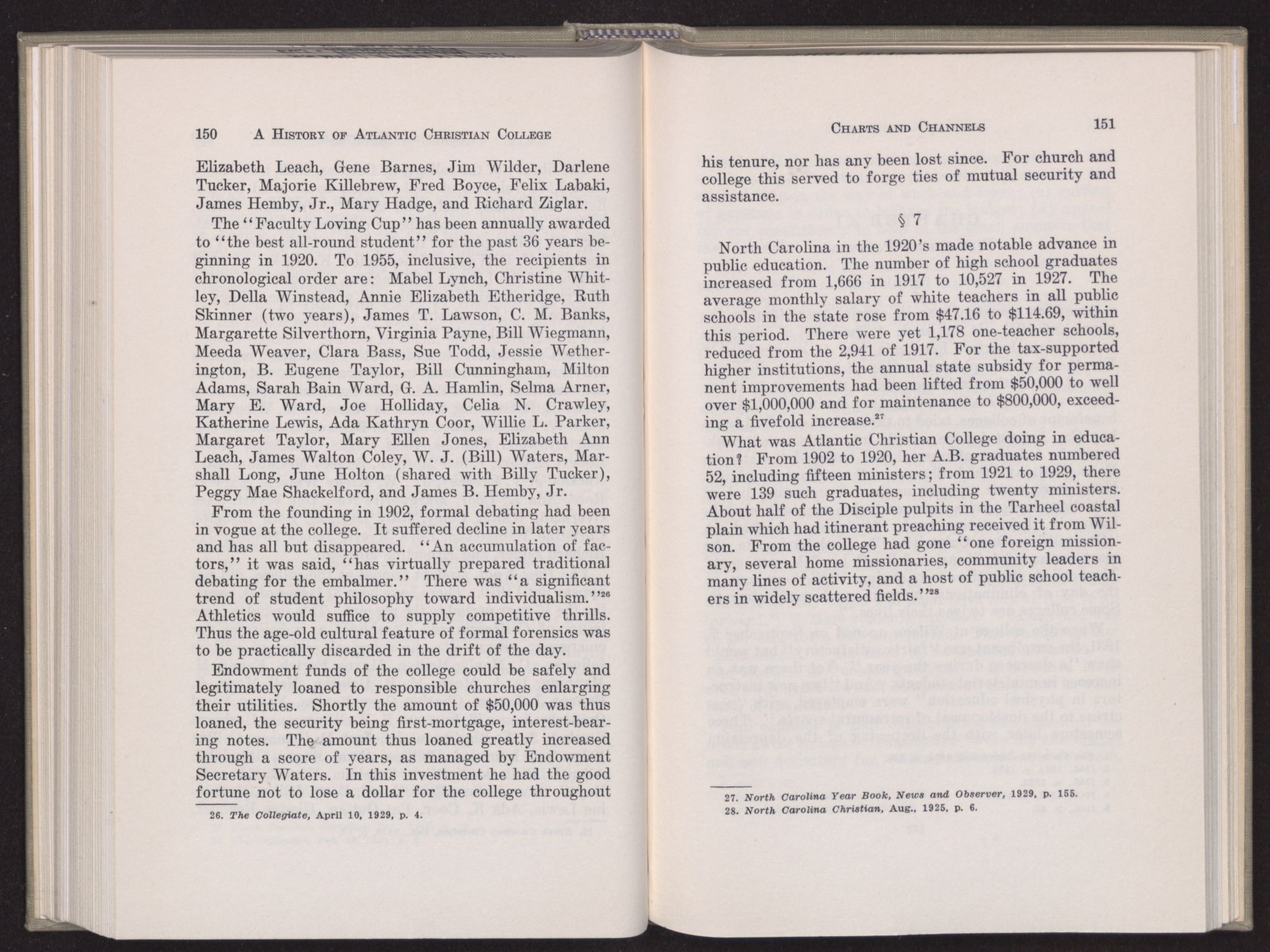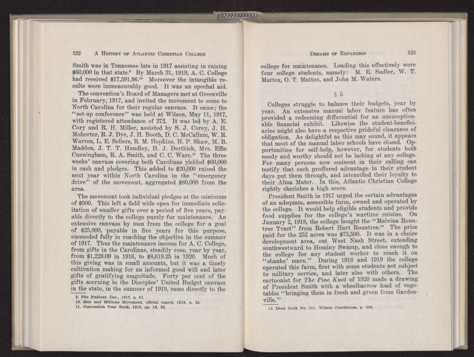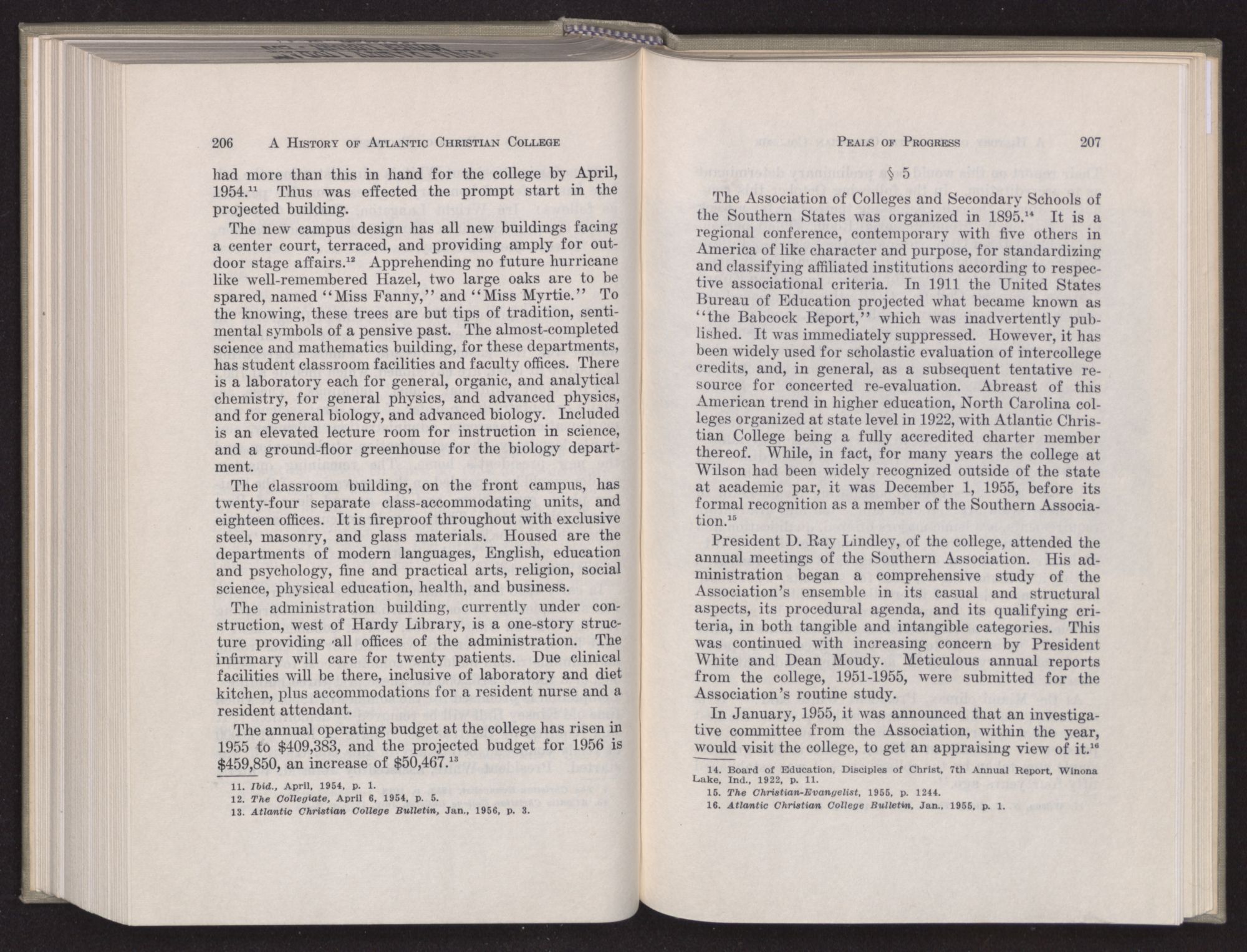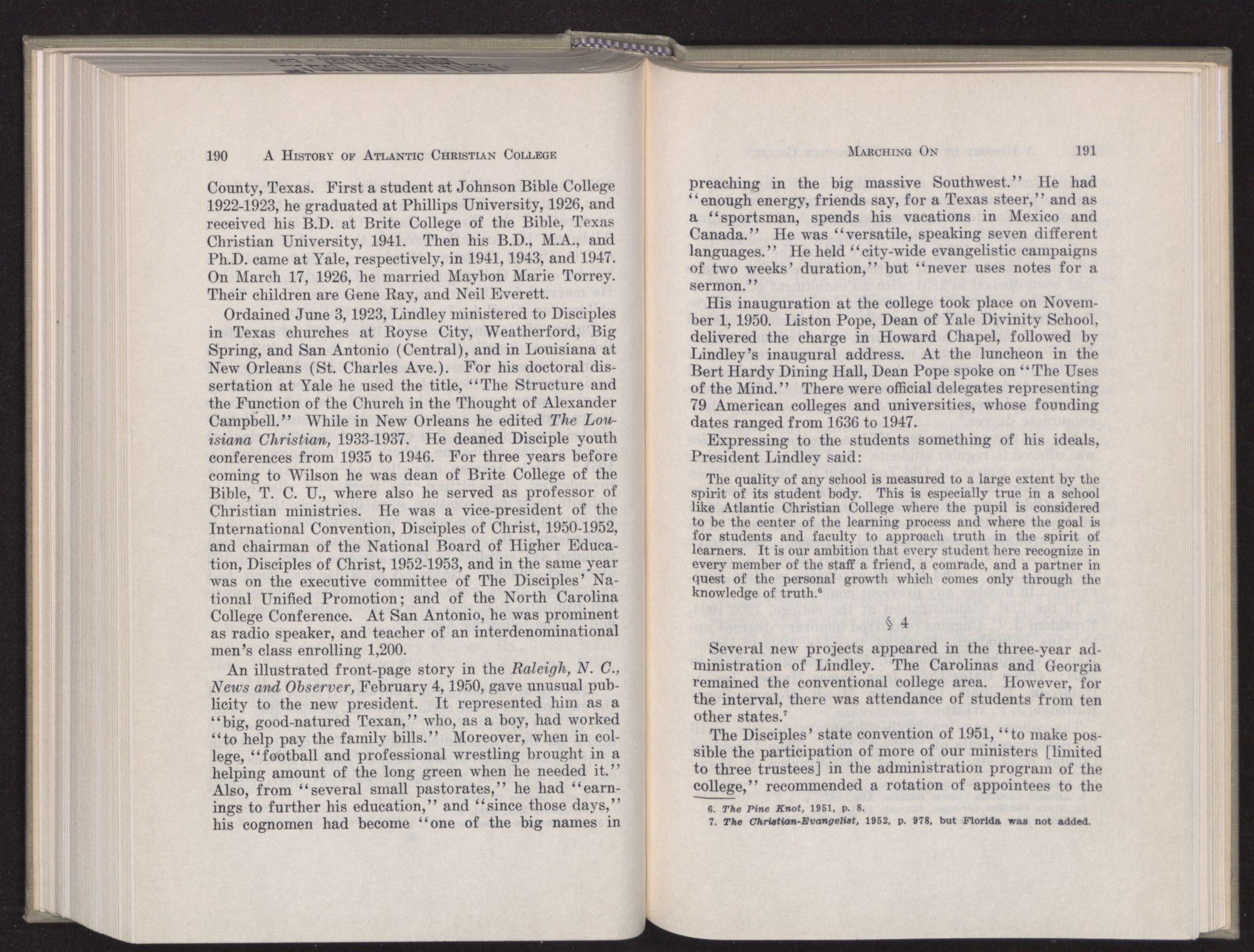 President White advised me on February 15, 1955, that he and the administration at Atlantic Christian College wanted me to write a factual history of the institution—to give an authentic story of its background and its fifty-four years of activity. Perhaps the lot fell to me because of my forty-five years of close touch with the college and my lifelong interest in Disciple lore. Collating necessary sources, I proceeded with the manuscript and completed it within a year. Assisting me was an advisory history committee composed of currently employed college personnel, including: Perry Case, C. H. Hamlin, Sarah Bain Ward, and Mrs. Mary Wilson. Each had long been a part of the school. President White, Dean Moudy, and this committee were most helpful, for which I am deeply thankful. Nevertheless, the shortcomings of this narrative, howsoever many, are chargeable solely to me. I have no alibi.