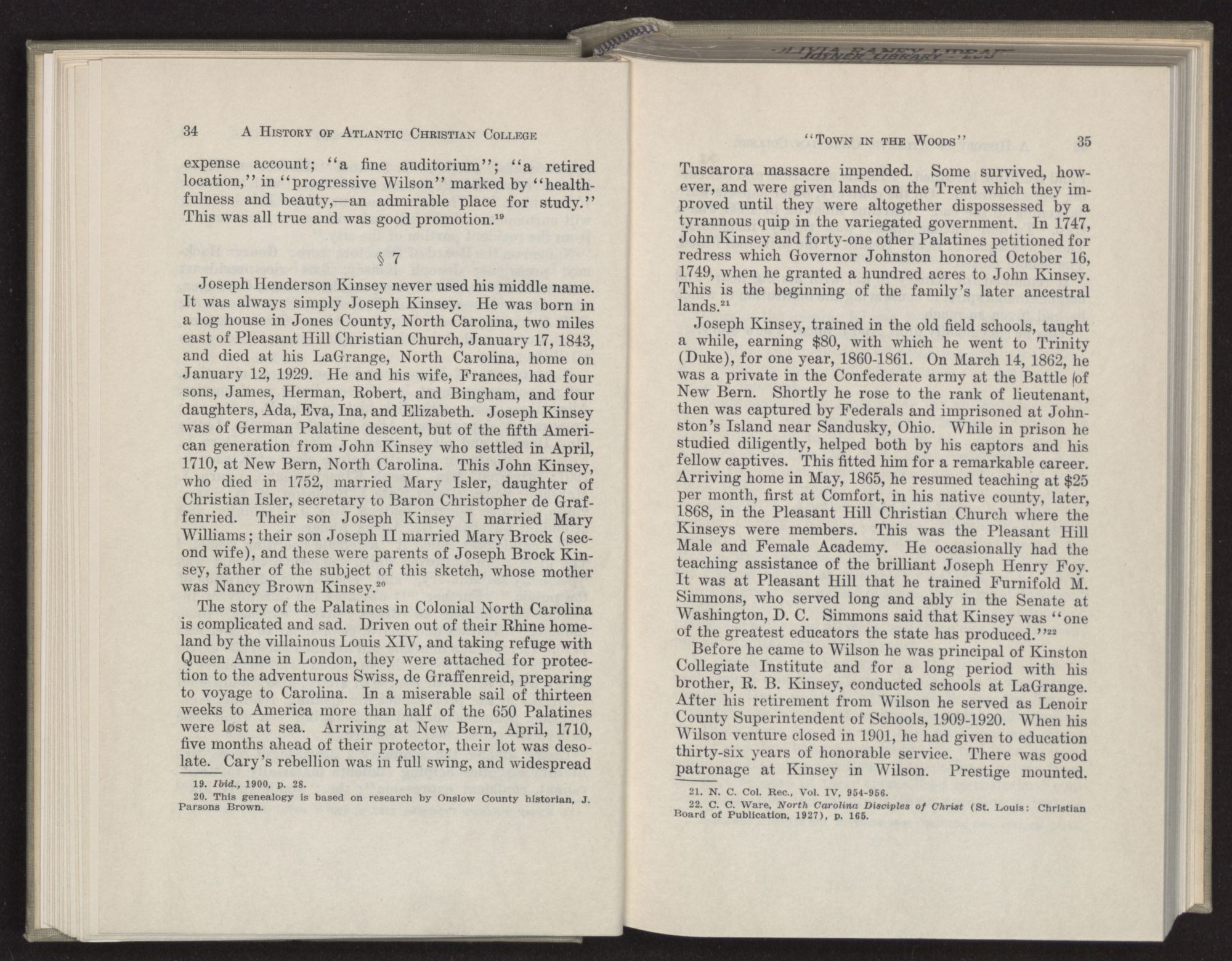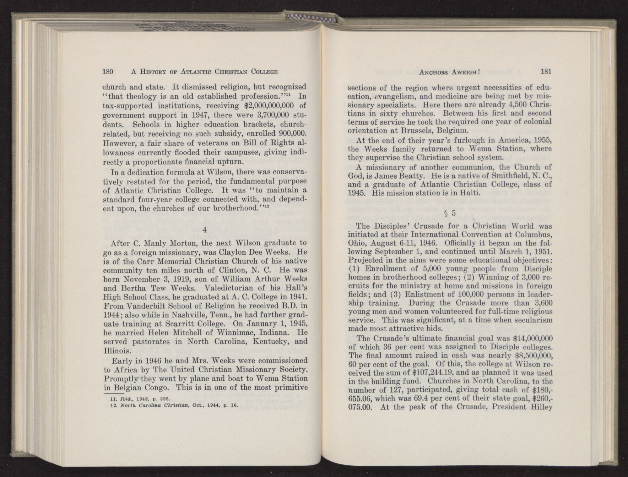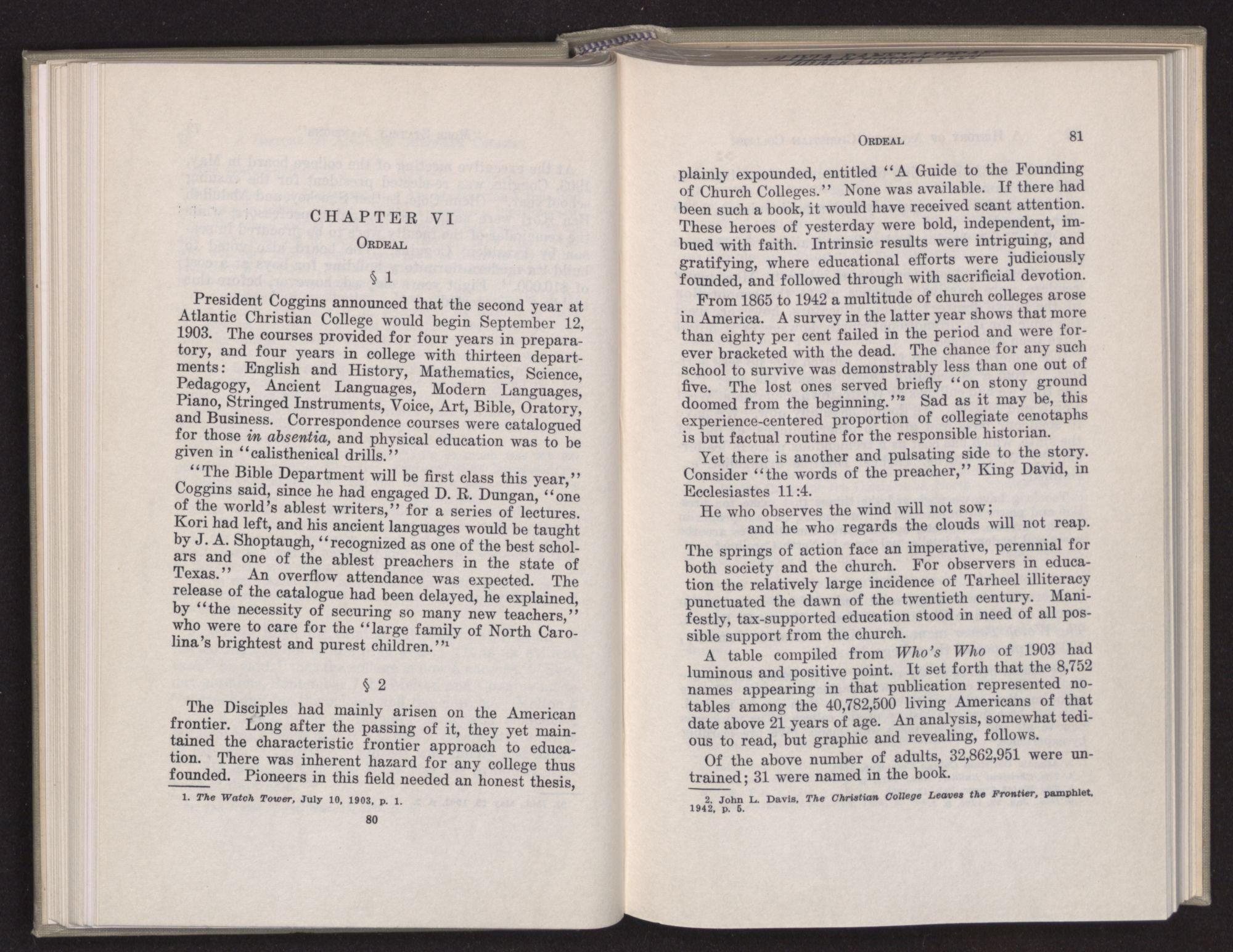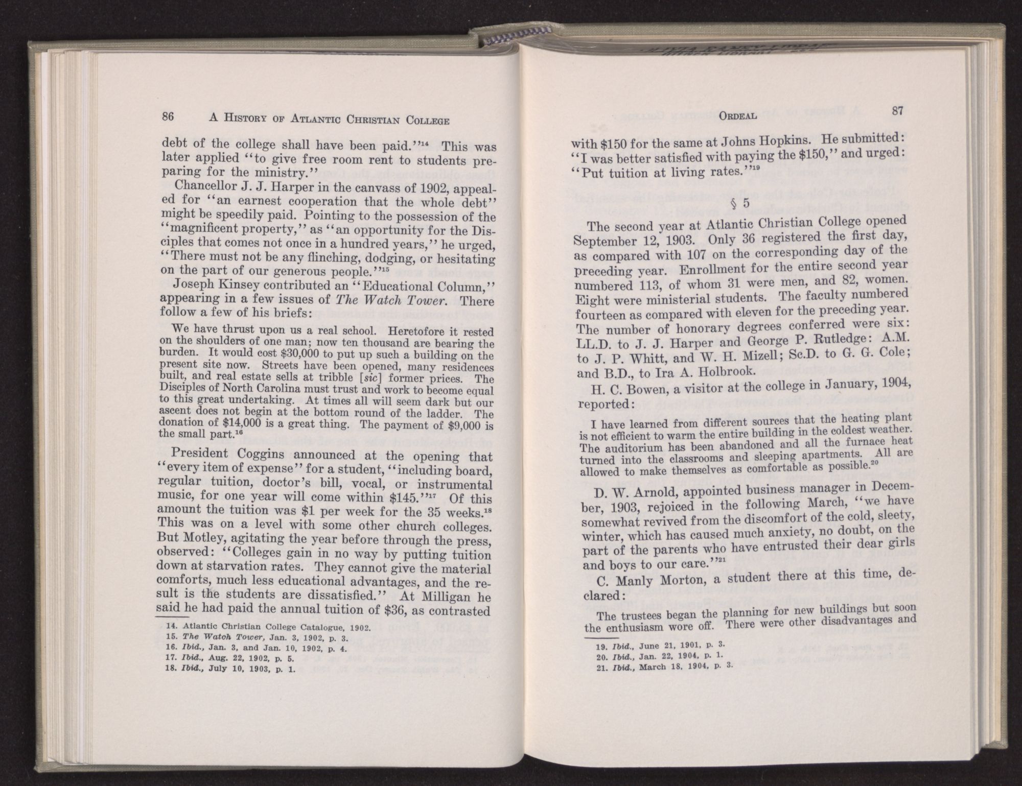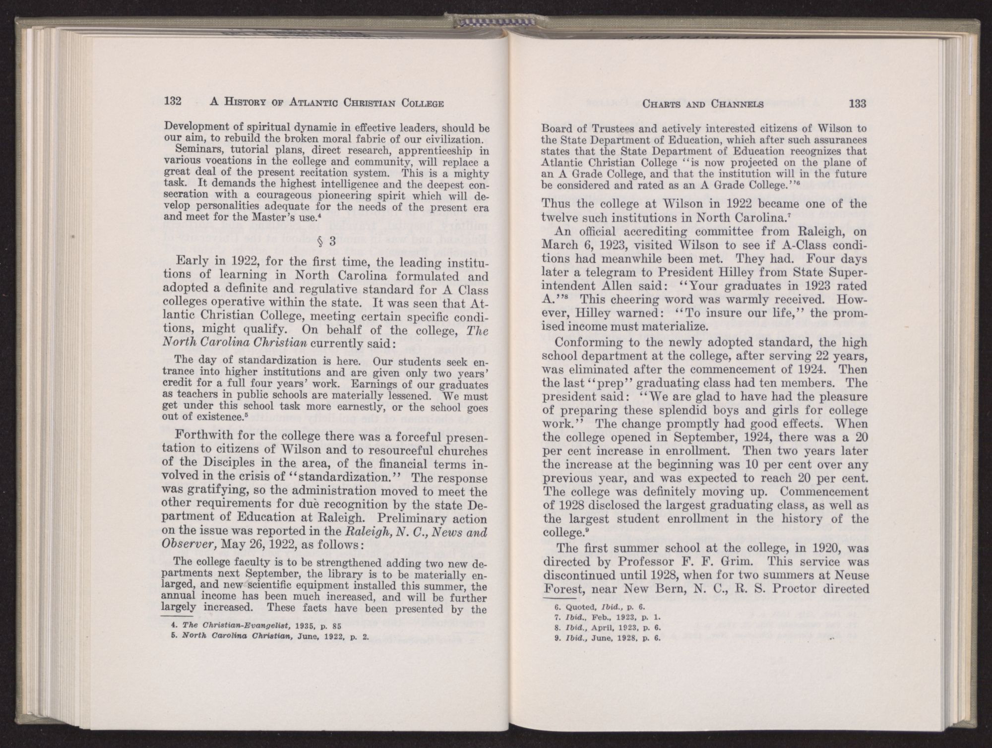President White advised me on February 15, 1955, that he and the administration at Atlantic Christian College wanted me to write a factual history of the institution—to give an authentic story of its background and its fifty-four years of activity. Perhaps the lot fell to me because of my forty-five years of close touch with the college and my lifelong interest in Disciple lore. Collating necessary sources, I proceeded with the manuscript and completed it within a year. Assisting me was an advisory history committee composed of currently employed college personnel, including: Perry Case, C. H. Hamlin, Sarah Bain Ward, and Mrs. Mary Wilson. Each had long been a part of the school. President White, Dean Moudy, and this committee were most helpful, for which I am deeply thankful. Nevertheless, the shortcomings of this narrative, howsoever many, are chargeable solely to me. I have no alibi.