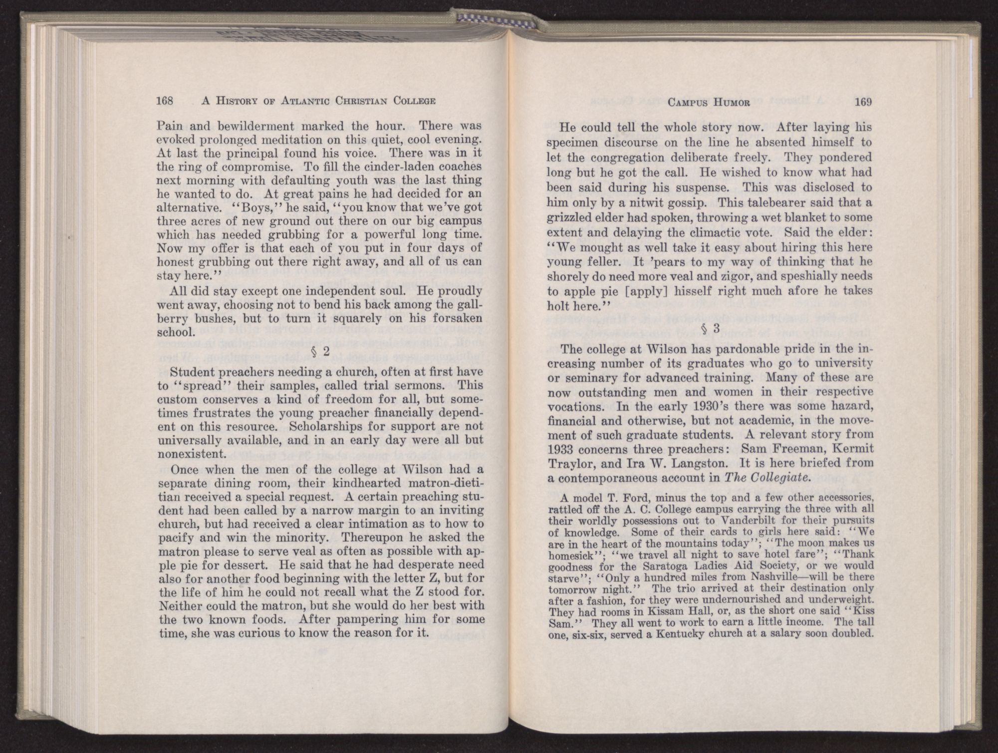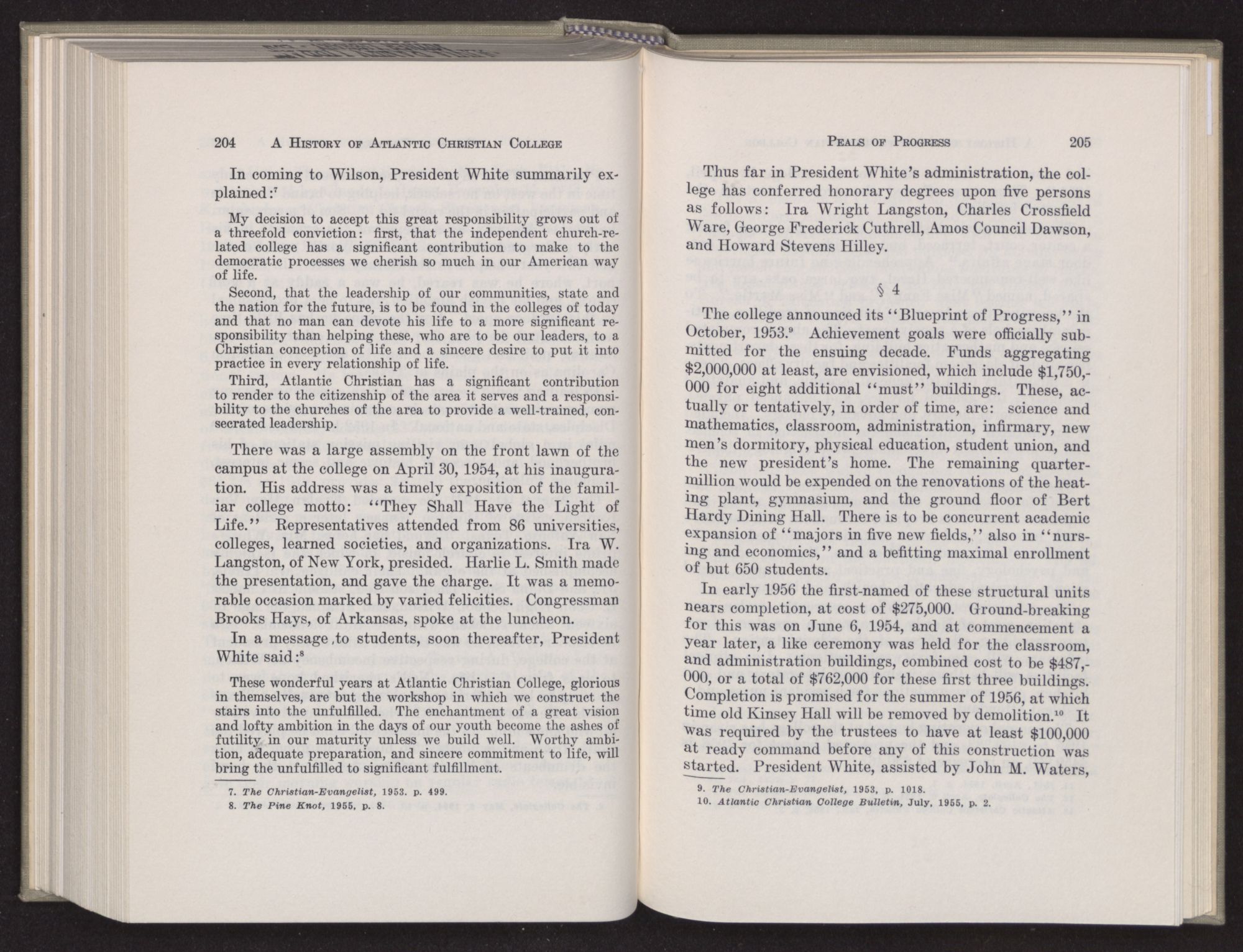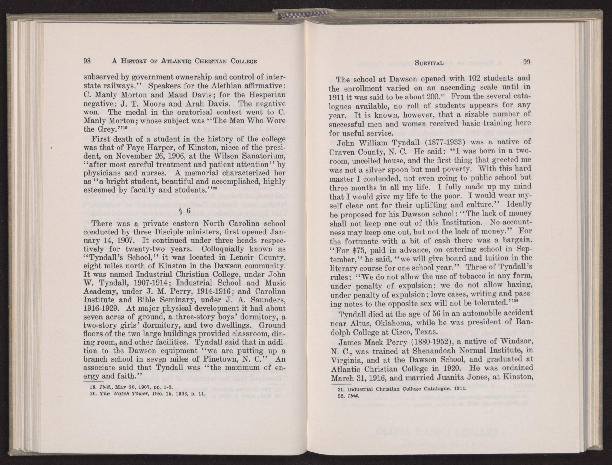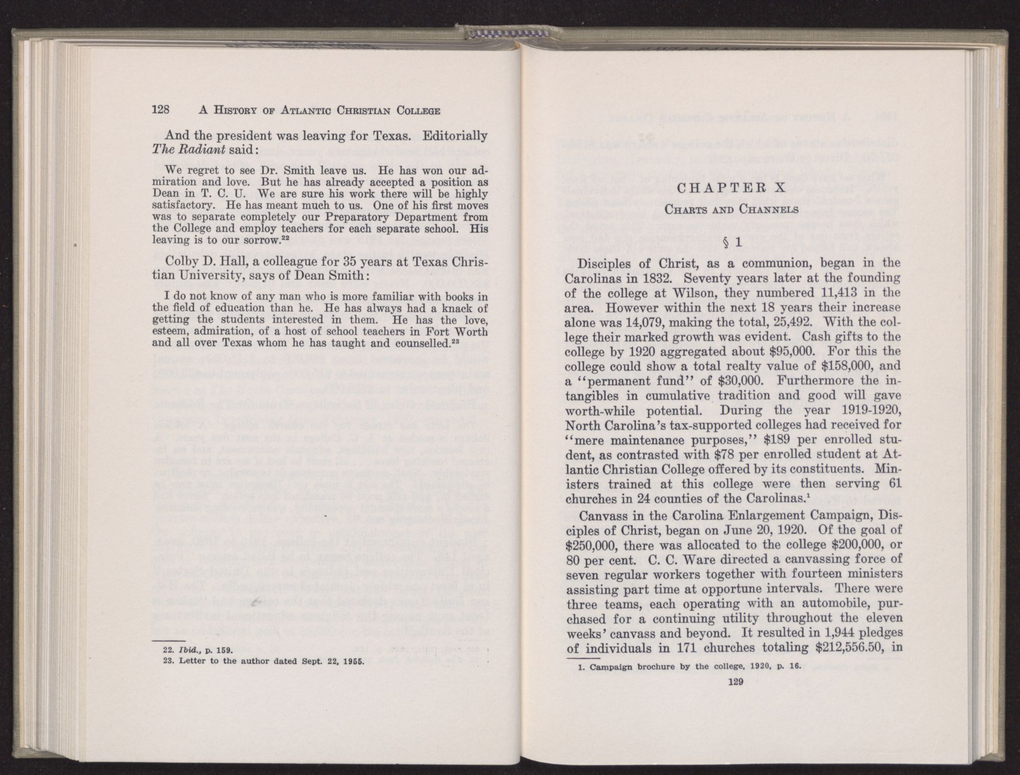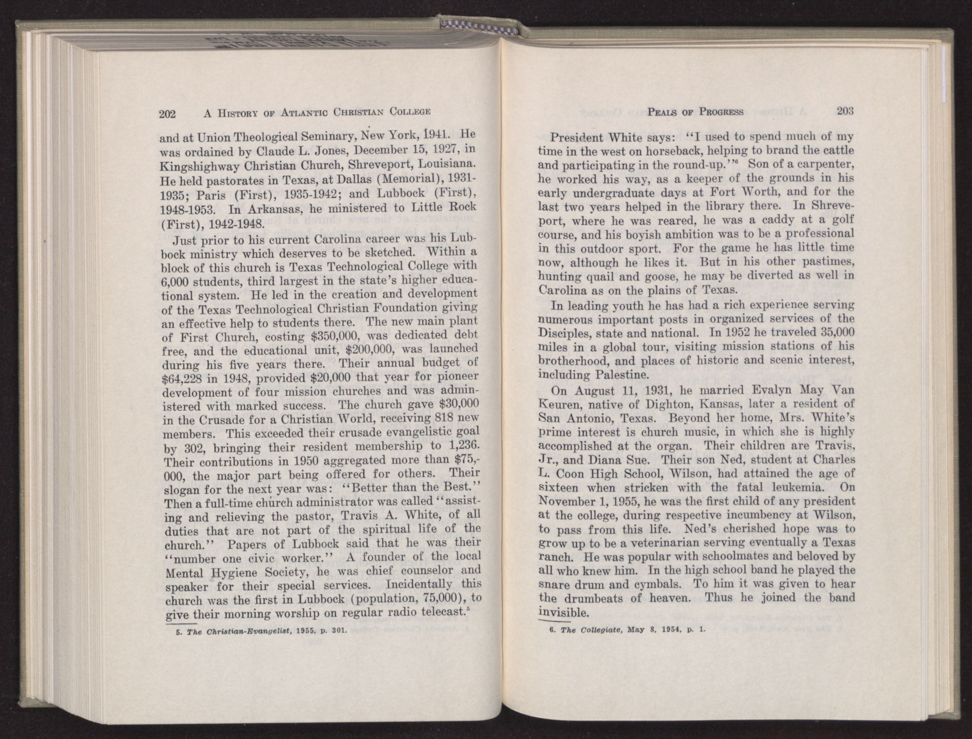 President White advised me on February 15, 1955, that he and the administration at Atlantic Christian College wanted me to write a factual history of the institution—to give an authentic story of its background and its fifty-four years of activity. Perhaps the lot fell to me because of my forty-five years of close touch with the college and my lifelong interest in Disciple lore. Collating necessary sources, I proceeded with the manuscript and completed it within a year. Assisting me was an advisory history committee composed of currently employed college personnel, including: Perry Case, C. H. Hamlin, Sarah Bain Ward, and Mrs. Mary Wilson. Each had long been a part of the school. President White, Dean Moudy, and this committee were most helpful, for which I am deeply thankful. Nevertheless, the shortcomings of this narrative, howsoever many, are chargeable solely to me. I have no alibi.