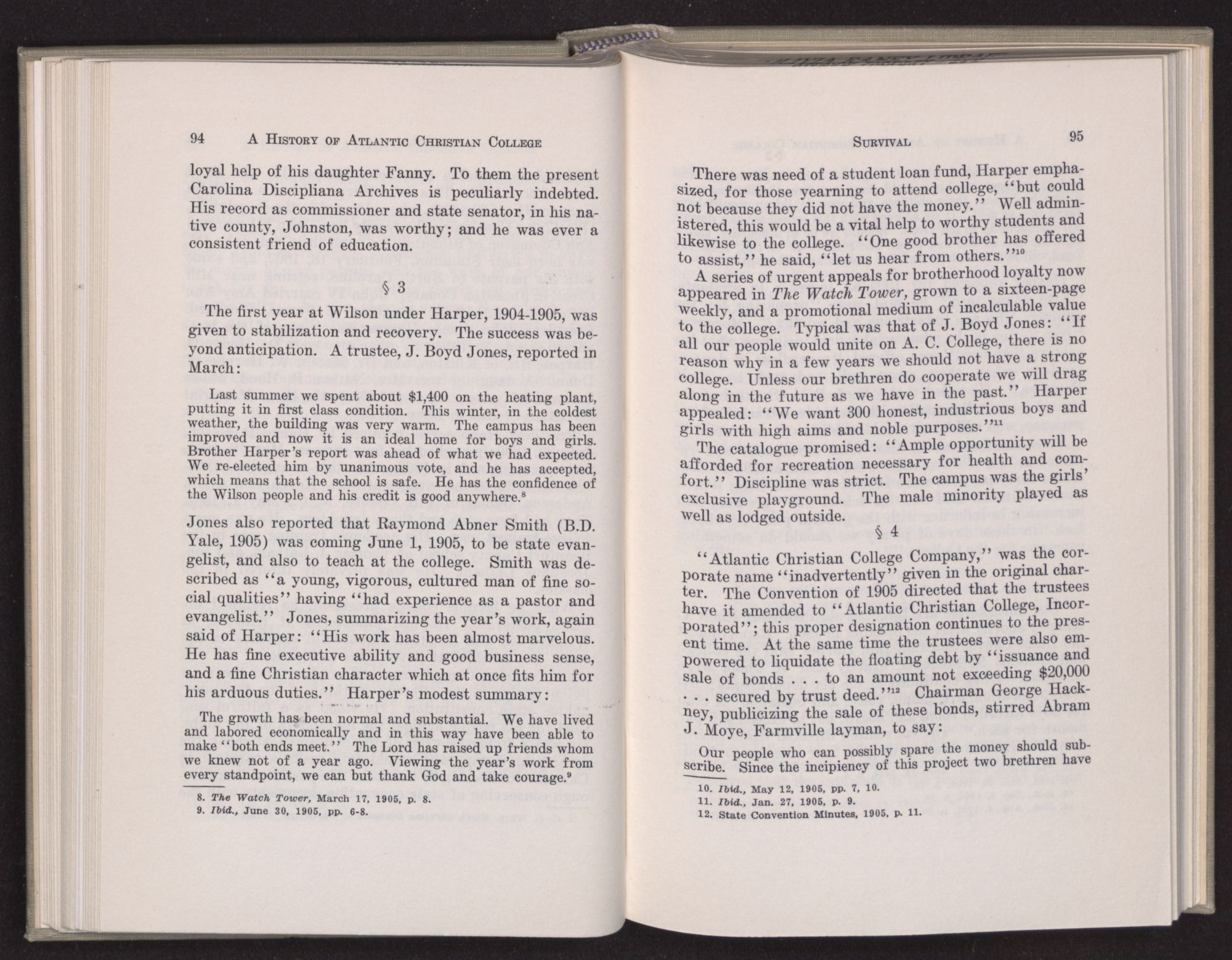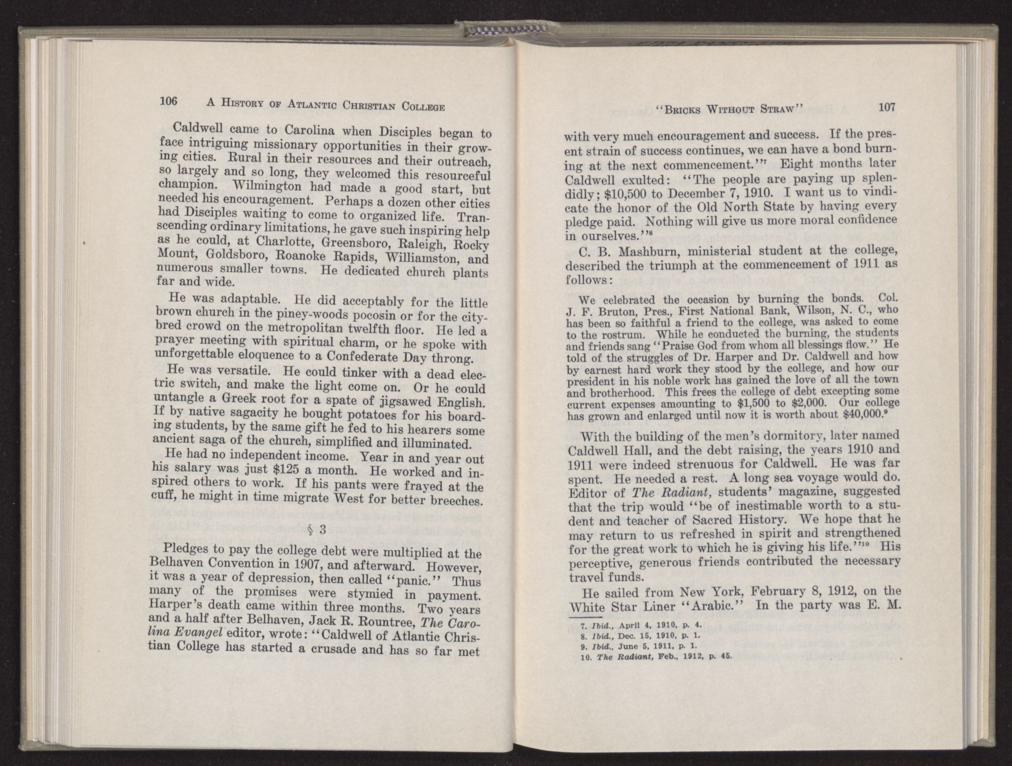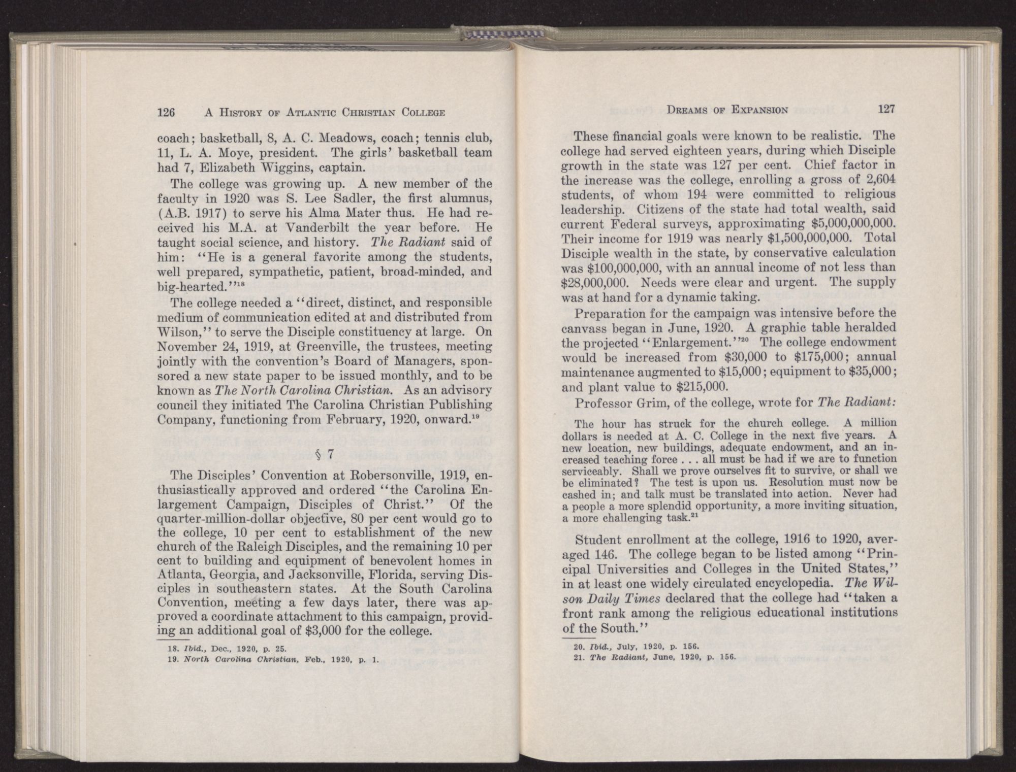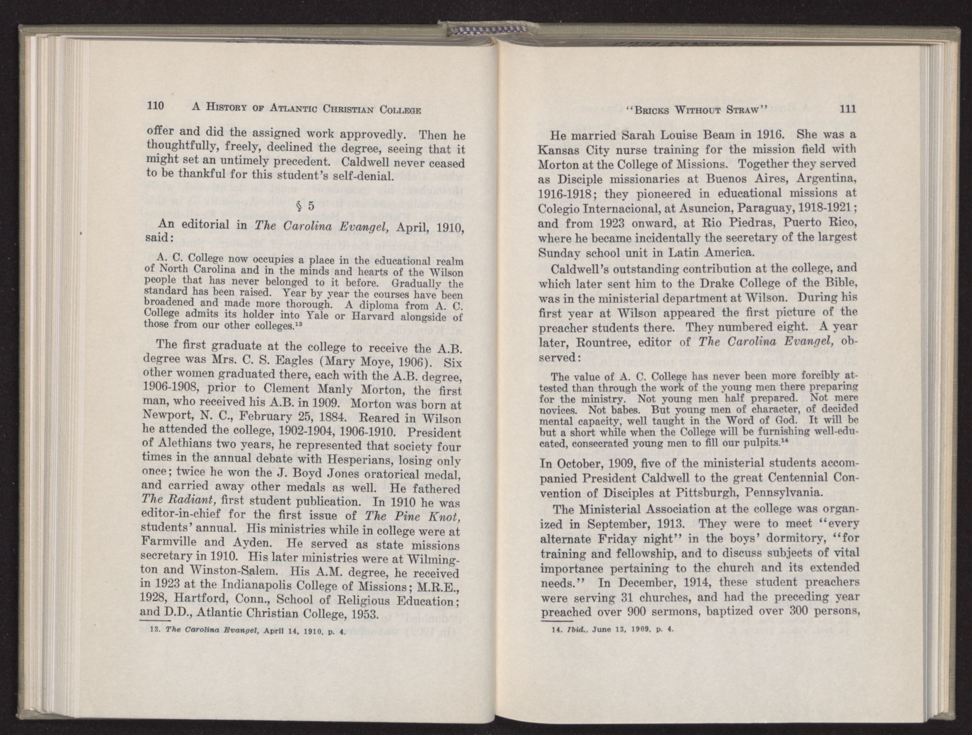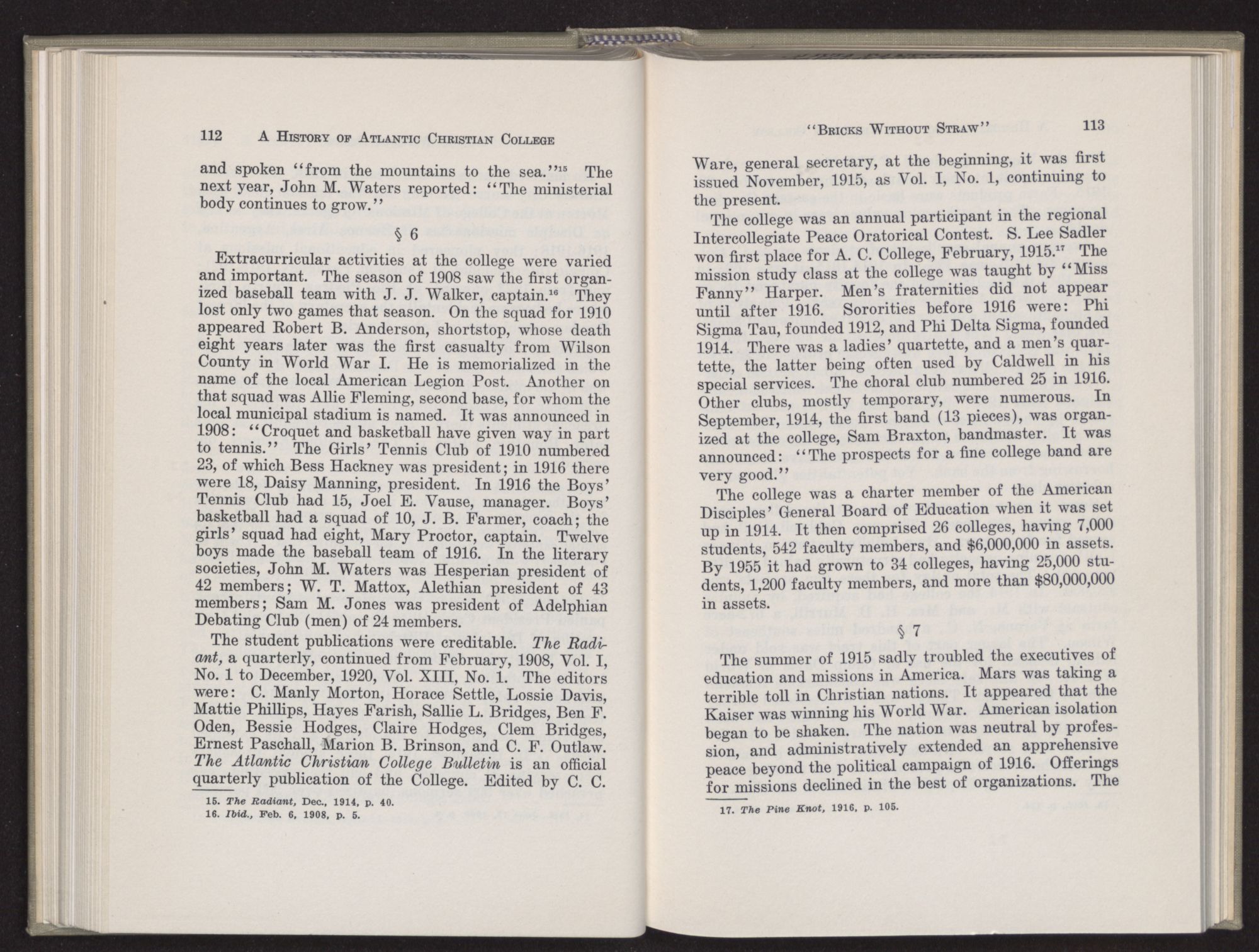 President White advised me on February 15, 1955, that he and the administration at Atlantic Christian College wanted me to write a factual history of the institution—to give an authentic story of its background and its fifty-four years of activity. Perhaps the lot fell to me because of my forty-five years of close touch with the college and my lifelong interest in Disciple lore. Collating necessary sources, I proceeded with the manuscript and completed it within a year. Assisting me was an advisory history committee composed of currently employed college personnel, including: Perry Case, C. H. Hamlin, Sarah Bain Ward, and Mrs. Mary Wilson. Each had long been a part of the school. President White, Dean Moudy, and this committee were most helpful, for which I am deeply thankful. Nevertheless, the shortcomings of this narrative, howsoever many, are chargeable solely to me. I have no alibi.