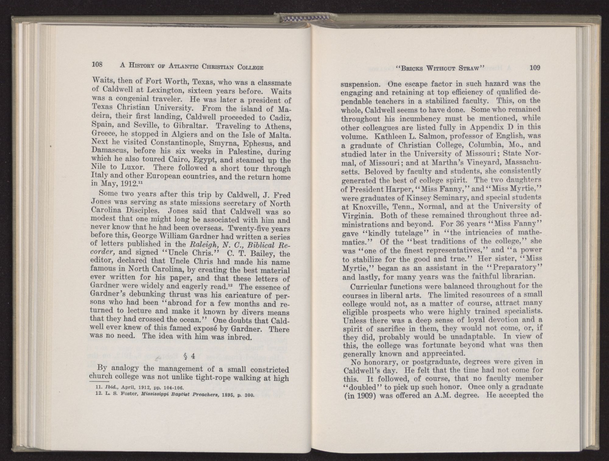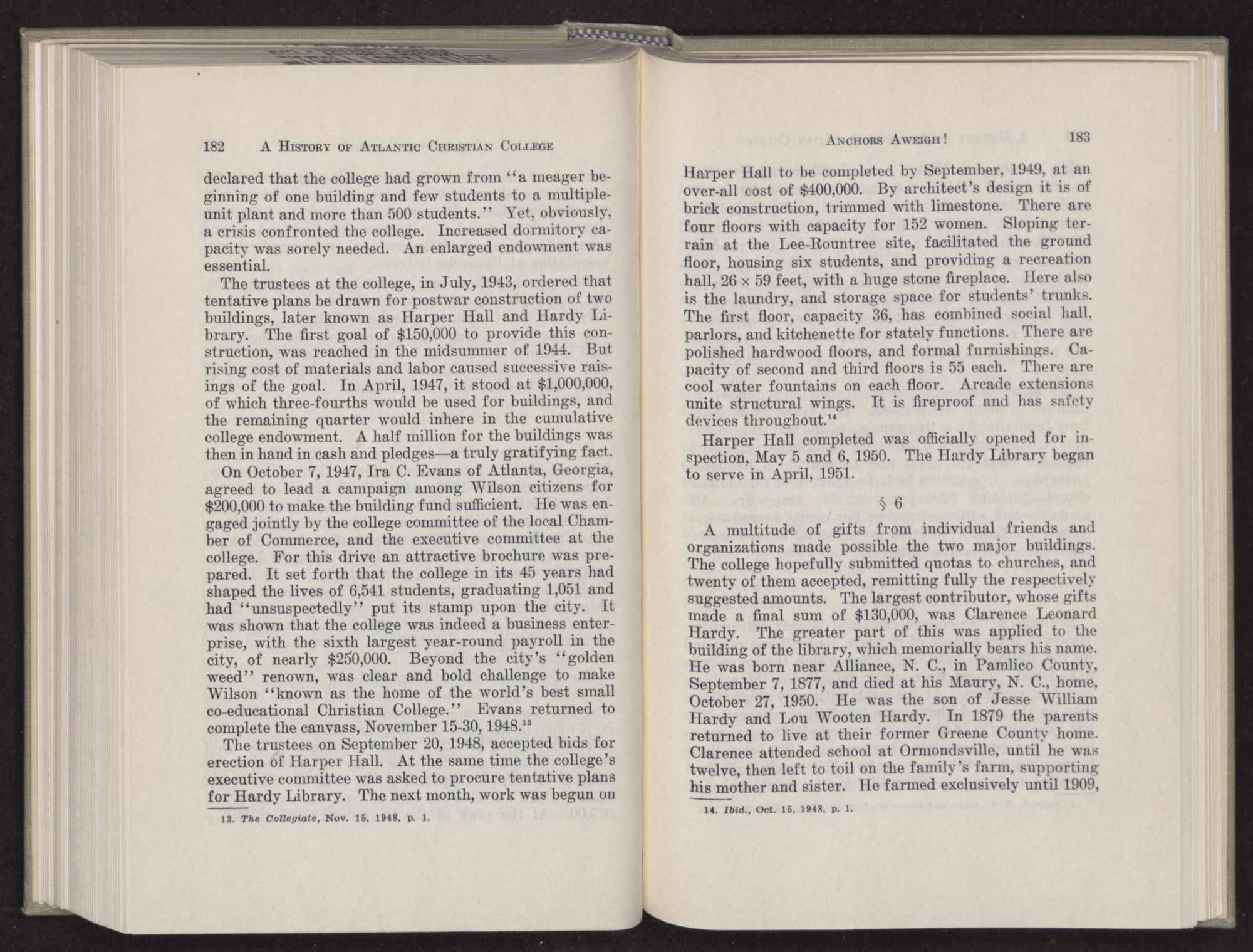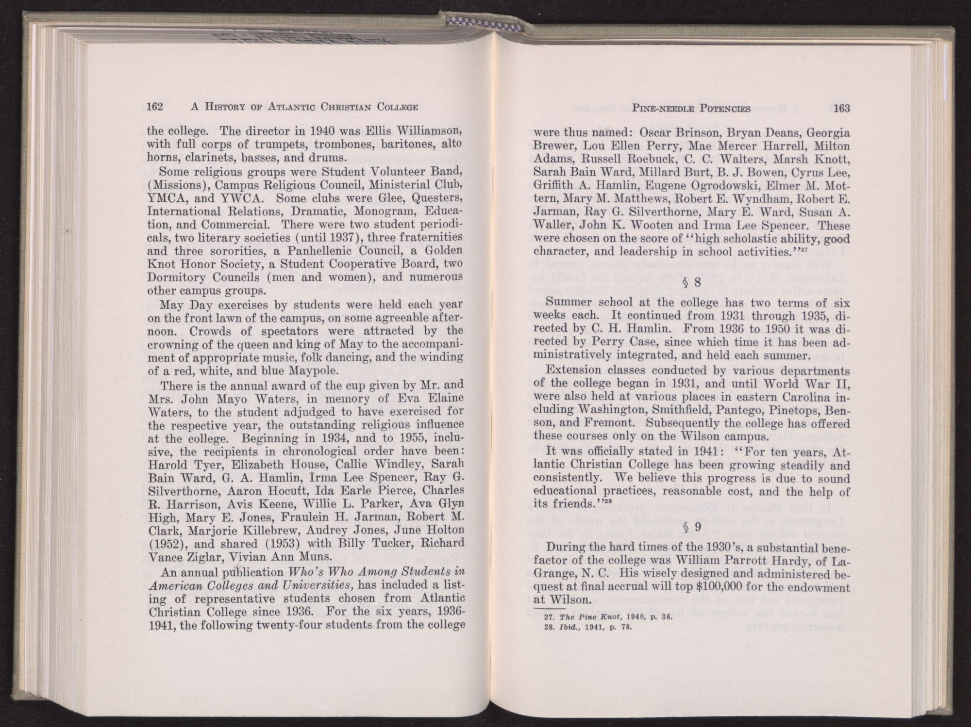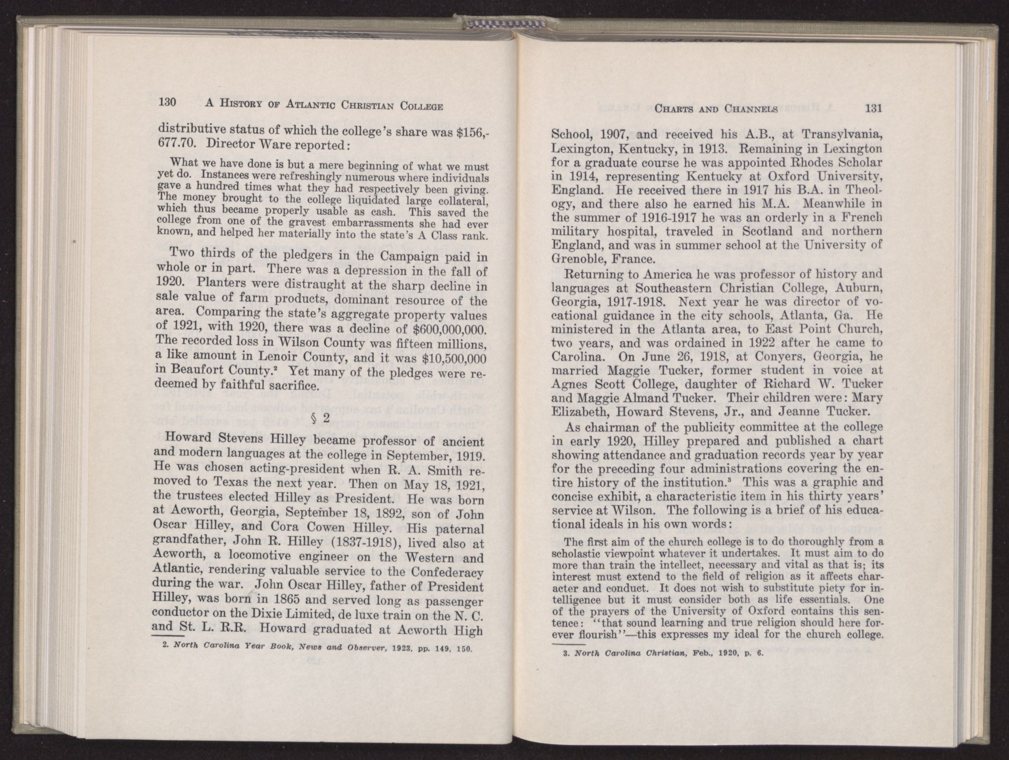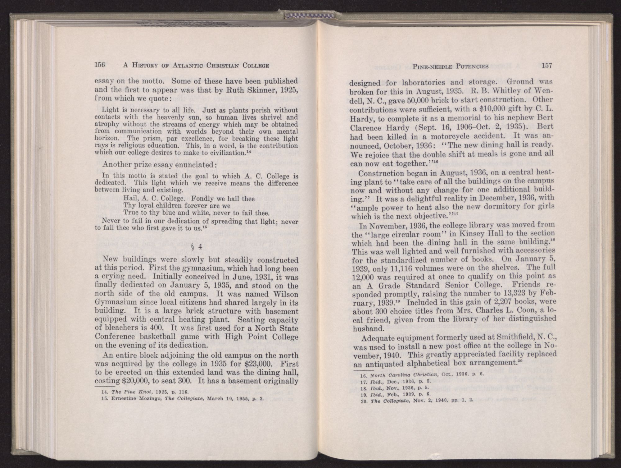 President White advised me on February 15, 1955, that he and the administration at Atlantic Christian College wanted me to write a factual history of the institution—to give an authentic story of its background and its fifty-four years of activity. Perhaps the lot fell to me because of my forty-five years of close touch with the college and my lifelong interest in Disciple lore. Collating necessary sources, I proceeded with the manuscript and completed it within a year. Assisting me was an advisory history committee composed of currently employed college personnel, including: Perry Case, C. H. Hamlin, Sarah Bain Ward, and Mrs. Mary Wilson. Each had long been a part of the school. President White, Dean Moudy, and this committee were most helpful, for which I am deeply thankful. Nevertheless, the shortcomings of this narrative, howsoever many, are chargeable solely to me. I have no alibi.
