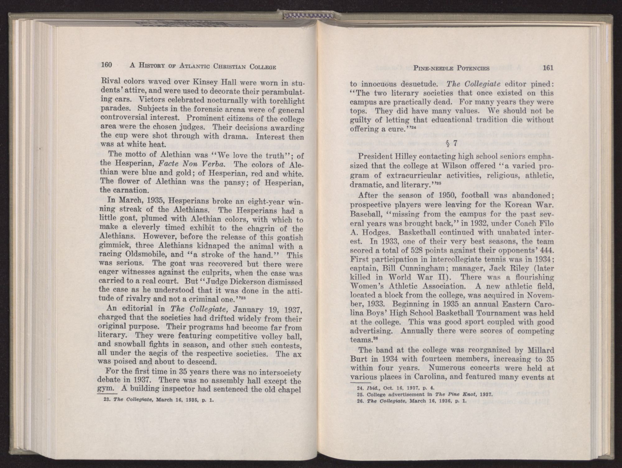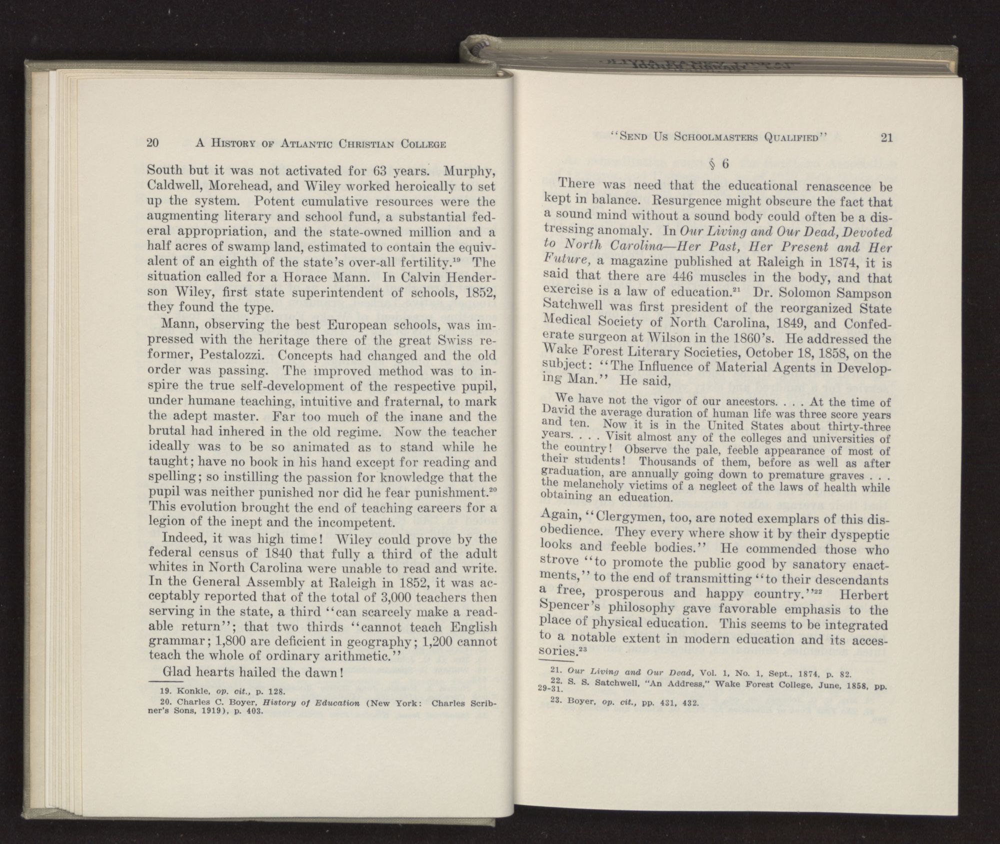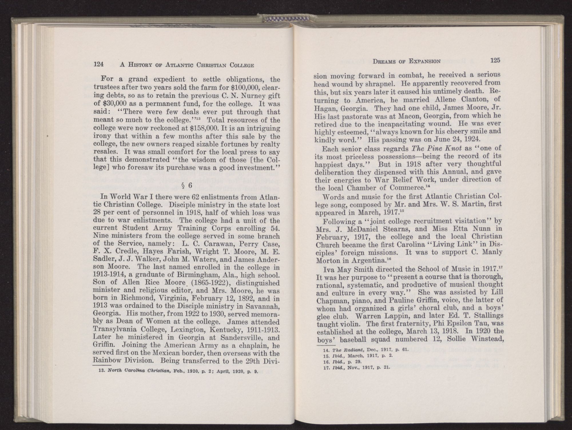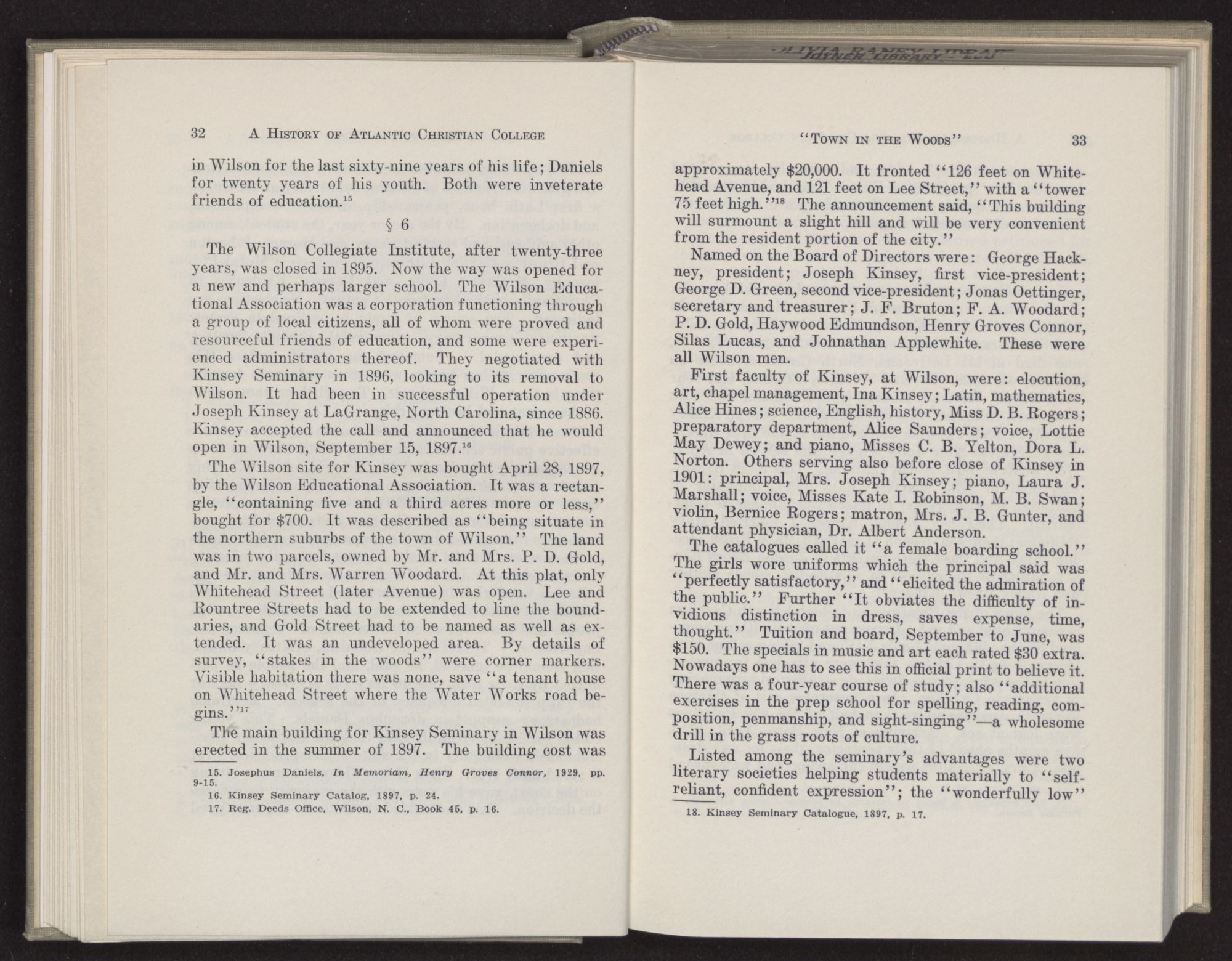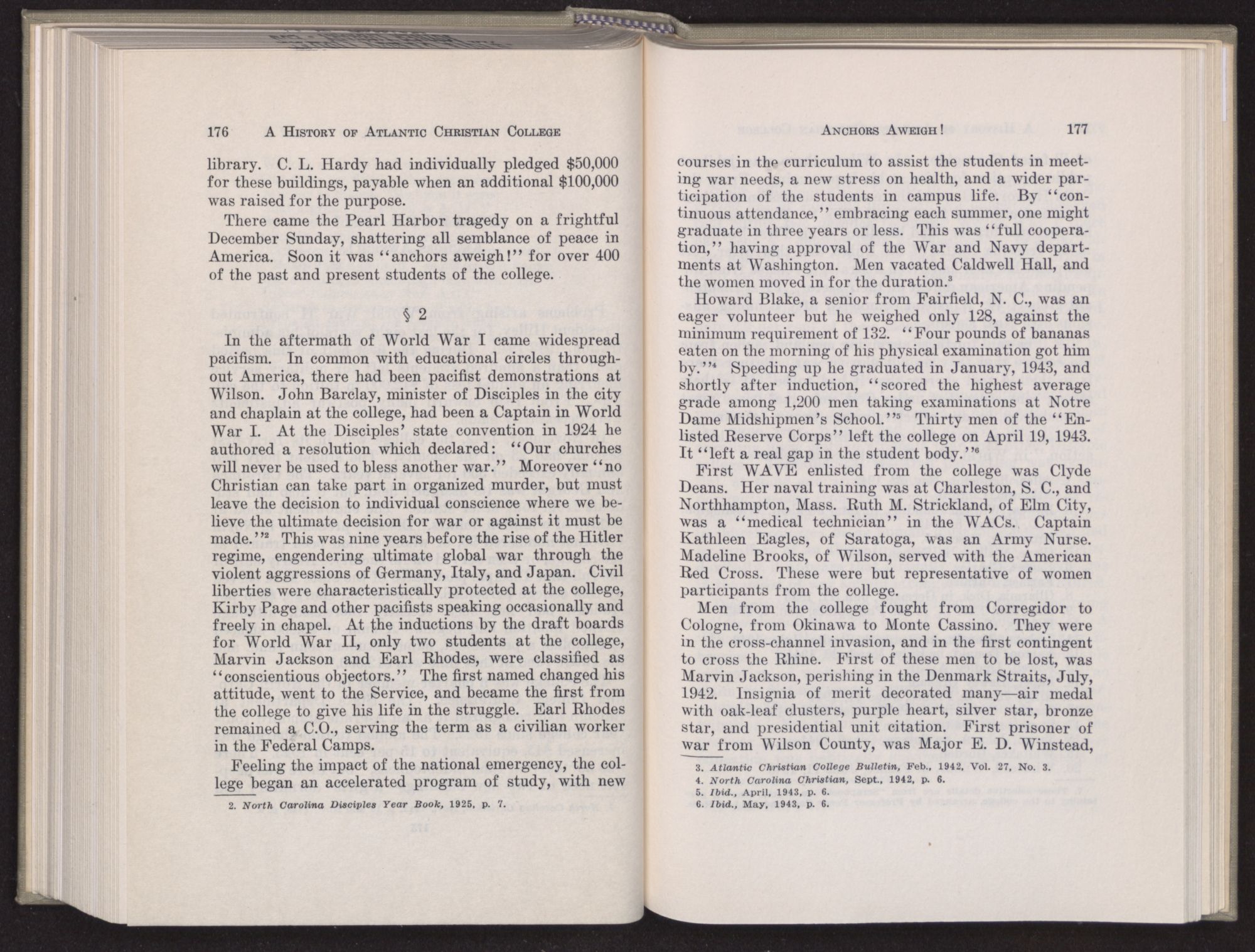 President White advised me on February 15, 1955, that he and the administration at Atlantic Christian College wanted me to write a factual history of the institution—to give an authentic story of its background and its fifty-four years of activity. Perhaps the lot fell to me because of my forty-five years of close touch with the college and my lifelong interest in Disciple lore. Collating necessary sources, I proceeded with the manuscript and completed it within a year. Assisting me was an advisory history committee composed of currently employed college personnel, including: Perry Case, C. H. Hamlin, Sarah Bain Ward, and Mrs. Mary Wilson. Each had long been a part of the school. President White, Dean Moudy, and this committee were most helpful, for which I am deeply thankful. Nevertheless, the shortcomings of this narrative, howsoever many, are chargeable solely to me. I have no alibi.