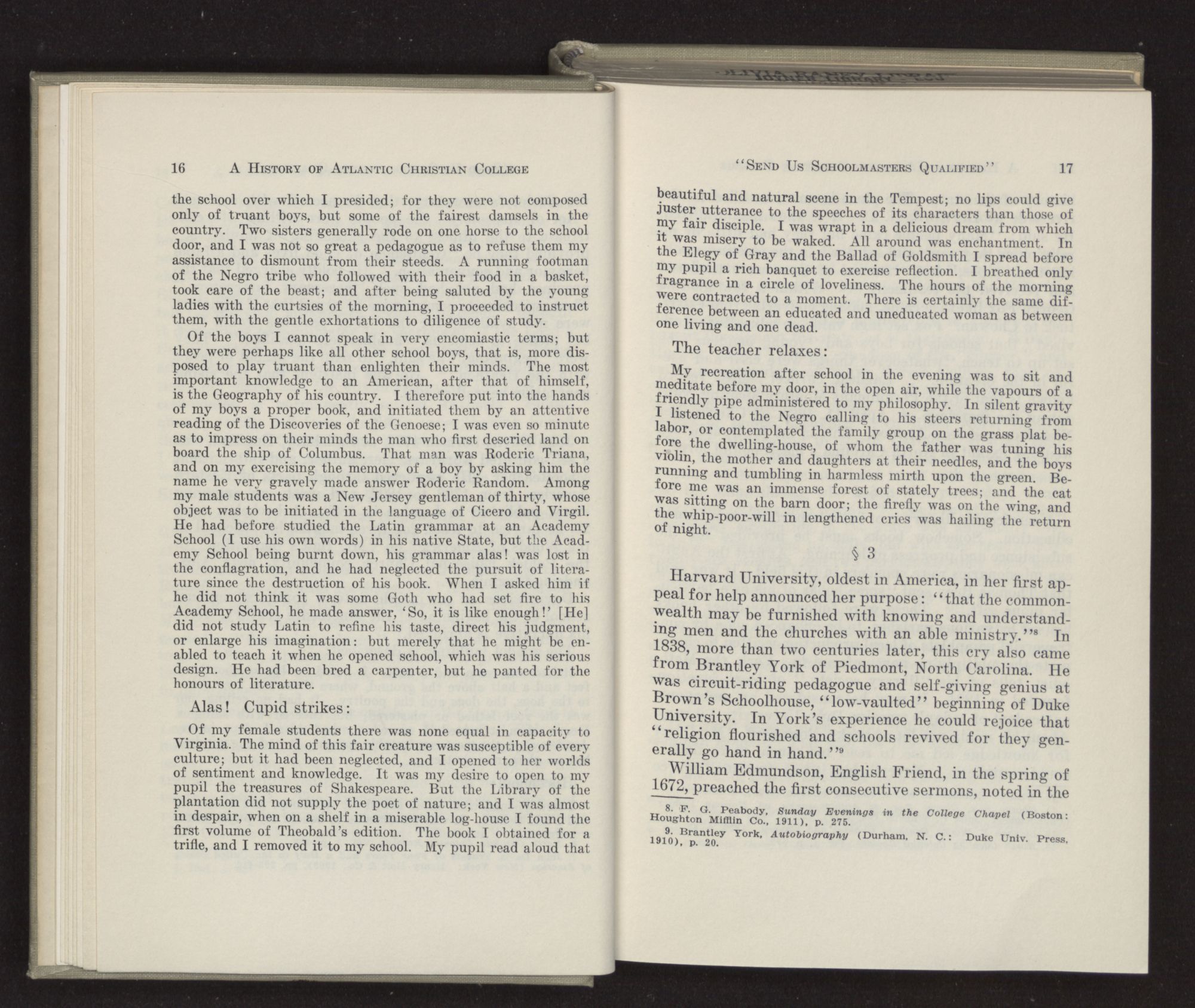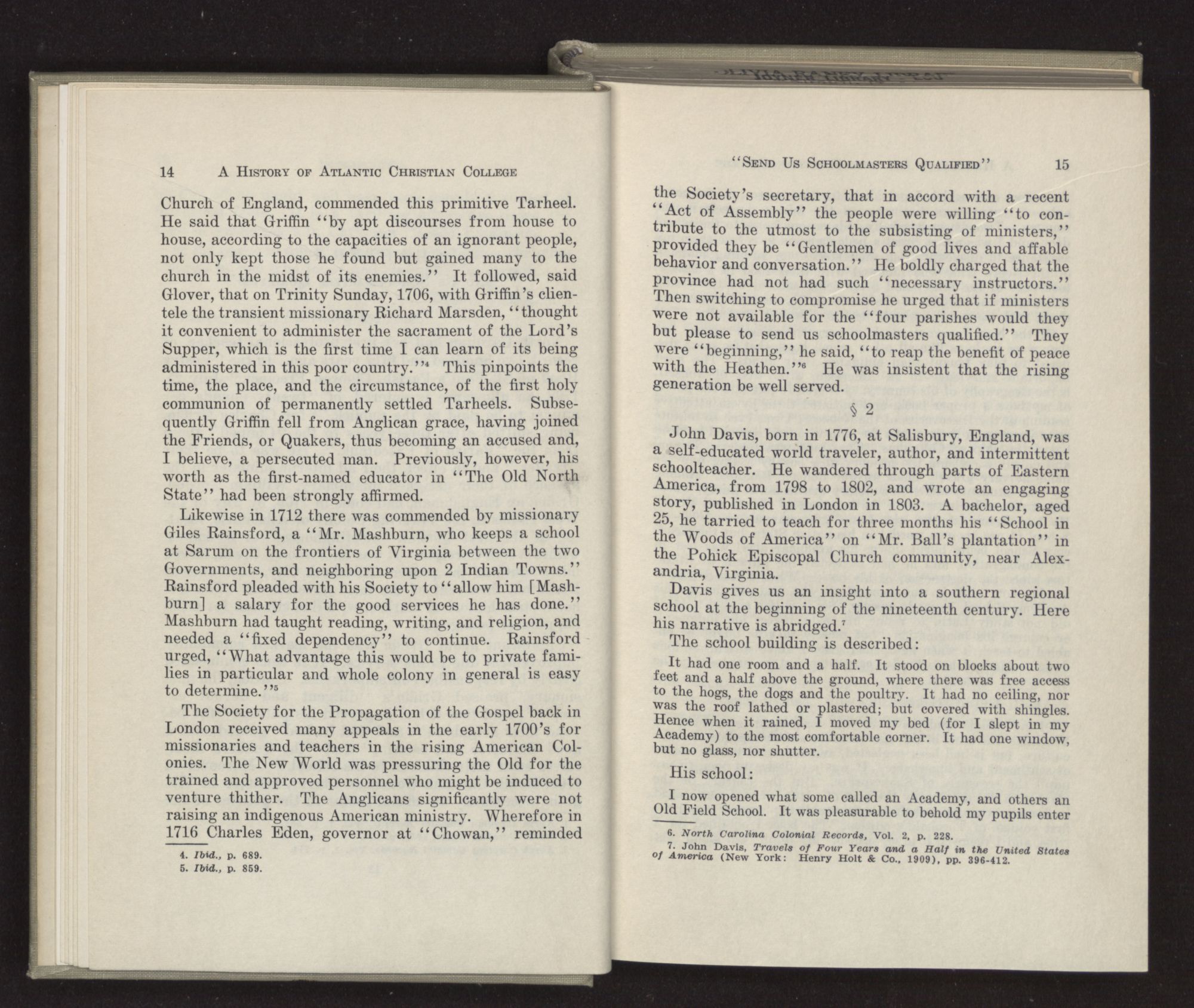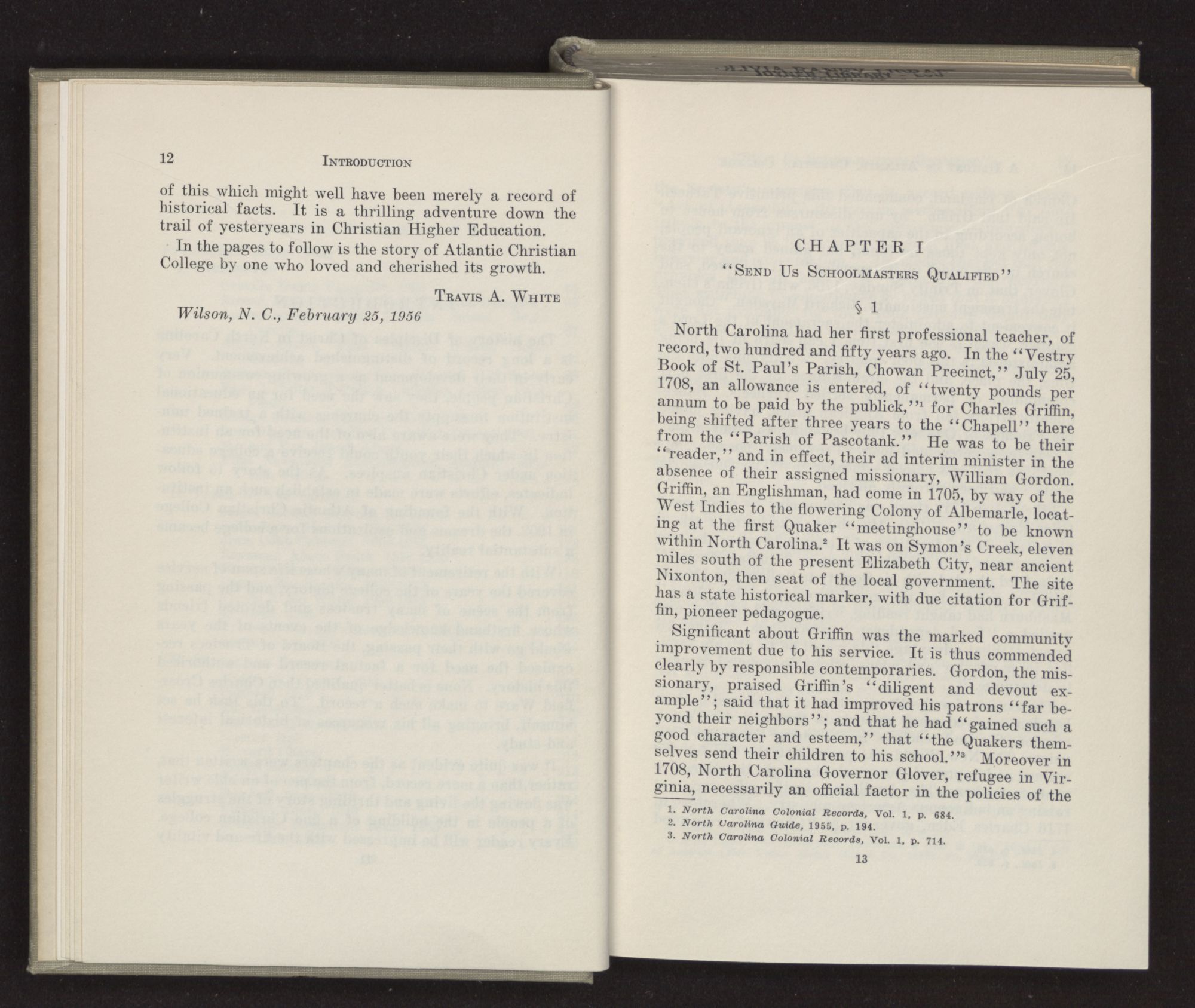 North Carolina had her first professional teacher, of record, two hundred and fifty years ago. In the “Vestry Book of St. Paul's Parish, Chowan Precinct,” July 25, 1708, an allowance is entered, of “twenty pounds per annum to be paid by the publick,”1 for Charles Griffin, being shifted after three years to the “Chapell” there from the “Parish of Pascotank.” He was to be their “reader,” and in effect, their ad interim minister in the absence of their assigned missionary, William Gordon. Griffin, an Englishman, had come in 1705, by way of the West Indies to the flowering Colony of Albemarle, locating at the first Quaker “meetinghouse” to be known within North Carolina.2 It was on Symon's Creek, eleven miles south of the present Elizabeth City, near ancient Nixonton, then seat of the local government. The site has a state historical marker, with due citation for Griffin, pioneer pedagogue.