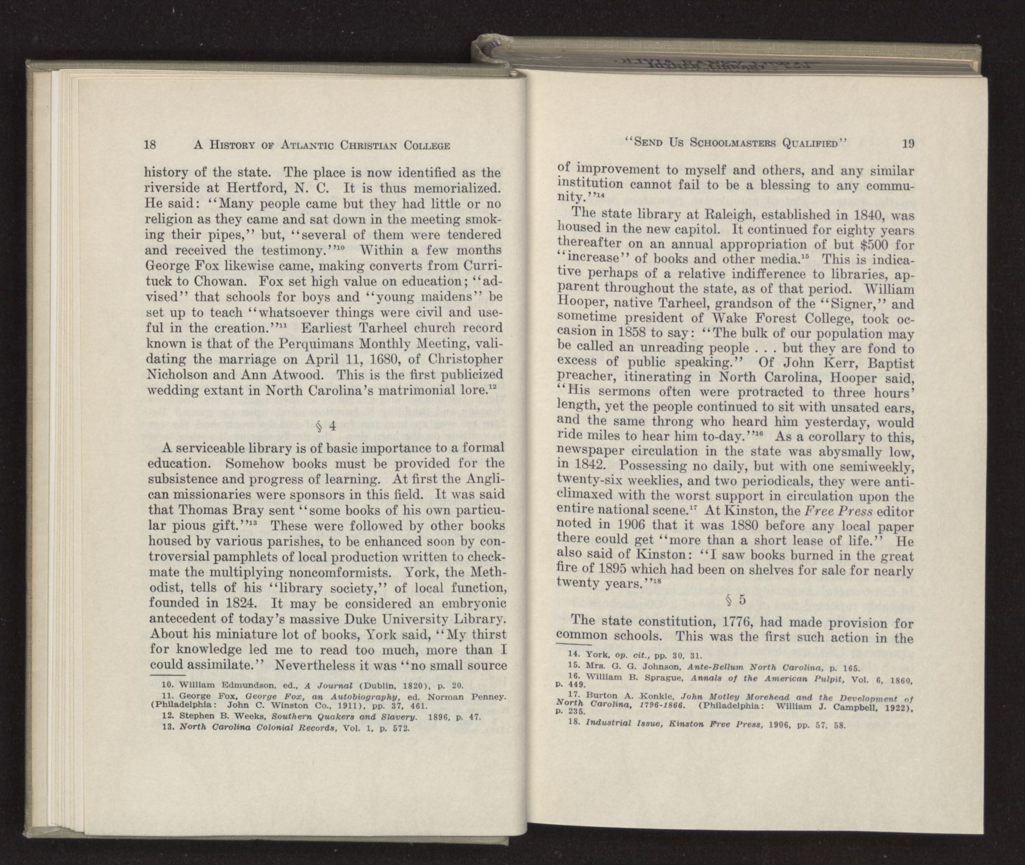 1.North Carolina Colonial Records, Vol. 1, p. 684.2.North Carolina Guide, 1955, p. 194.3.North Carolina Colonial Records, Vol. 1, p. 714.Church of England, commended this primitive Tarheel. He said that Griffin “by apt discourses from house to house, according to the capacities of an ignorant people, not only kept those he found but gained many to the church in the midst of its enemies.” It followed, said Glover, that on Trinity Sunday, 1706, with Griffin's clientele the transient missionary Richard Marsden, “thought it convenient to administer the sacrament of the Lord's Supper, which is the first time I can learn of its being administered in this poor country.”4 This pinpoints the time, the place, and the circumstance, of the first holy communion of permanently settled Tarheels. Subsequently Griffin fell from Anglican grace, having joined the Friends, or Quakers, thus becoming an accused and, I believe, a persecuted man. Previously, however, his worth as the first-named educator in “The Old North State” had been strongly affirmed.