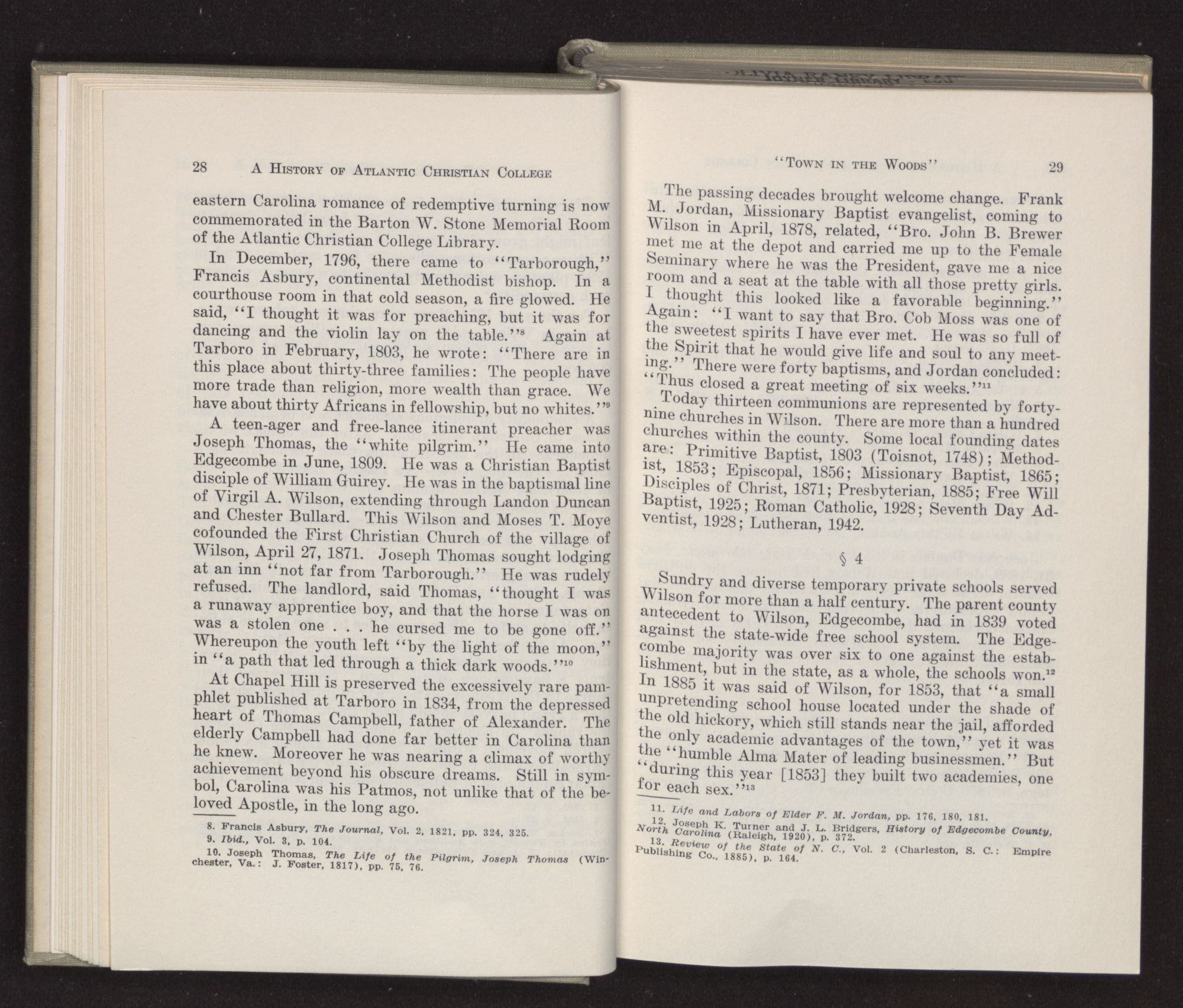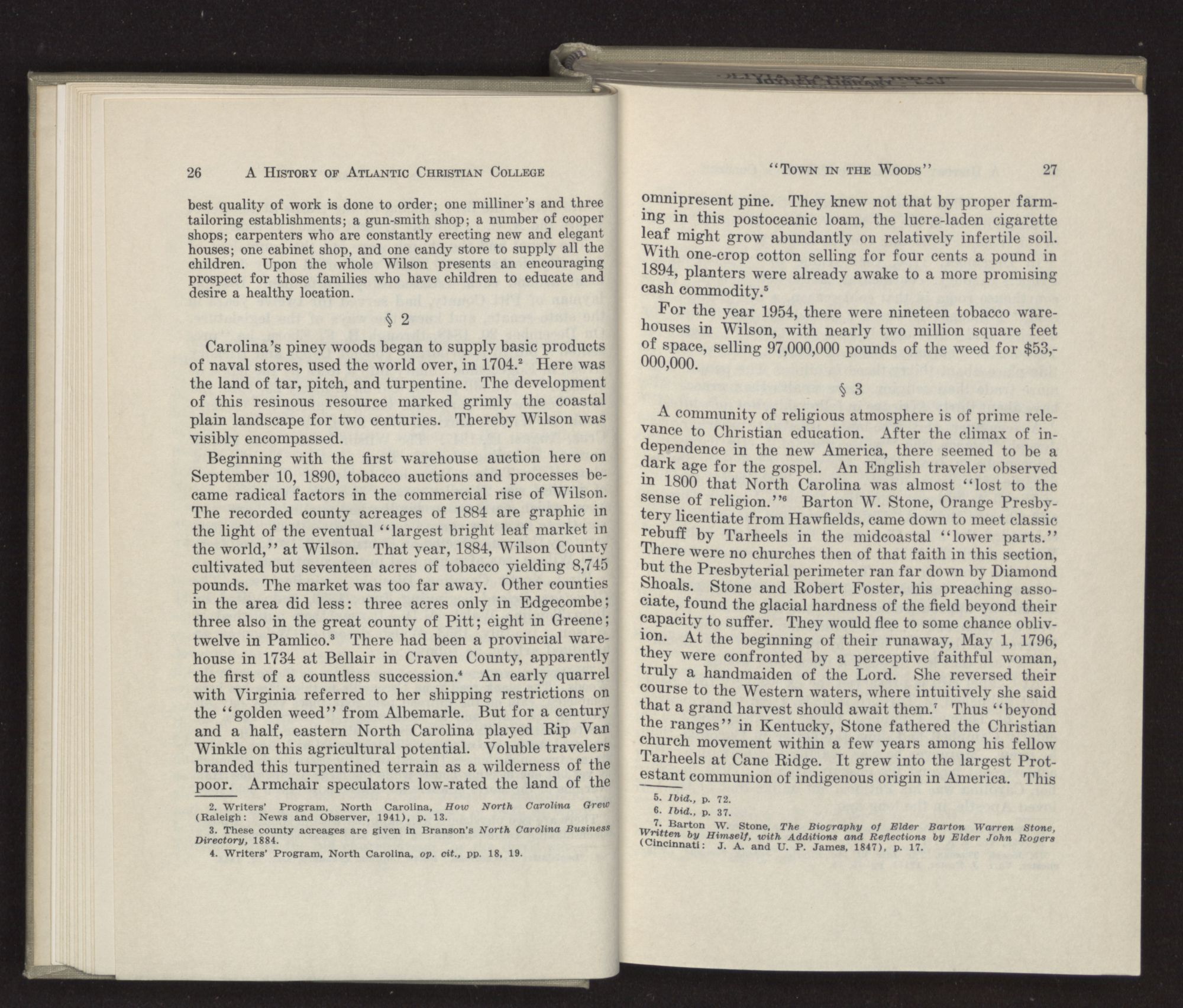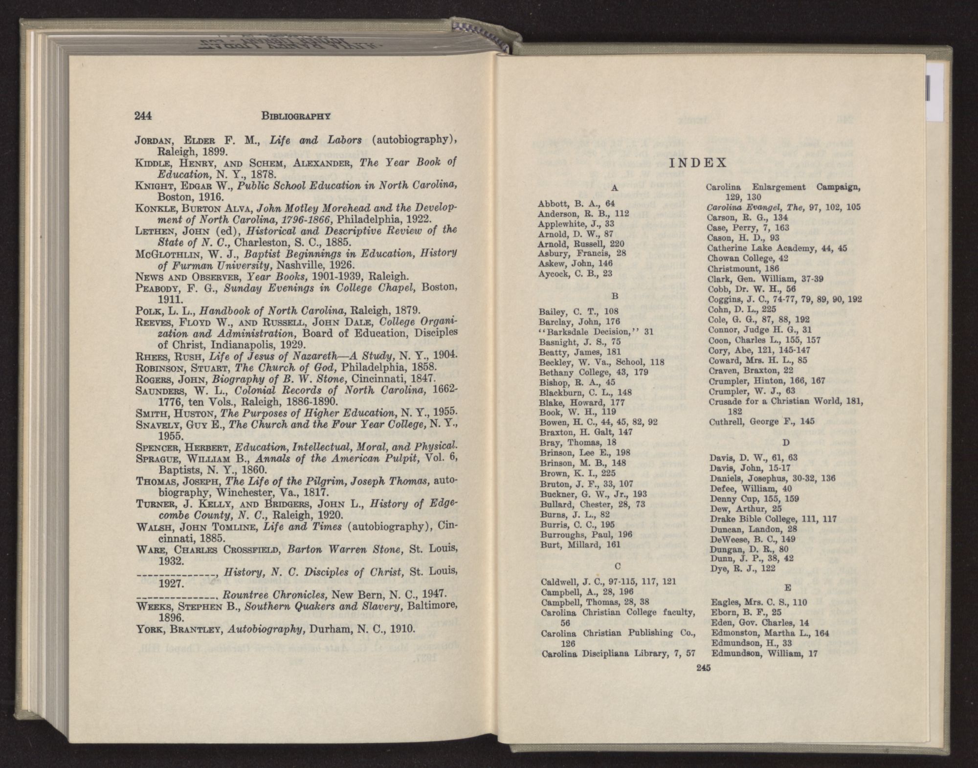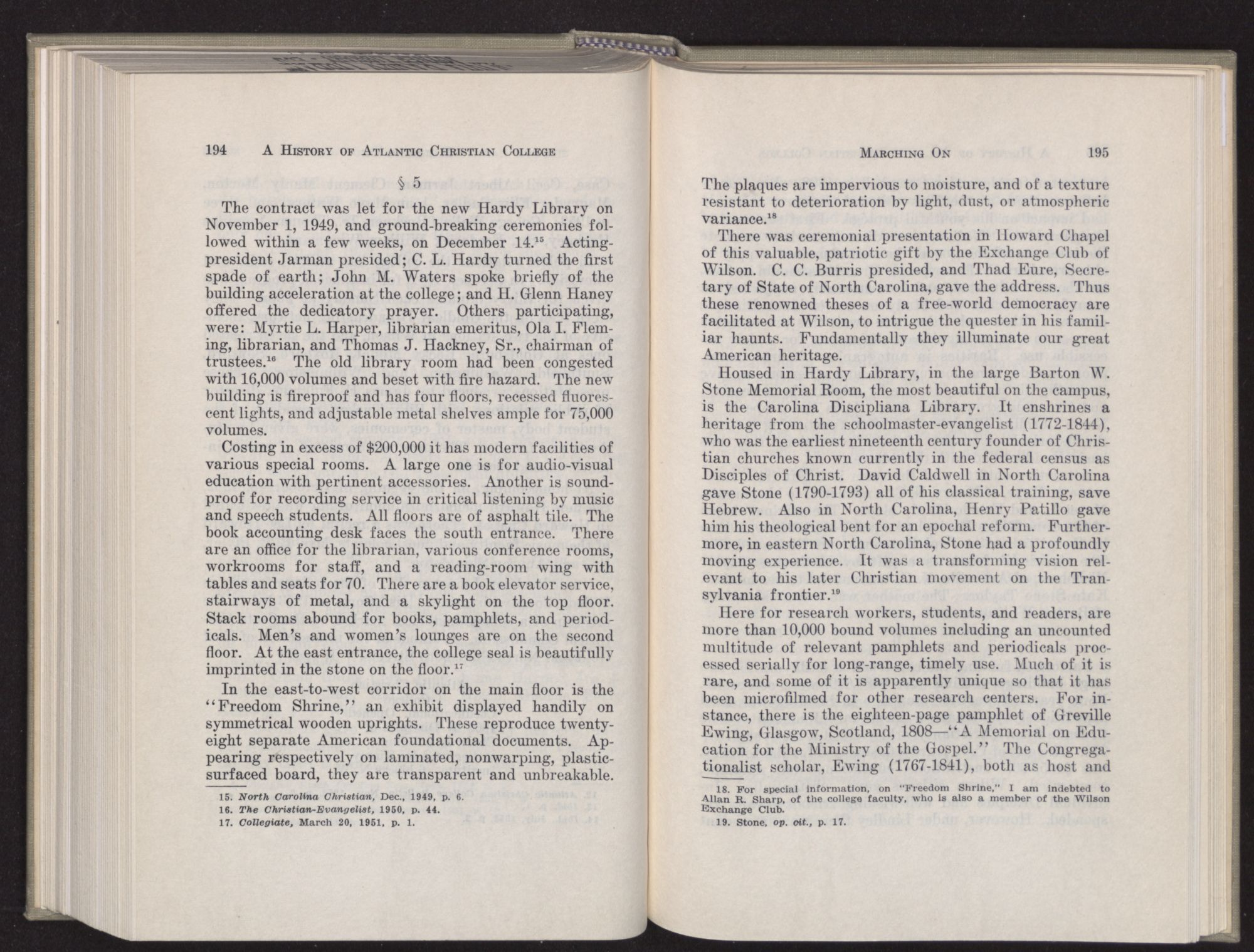 The circumstances of my writing were congenial. Incidentally, for forty years I had been gathering the Carolina Discipliana Library now housed in the Barton W. Stone Memorial Room at the college. Here, ready to hand, pertinent to this book, are source materials, precious and partly unique. Without these bound volumes of fugitive documents, mentioned casually in the book's footnotes, there would have been serious handicap. In the building of this archival collection, many generous hands have had an honorable part. I am grateful to all. Likewise, I am indebted in no small way to the various sources, printed and otherwise, acknowledged in the references. Verily it has been a cooperative labor of love.