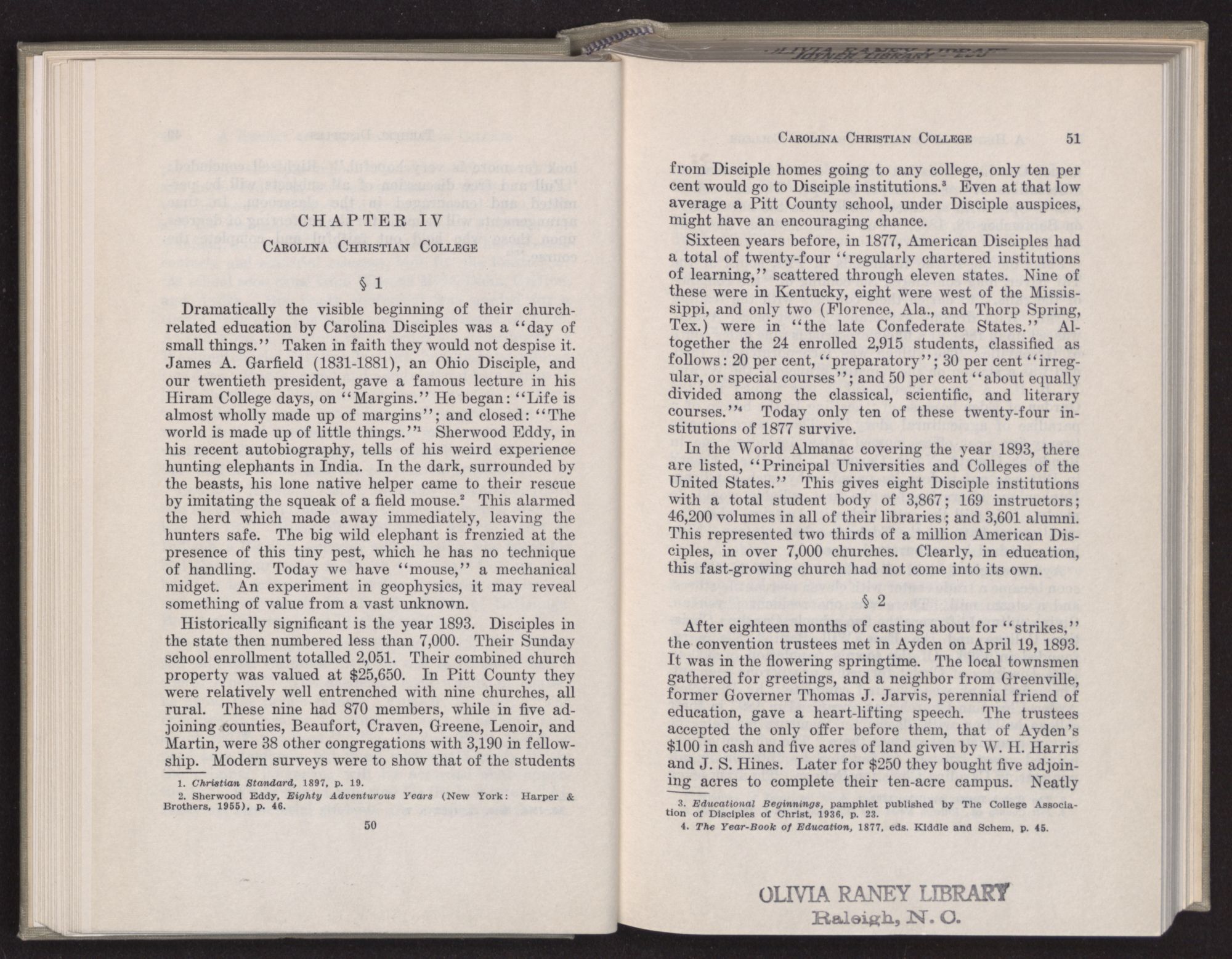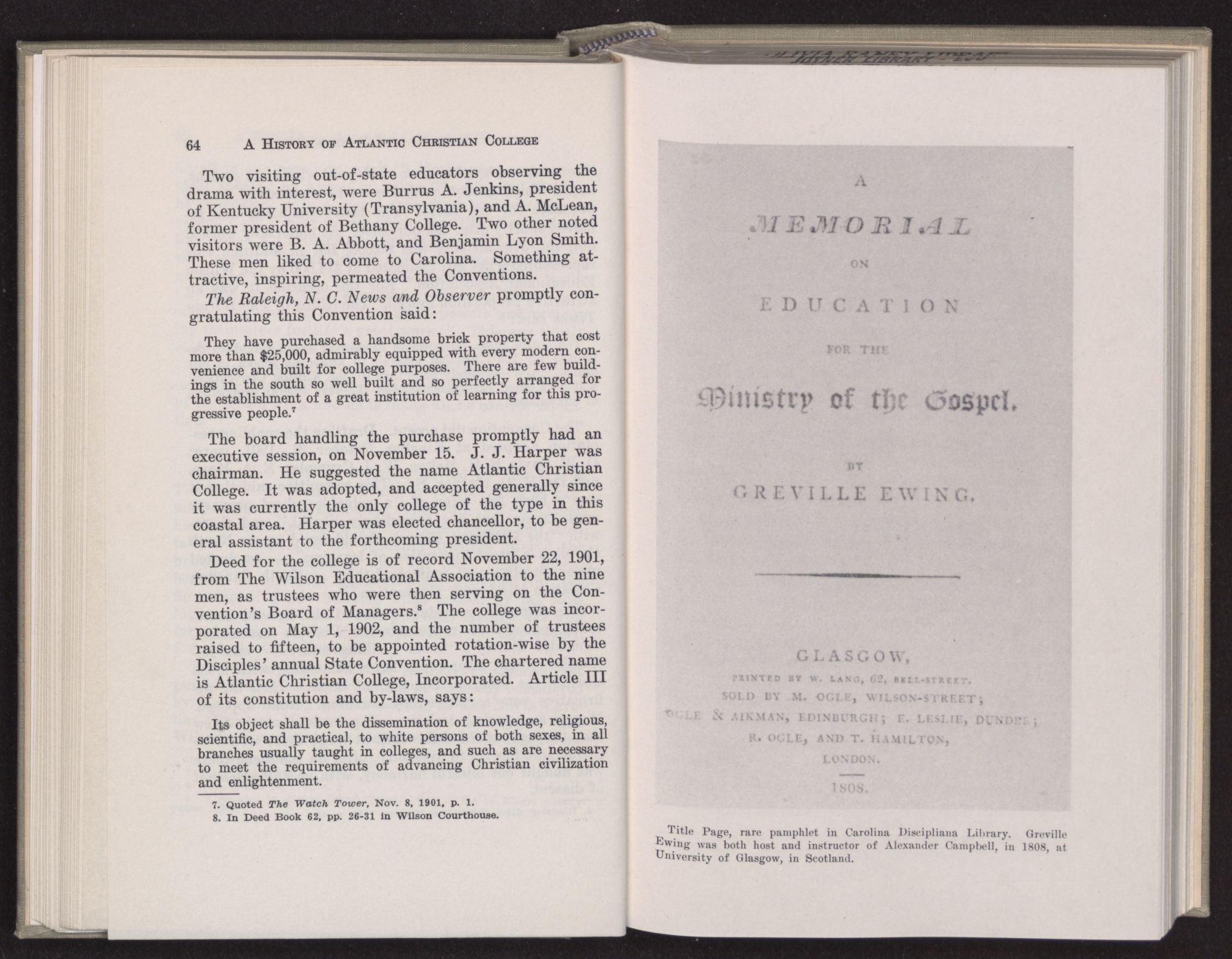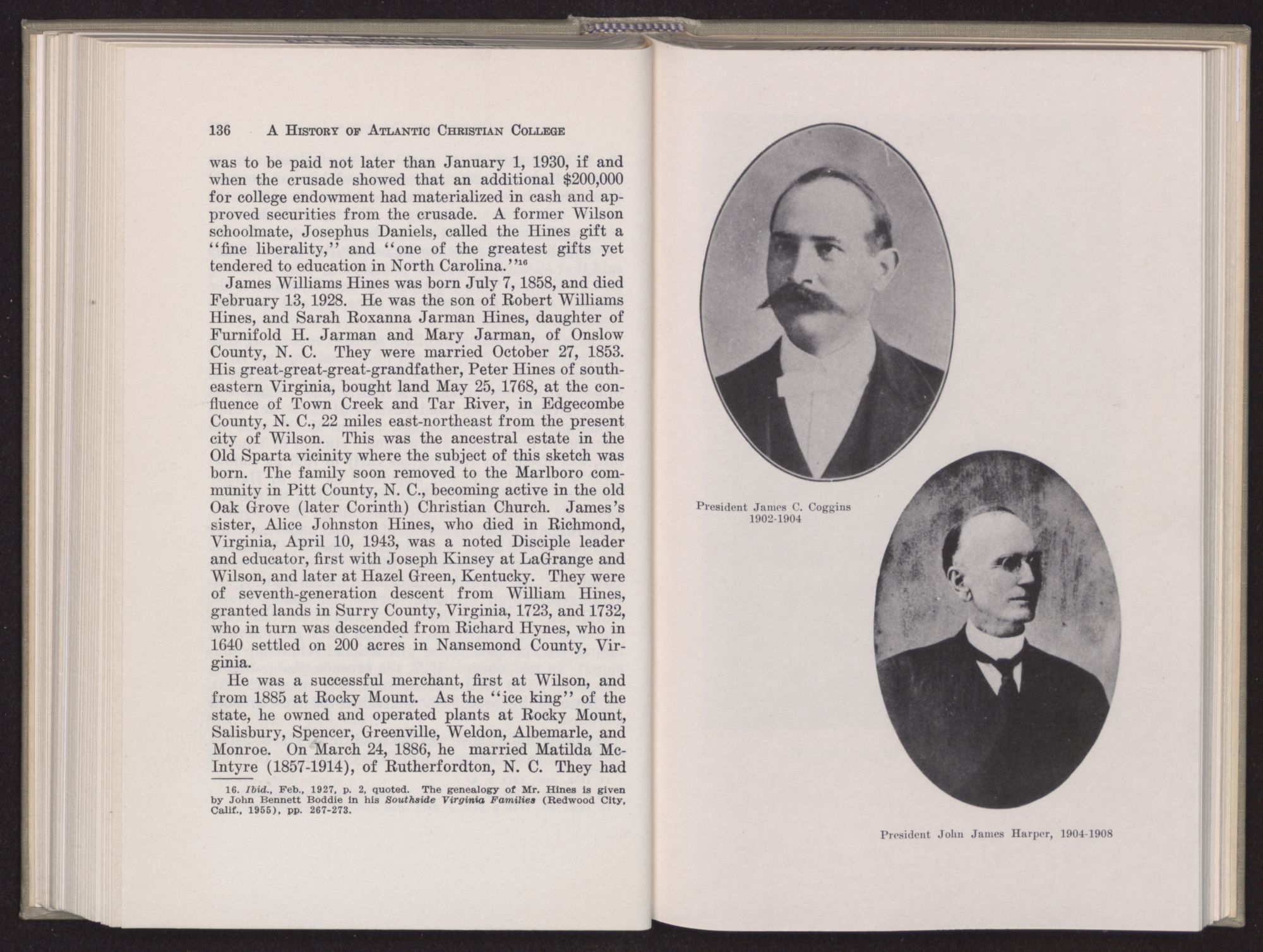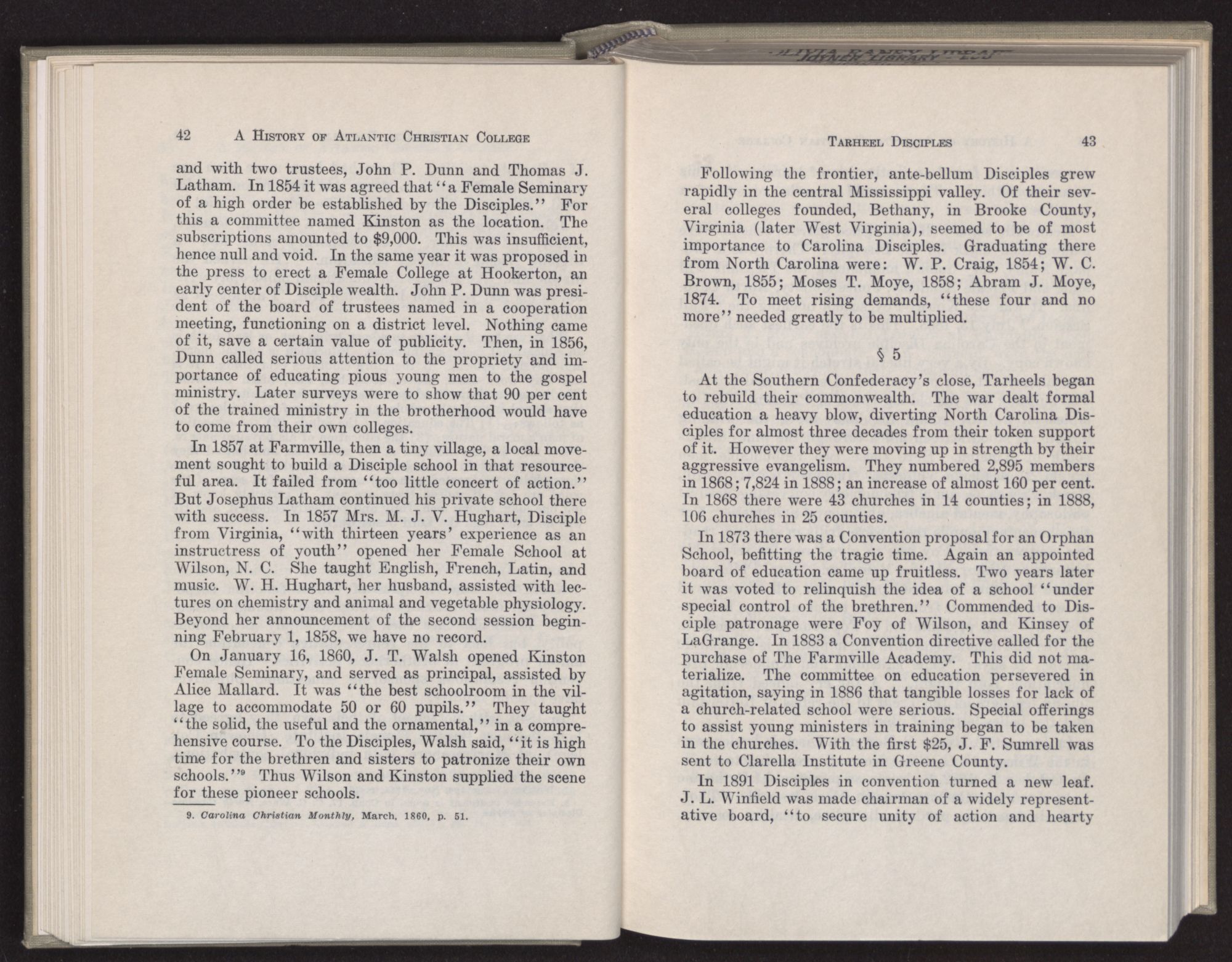 The history of Disciples of Christ in North Carolina is a long record of distinguished achievement. Very early in their development as a growing communion of Christian people, they saw the need for an educational institution to supply the churches with a trained ministry. They were aware also of the need for an institution in which their youth could receive a college education under Christian auspices. As the story to follow indicates, efforts were made to establish such an institution. With the founding of Atlantic Christian College in 1902, the dreams and aspirations for a college became a substantial reality.