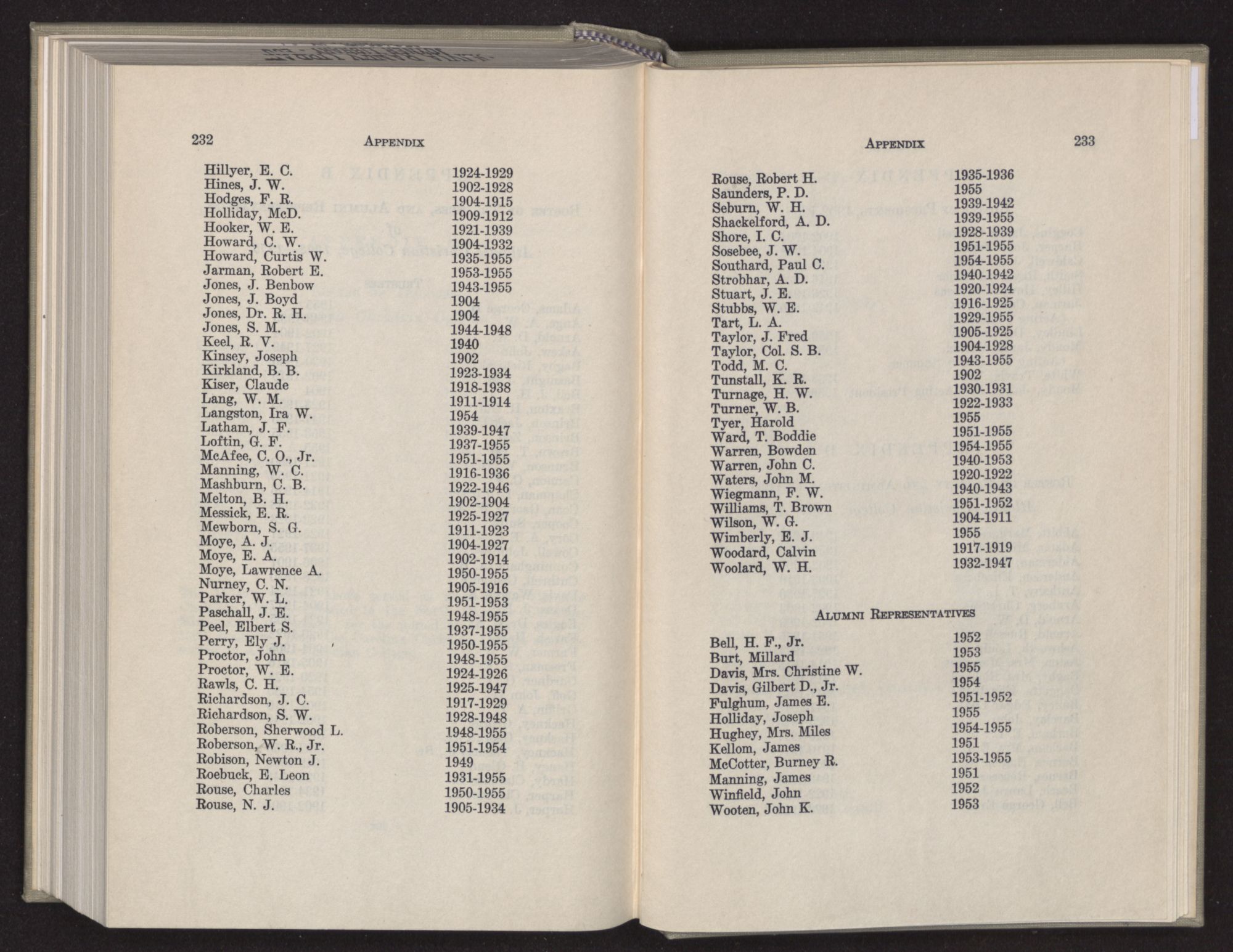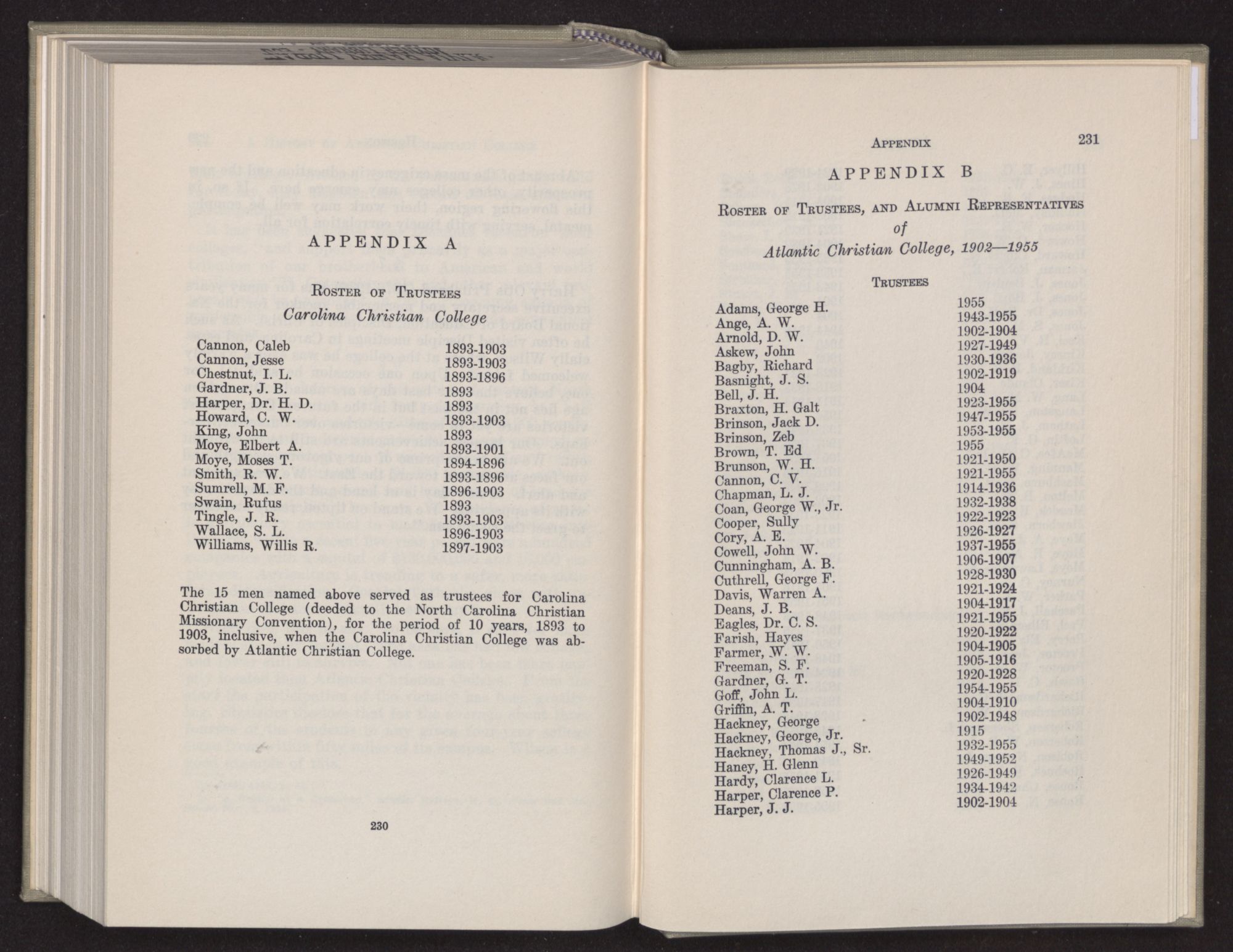| APPENDIX B. Roster of Trustees, and Alumni Representatives, Atlantic Christian College | 231 |