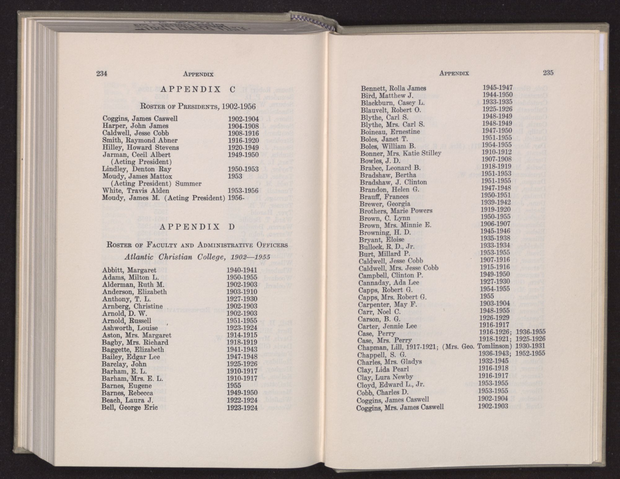 | APPENDIX C. Roster of Presidents, Atlantic Christian College | 234 |