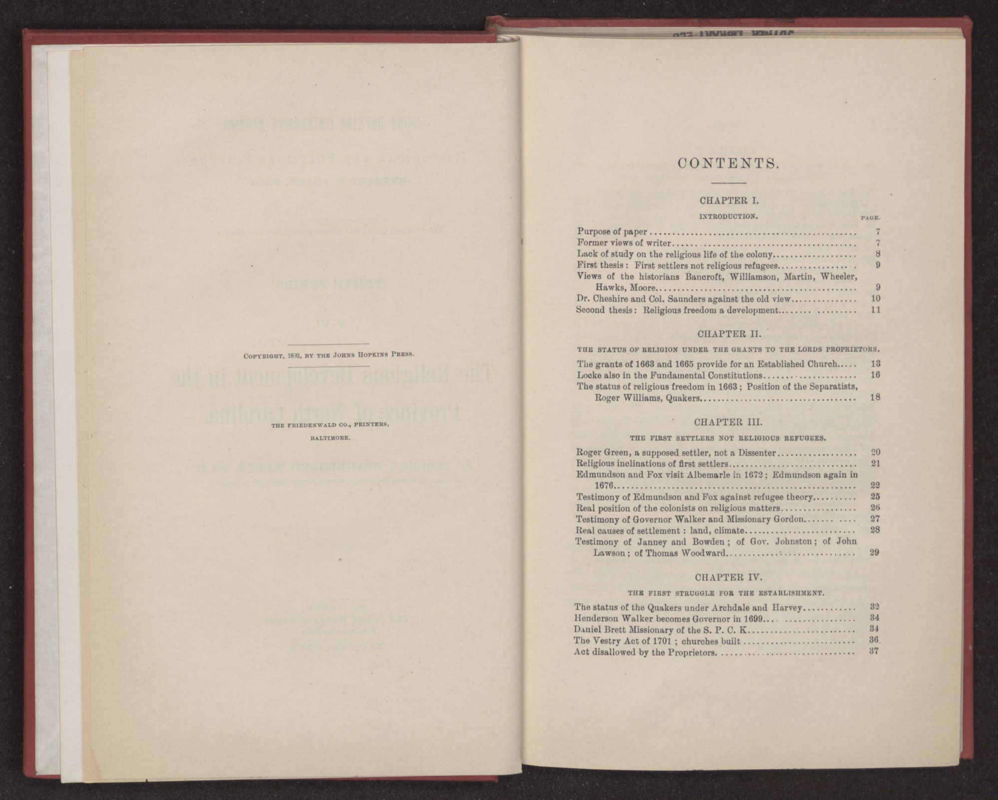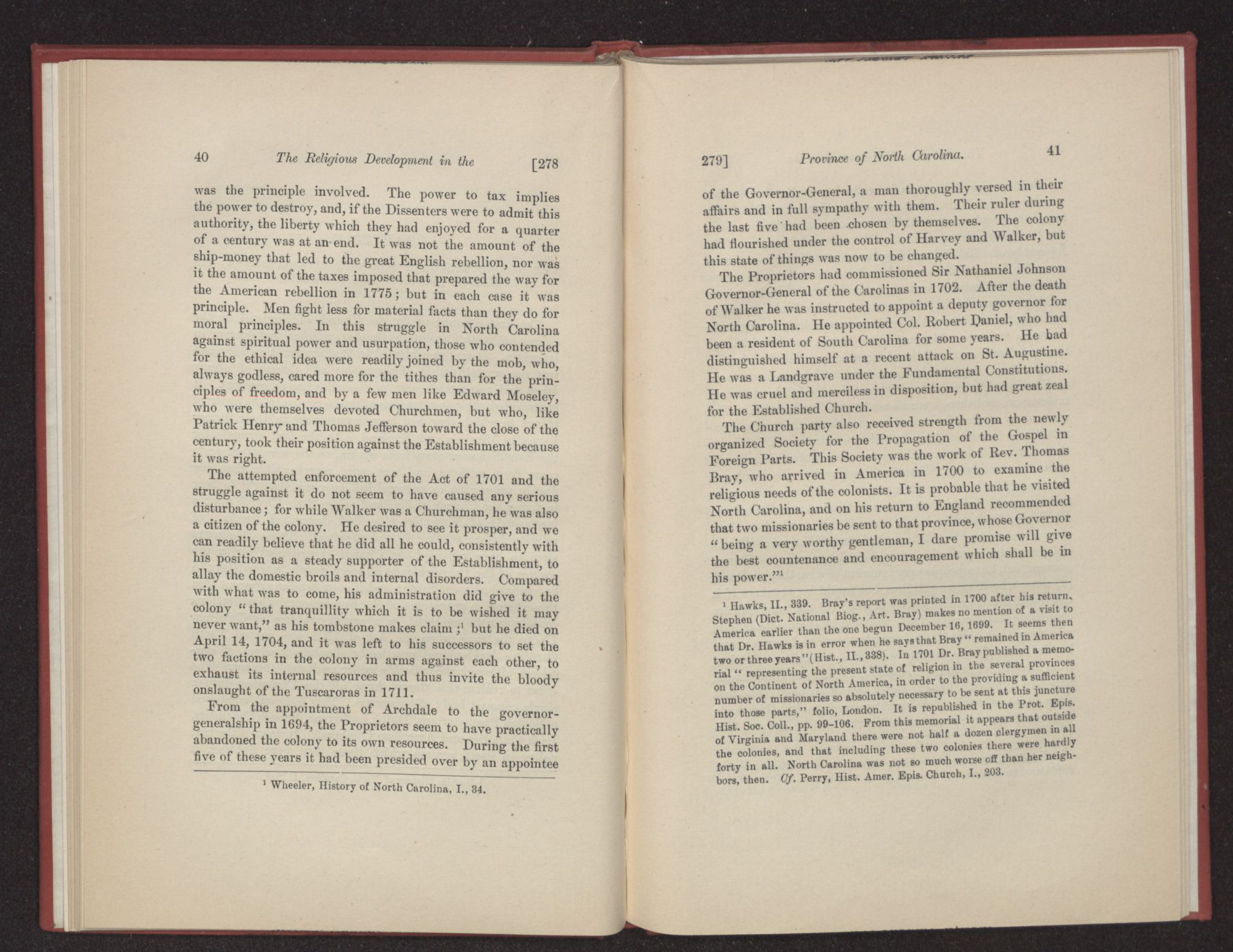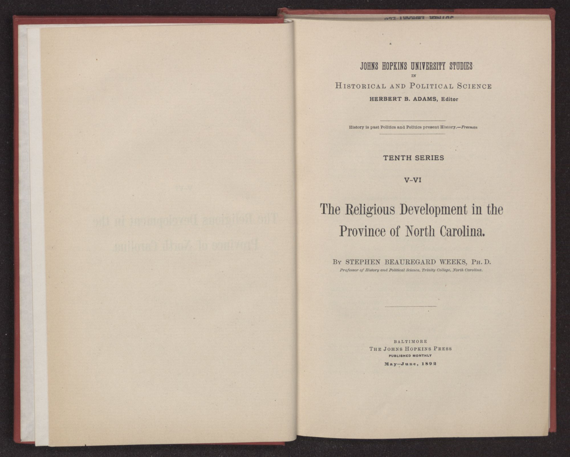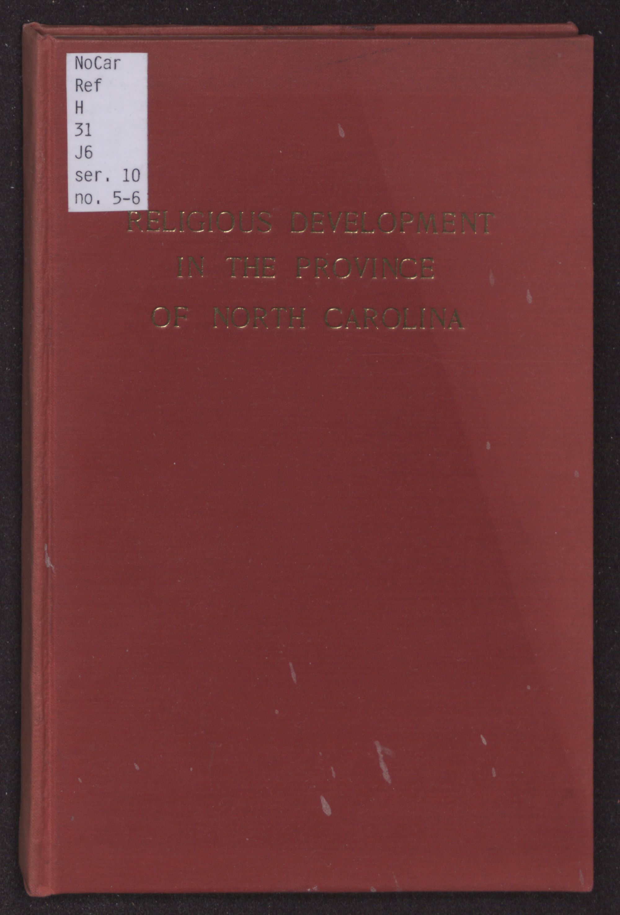 JOHNS HOPKINS UNIVERSITY STUDIES IN HISTORICAL AND POLITICAL SCIENCE HERBERT B. ADAMS, Editor History is past Politics and Politics present History.—Freeman TENTH SERIES V-VIThe Religious Development in the Province of North Carolina.BY STEPHEN BEAUREGARD WEEKS, PH.D. Professor of History and Political Science, Trinity College, North Carolina.BALTIMORETHE JOHNS HOPKINS PRESS PUBLISHED MONTHLYMay-June, 1892