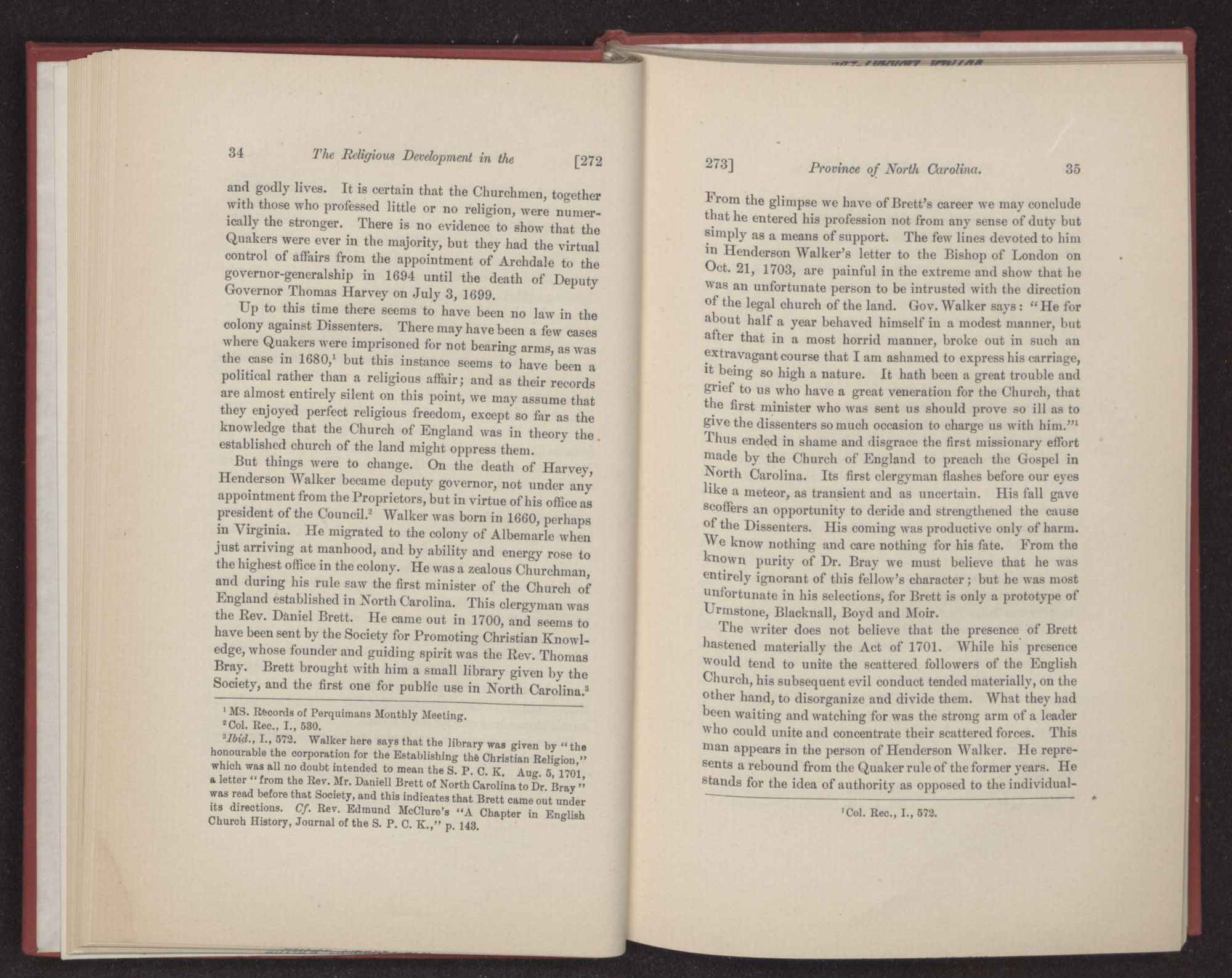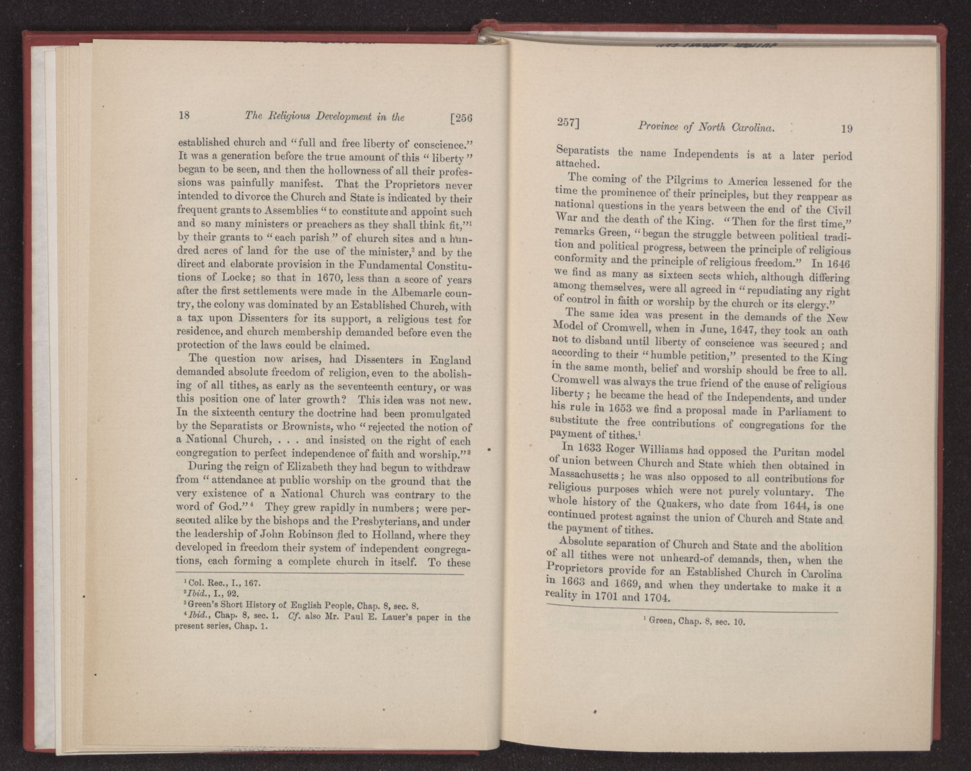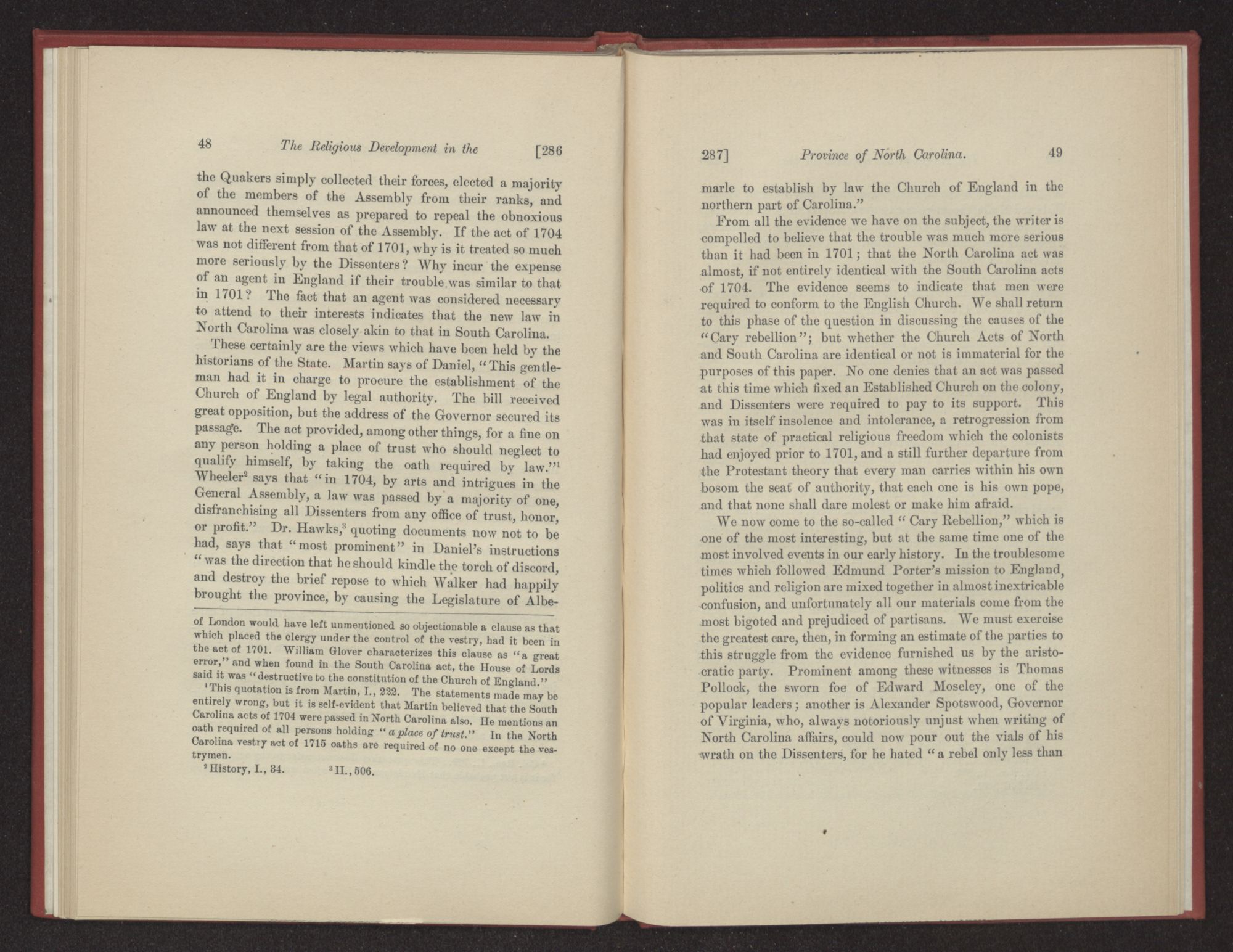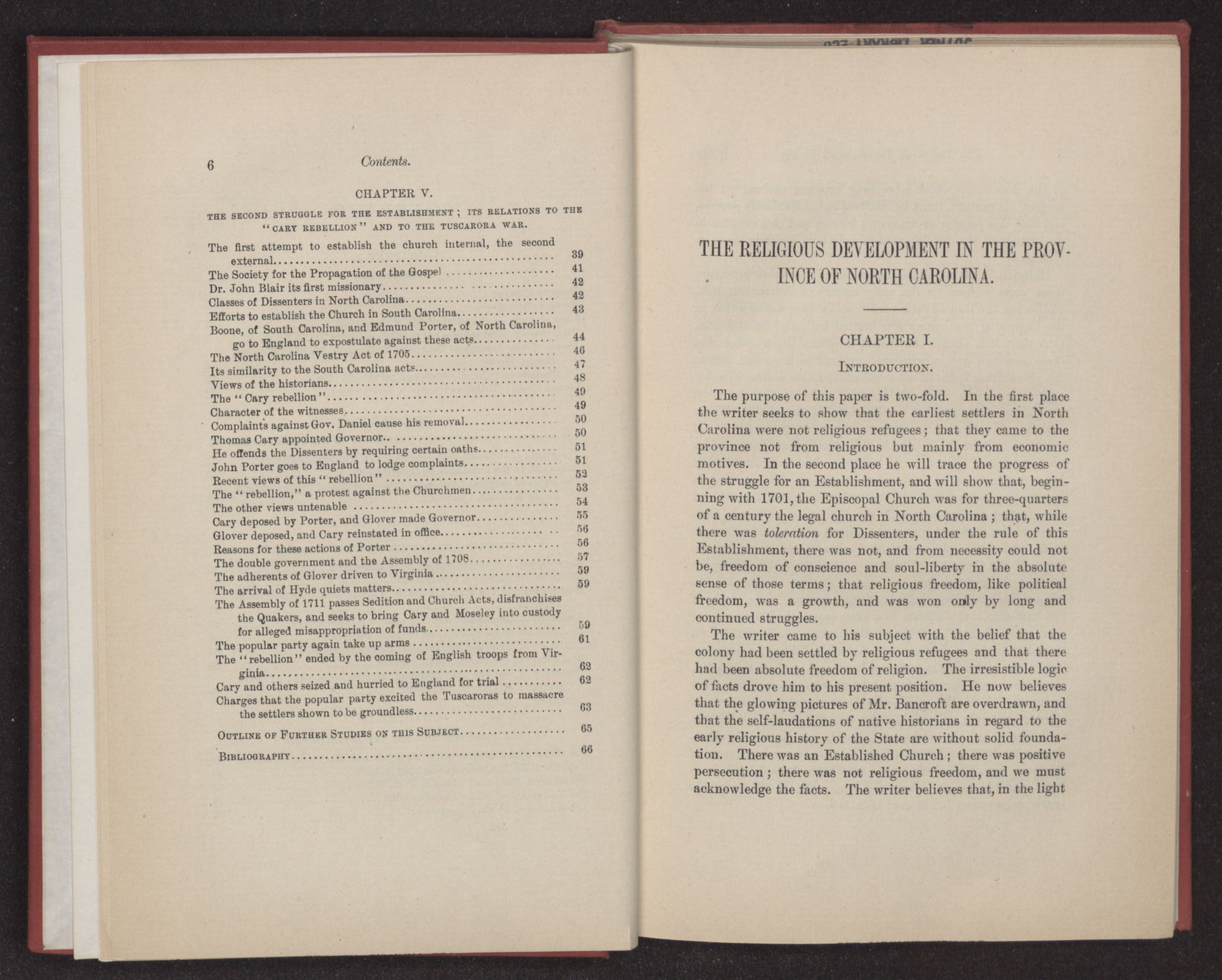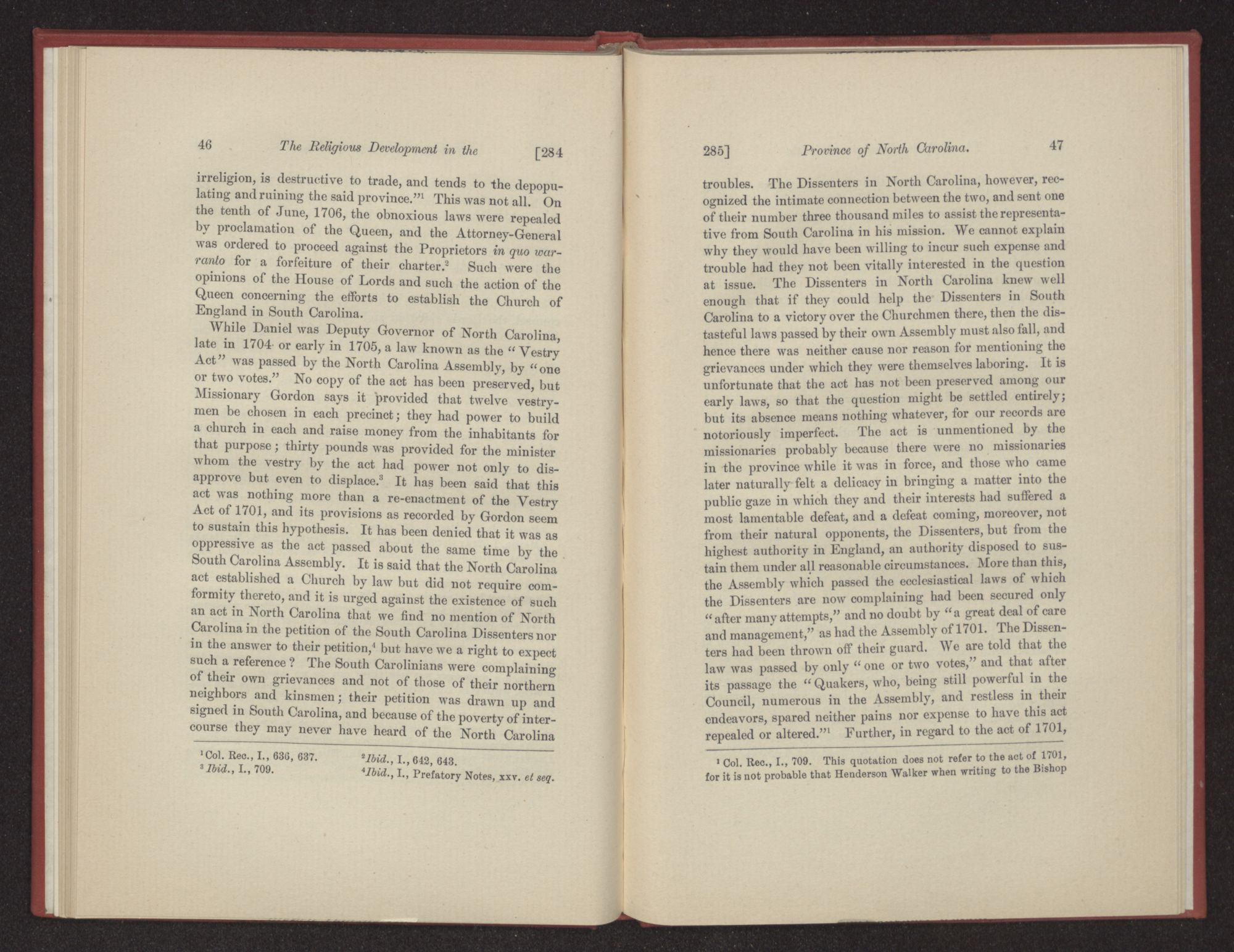 The purpose of this paper is two-fold. In the first place the writer seeks to show that the earliest settlers in North Carolina were not religious refugees; that they came to the province not from religious but mainly from economic motives. In the second place he will trace the progress of the struggle for an Establishment, and will show that, beginning with 1701, the Episcopal Church was for three-quarters of a century the legal church in North Carolina; that, while there was toleration for Dissenters, under the rule of this Establishment, there was not, and from necessity could not be, freedom of conscience and soul-liberty in the absolute sense of those terms; that religious freedom, like political freedom, was a growth, and was won only by long and continued struggles.