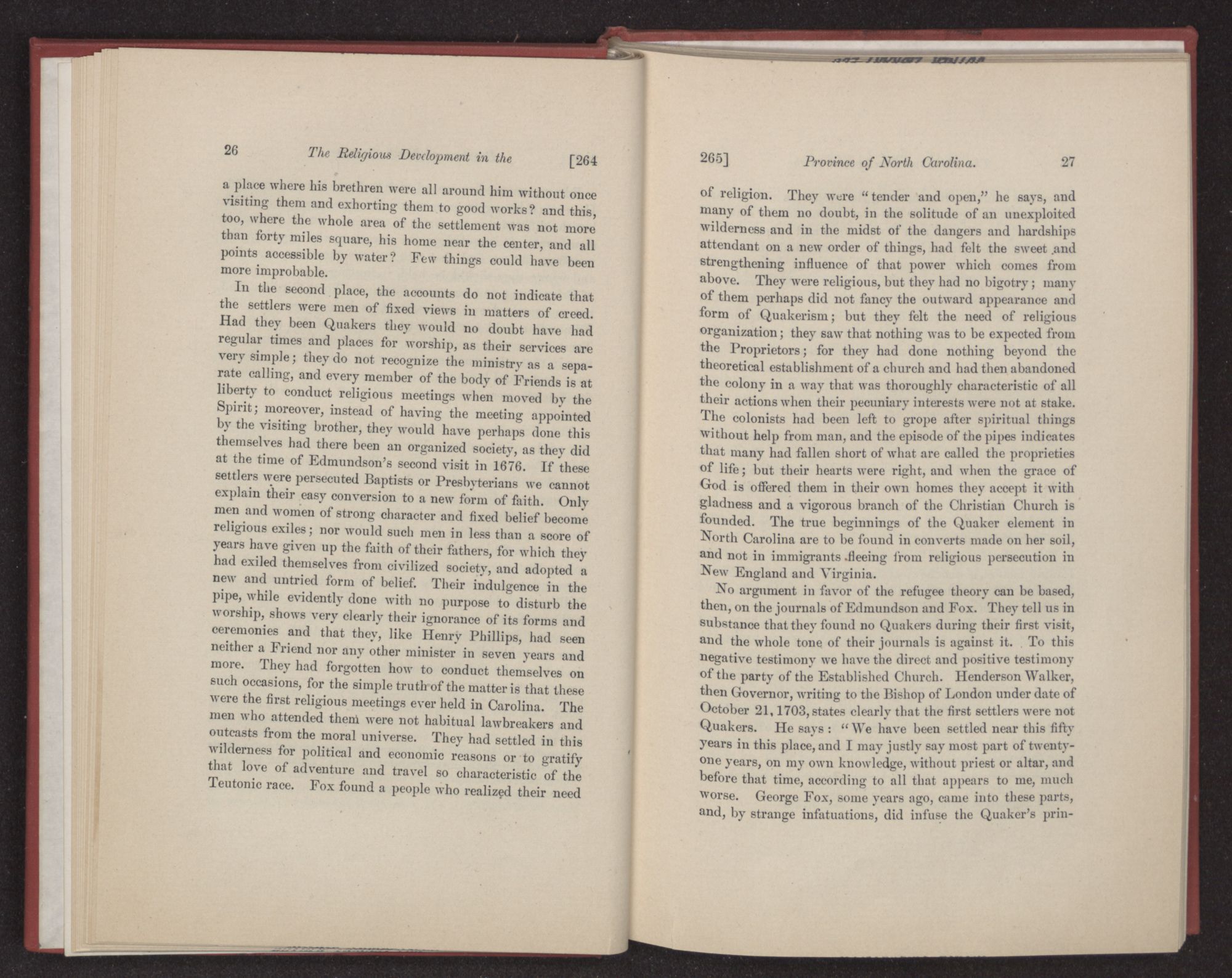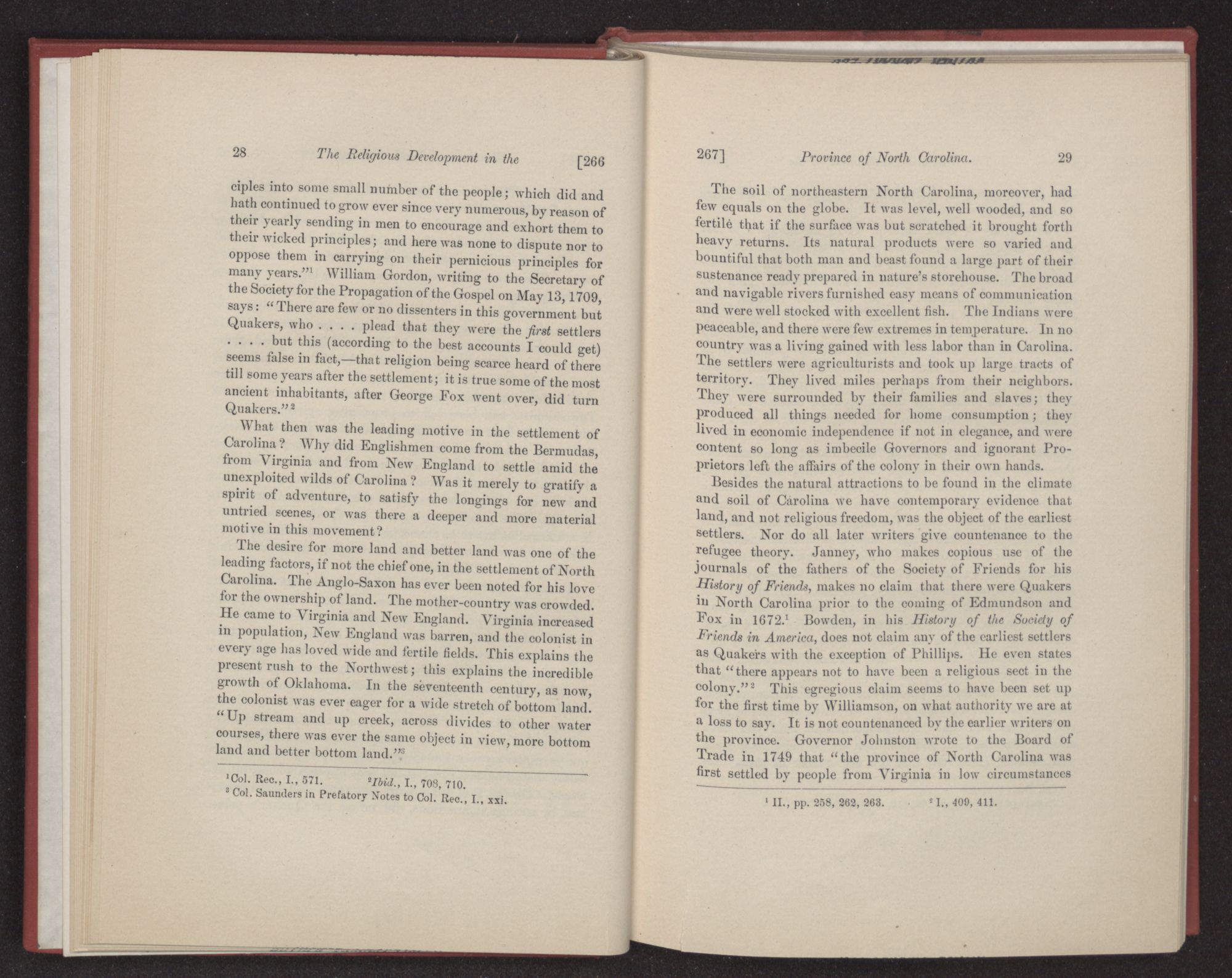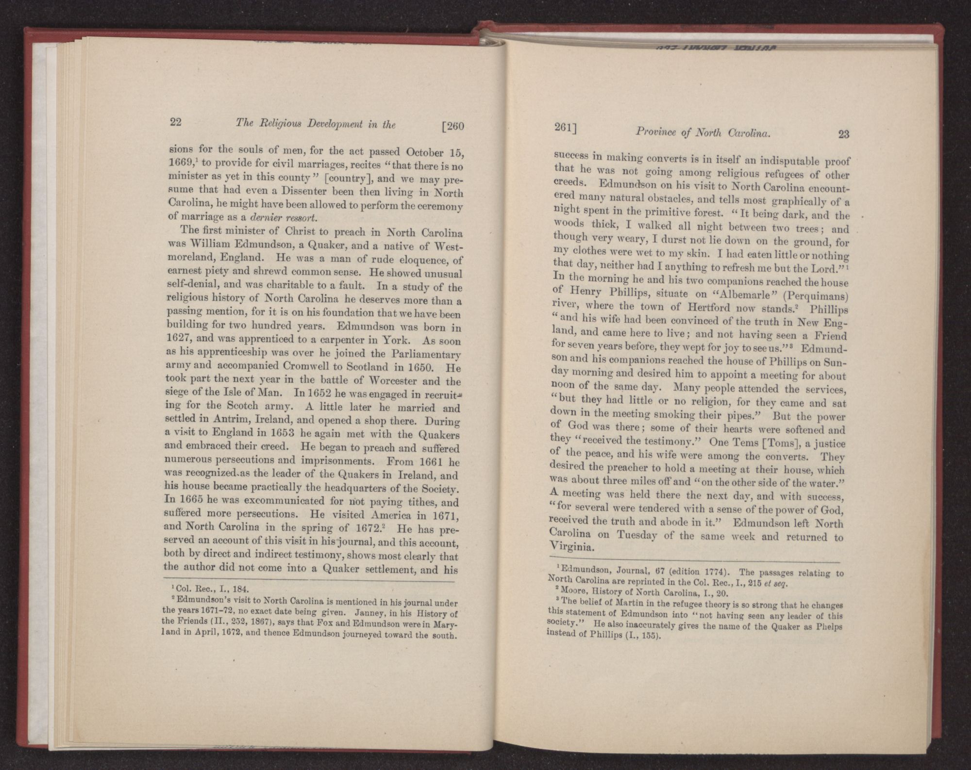 1 History of U. S., Vol. II., 136, original edition. In his later editions Mr. Bancroft has modified his statements to a considerable extent.2 History of North Carolina, I., 92, note. This is the earliest statement of the claim which I have seen. After quoting extracts from the Virginia laws of 1662 against the Quakers (pp. 81-83), Williamson reasons out their flight to North Carolina after the following fashion: “Many of the most industrious subjects were constrained to leave the colony. They fled to the wilderness, at the distance of eighty or ninety miles from the operation of those laws. Hence it followed, that the first settlers near Pasquetank and Perquimans were chiefly emigrants from Virginia and dissenters from the Established Church of England; many of them were Quakers.” He never deigns to give authorities. Chalmers, with all the blunders of the Political Annals, does not give countenance to this. He says the Albemarle colony “being equally destitute of religion and clergy” was “not disturbed like the early colonists of the North with religious controversy.” Again, he writes: “Perfect freedom in religion was offered to the people who seem hitherto to have been but little attached to any.” Of the law of 1669, providing for civil marriages, he says: “From this remarkable law we may judge of the then state of religion and of morals.” It seems clear that this error got its start from Williamson.him in point of time and says, with reference to the year 1660, “The legislature of Virginia having passed laws unfavorable to the Quakers, a number of whom had fled thither from the persecuting spirit of New England, many families sought an asylum on Albemarle Sound.”1 John H. Wheeler, the next historian of the State, reëchoes this old belief. He says that North Carolina previous to 1653 had been “the refuge of Quakers, and others fleeing from religious persecutions.”2 Dr. Hawks, who is by far the most scholarly of our State historians, forgetting for the time his church in his Christianity, says, “The Quakers were no small part of the infant colony: they had fled purposely to escape the tender mercies of the Episcopal establishment in Virginia, and the Puritan model in Massachusetts.”3 The persecutions endured by the Quakers “sent them into the wilderness of North Carolina, and this persecution began in New England.” He characterizes this treatment by saying that whether it came from Prelatist or Puritan it was not taught by Christ and was really and truly “damnable wickedness.”4 The latest historian of the State is John W. Moore, whose work was published in 1880. He follows the lead of his predecessors, and in speaking of the persecution of Baptists and Quakers in Virginia says, “North Carolina was then beyond the jurisdiction of the petty tyrant who ruled at Williamsburg. The tender mercies of the Tuscarora seemed preferable to the whippings and brandings practiced in Virginia to prevent nonconformity to the Established Church.”5
