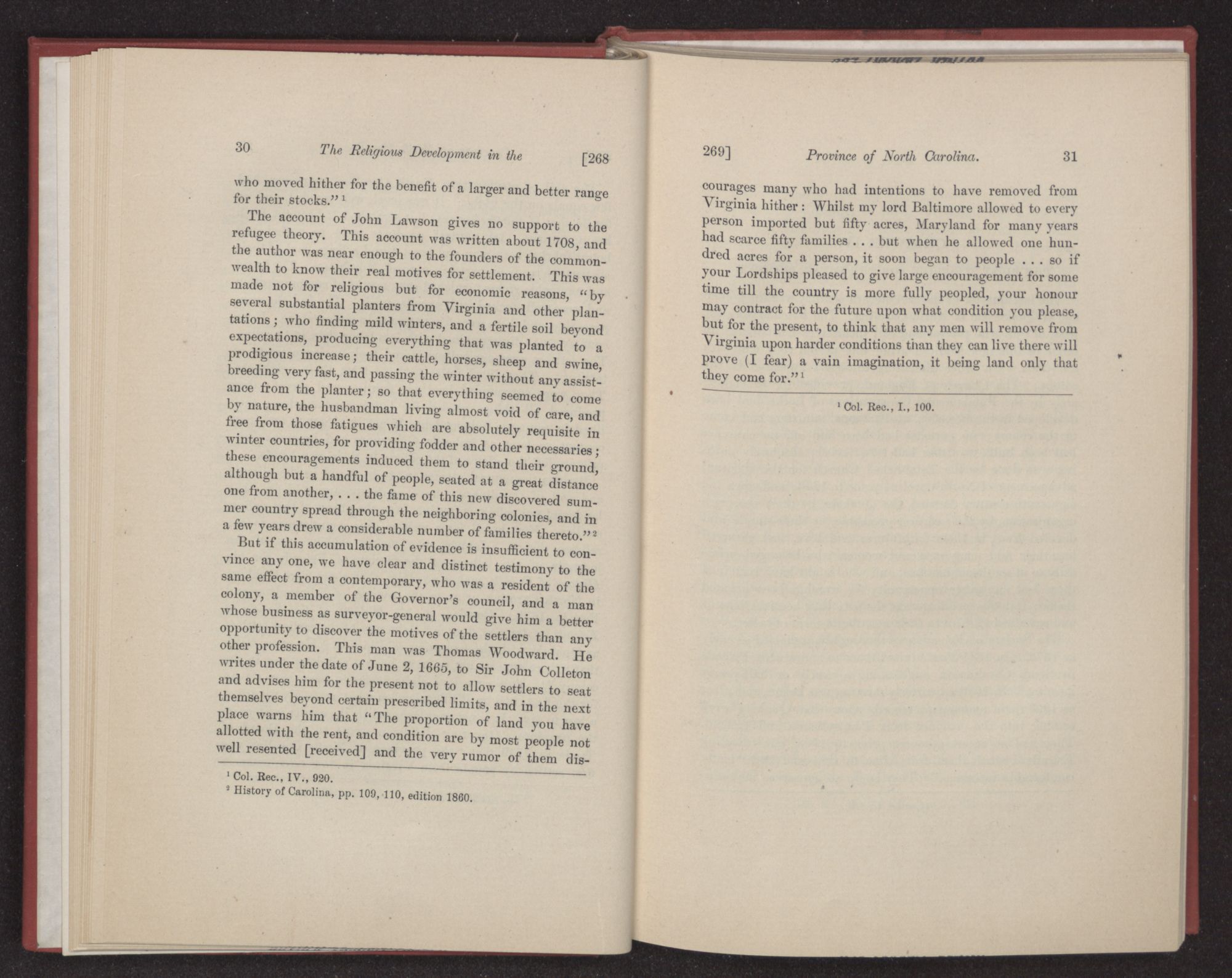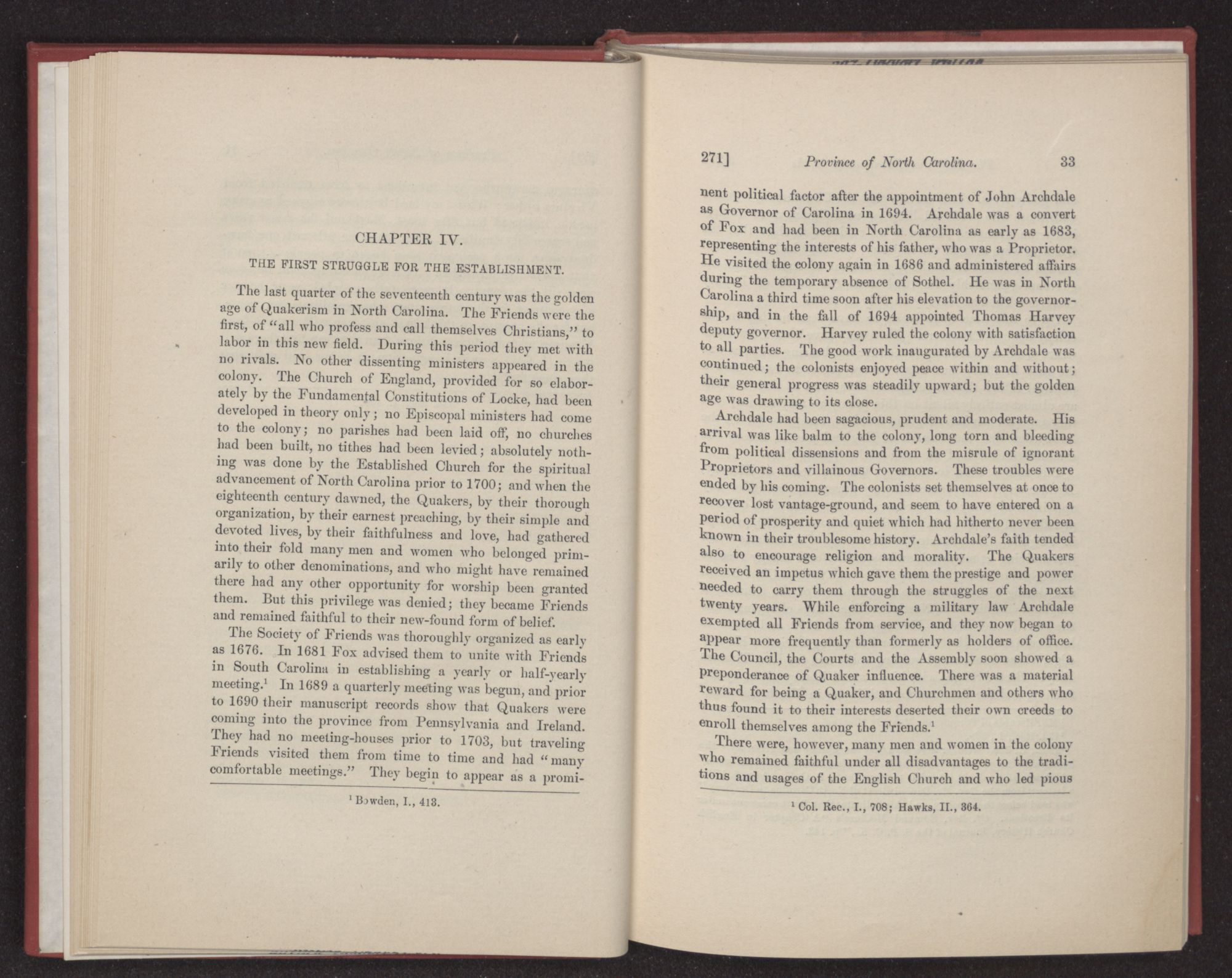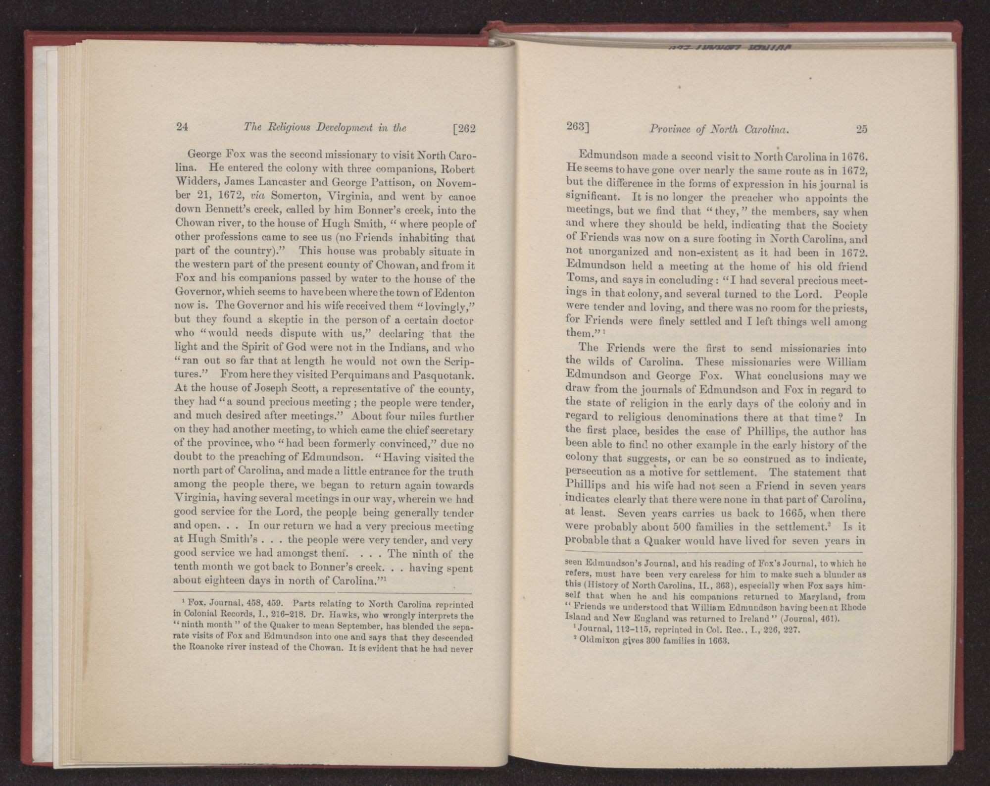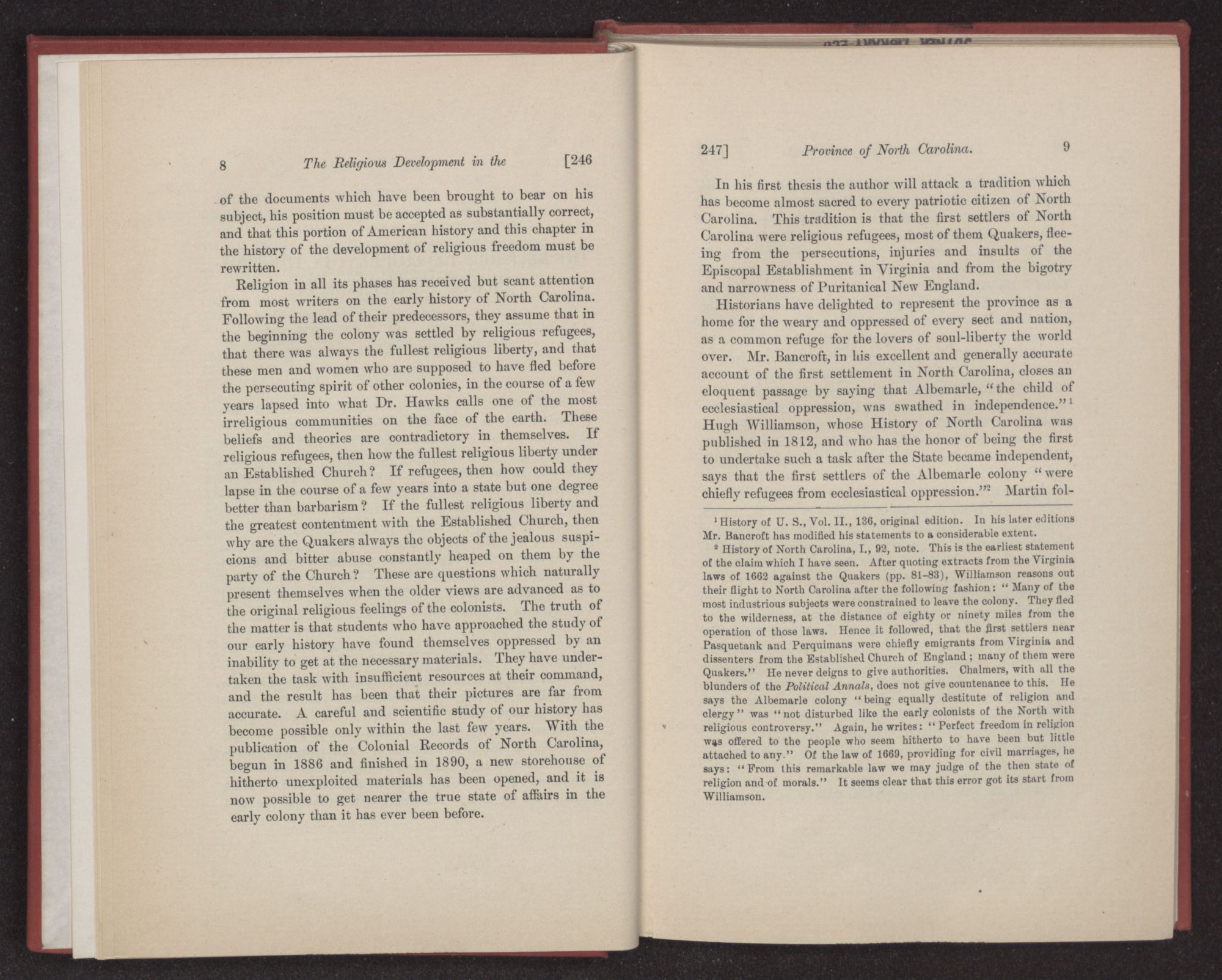 1 History of U. S., Vol. II., 136, original edition. In his later editions Mr. Bancroft has modified his statements to a considerable extent.2 History of North Carolina, I., 92, note. This is the earliest statement of the claim which I have seen. After quoting extracts from the Virginia laws of 1662 against the Quakers (pp. 81-83), Williamson reasons out their flight to North Carolina after the following fashion: “Many of the most industrious subjects were constrained to leave the colony. They fled to the wilderness, at the distance of eighty or ninety miles from the operation of those laws. Hence it followed, that the first settlers near Pasquetank and Perquimans were chiefly emigrants from Virginia and dissenters from the Established Church of England; many of them were Quakers.” He never deigns to give authorities. Chalmers, with all the blunders of the Political Annals, does not give countenance to this. He says the Albemarle colony “being equally destitute of religion and clergy” was “not disturbed like the early colonists of the North with religious controversy.” Again, he writes: “Perfect freedom in religion was offered to the people who seem hitherto to have been but little attached to any.” Of the law of 1669, providing for civil marriages, he says: “From this remarkable law we may judge of the then state of religion and of morals.” It seems clear that this error got its start from Williamson.him in point of time and says, with reference to the year 1660, “The legislature of Virginia having passed laws unfavorable to the Quakers, a number of whom had fled thither from the persecuting spirit of New England, many families sought an asylum on Albemarle Sound.”1 John H. Wheeler, the next historian of the State, reëchoes this old belief. He says that North Carolina previous to 1653 had been “the refuge of Quakers, and others fleeing from religious persecutions.”2 Dr. Hawks, who is by far the most scholarly of our State historians, forgetting for the time his church in his Christianity, says, “The Quakers were no small part of the infant colony: they had fled purposely to escape the tender mercies of the Episcopal establishment in Virginia, and the Puritan model in Massachusetts.”3 The persecutions endured by the Quakers “sent them into the wilderness of North Carolina, and this persecution began in New England.” He characterizes this treatment by saying that whether it came from Prelatist or Puritan it was not taught by Christ and was really and truly “damnable wickedness.”4 The latest historian of the State is John W. Moore, whose work was published in 1880. He follows the lead of his predecessors, and in speaking of the persecution of Baptists and Quakers in Virginia says, “North Carolina was then beyond the jurisdiction of the petty tyrant who ruled at Williamsburg. The tender mercies of the Tuscarora seemed preferable to the whippings and brandings practiced in Virginia to prevent nonconformity to the Established Church.”5