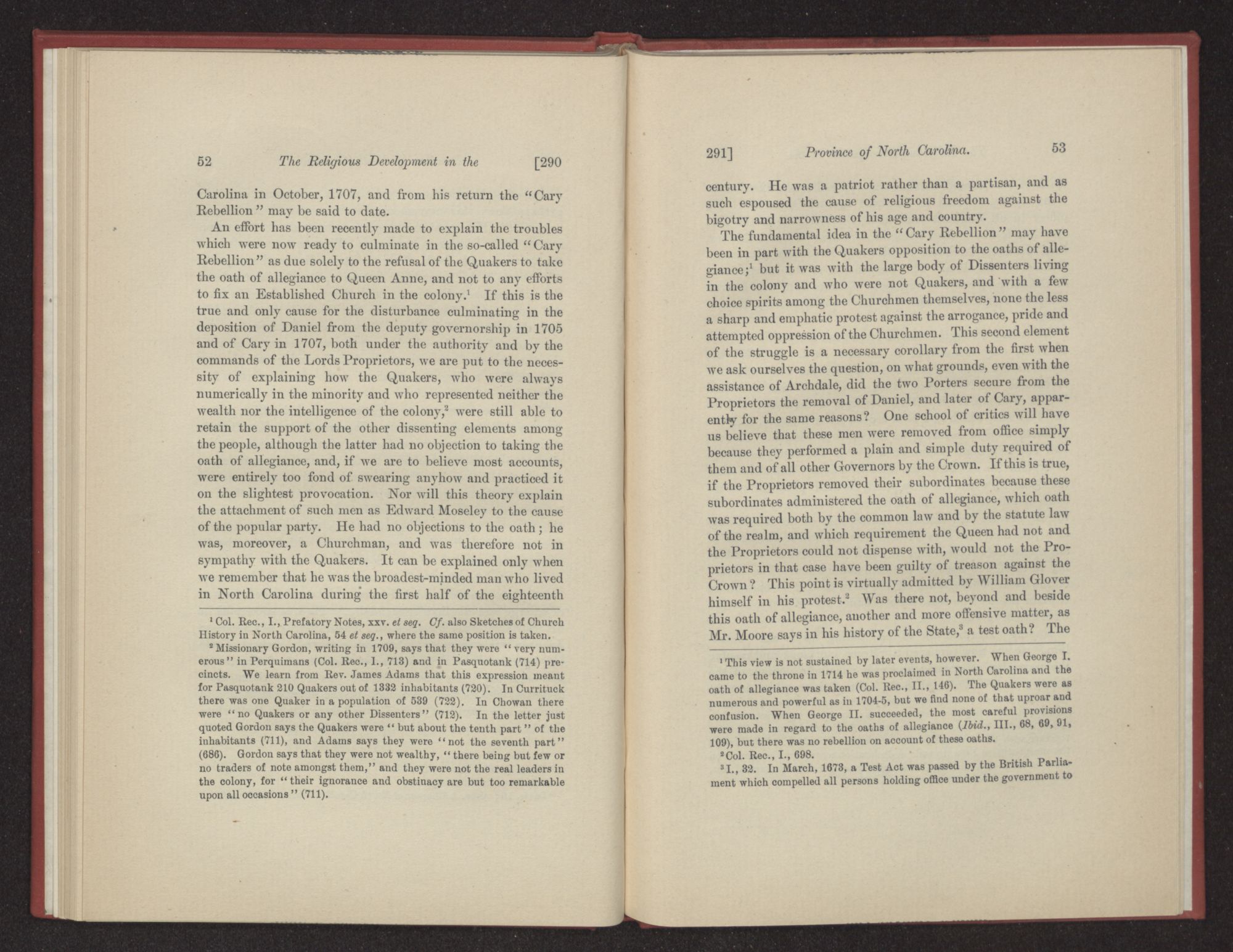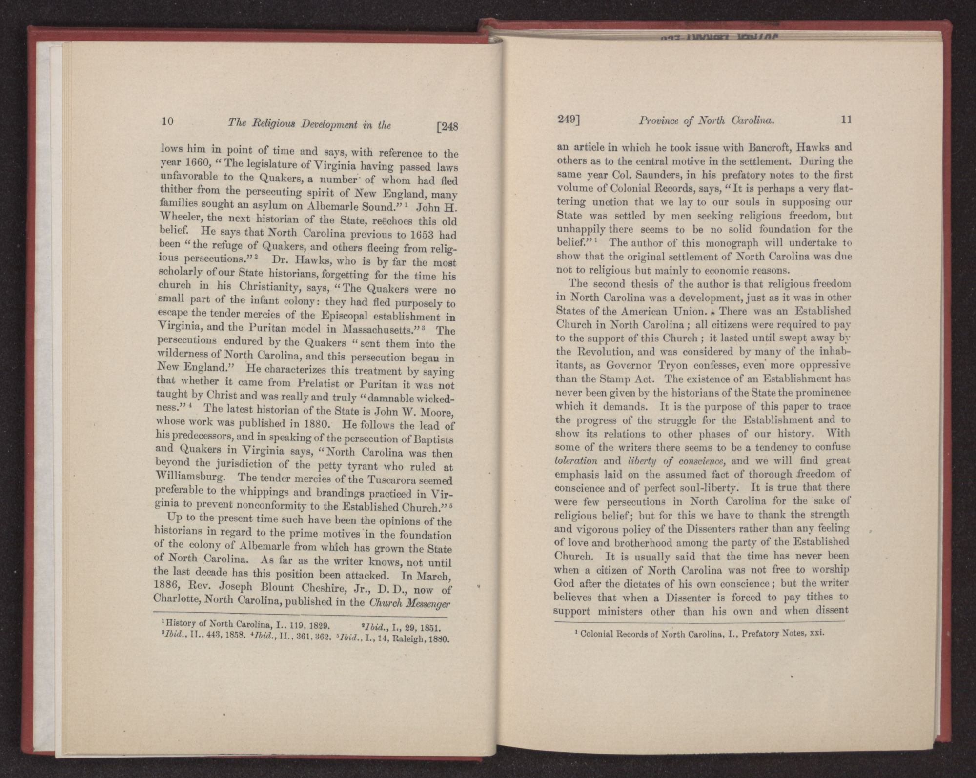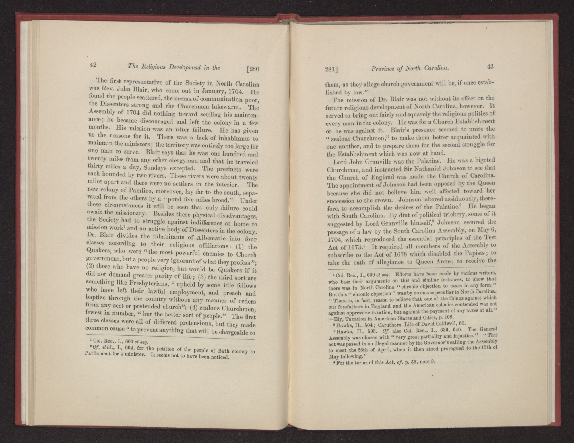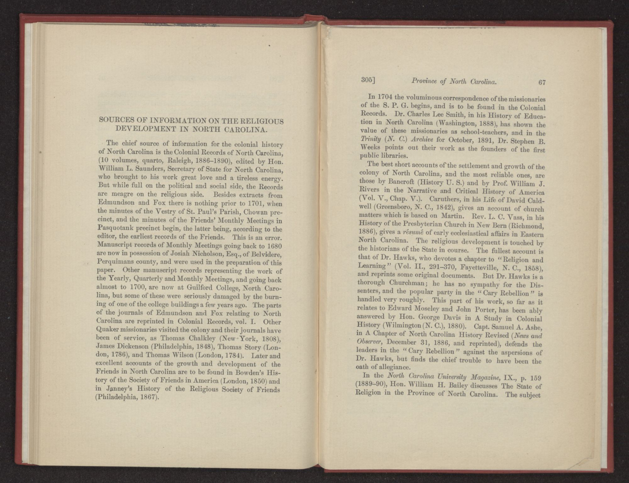 Religion in all its phases has received but scant attention from most writers on the early history of North Carolina. Following the lead of their predecessors, they assume that in the beginning the colony was settled by religious refugees, that there was always the fullest religious liberty, and that these men and women who are supposed to have fled before the persecuting spirit of other colonies, in the course of a few years lapsed into what Dr. Hawks calls one of the most irreligious communities on the face of the earth. These beliefs and theories are contradictory in themselves. If religious refugees, then how the fullest religious liberty under an Established Church? If refugees, then how could they lapse in the course of a few years into a state but one degree better than barbarism? If the fullest religious liberty and the greatest contentment with the Established Church, then why are the Quakers always the objects of the jealous suspicions and bitter abuse constantly heaped on them by the party of the Church? These are questions which naturally present themselves when the older views are advanced as to the original religious feelings of the colonists. The truth of the matter is that students who have approached the study of our early history have found themselves oppressed by an inability to get at the necessary materials. They have undertaken the task with insufficient resources at their command, and the result has been that their pictures are far from accurate. A careful and scientific study of our history has become possible only within the last few years. With the publication of the Colonial Records of North Carolina, begun in 1886 and finished in 1890, a new storehouse of hitherto unexploited materials has been opened, and it is now possible to get nearer the true state of affairs in the early colony than it has ever been before.