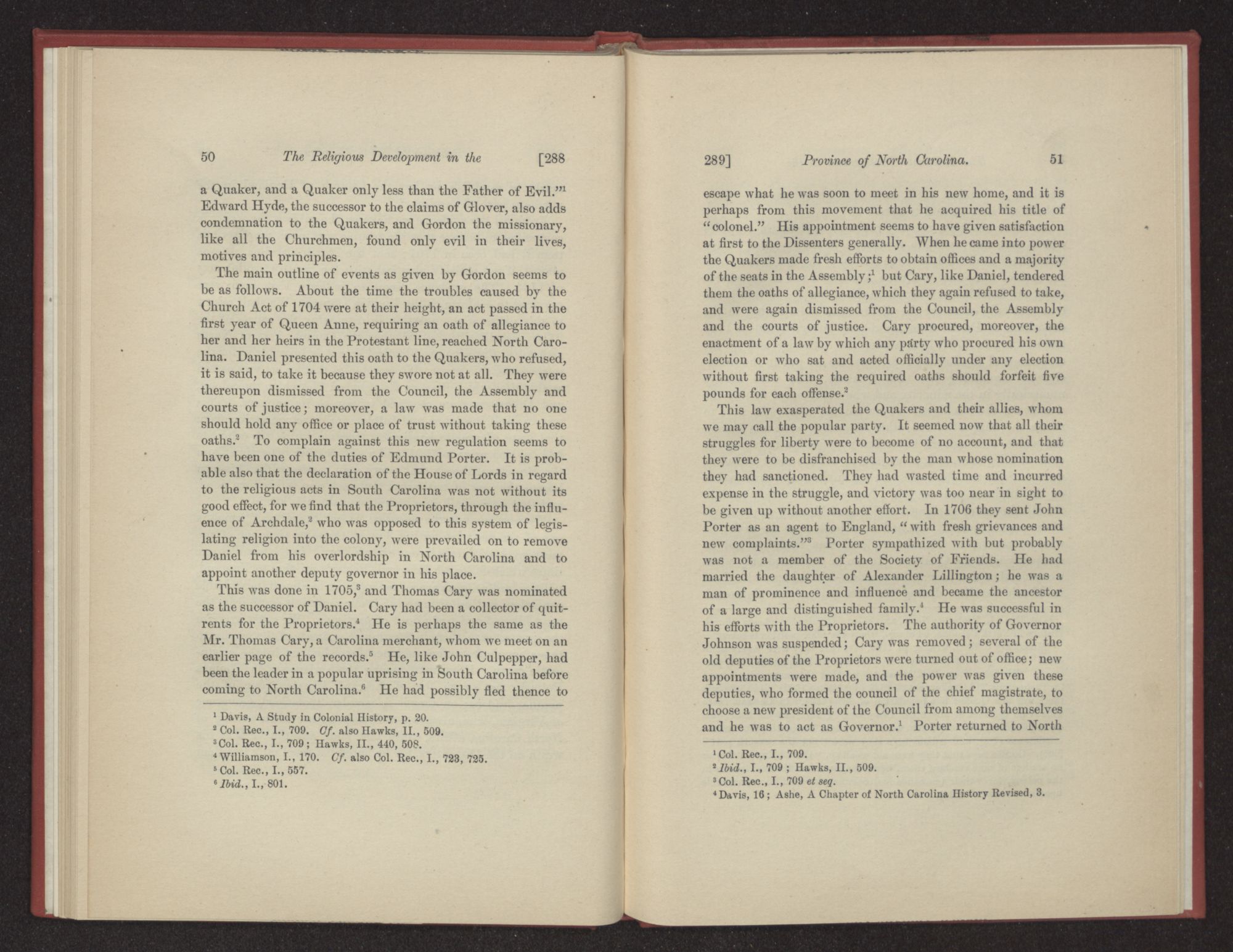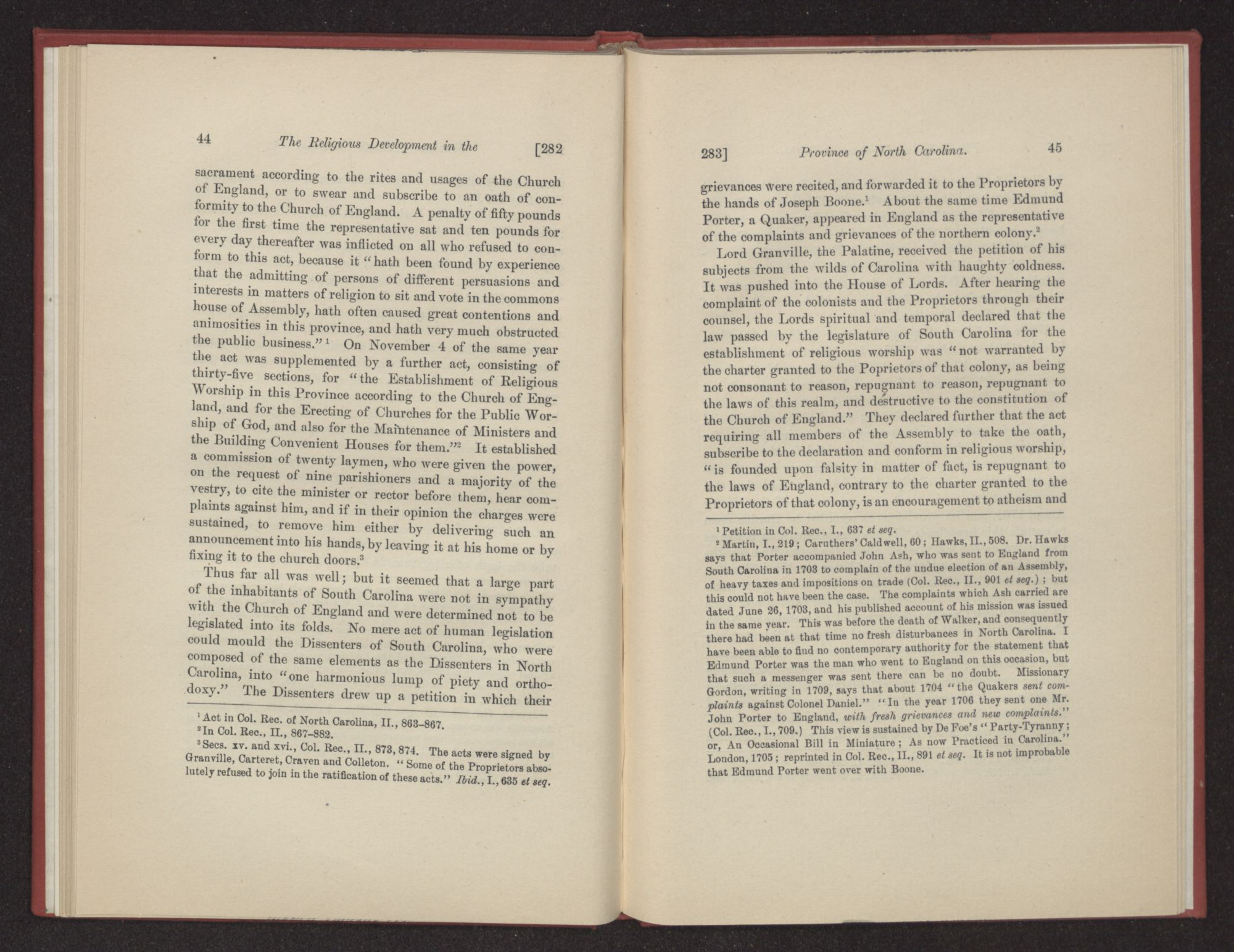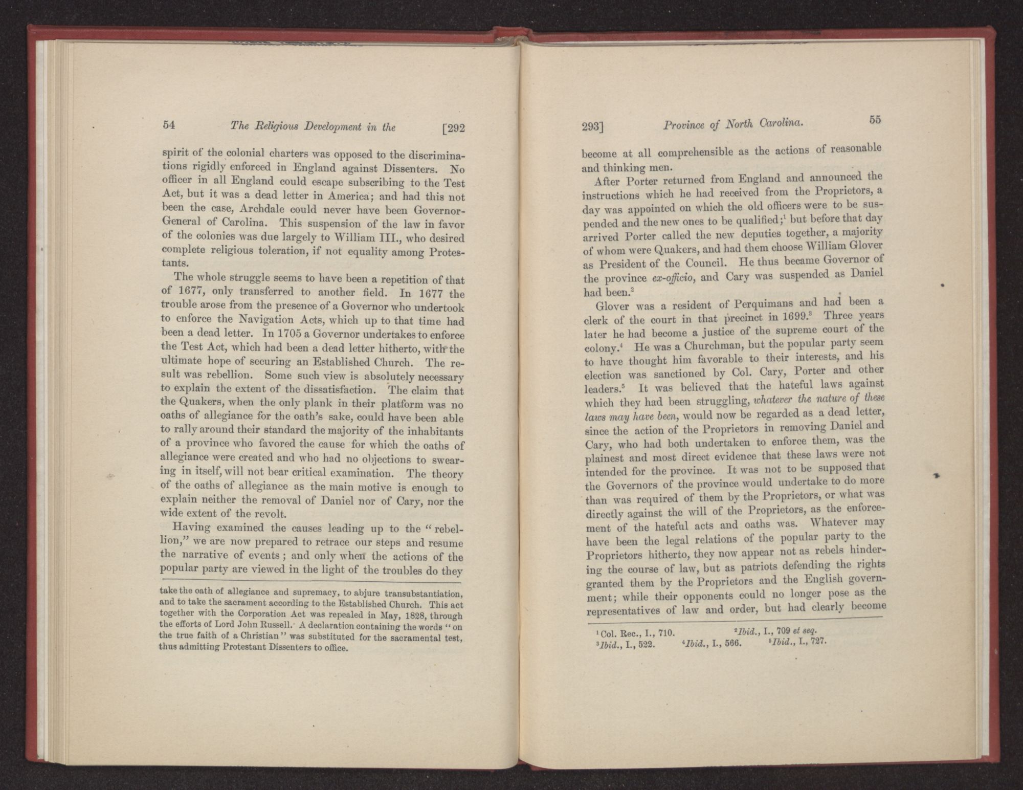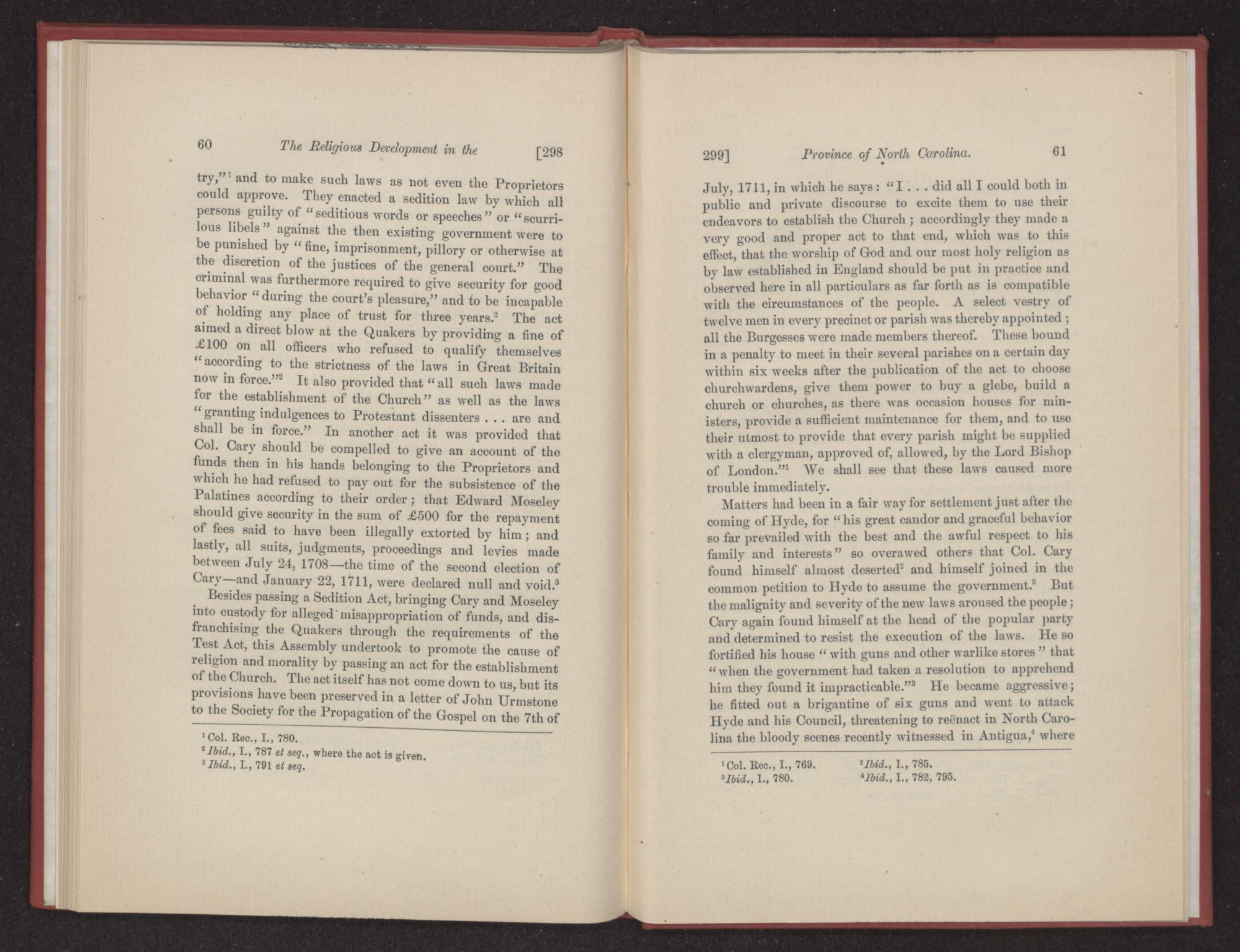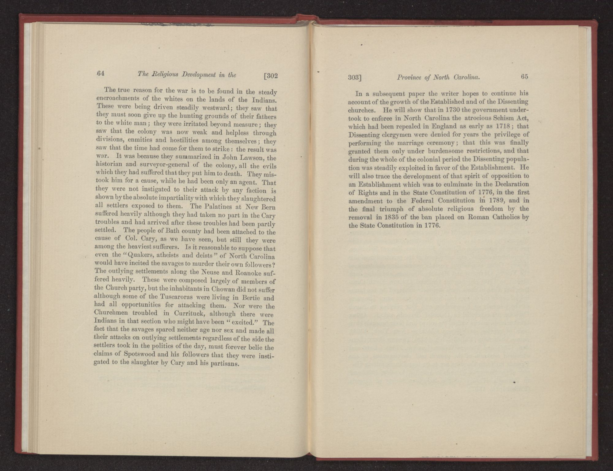 Religion in all its phases has received but scant attention from most writers on the early history of North Carolina. Following the lead of their predecessors, they assume that in the beginning the colony was settled by religious refugees, that there was always the fullest religious liberty, and that these men and women who are supposed to have fled before the persecuting spirit of other colonies, in the course of a few years lapsed into what Dr. Hawks calls one of the most irreligious communities on the face of the earth. These beliefs and theories are contradictory in themselves. If religious refugees, then how the fullest religious liberty under an Established Church? If refugees, then how could they lapse in the course of a few years into a state but one degree better than barbarism? If the fullest religious liberty and the greatest contentment with the Established Church, then why are the Quakers always the objects of the jealous suspicions and bitter abuse constantly heaped on them by the party of the Church? These are questions which naturally present themselves when the older views are advanced as to the original religious feelings of the colonists. The truth of the matter is that students who have approached the study of our early history have found themselves oppressed by an inability to get at the necessary materials. They have undertaken the task with insufficient resources at their command, and the result has been that their pictures are far from accurate. A careful and scientific study of our history has become possible only within the last few years. With the publication of the Colonial Records of North Carolina, begun in 1886 and finished in 1890, a new storehouse of hitherto unexploited materials has been opened, and it is now possible to get nearer the true state of affairs in the early colony than it has ever been before.
