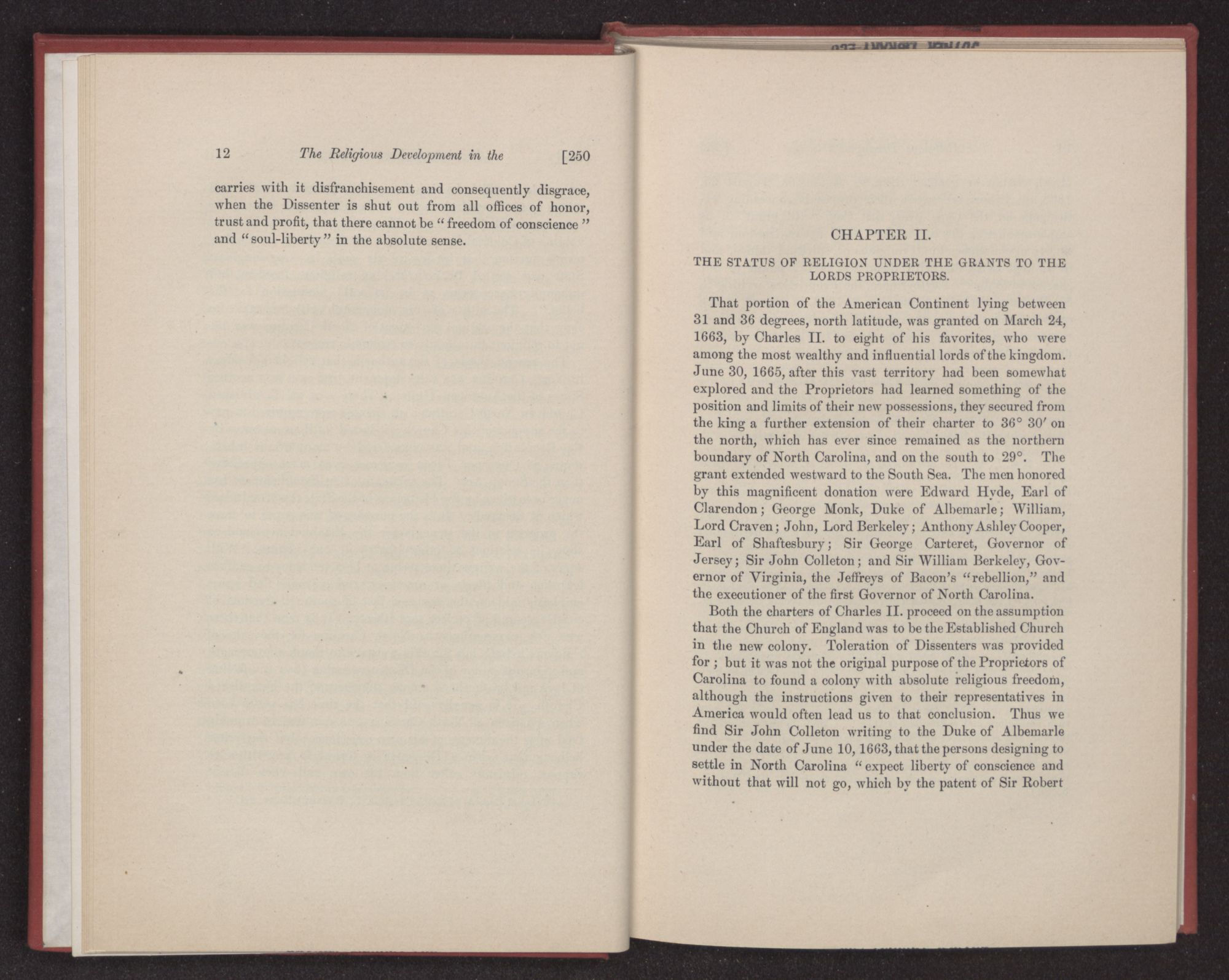 These quotations from original sources show clearly enough the animus of the Proprietors in matters religious. They were anxious to have Dissenters settle in and develop their province, but they could never bring themselves to grant these settlers absolute freedom of religion unencumbered by any special rights and privileges to the Church of England, either expressed or implied. They make the fairest and most blandishing promises to would-be settlers. They emphasize what they call “full and free liberty of conscience.”3 But we see that this meant only toleration at best, and toleration is spoken of as something outside of the regular course of action; as if it were a privilege to be granted or withheld just as the interests of the Proprietors should dictate. They had the wonderful faculty of creating within the same state an