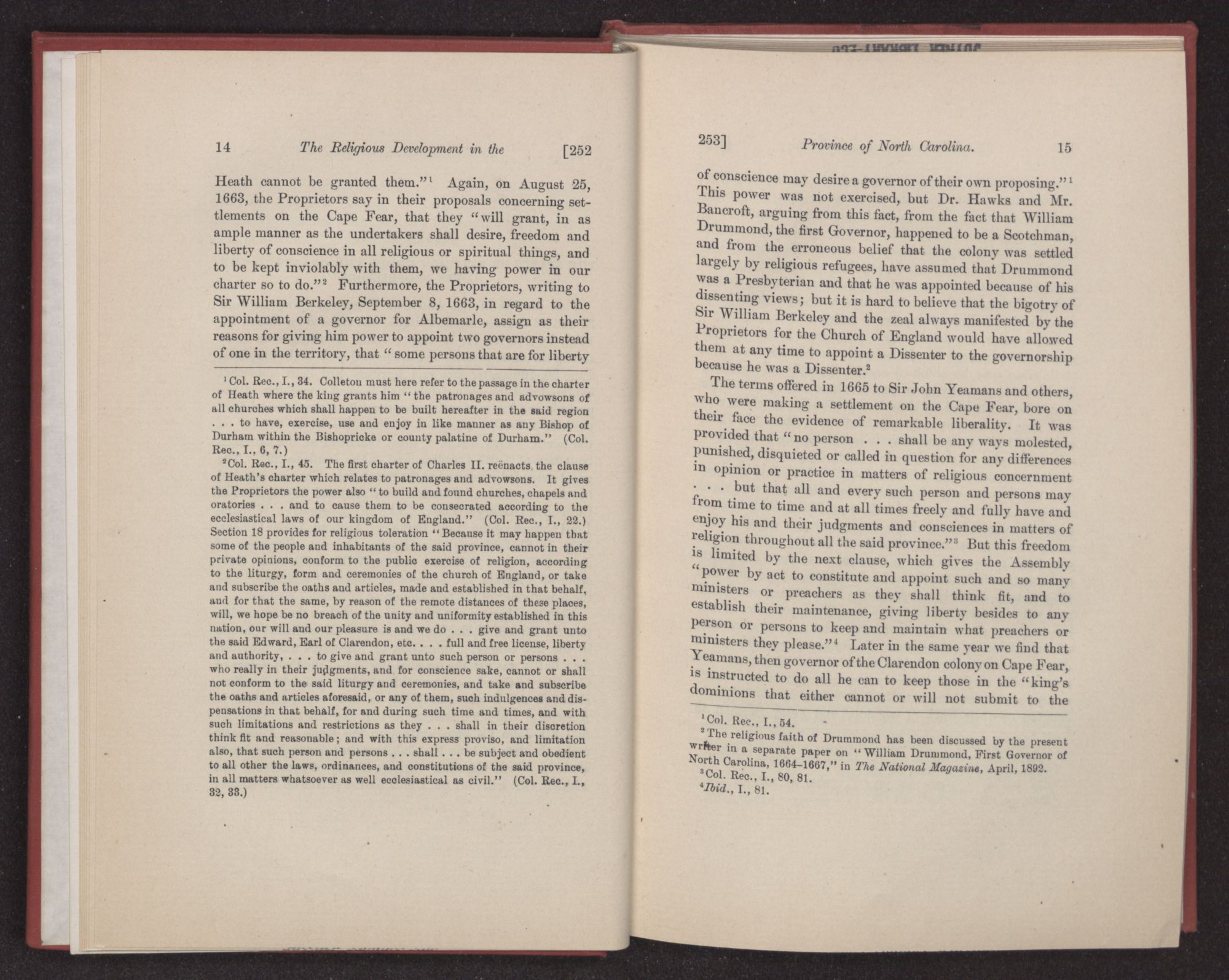 1Col. Rec., I., 34. Colleton must here refer to the passage in the charter of Heath where the king grants him “the patronages and advowsons of all churches which shall happen to be built hereafter in the said region . . . to have, exercise, use and enjoy in like manner as any Bishop of Durham within the Bishopricke or county palatine of Durham.” (Col. Rec., I., 6, 7.)2Col. Rec., I., 45. The first charter of Charles II. reënacts the clause of Heath's charter which relates to patronages and advowsons. It gives the Proprietors the power also “to build and found churches, chapels and oratories . . . and to cause them to be consecrated according to the ecclesiastical laws of our kingdom of England.” (Col. Rec., I., 22.) Section 18 provides for religious toleration “Because it may happen that some of the people and inhabitants of the said province, cannot in their private opinions, conform to the public exercise of religion, according to the liturgy, form and ceremonies of the church of England, or take and subscribe the oaths and articles, made and established in that behalf, and for that the same, by reason of the remote distances of these places, will, we hope be no breach of the unity and uniformity established in this nation, our will and our pleasure is and we do . . . give and grant unto the said Edward, Earl of Clarendon, etc. . . . full and free license, liberty and authority. . . . to give and grant unto such person or persons . . . who really in their judgments, and for conscience sake, cannot or shall not conform to the said liturgy and ceremonies, and take and subscribe the oaths and articles aforesaid, or any of them, such indulgences and dispensations in that behalf, for and during such time and times, and with such limitations and restrictions as they . . . shall in their discretion think fit and reasonable; and with this express proviso, and limitation also, that such person and persons . . . shall . . . be subject and obedient to all other the laws, ordinances, and constitutions of the said province, in all matters whatsoever as well ecclesiastical as civil.” (Col. Rec., I., 32, 33.of conscience may desire a governor of their own proposing.”1 This power was not exercised, but Dr. Hawks and Mr. Bancroft, arguing from this fact, from the fact that William Drummond, the first Governor, happened to be a Scotchman, and from the erroneous belief that the colony was settled largely by religious refugees, have assumed that Drummond was a Presbyterian and that he was appointed because of his dissenting views; but it is hard to believe that the bigotry of Sir William Berkeley and the zeal always manifested by the Proprietors for the Church of England would have allowed them at any time to appoint a Dissenter to the governorship because he was a Dissenter.2