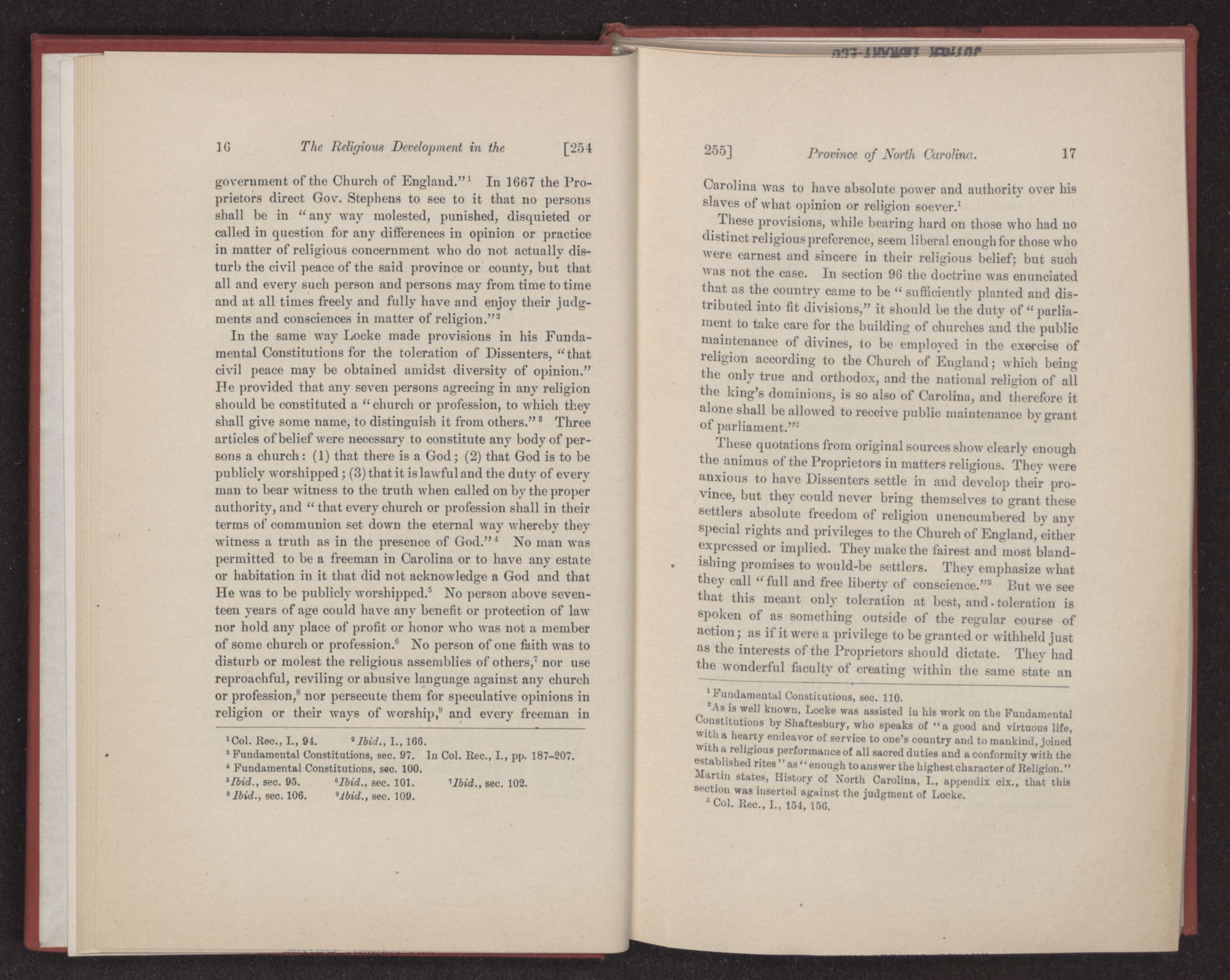 1 Col. Rec., I., 94.2Ibid., I., 166.3 Fundamental Constitutions, sec. 97. In Col. Rec., I., pp. 187-207.4 Fundamental Constitutions, sec. 100.5Ibid., sec. 95.6Ibid., sec. 101.7Ibid., sec. 102.8Ibid., sec. 106.9Ibid., sec. 109.Carolina was to have absolute power and authority over his slaves of what opinion or religion soever.1