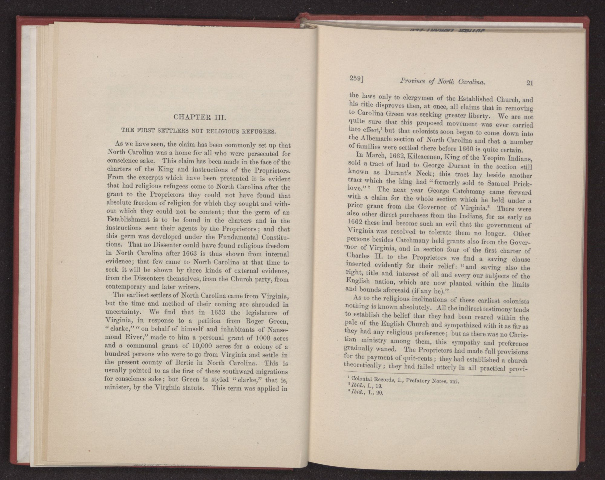 Historians have delighted to represent the province as a home for the weary and oppressed of every sect and nation, as a common refuge for the lovers of soul-liberty the world over. Mr. Bancroft, in his excellent and generally accurate account of the first settlement in North Carolina, closes an eloquent passage by saying that Albemarle, “the child of ecclesiastical oppression, was swathed in independence.”1 Hugh Williamson, whose History of North Carolina was published in 1812, and who has the honor of being the first to undertake such a task after the State became independent, says that the first settlers of the Albemarle colony “were chiefly refugees from ecclesiastical oppression.”2 Martin follows