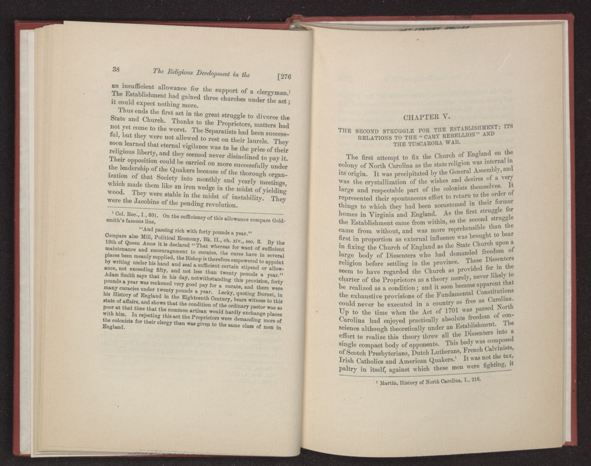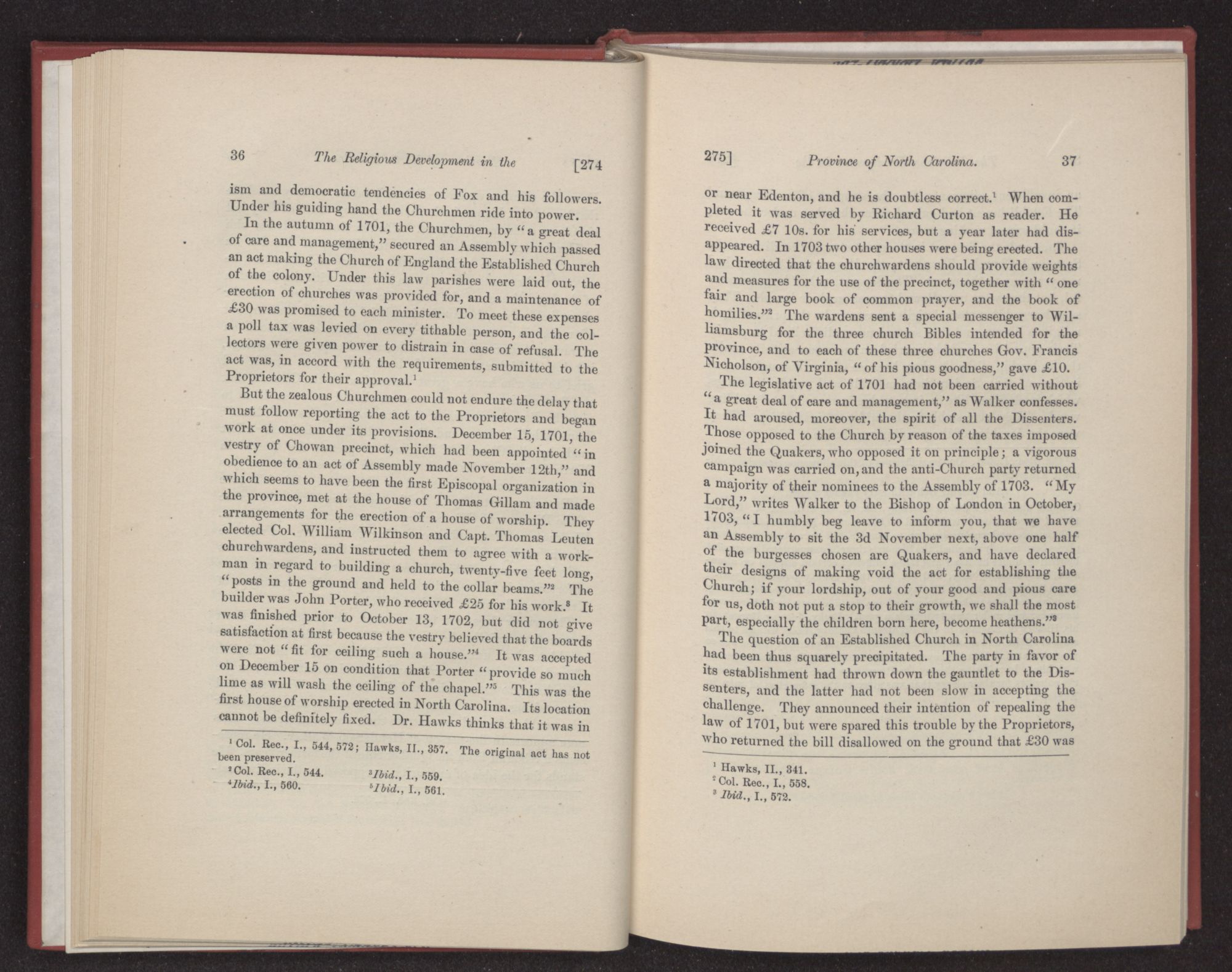 The second thesis of the author is that religious freedom in North Carolina was a development, just as it was in other States of the American Union. There was an Established Church in North Carolina; all citizens were required to pay to the support of this Church; it lasted until swept away by the Revolution, and was considered by many of the inhabitants, as Governor Tryon confesses, even more oppressive than the Stamp Act. The existence of an Establishment has never been given by the historians of the State the prominence which it demands. It is the purpose of this paper to trace the progress of the struggle for the Establishment and to show its relations to other phases of our history. With some of the writers there seems to be a tendency to confuse toleration and liberty of conscience, and we will find great emphasis laid on the assumed fact of thorough freedom of conscience and of perfect soul-liberty. It is true that there were few persecutions in North Carolina for the sake of religious belief; but for this we have to thank the strength and vigorous policy of the Dissenters rather than any feeling of love and brotherhood among the party of the Established Church. It is usually said that the time has never been when a citizen of North Carolina was not free to worship God after the dictates of his own conscience; but the writer believes that when a Dissenter is forced to pay tithes to support ministers other than his own and when dissent