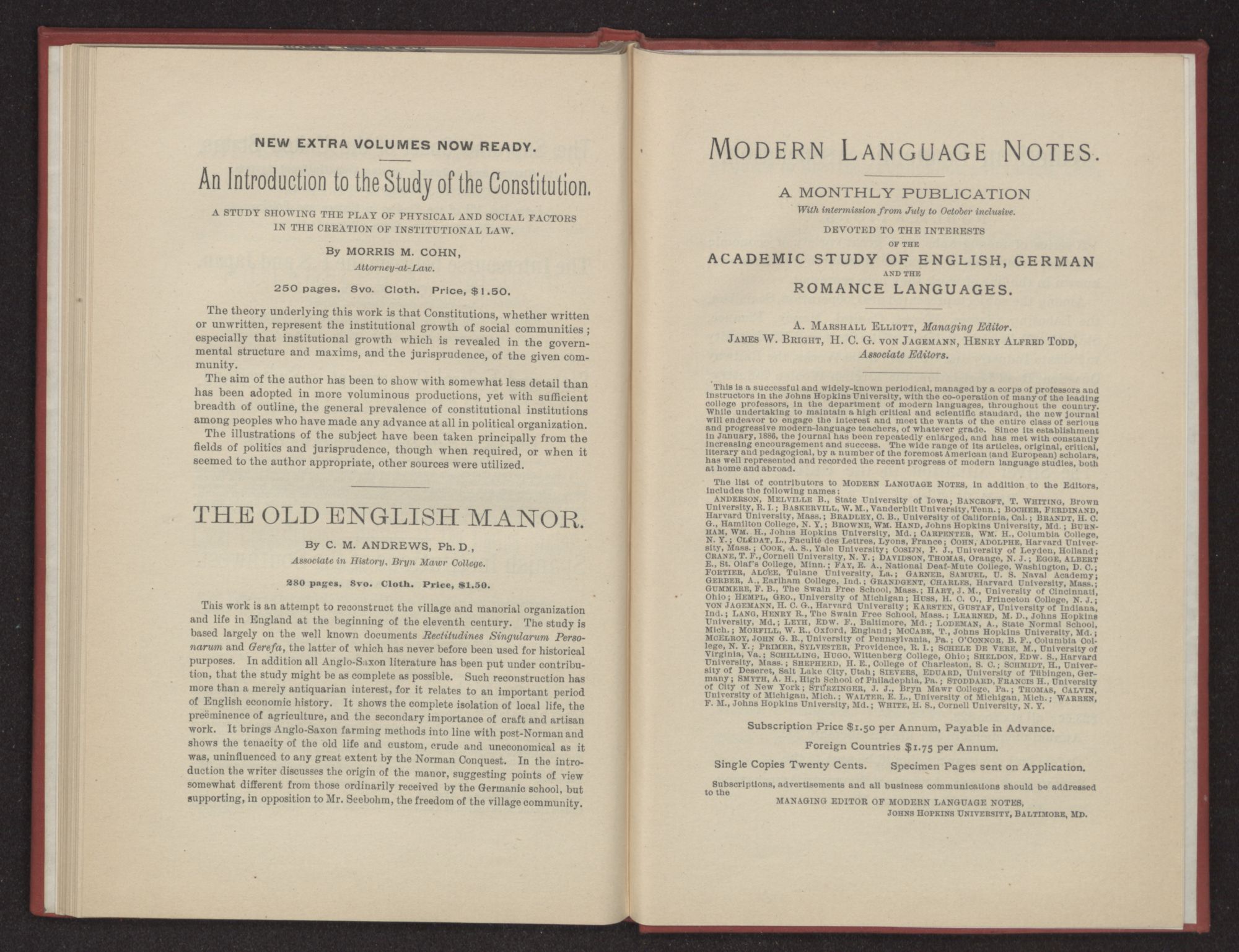 This is a successful and widely-known periodical, managed by a corps of professors and instructors in the Johns Hopkins University, with the co-operation of many of the leading college professors, in the department of modern languages, throughout the country. While undertaking to maintain a high critical and scientific standard, the new journal will endeavor to engage the interest and meet the wants of the entire class of serious and progressive modern-language teachers, of whatever grade. Since its establishment in January, 1886, the journal has been repeatedly enlarged, and has met with constantly increasing encouragement and success. The wide range of its articles, original, critical, literary and pedagogical, by a number of the foremost American (and European) scholars, has well represented and recorded the recent progress of modern language studies, both at home and abroad.