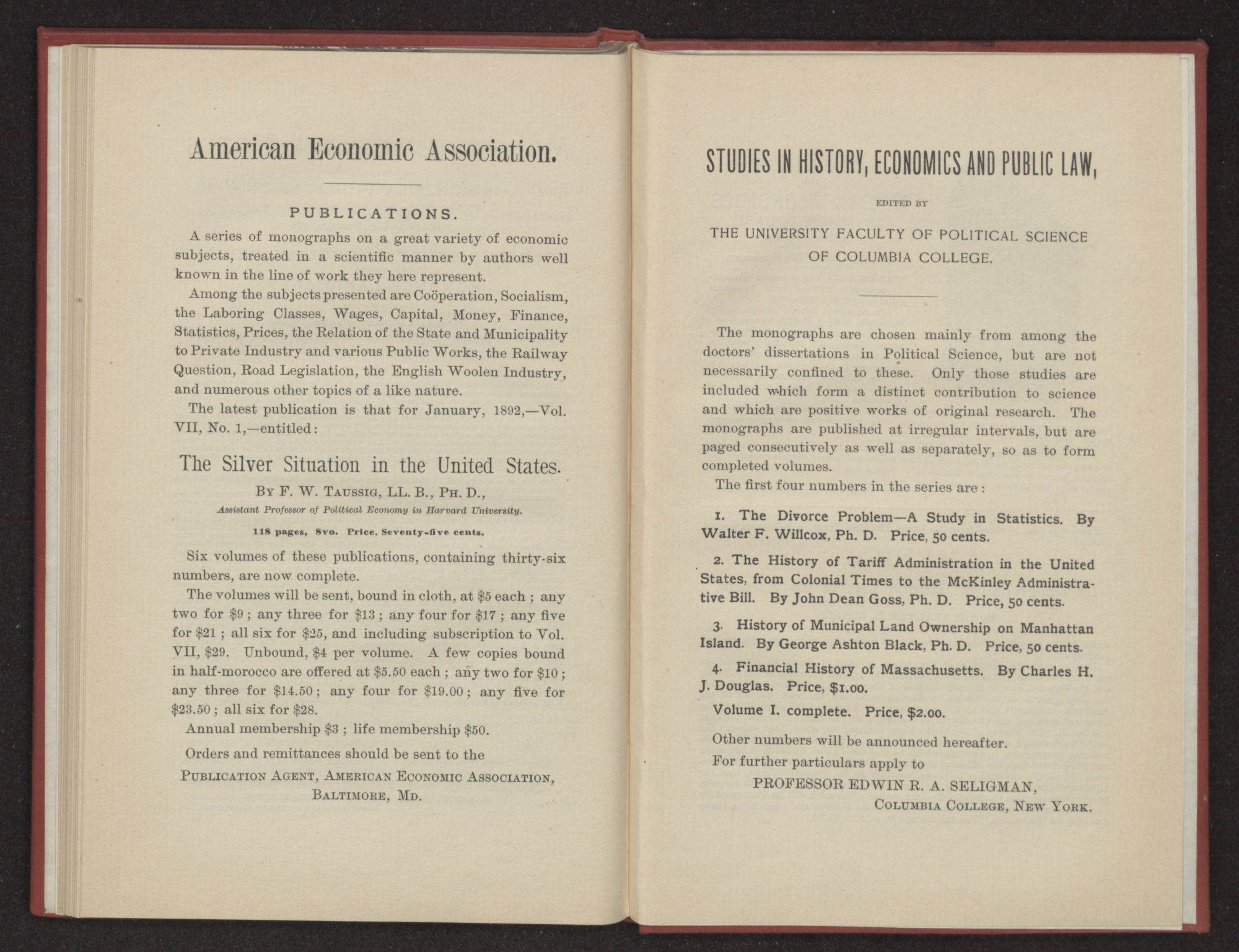 1. The Divorce Problem—A Study in Statistics. By Walter F. Willcox, Ph. D. Price, 50 cents.