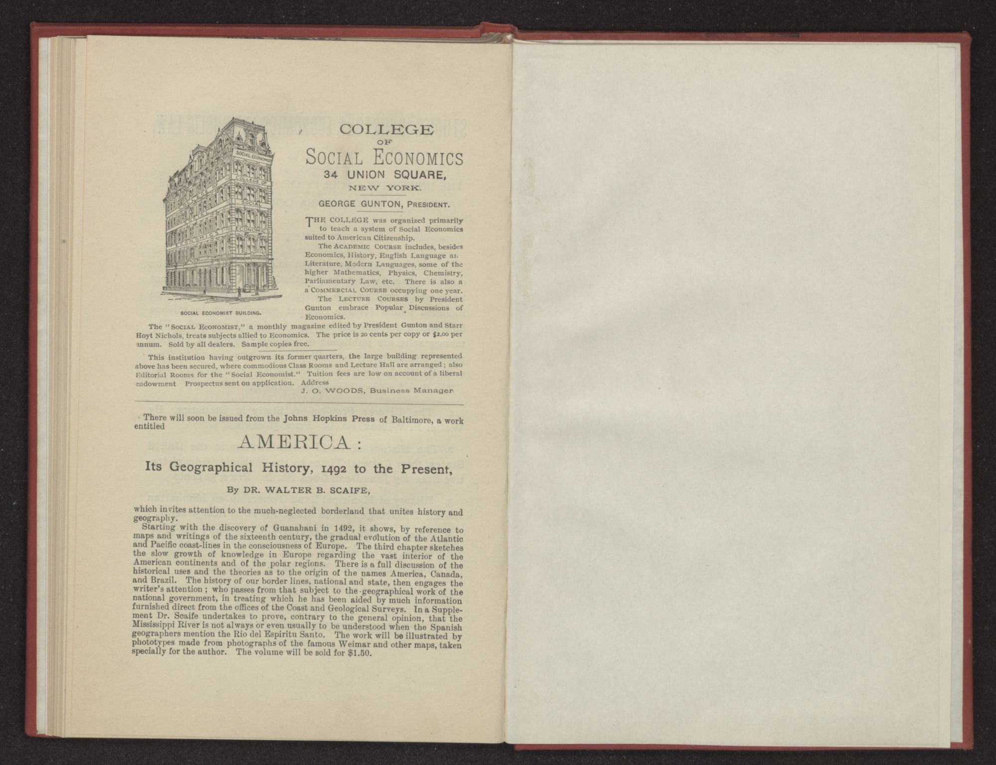 The “SOCIAL ECONOMIST,” a monthly magazine edited by President Gunton and Starr Hoyt Nichols, treats subjects allied to Economics. The price is 20 cents per copy or $2.00 per annum. Sold by all dealers. Sample copies free.