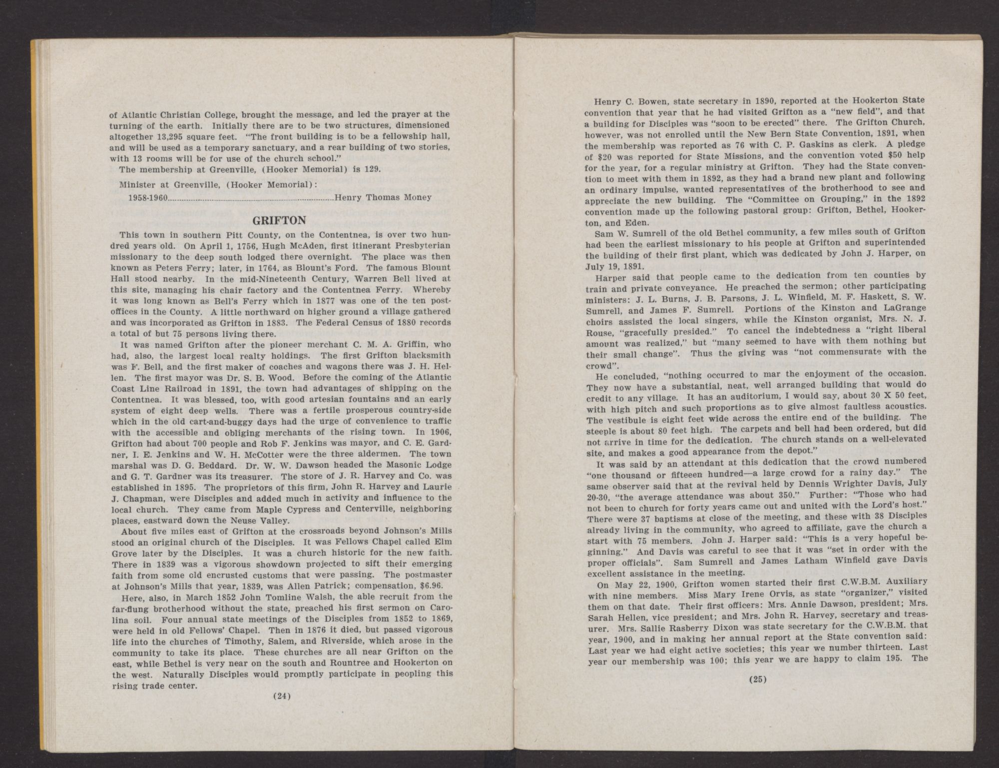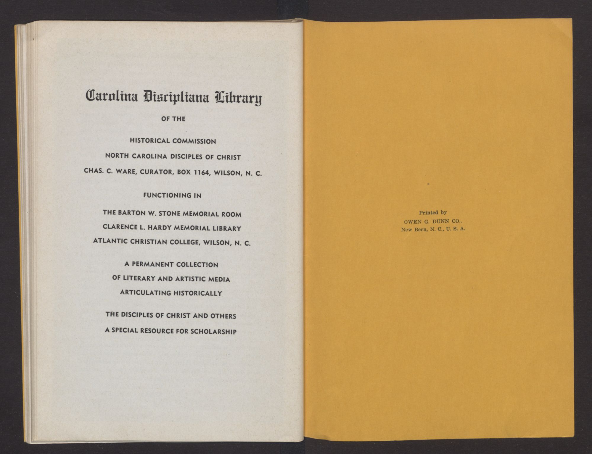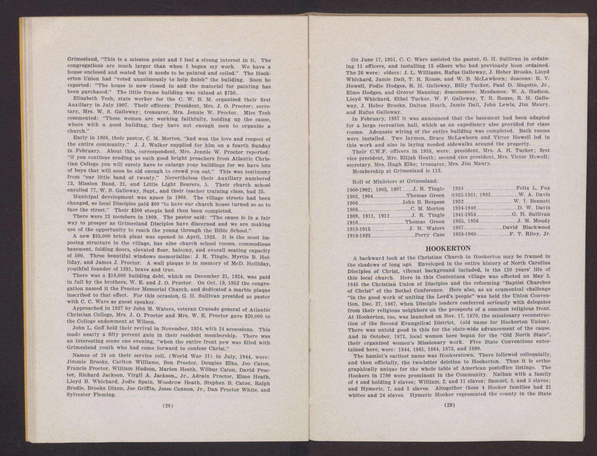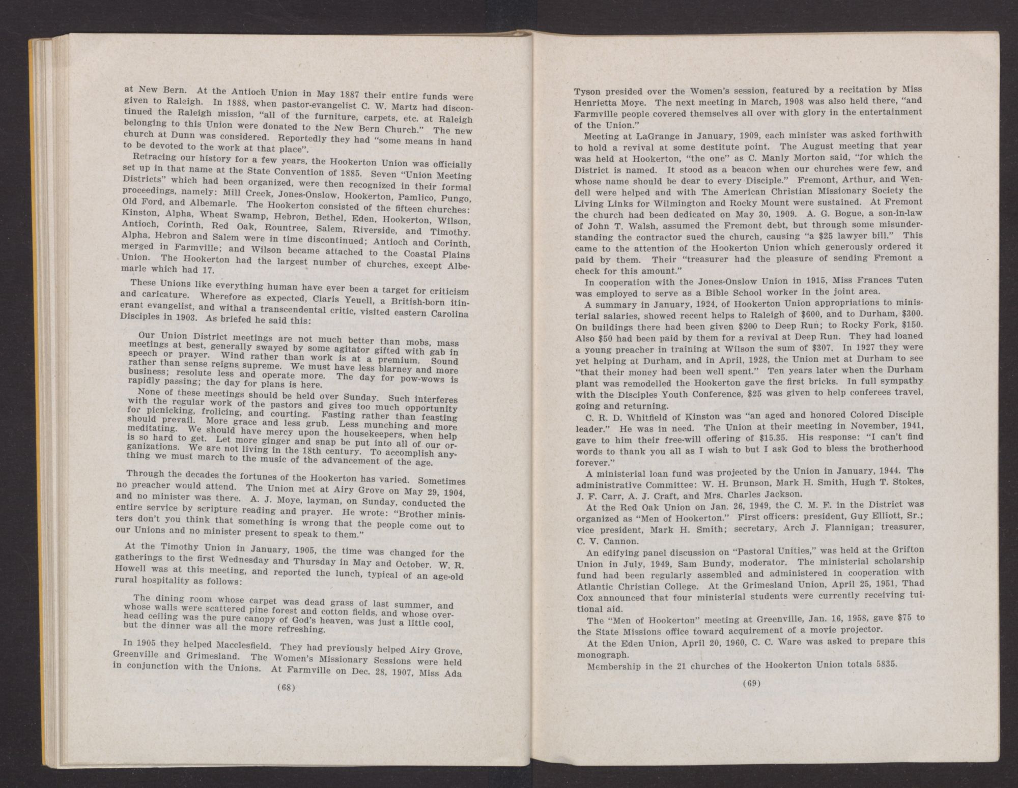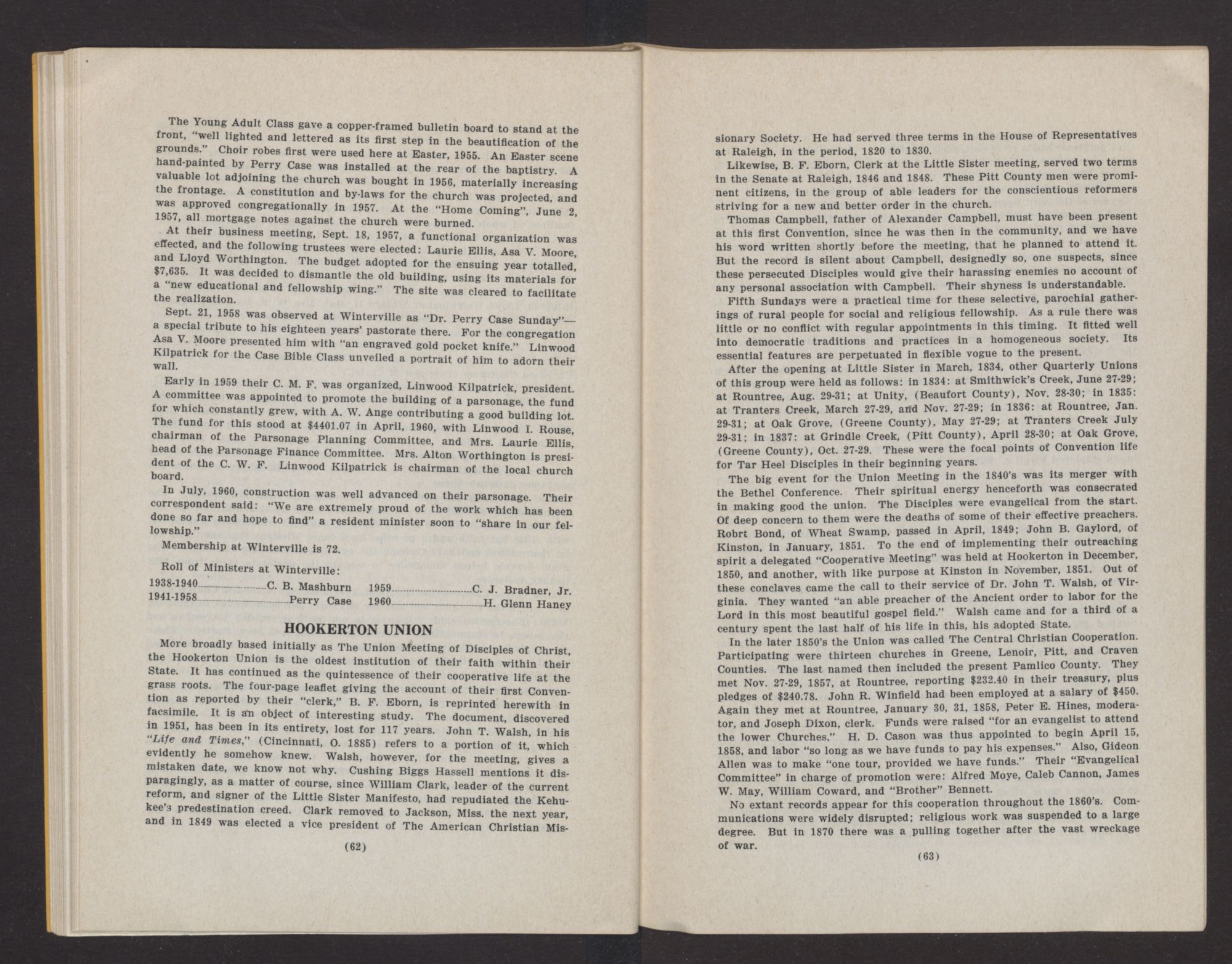 FOREWORDA good part of the definitive history of North Carolina Christian Churches, (Disciples of Christ), is involved in the career of the Hookerton Union, their oldest institution. The primary group of 126 years ago was known as The Union Meeting of Disciples of Christ in North Carolina. Later it was identified as The Central Christian Cooperation; yet later, called The Second Evangelical District; and from 1885 to date as the Hookerton Union. In eastern North Carolina it consists of 21 Christian Churches, including the three in Greene County, and the eighteen others in parts of Craven, Lenoir, and Pitt Counties.
