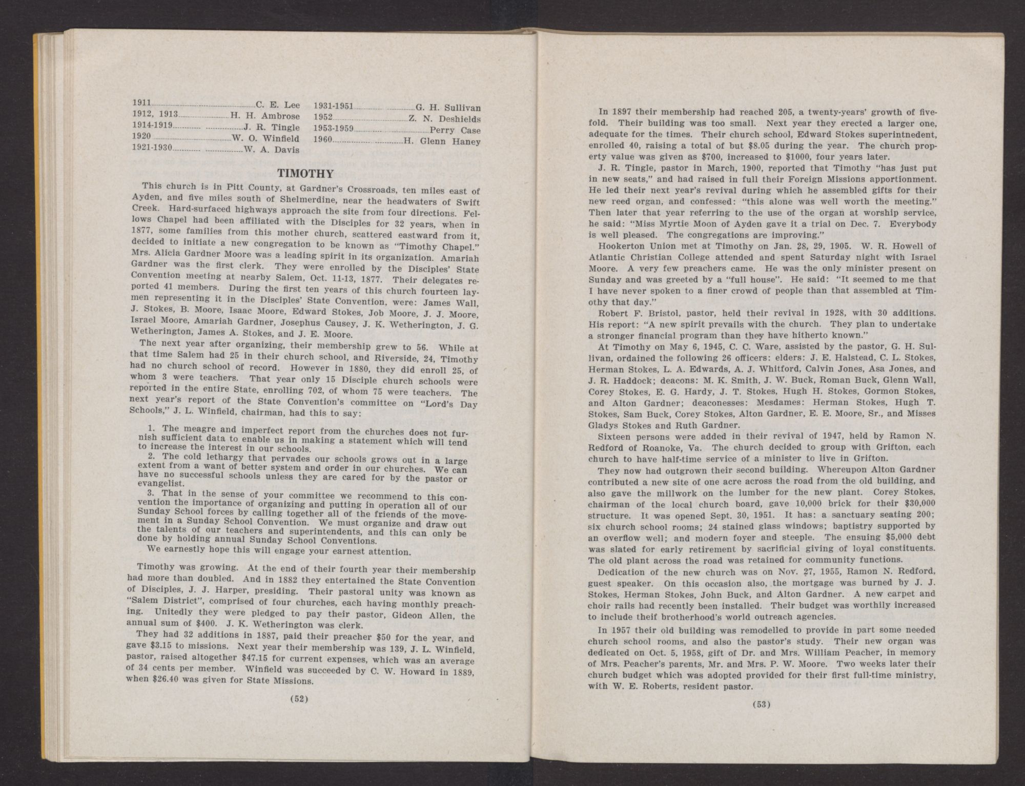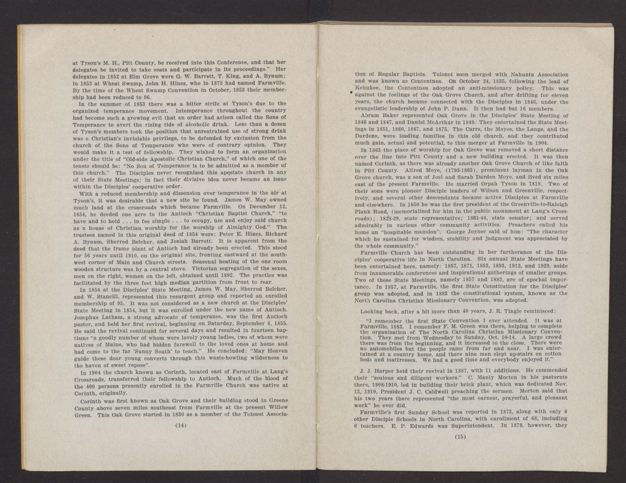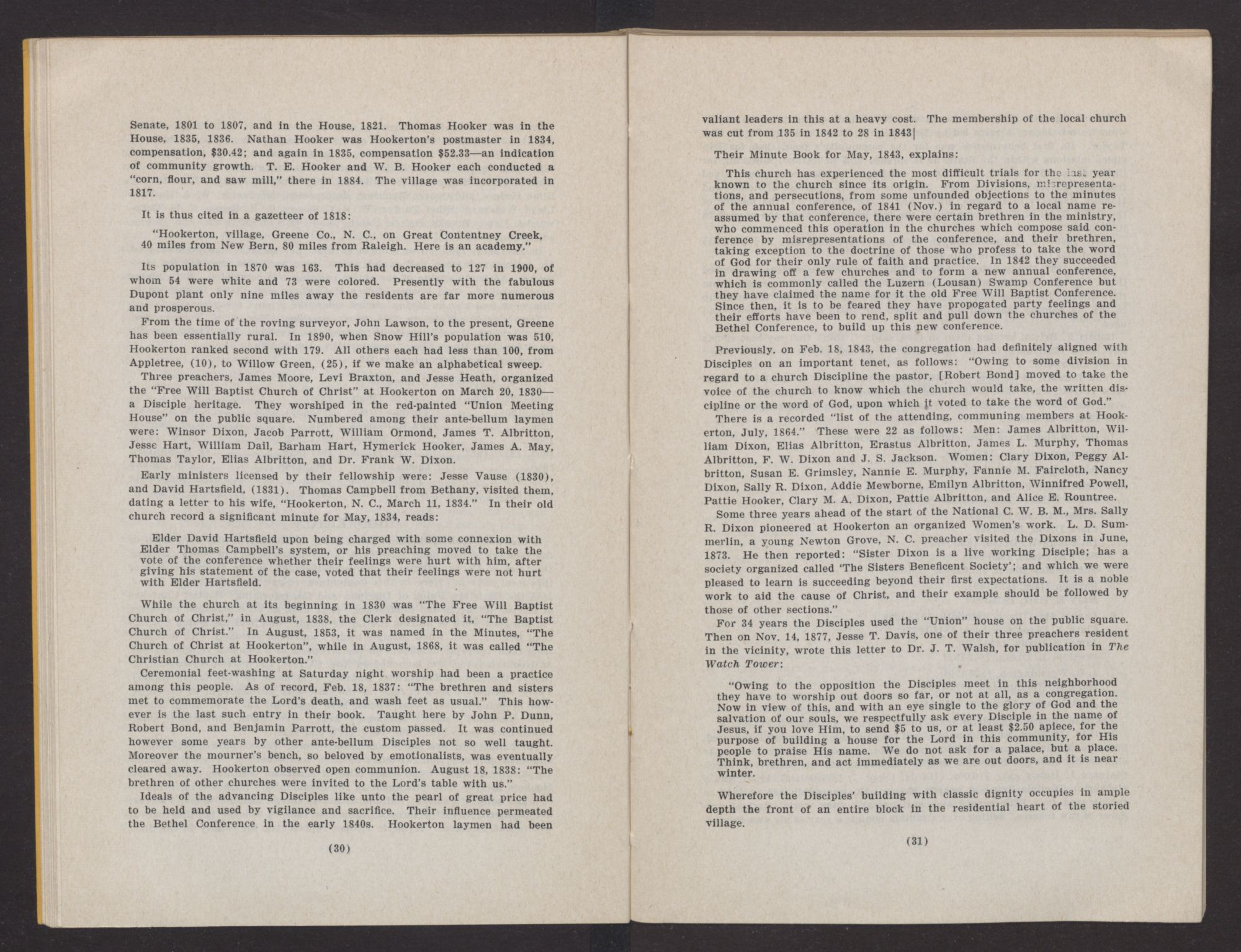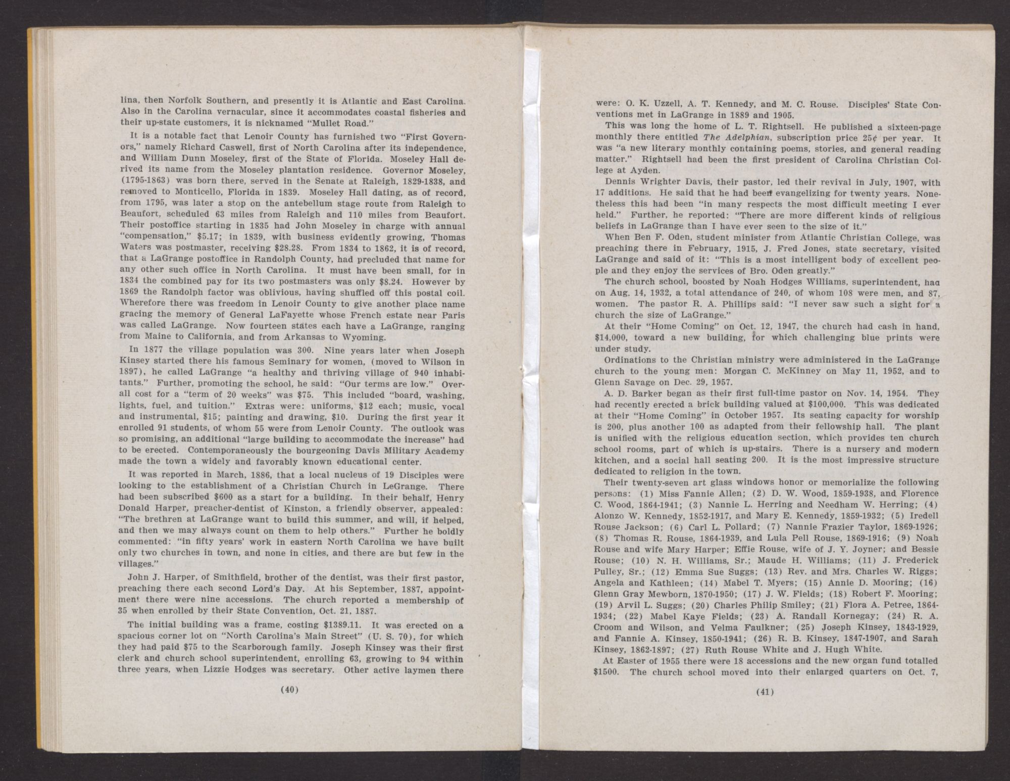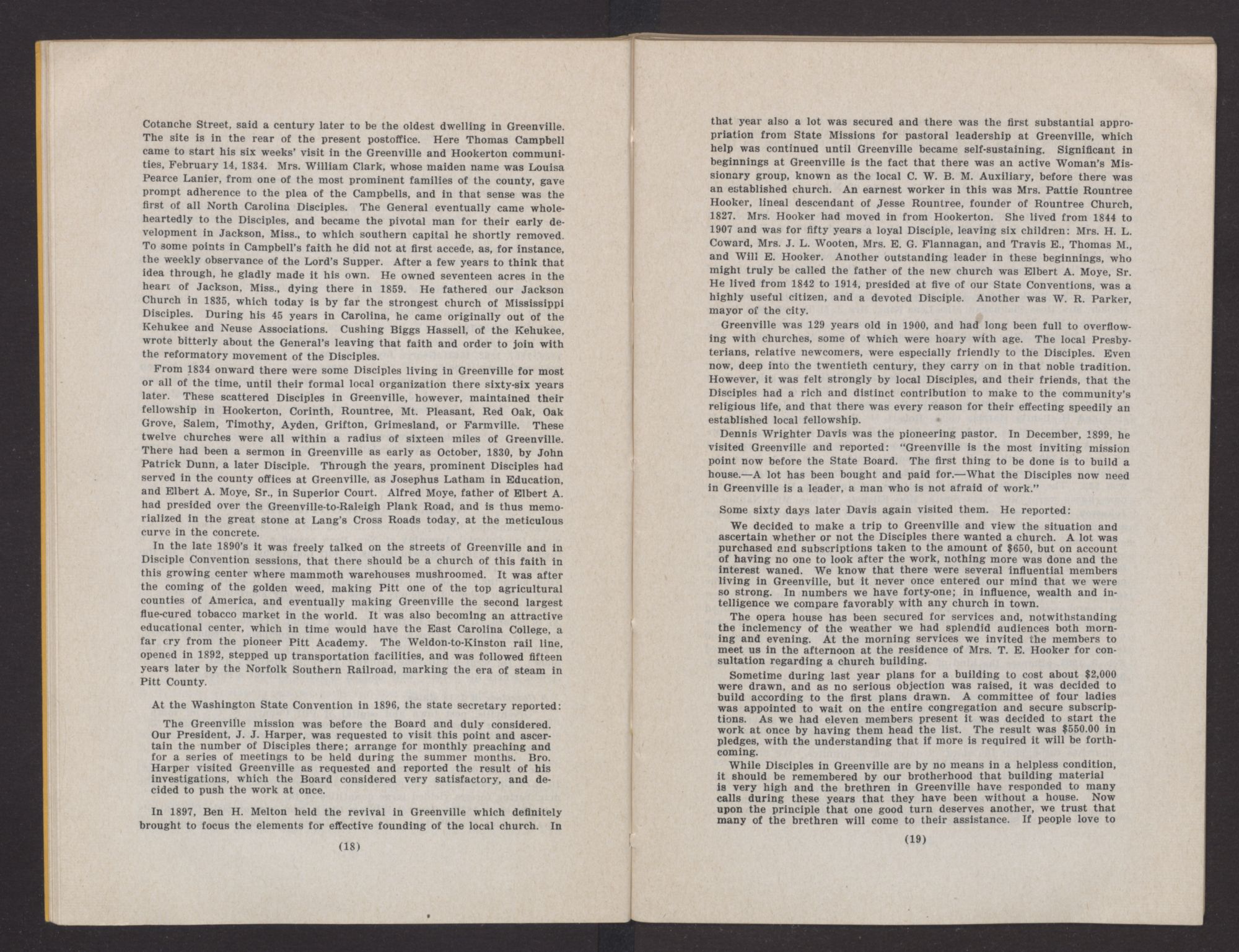 FOREWORDA good part of the definitive history of North Carolina Christian Churches, (Disciples of Christ), is involved in the career of the Hookerton Union, their oldest institution. The primary group of 126 years ago was known as The Union Meeting of Disciples of Christ in North Carolina. Later it was identified as The Central Christian Cooperation; yet later, called The Second Evangelical District; and from 1885 to date as the Hookerton Union. In eastern North Carolina it consists of 21 Christian Churches, including the three in Greene County, and the eighteen others in parts of Craven, Lenoir, and Pitt Counties.