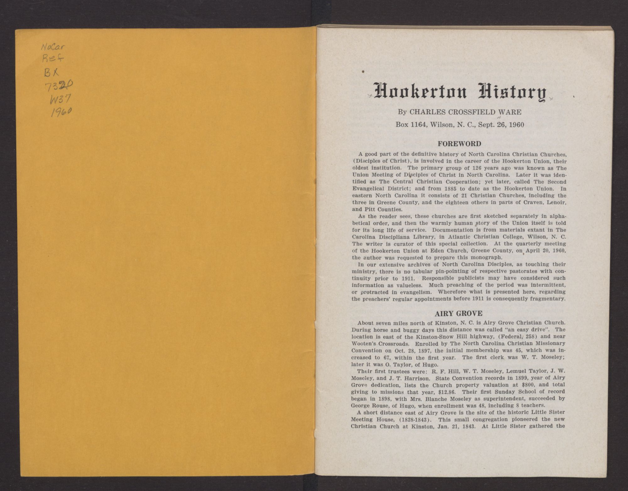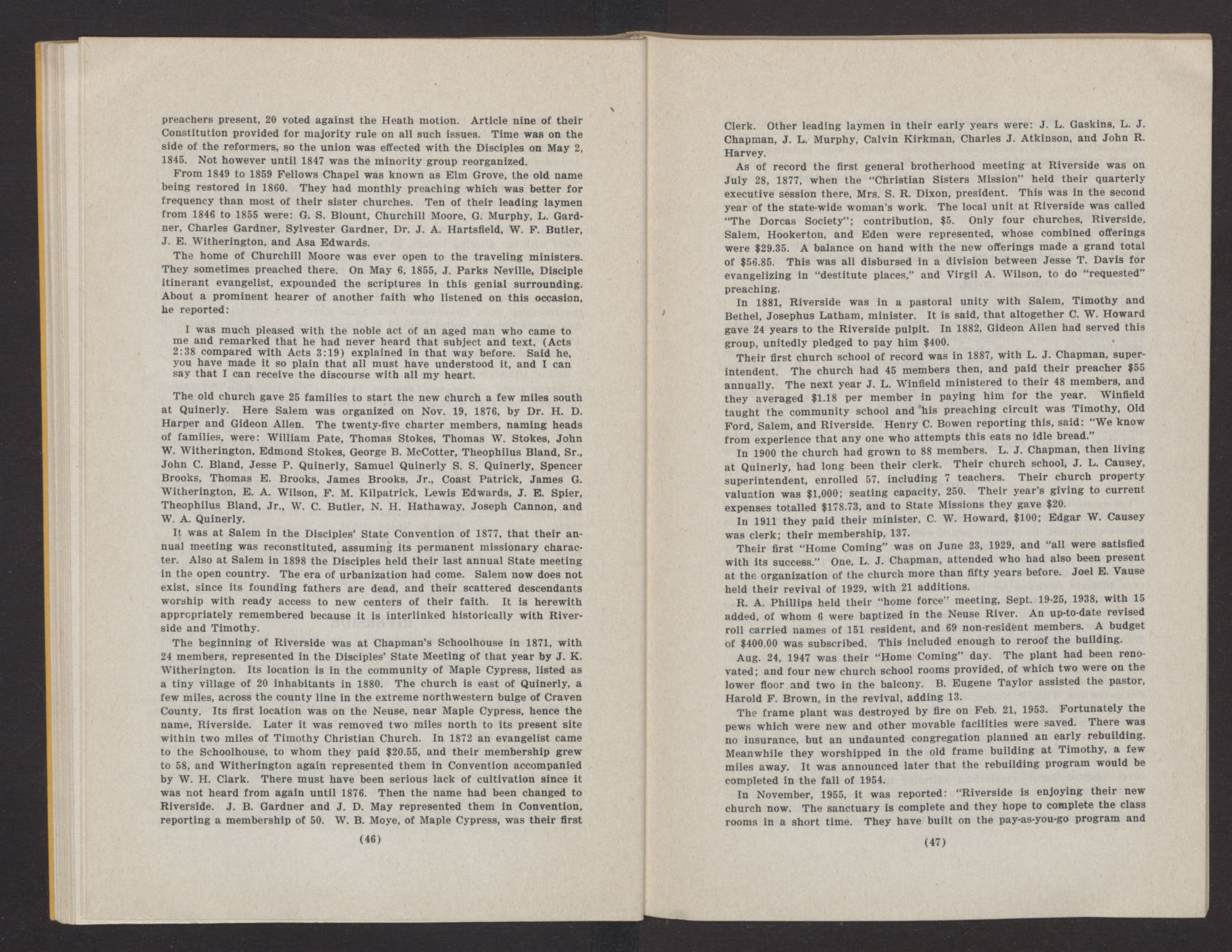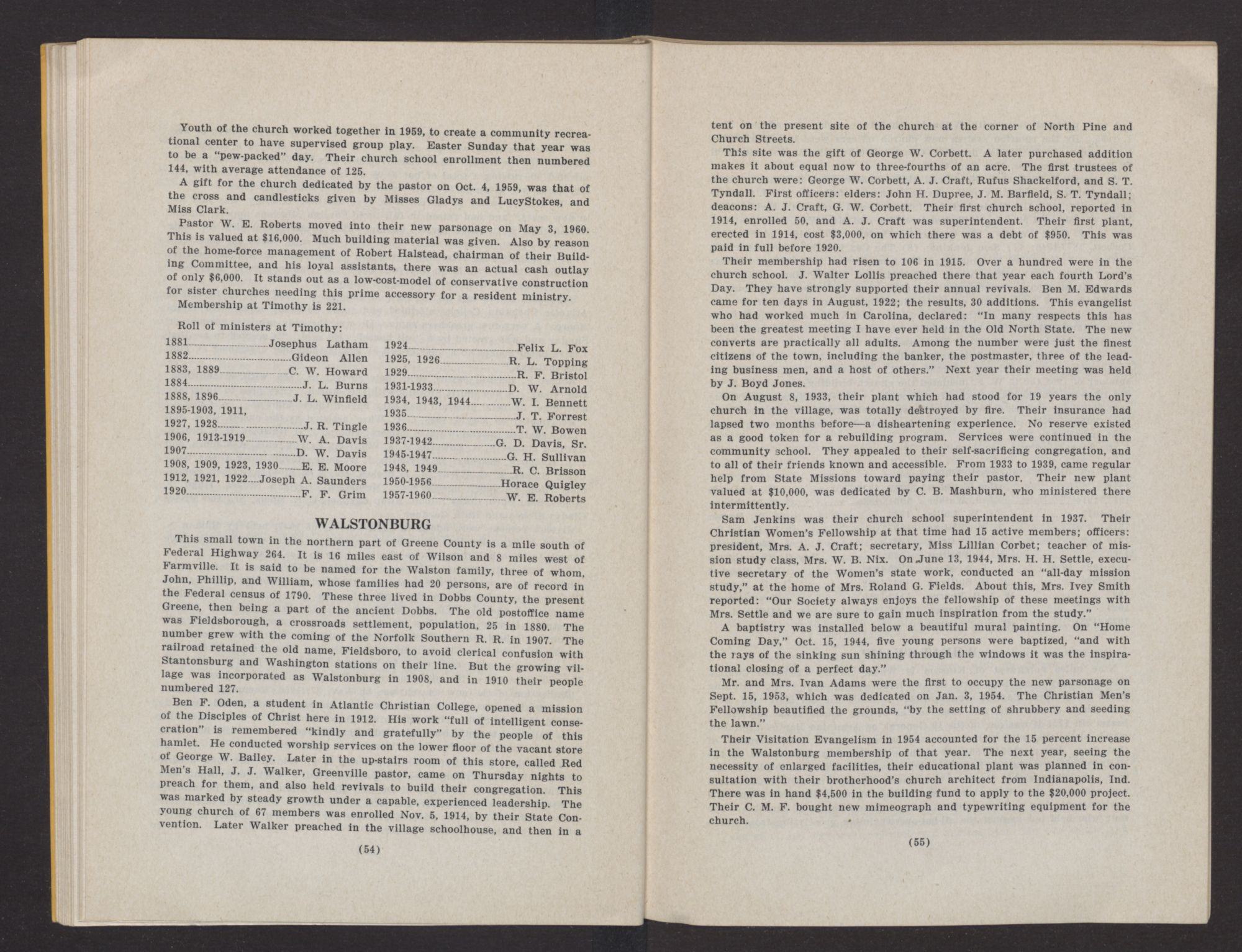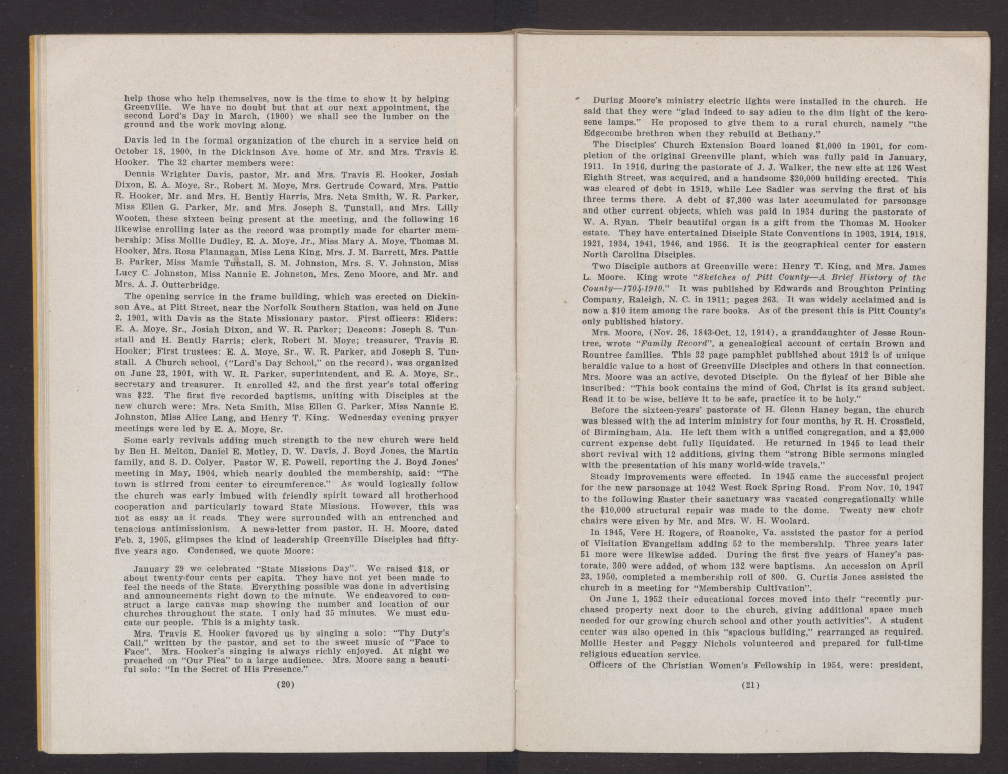 FOREWORDA good part of the definitive history of North Carolina Christian Churches, (Disciples of Christ), is involved in the career of the Hookerton Union, their oldest institution. The primary group of 126 years ago was known as The Union Meeting of Disciples of Christ in North Carolina. Later it was identified as The Central Christian Cooperation; yet later, called The Second Evangelical District; and from 1885 to date as the Hookerton Union. In eastern North Carolina it consists of 21 Christian Churches, including the three in Greene County, and the eighteen others in parts of Craven, Lenoir, and Pitt Counties.
