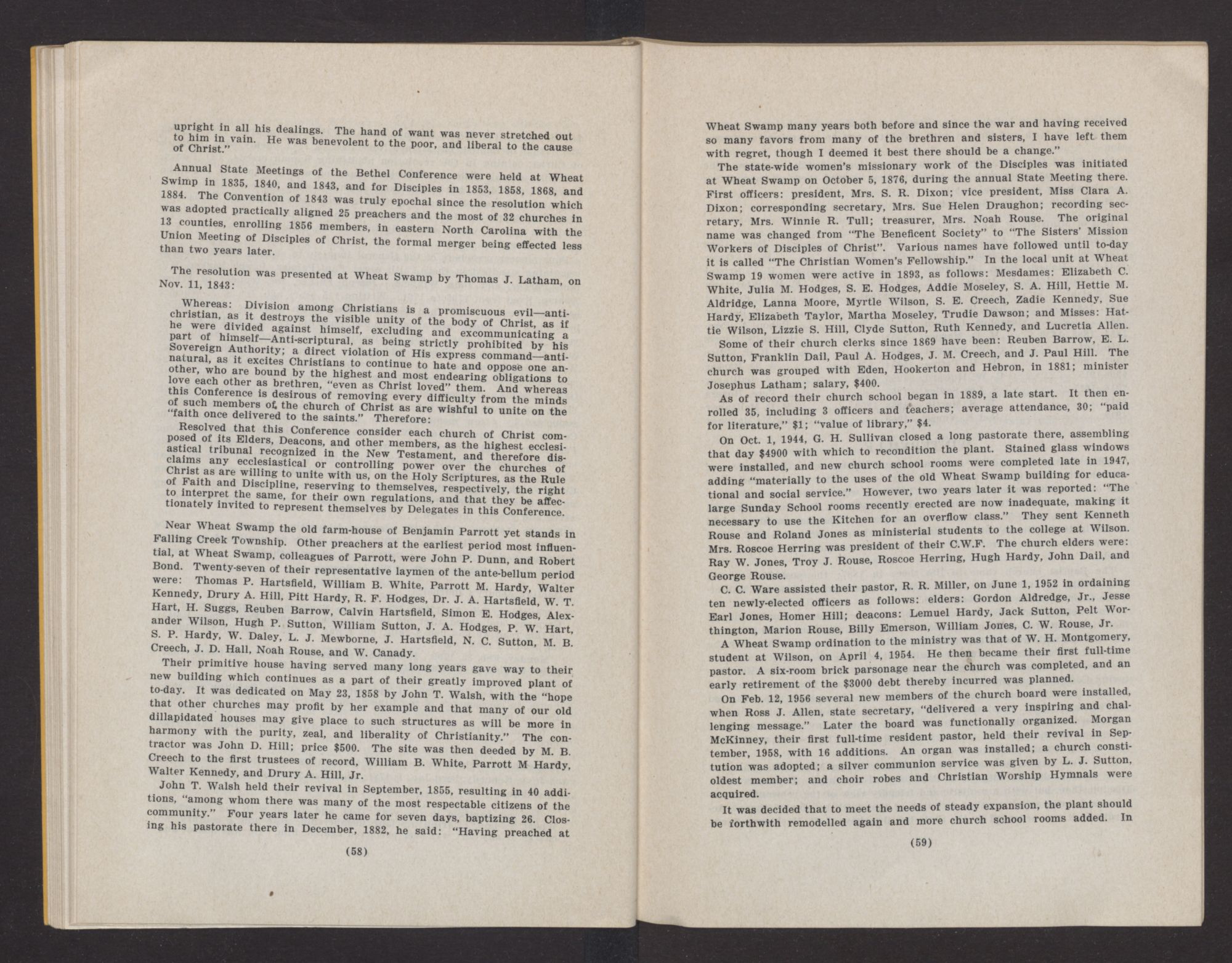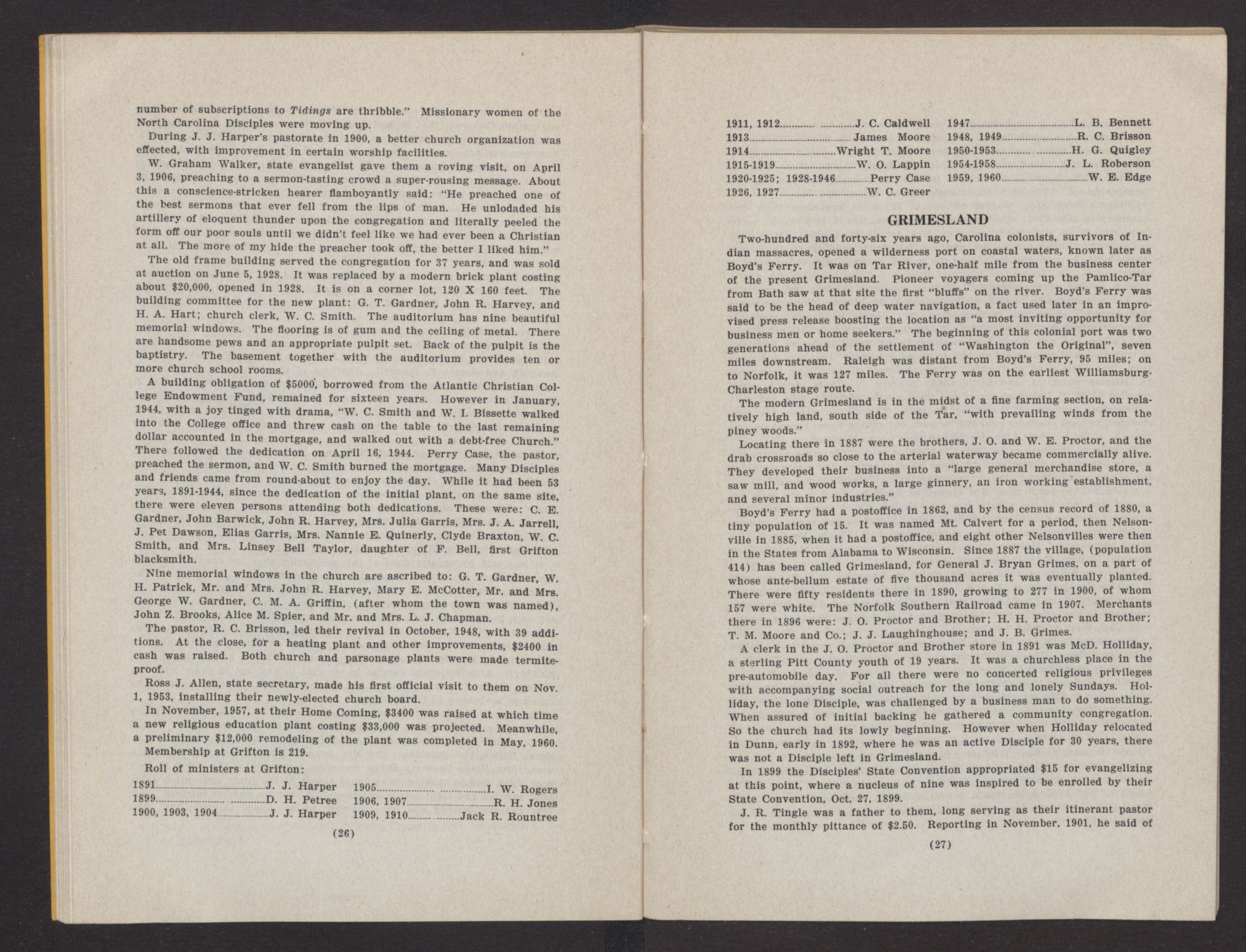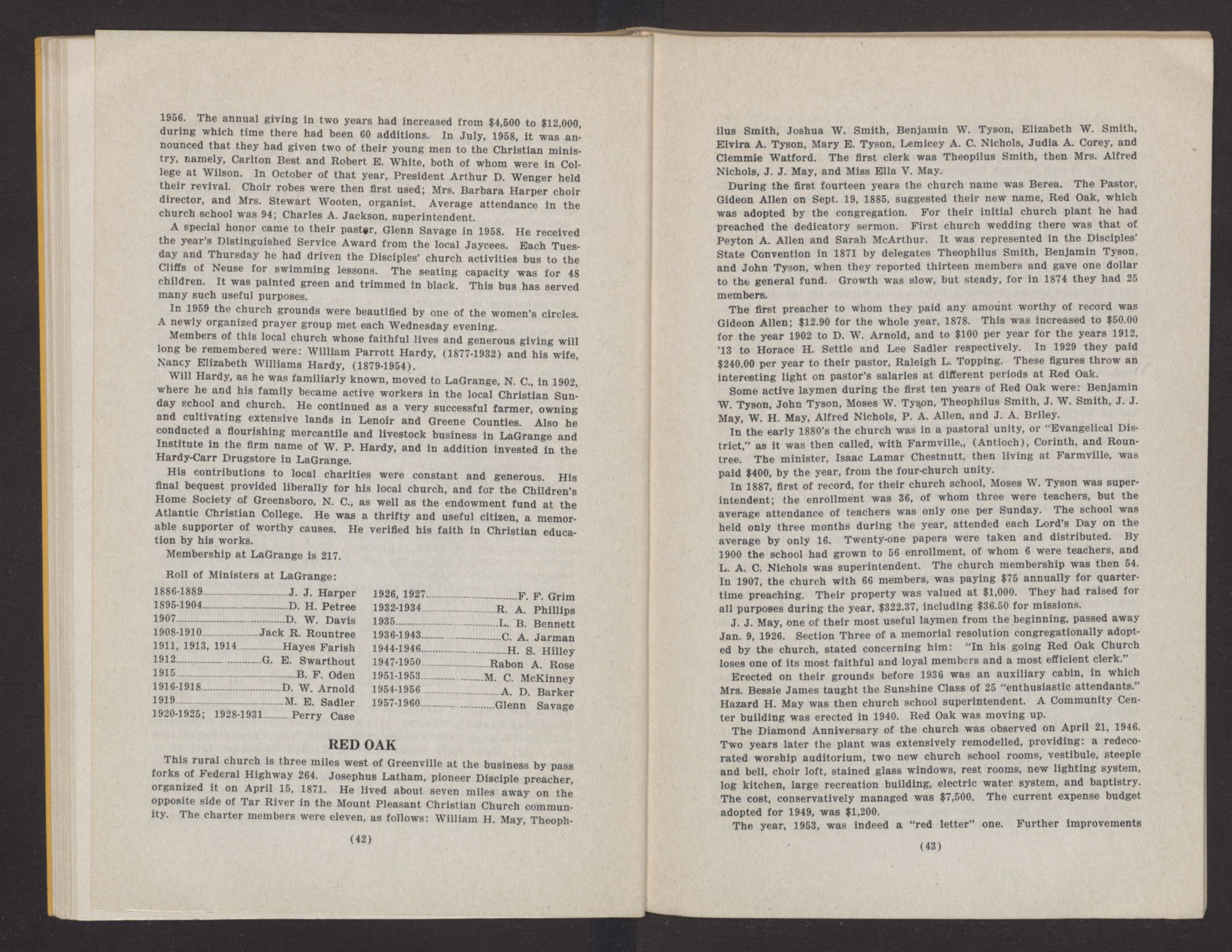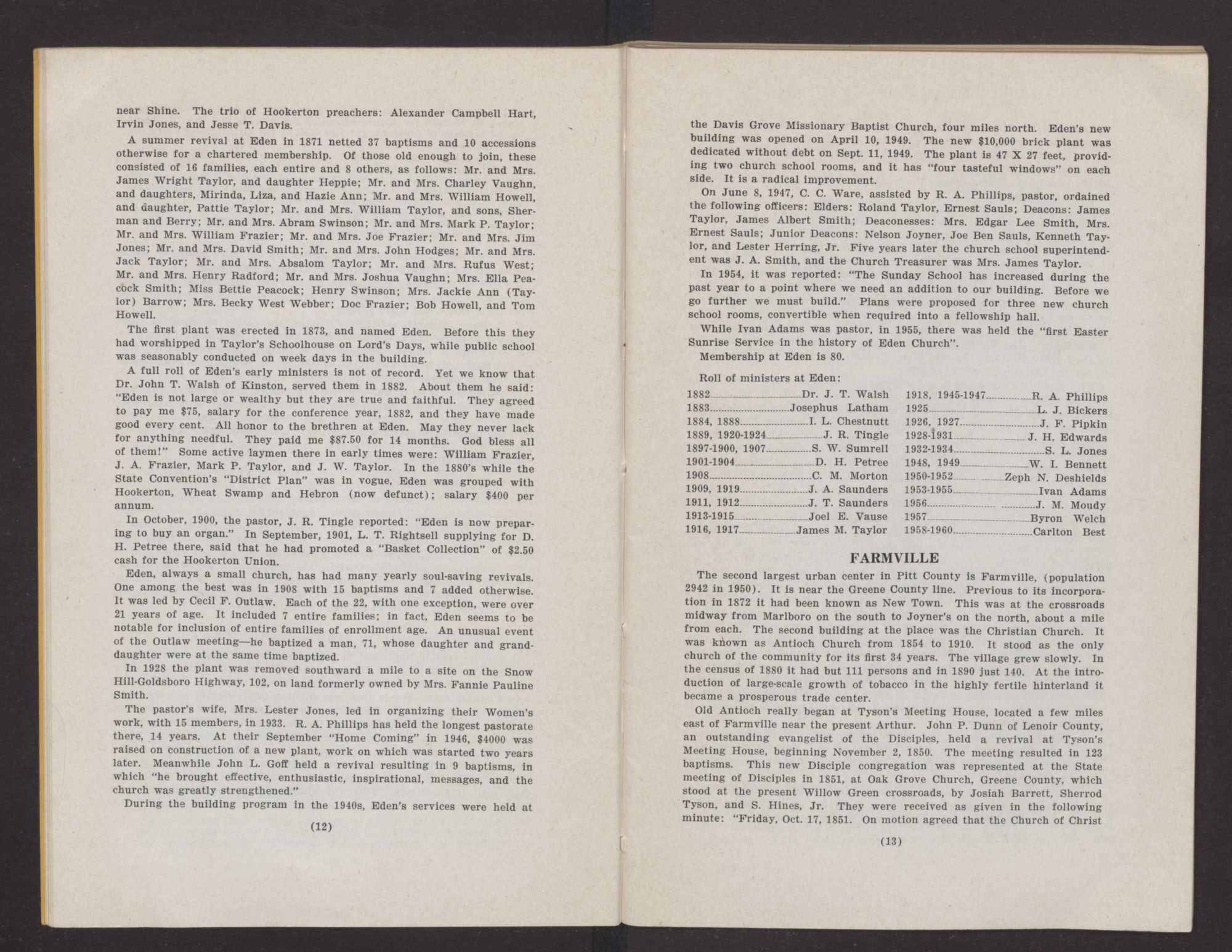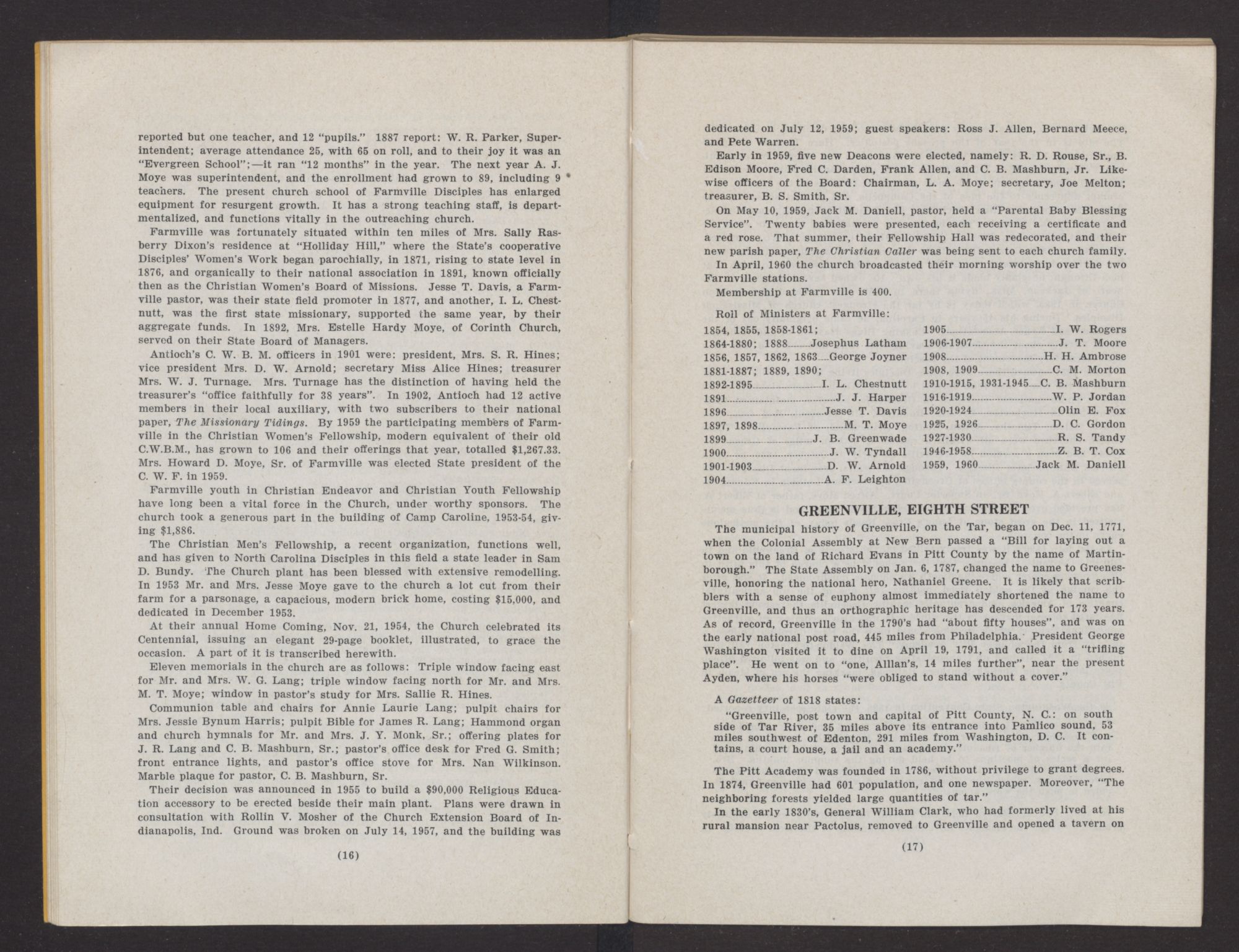 FOREWORDA good part of the definitive history of North Carolina Christian Churches, (Disciples of Christ), is involved in the career of the Hookerton Union, their oldest institution. The primary group of 126 years ago was known as The Union Meeting of Disciples of Christ in North Carolina. Later it was identified as The Central Christian Cooperation; yet later, called The Second Evangelical District; and from 1885 to date as the Hookerton Union. In eastern North Carolina it consists of 21 Christian Churches, including the three in Greene County, and the eighteen others in parts of Craven, Lenoir, and Pitt Counties.