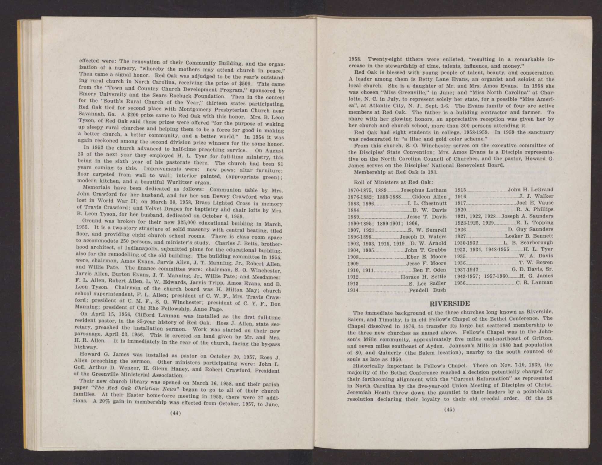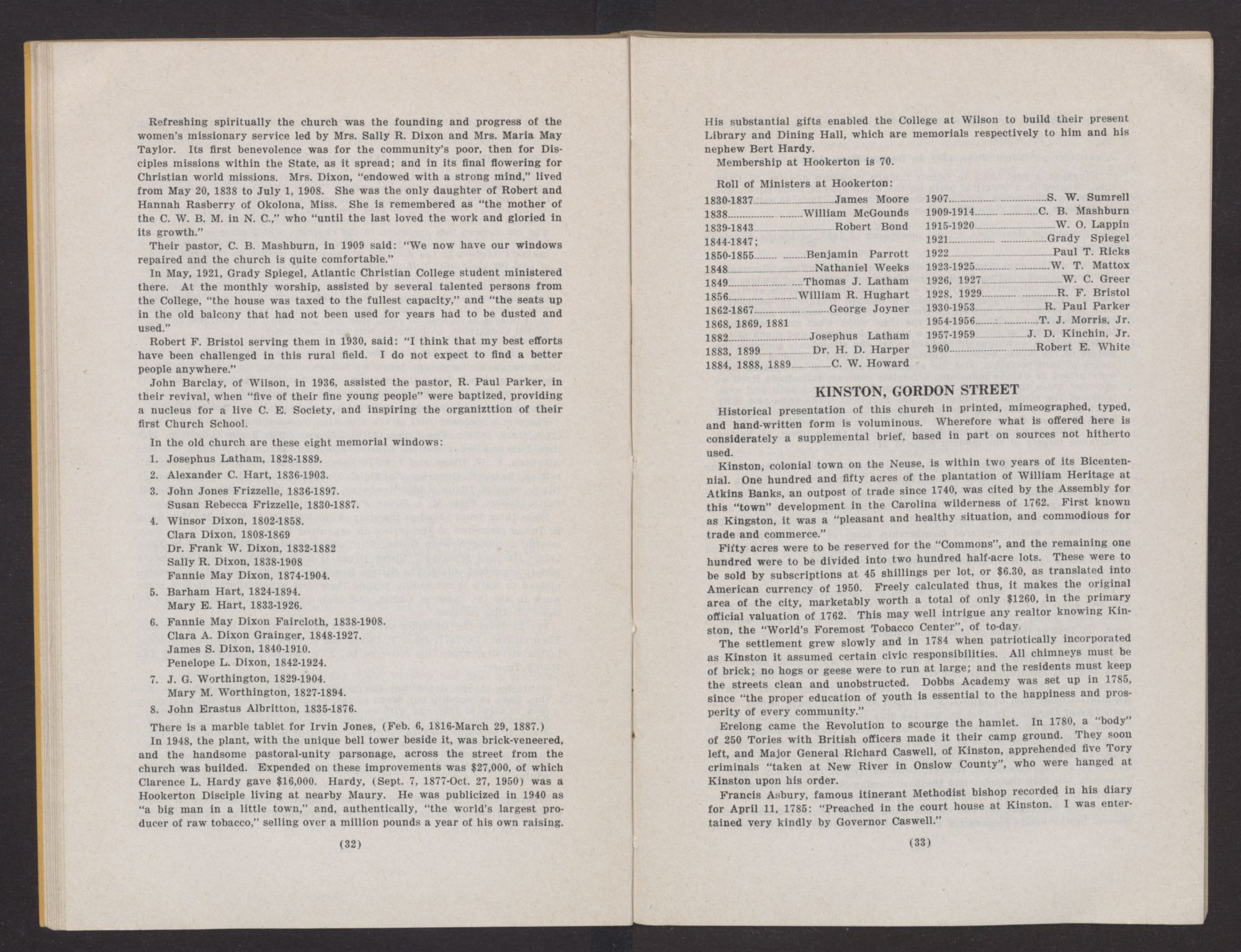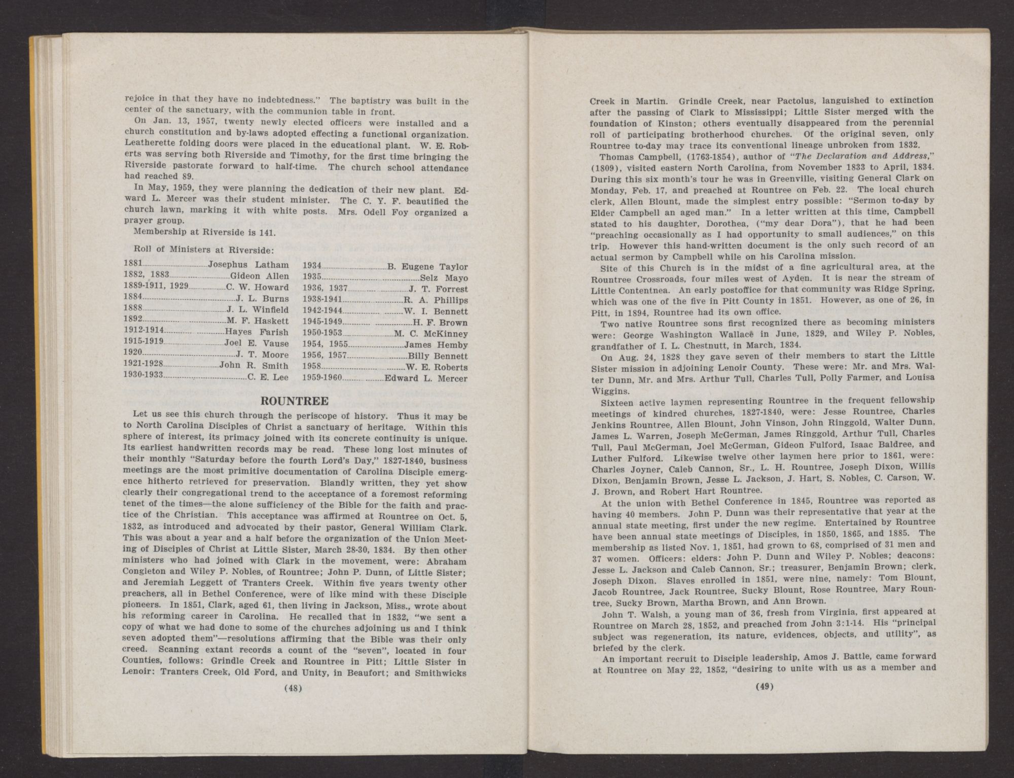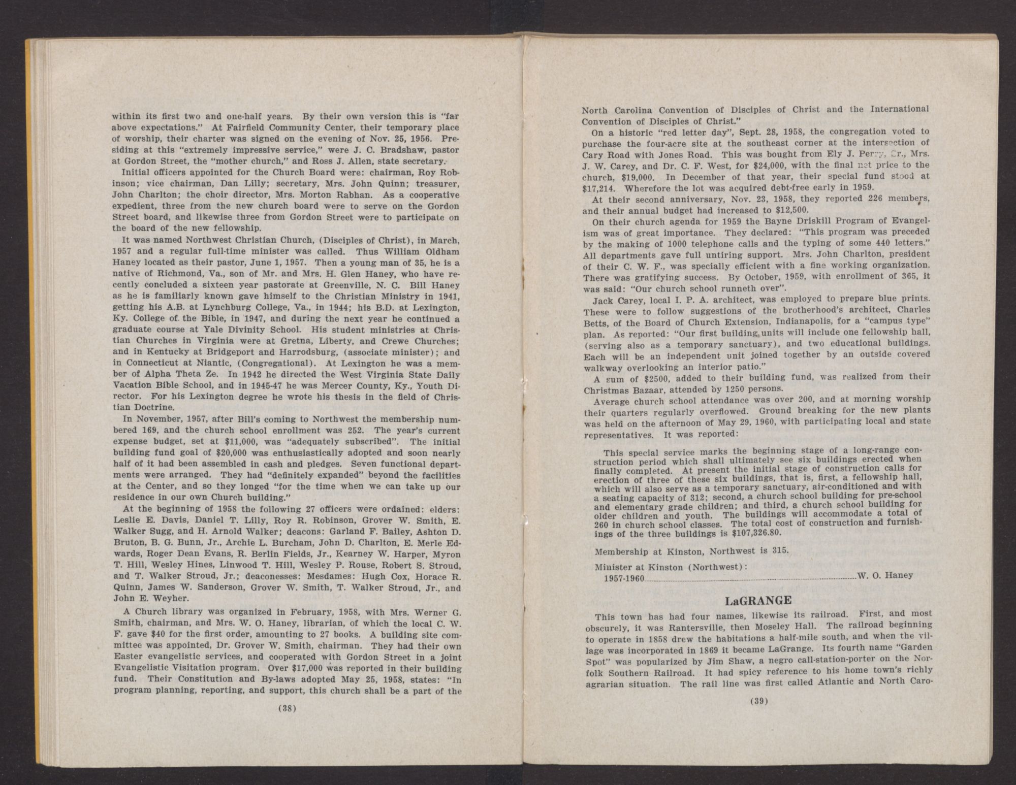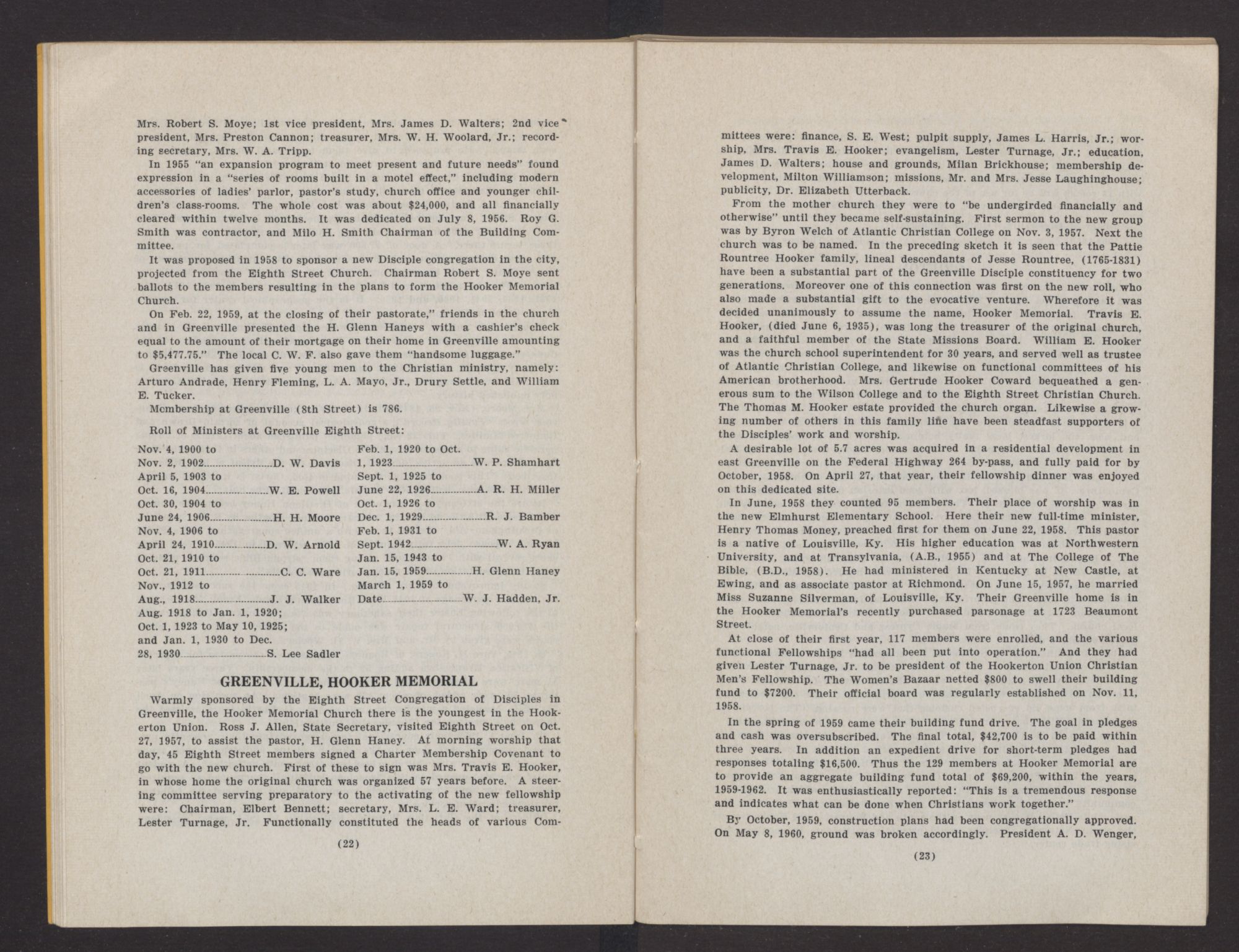 FOREWORDA good part of the definitive history of North Carolina Christian Churches, (Disciples of Christ), is involved in the career of the Hookerton Union, their oldest institution. The primary group of 126 years ago was known as The Union Meeting of Disciples of Christ in North Carolina. Later it was identified as The Central Christian Cooperation; yet later, called The Second Evangelical District; and from 1885 to date as the Hookerton Union. In eastern North Carolina it consists of 21 Christian Churches, including the three in Greene County, and the eighteen others in parts of Craven, Lenoir, and Pitt Counties.
