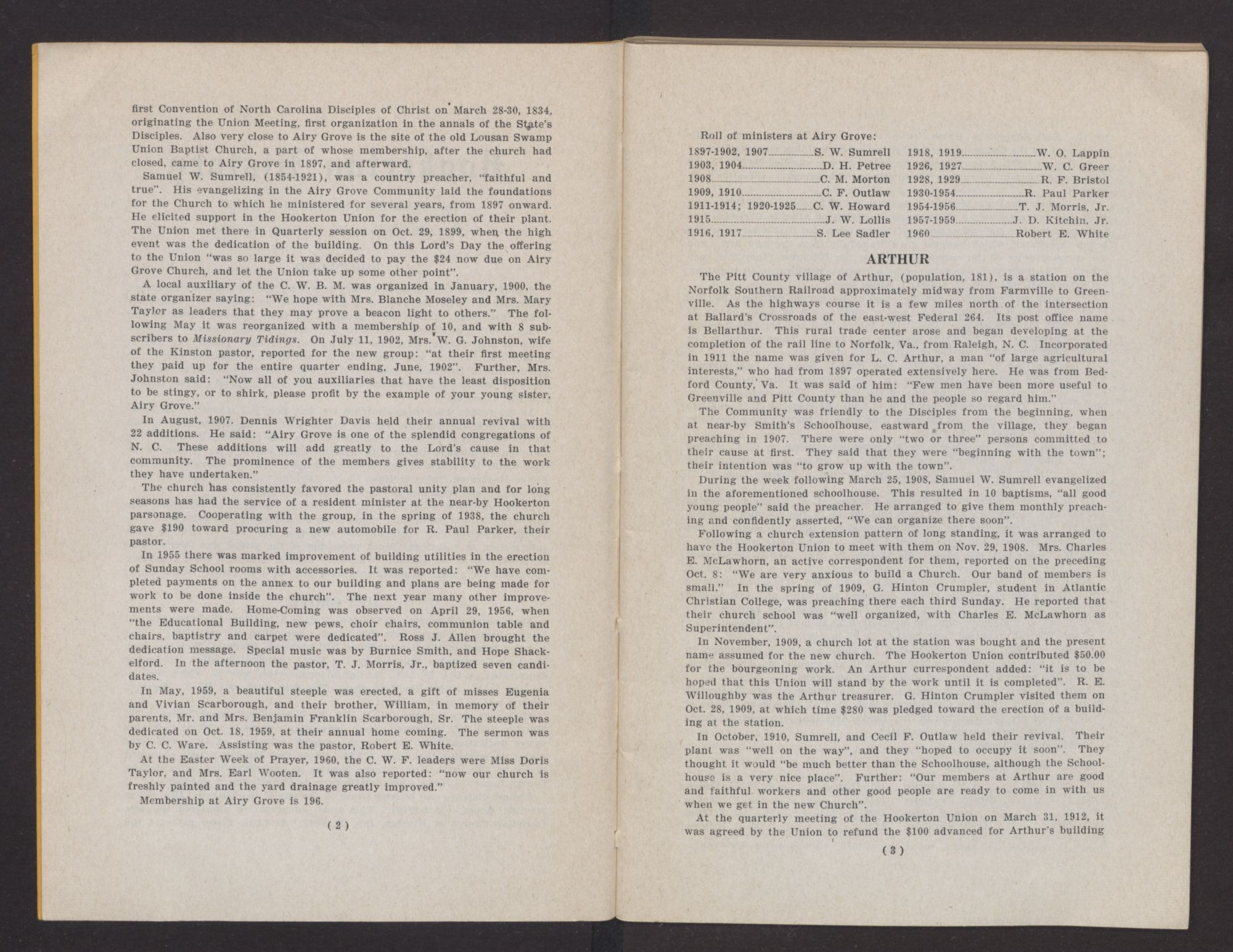 The Arthur plant was dedicated on May 31, 1914, when their Union met with that congregation. J. C. Caldwell, President of Atlantic Christian College, preached the dedication sermon. It was recounted that a very few had begun the church, which however grew “faithfully from the very first,” and the common voice of the community said of the Disciples, “they love each other”. The dedication was followed by a revival, resulting in 18 additions, led by Sumrell, and John H. LeGrand, Ayden pastor.