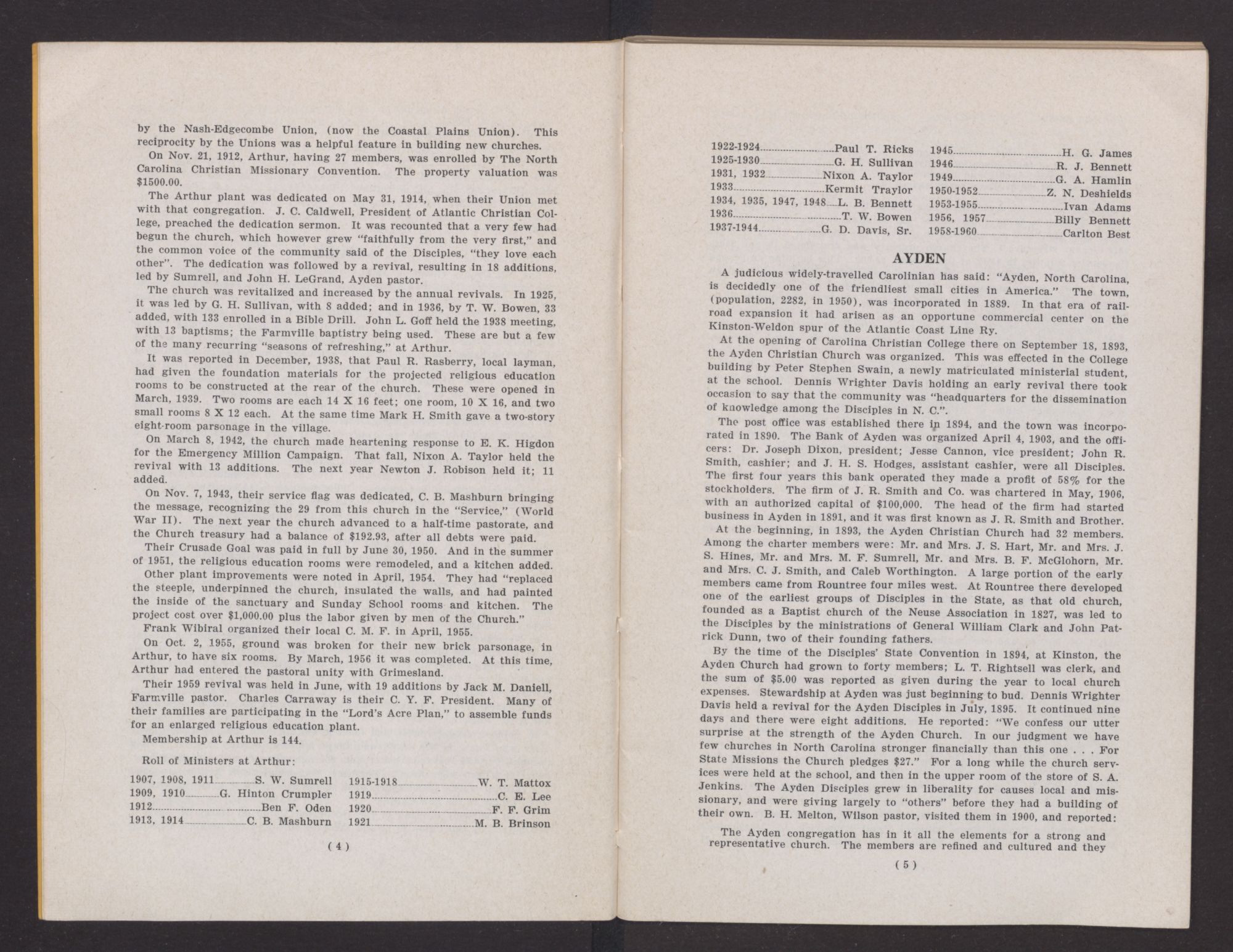 Ayden entertained Disciples’ State Conventions in 1900 and 1911; Hookerton Union and other regional Disciple gatherings, a countless number of times.
