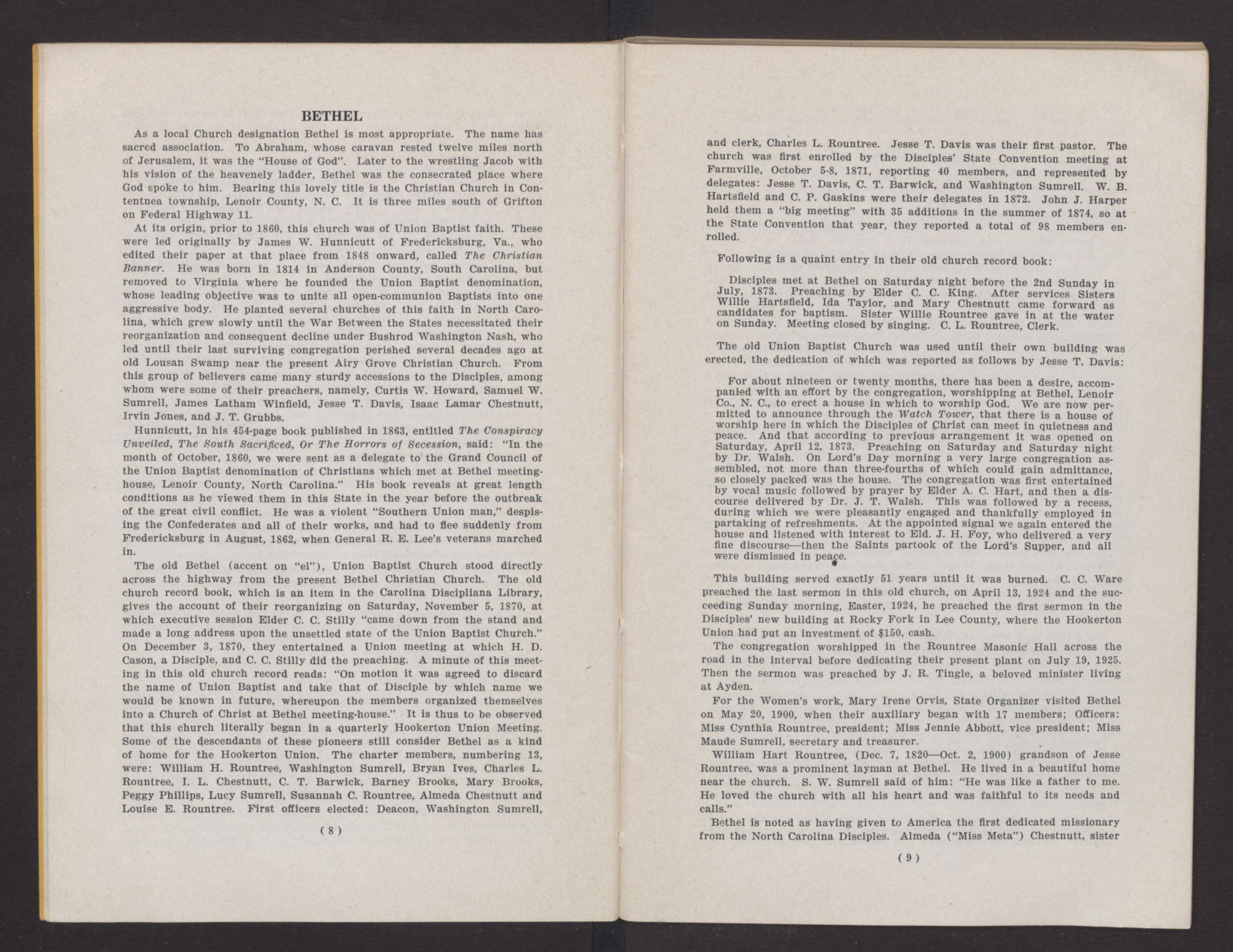 The old Bethel (accent on “el”), Union Baptist Church stood directly across the highway from the present Bethel Christian Church. The old church record book, which is an item in the Carolina Discipliana Library, gives the account of their reorganizing on Saturday, November 5, 1870, at which executive session Elder C. C. Stilly “came down from the stand and made a long address upon the unsettled state of the Union Baptist Church.” On December 3, 1870, they entertained a Union meeting at which H. D. Cason, a Disciple, and C. C. Stilly did the preaching. A minute of this meeting in this old church record reads: “On motion it was agreed to discard the name of Union Baptist and take that of Disciple by which name we would be known in future, whereupon the members organized themselves into a Church of Christ at Bethel meeting-house.” It is thus to be observed that this church literally began in a quarterly Hookerton Union Meeting. Some of the descendants of these pioneers still consider Bethel as a kind of home for the Hookerton Union. The charter members, numbering 13, were: William H. Rountree, Washington Sumrell, Bryan Ives, Charles L. Rountree, I. L. Chestnutt, C. T. Barwick, Barney Brooks, Mary Brooks, Peggy Phillips, Lucy Sumrell, Susannah C. Rountree, Almeda Chestnutt and Louise E. Rountree. First officers elected: Deacon, Washington Sumrell,