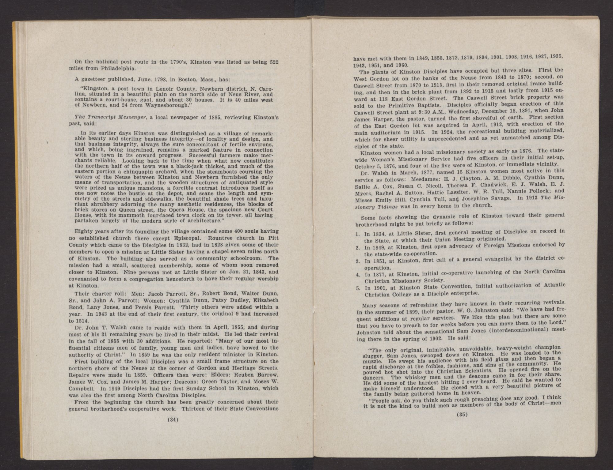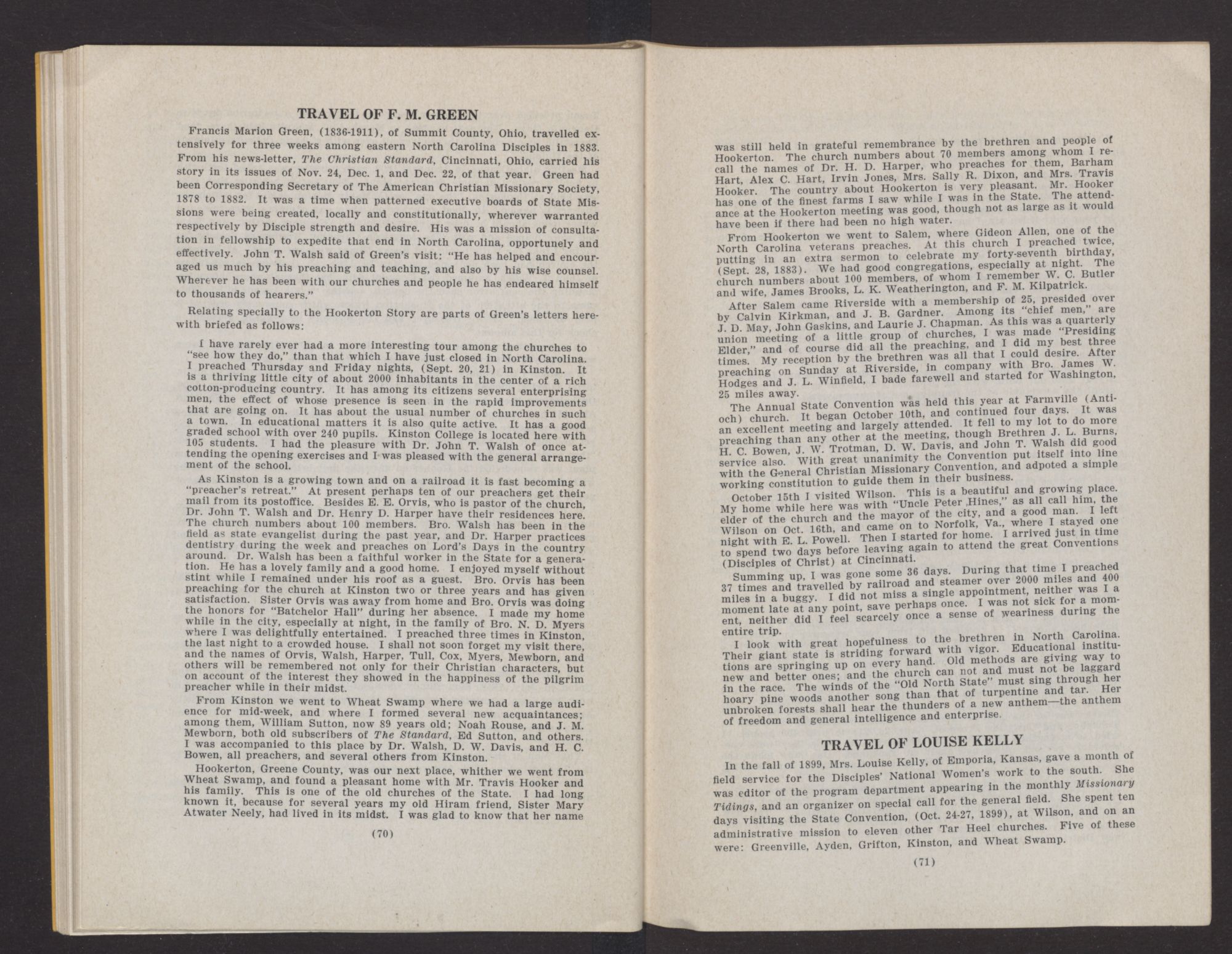 TRAVEL OF LOUISE KELLYIn the fall of 1899, Mrs. Louise Kelly, of Emporia, Kansas, gave a month of field service for the Disciples’ National Women's work to the south. She was editor of the program department appearing in the monthly Missionary Tidings, and an organizer on special call for the general field. She spent ten days visiting the State Convention, (Oct. 24-27, 1899), at Wilson, and on an administrative mission to eleven other Tar Heel churches. Five of these were: Greenville, Ayden, Grifton, Kinston, and Wheat Swamp.