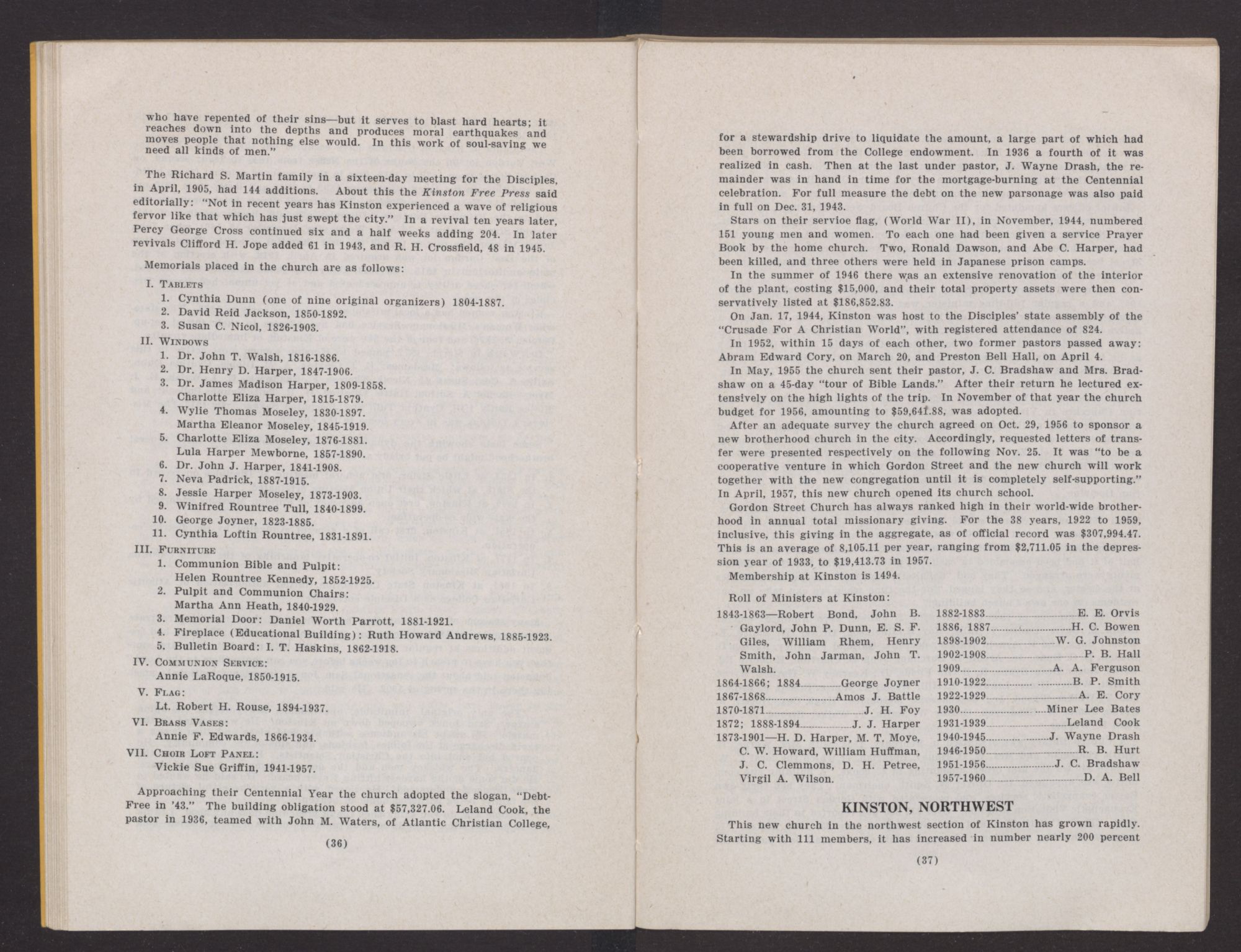 There had been a debt on their religious education plant. For their “Home Coming” worship on Oct. 3, 1943, it was reported: “J. H. S. Hodges and R. L. Johnson stood at the pulpit and burned the mortgage, the building debt having been paid in full. J. Dixie Cannon read the names and respective amounts of the 125 individuals who had paid the total cash, $6,001.33 which had completely cared for the remainder of the original $10,000 loan from the Atlantic Christian College endowment fund.”
